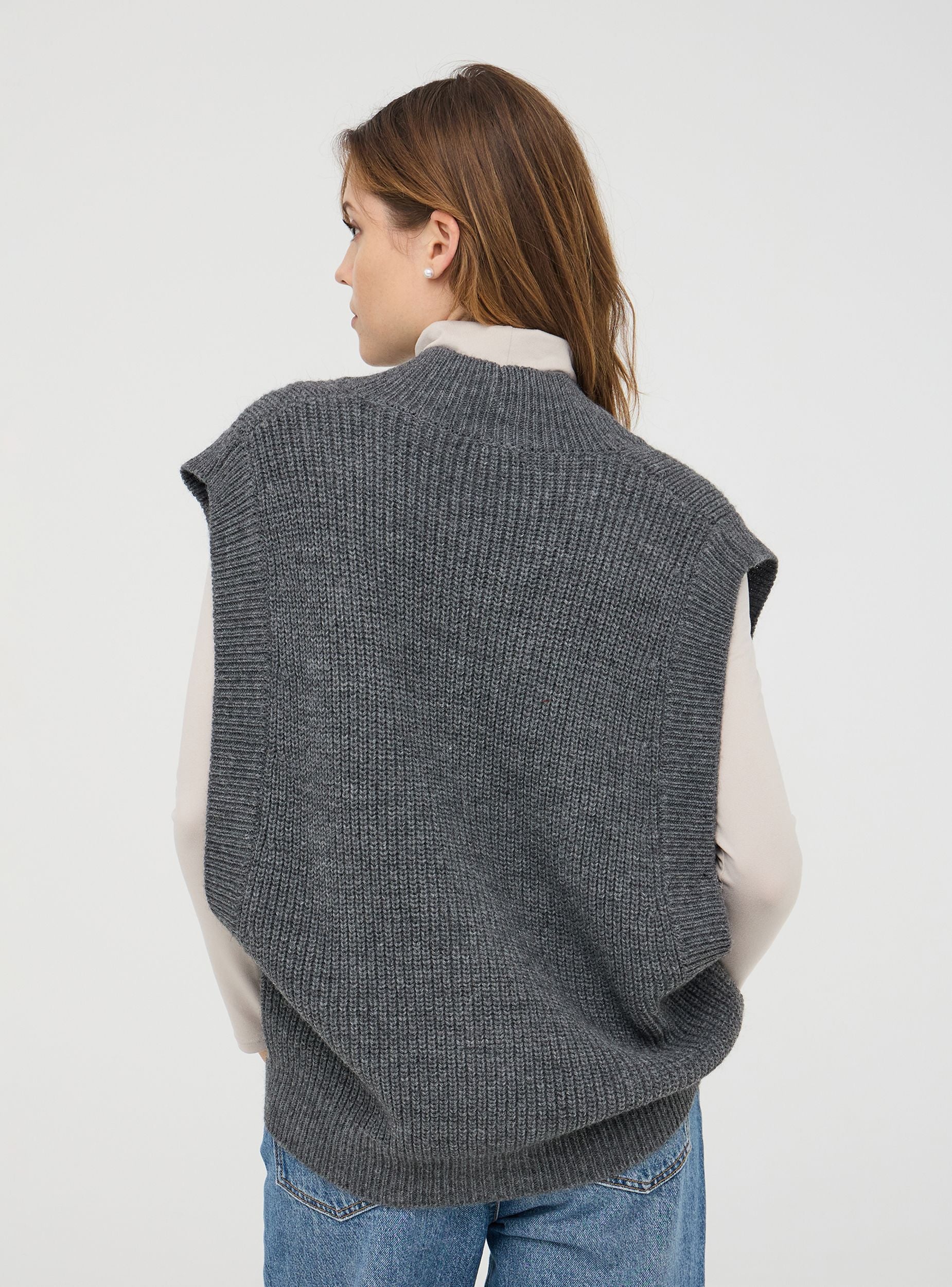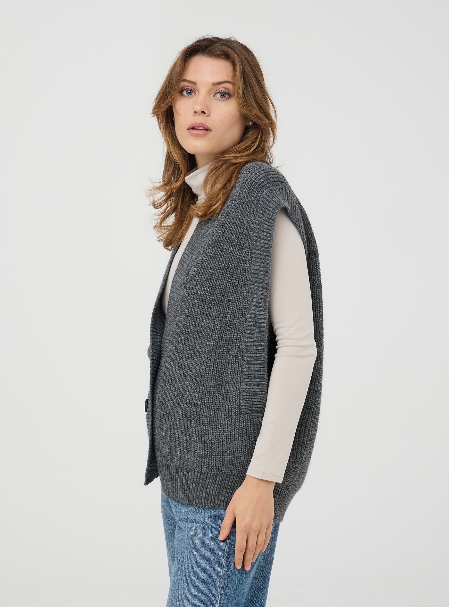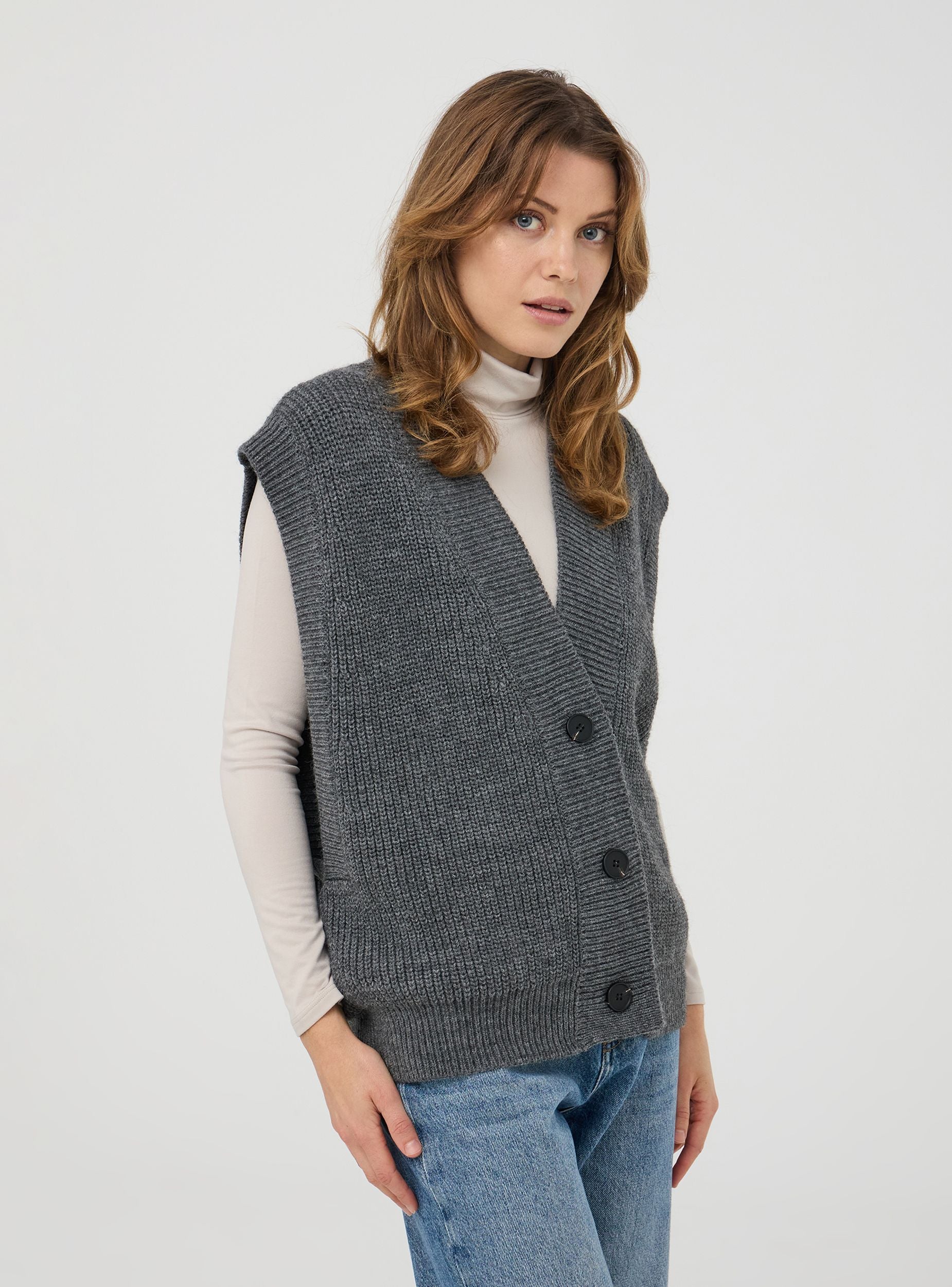 Ženski prsluk s mekim krojem i rafiniranim dizajnom, savršen za dodavanje daška elegancije svakodnevnim izgledima. Idealan za ured iznad košulje i krojenih hlača ili za slobodno vrijeme s trapericama i tenisicama. Zatvaranje na gumbe i udoban kroj čine ga svestranim komadom, savršenim za slojevito oblačenje u međusezoni.Detalji