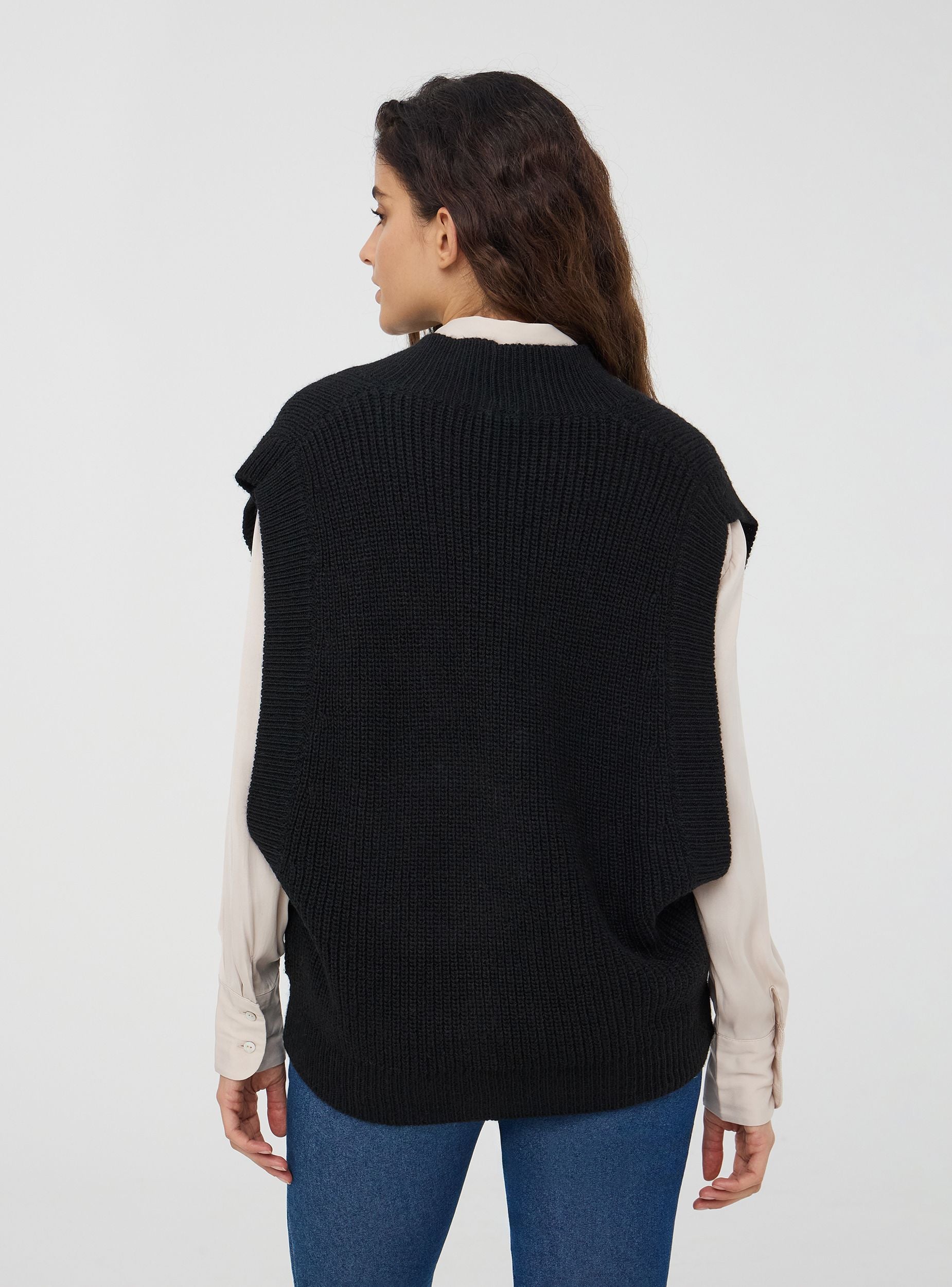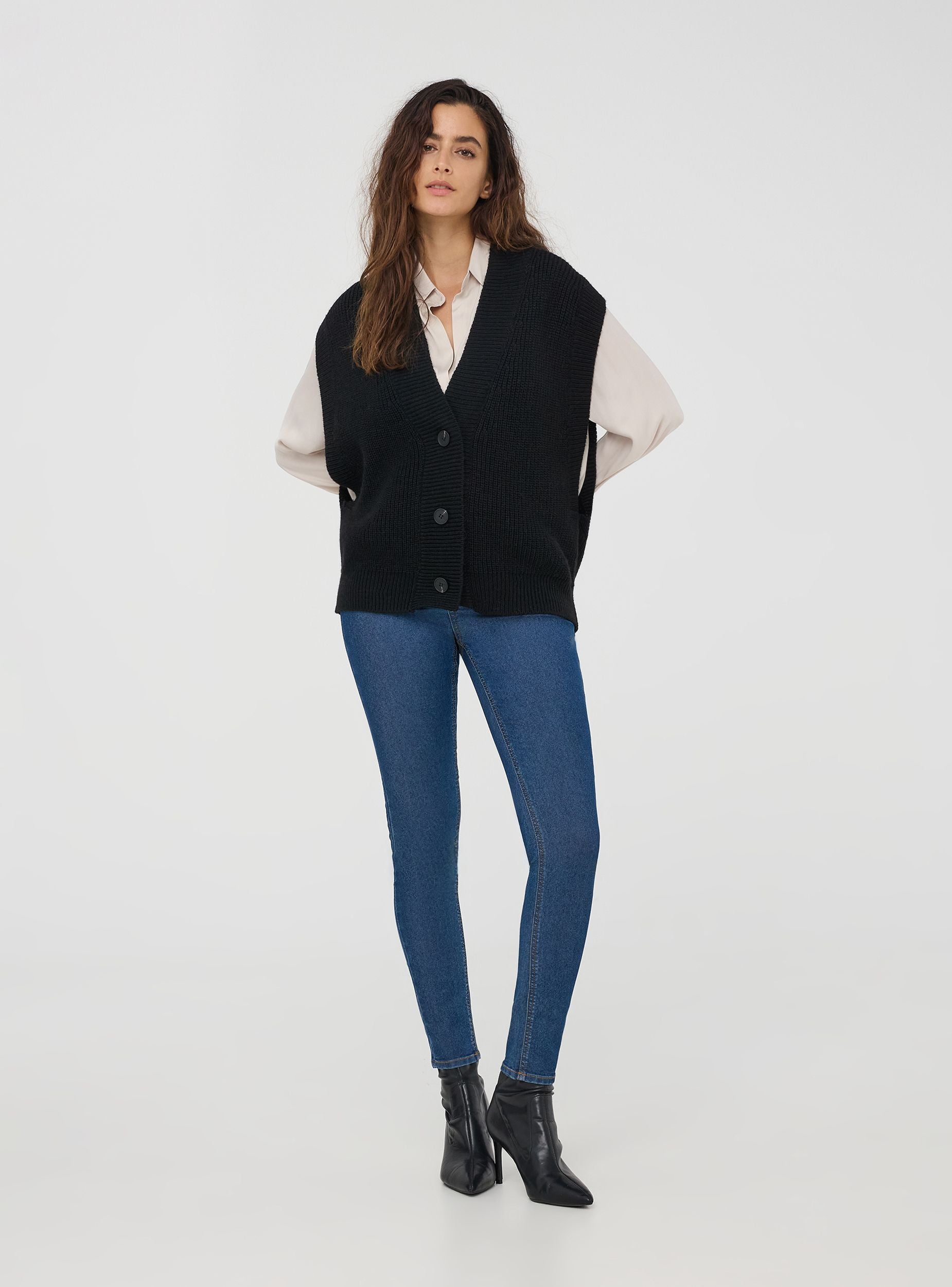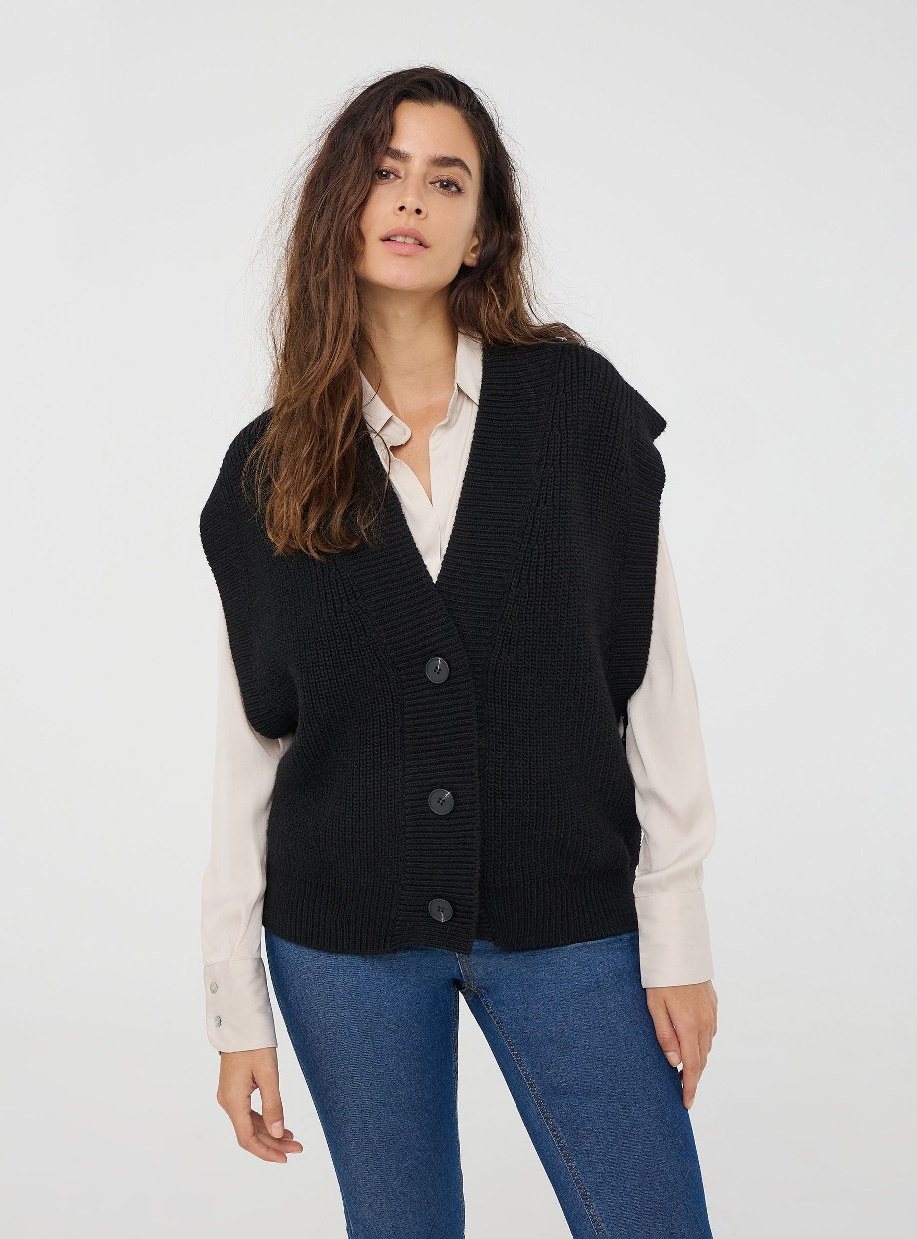 Ženski gilet s mekim krojem i rafiniranim dizajnom, savršen za dodavanje daška elegancije svakodnevnim izgledima. Idealan za ured iznad košulje i krojenih hlača ili za slobodno vrijeme s trapericama i tenisicama. Zatvaranje na gumbe i udoban kroj čine ga svestranom odjećom, savršenom za slojevito oblačenje u međusezoni.Detalji