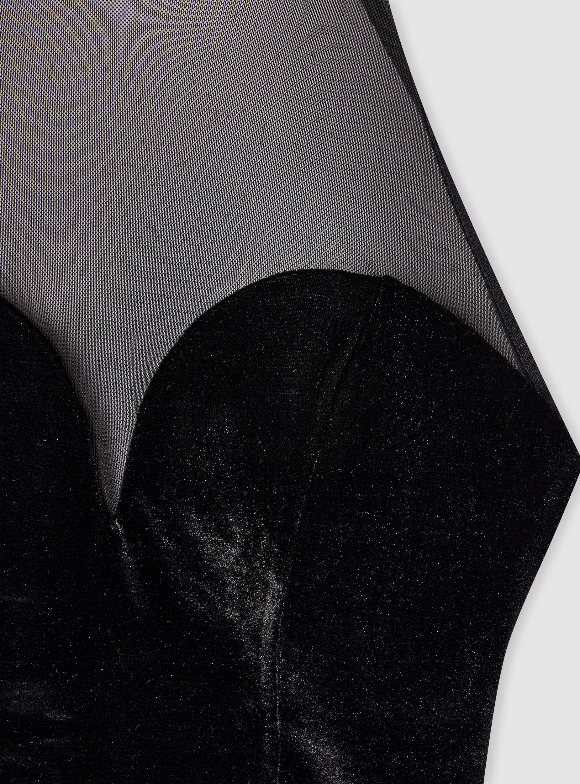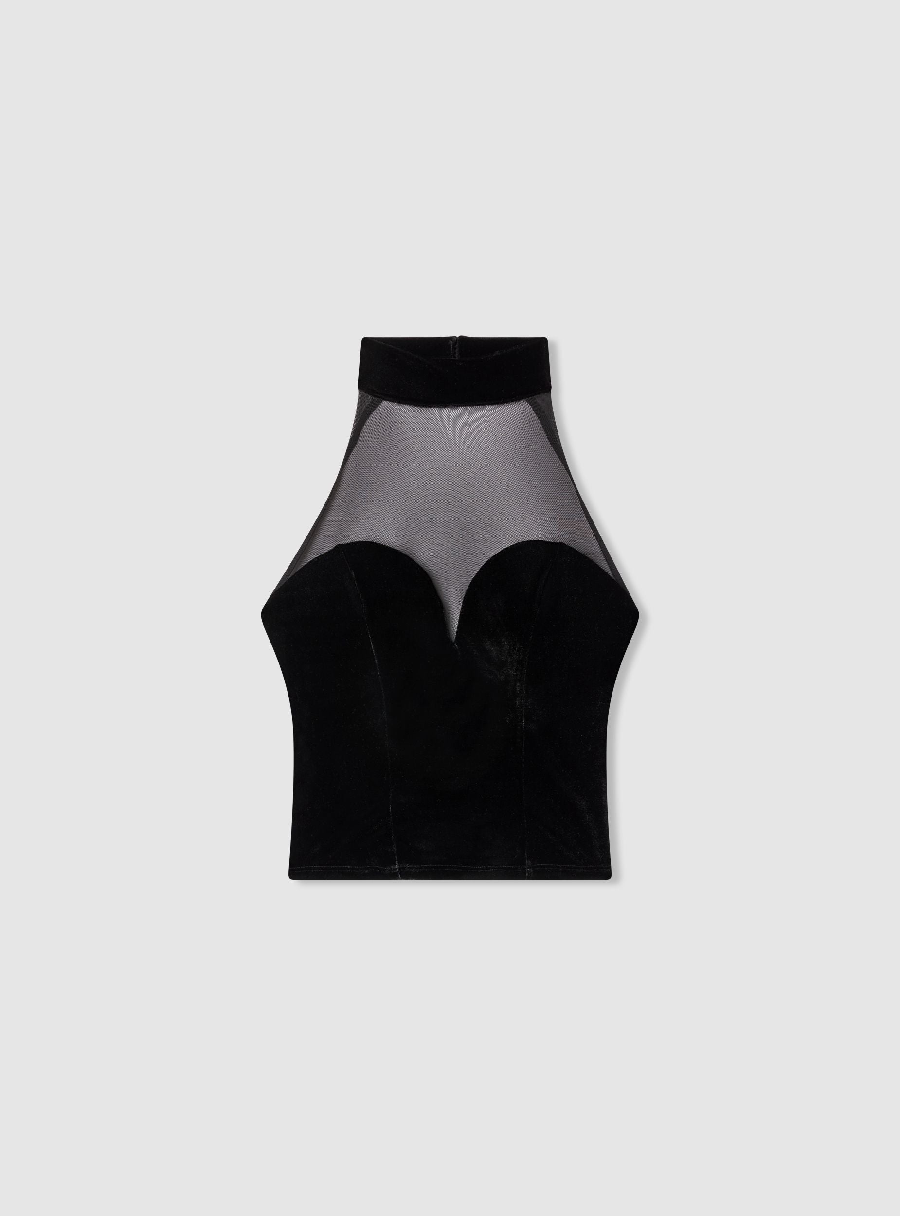 Ženski top s prozirnim detaljima i sjajnim efektom. Idealan za elegantne večeri ili posebne događaje, ističe se profinjenim dizajnom i sjajnim efektom. Savršen za kombiniranje s hlačama ili suknjama za sofisticirani i moderni izgled, nudi uski kroj koji ističe siluetu.