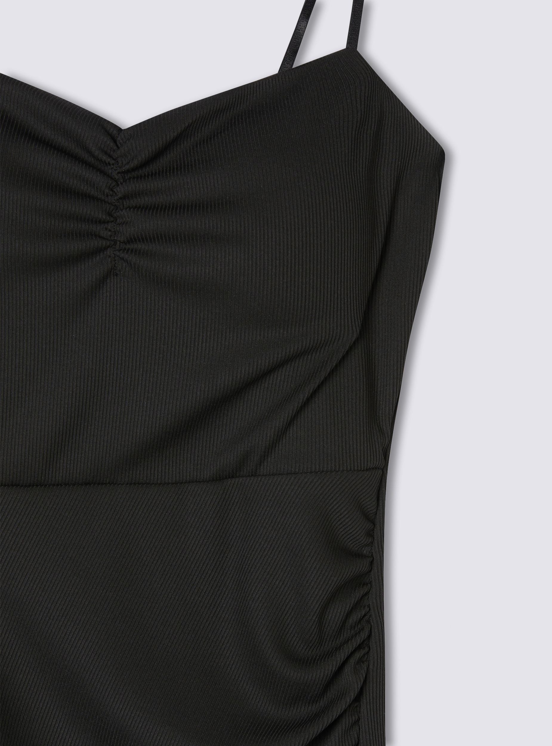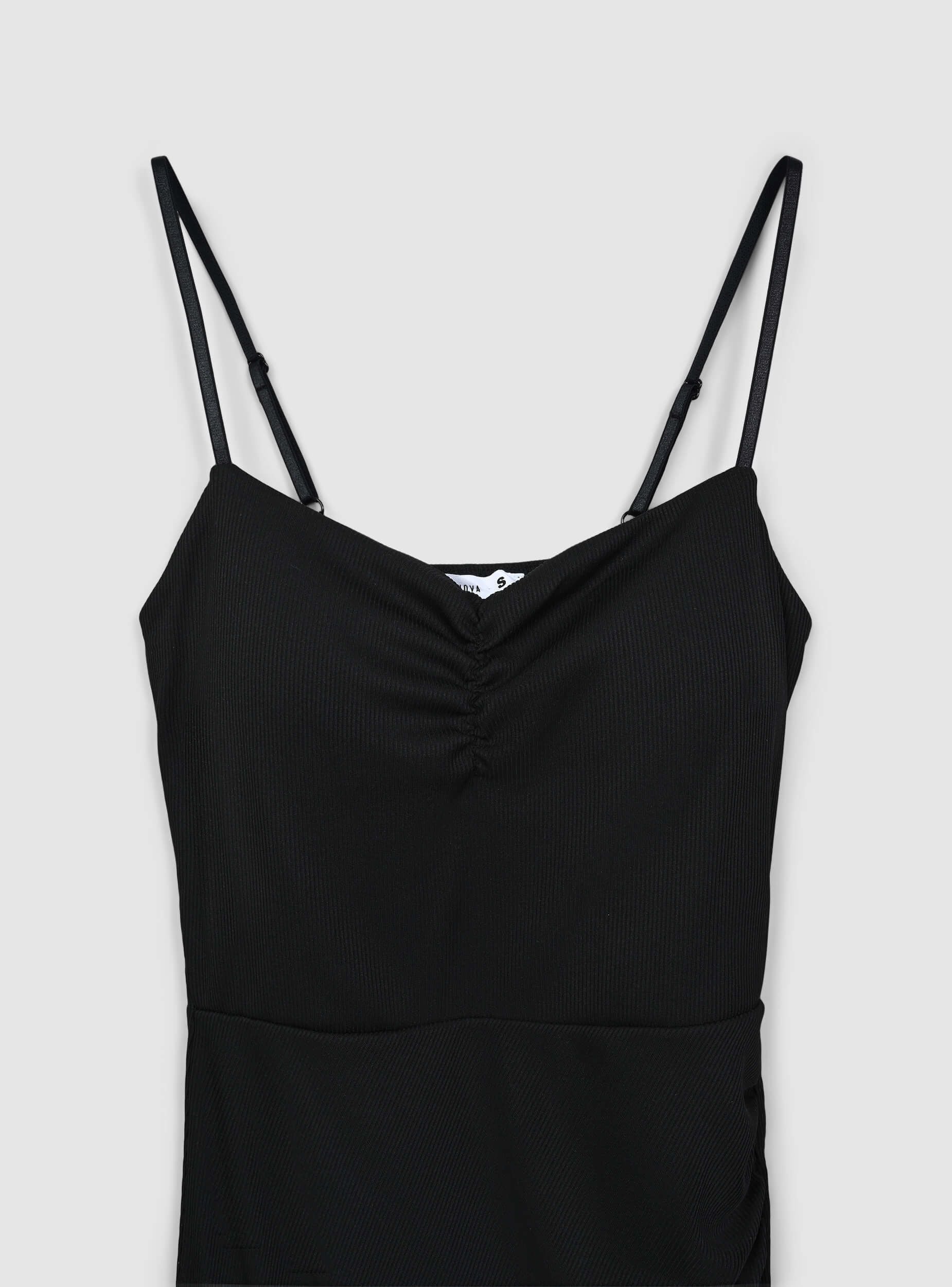 Duga haljina za žene u jednobojnoj boji, opremljena unutarnjim čašicama za veću potporu i udobnost. Karakteriziraju je tanke podesive naramenice koje omogućuju prilagodbu fit. Ovaj model ima elegantni bočni prorez koji dodaje pokret i senzualnost. Gornji dio je obogaćen nježnim nabranim detaljima na grudima, dajući rafinirani i ženski efekt. Savršena za posebne večeri, ova haljina spaja eleganciju i praktičnost u suštinskom i sofisticiranom dizajnu.Detalji