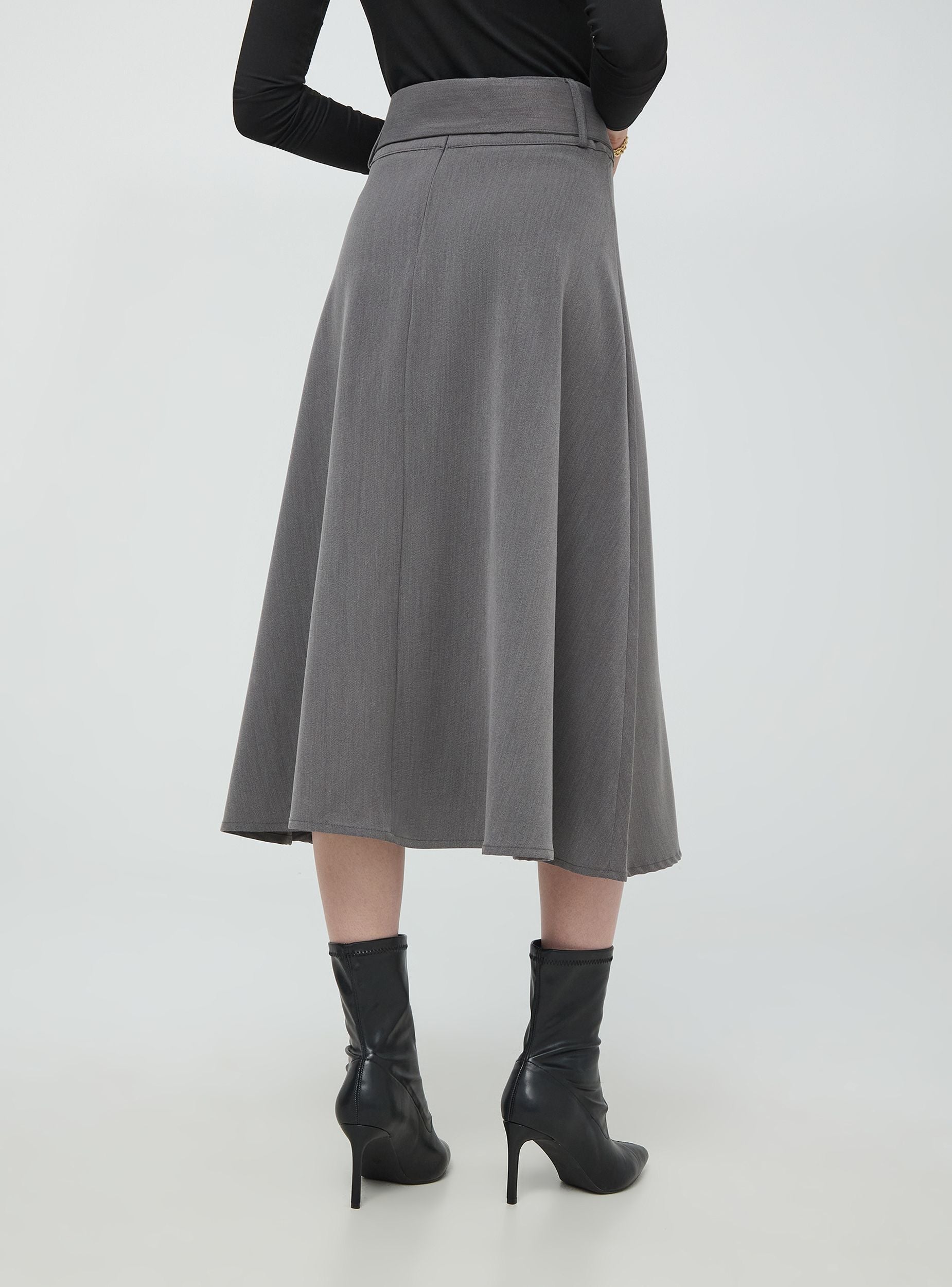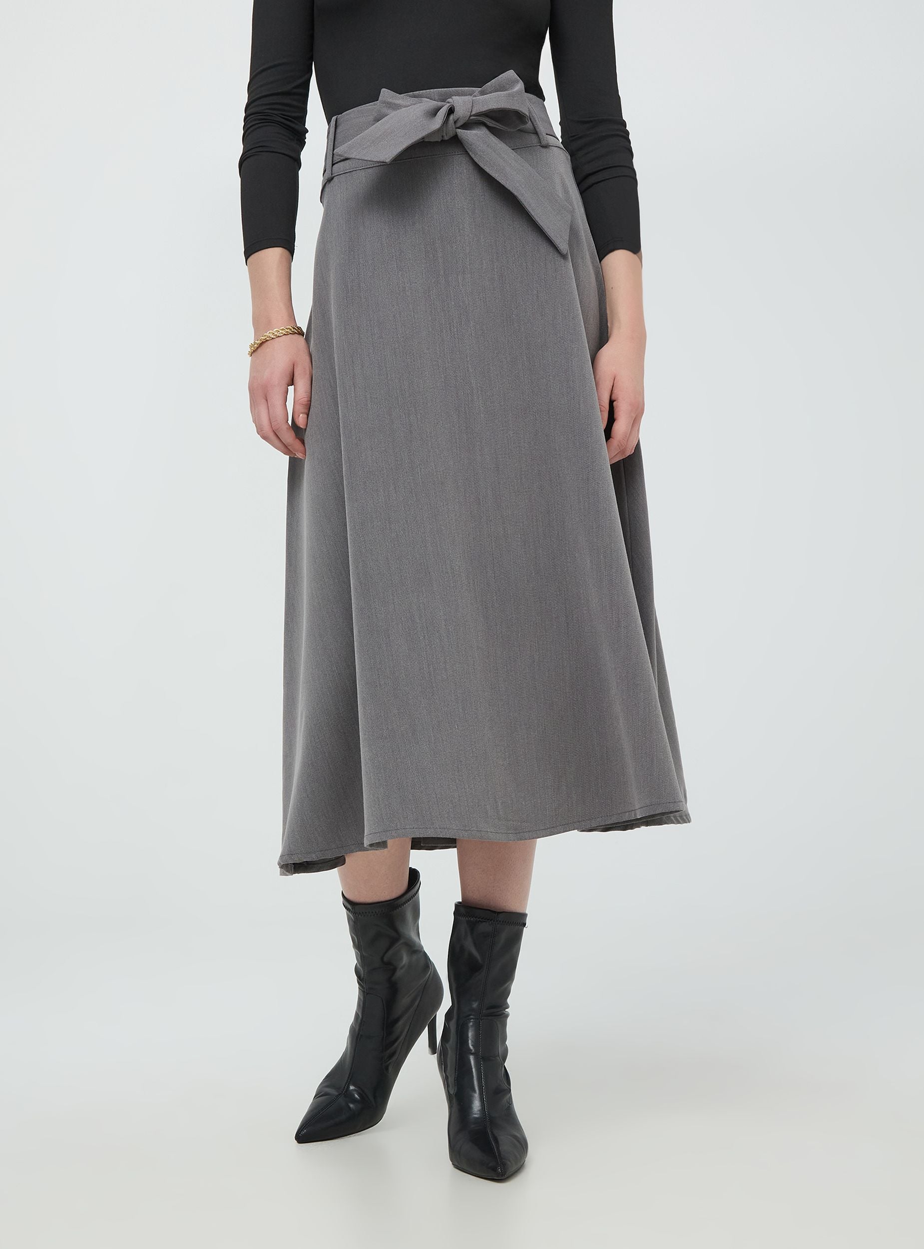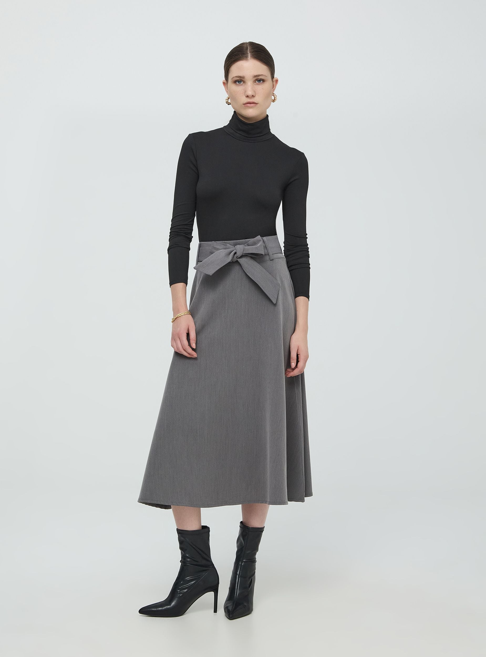 Ženska duža suknja s remenom u struku. Tkanina u jednobojnom melangeu. Ovaj komad ima fluidnu i široku liniju koja pada mekano. Remen u struku u tonu dodaje dašak elegancije i omogućuje podešavanje kroja, naglašavajući siluetu. Zatvaranje s skrivenim patentnim zatvaračem na stražnjoj strani. Suknja je idealna za ležeran i sofisticiran izgled, savršena za različite prilike.Detalji