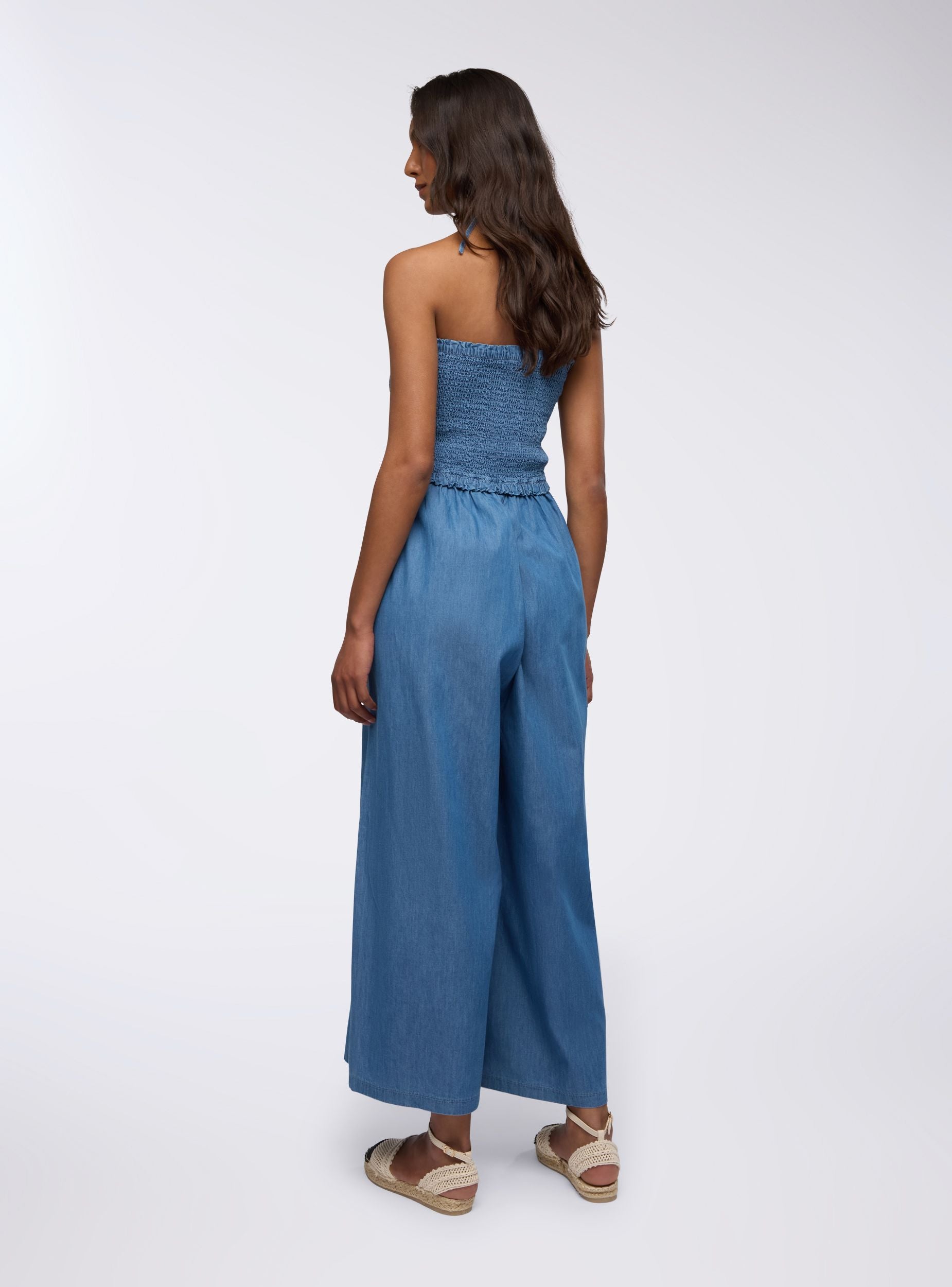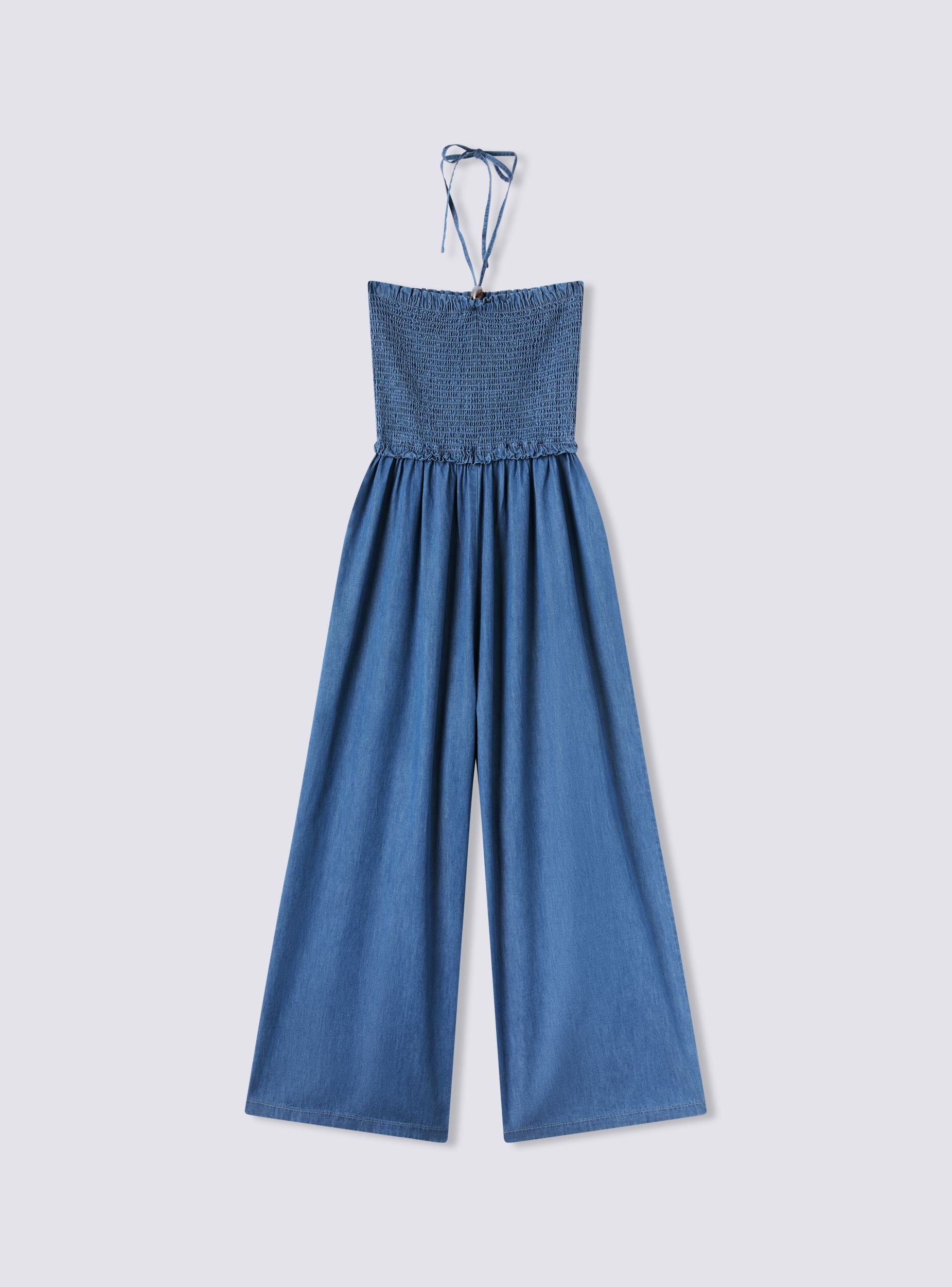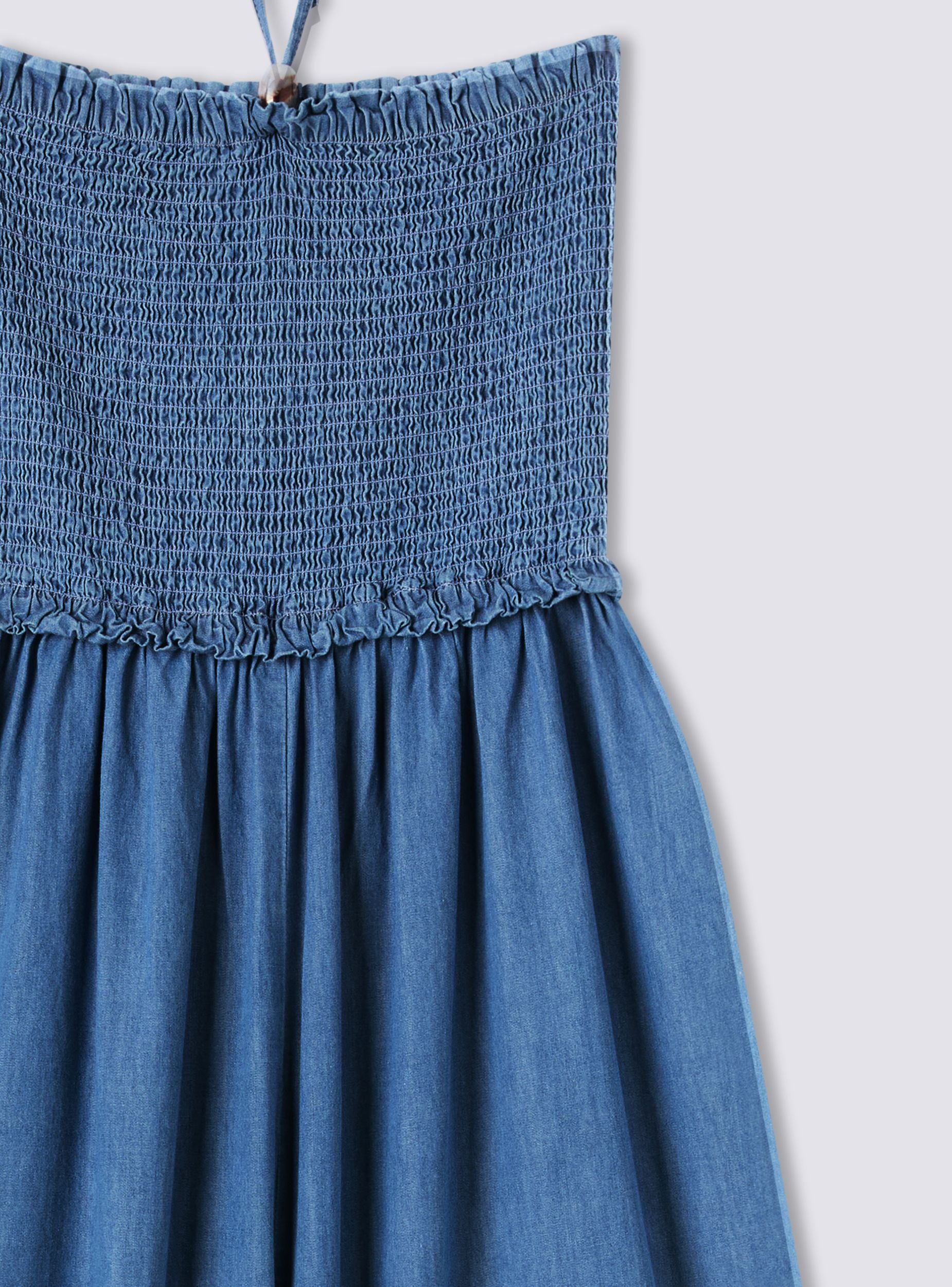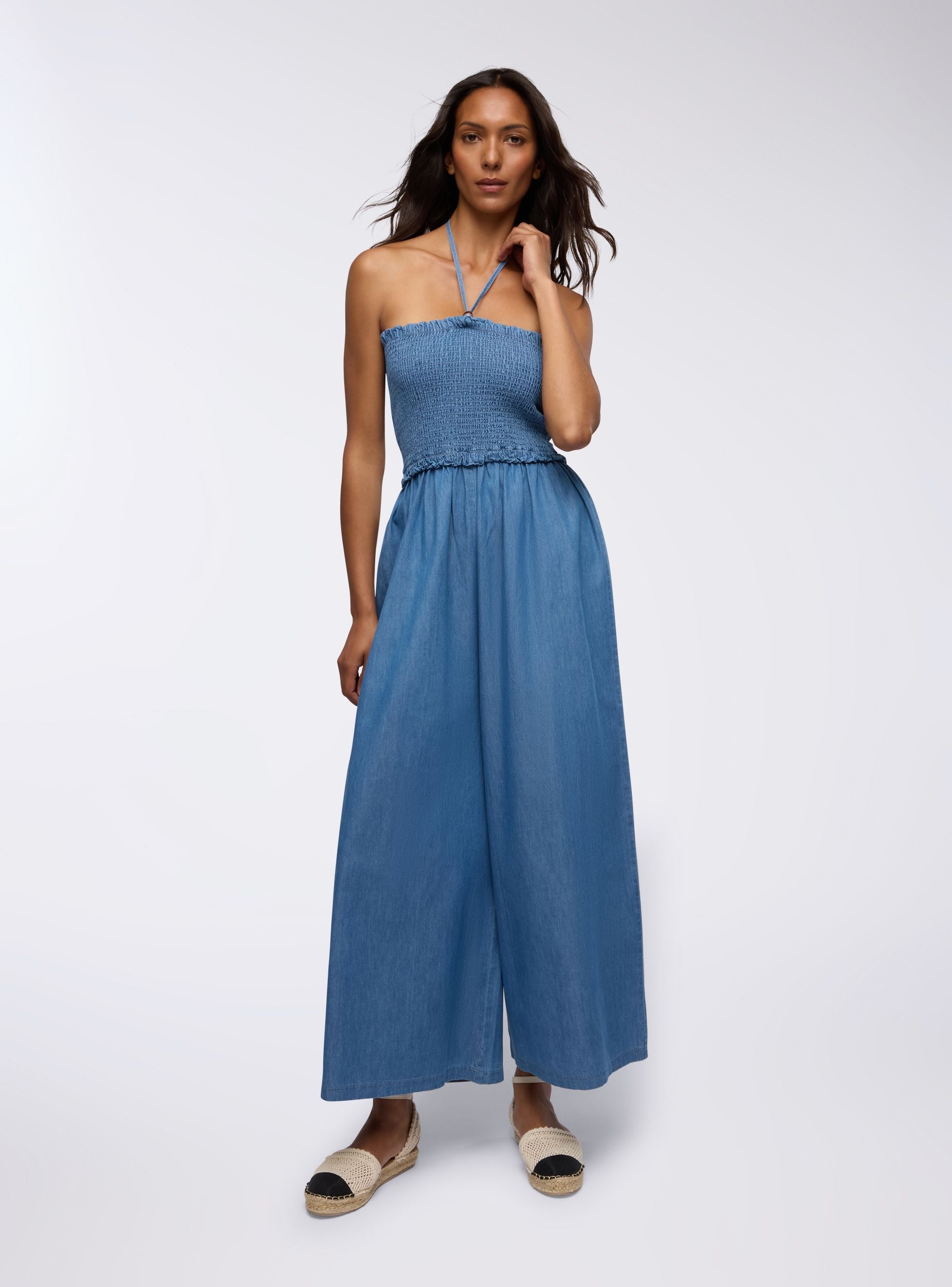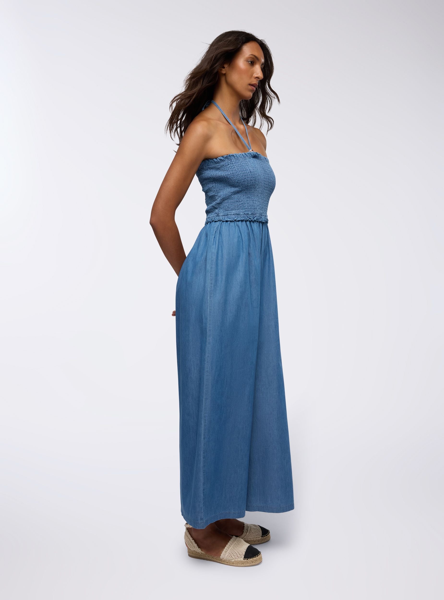Ženska duga kombinezonska haljina u jednobojnoj boji s rafiniranim chambray efektom, savršena za svjež i svestran ljetni izgled. Gornji dio s obrtnim smock uzorkom osigurava prilagodljivu i udobnu fit, dok vezanje na vratu dodaje dašak ženstvenosti. Idealna za šetnje uz more ili gradske dane, savršeno se kombinira s niskim sandalama za ležeran izgled ili s platformama za opuštenu eleganciju.