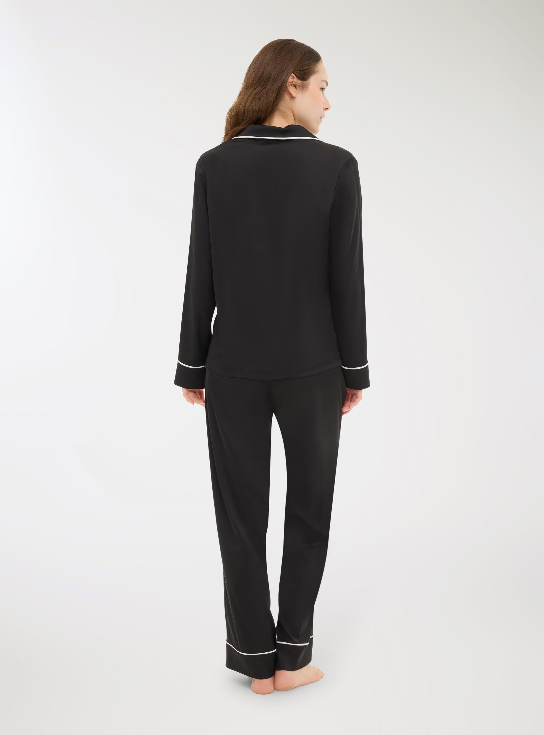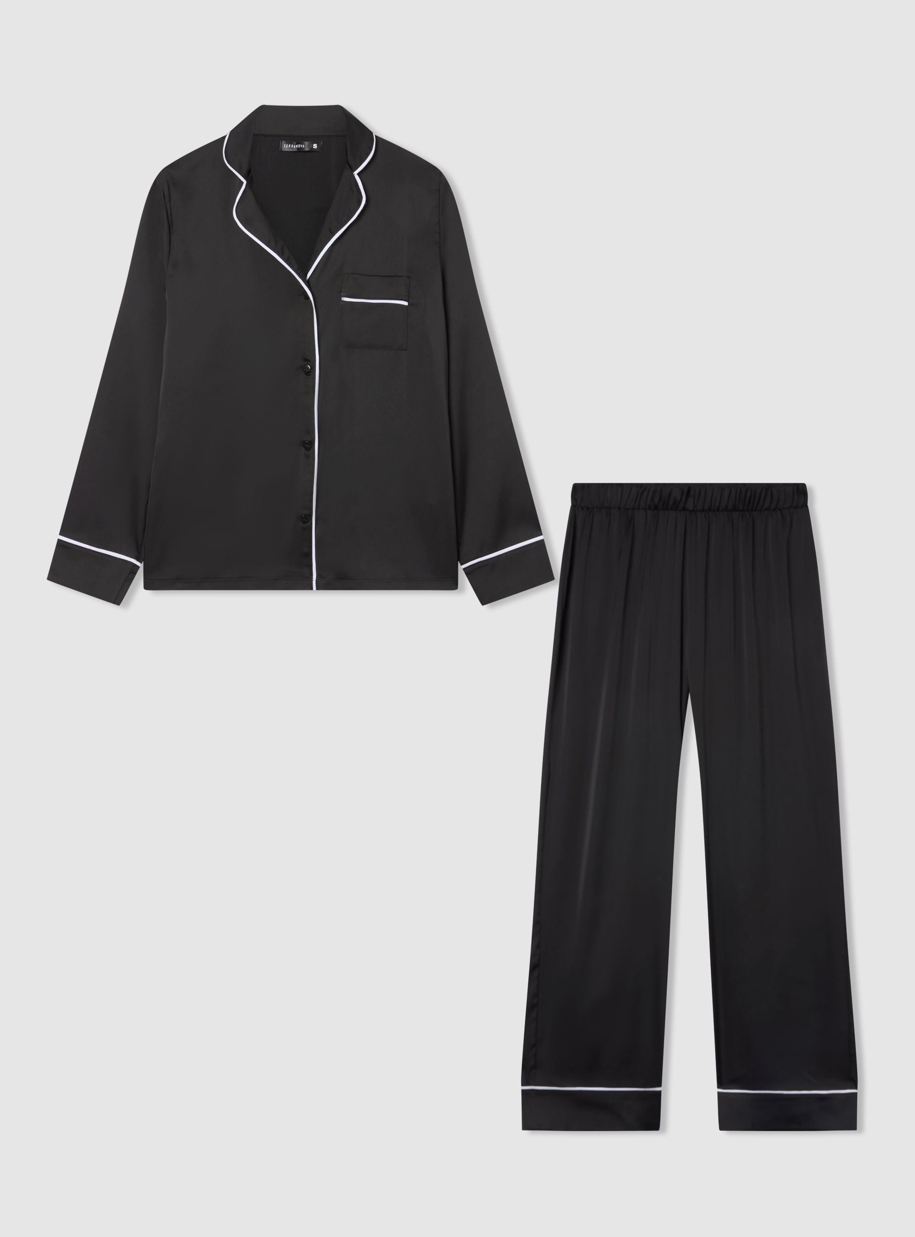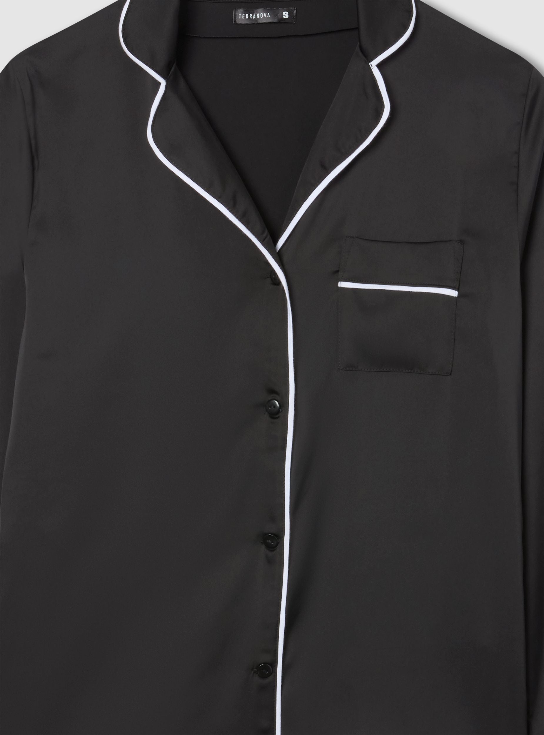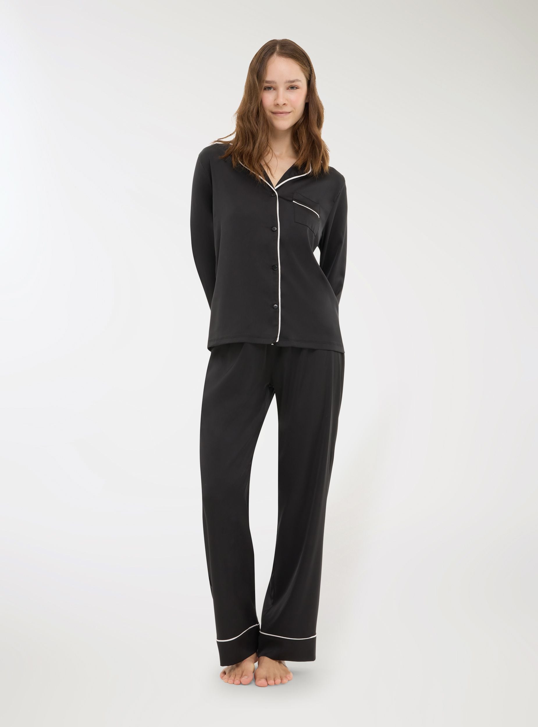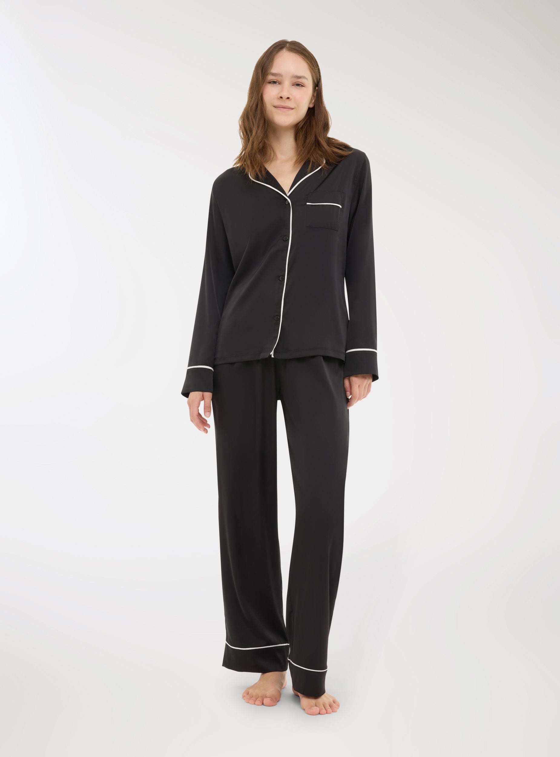 Ženski pidžama sastoji se od košulje i dugih hlača. Košulja ima kopčanje na gumbe, rever ovratnik i džep na prsima. Hlače su udobnog kroja s elastičnim pojasom u struku. Idealna za trenutke opuštanja i odmora, ova pidžama spaja stil i udobnost, savršena za osjećaj ugode kod kuće.Detalji