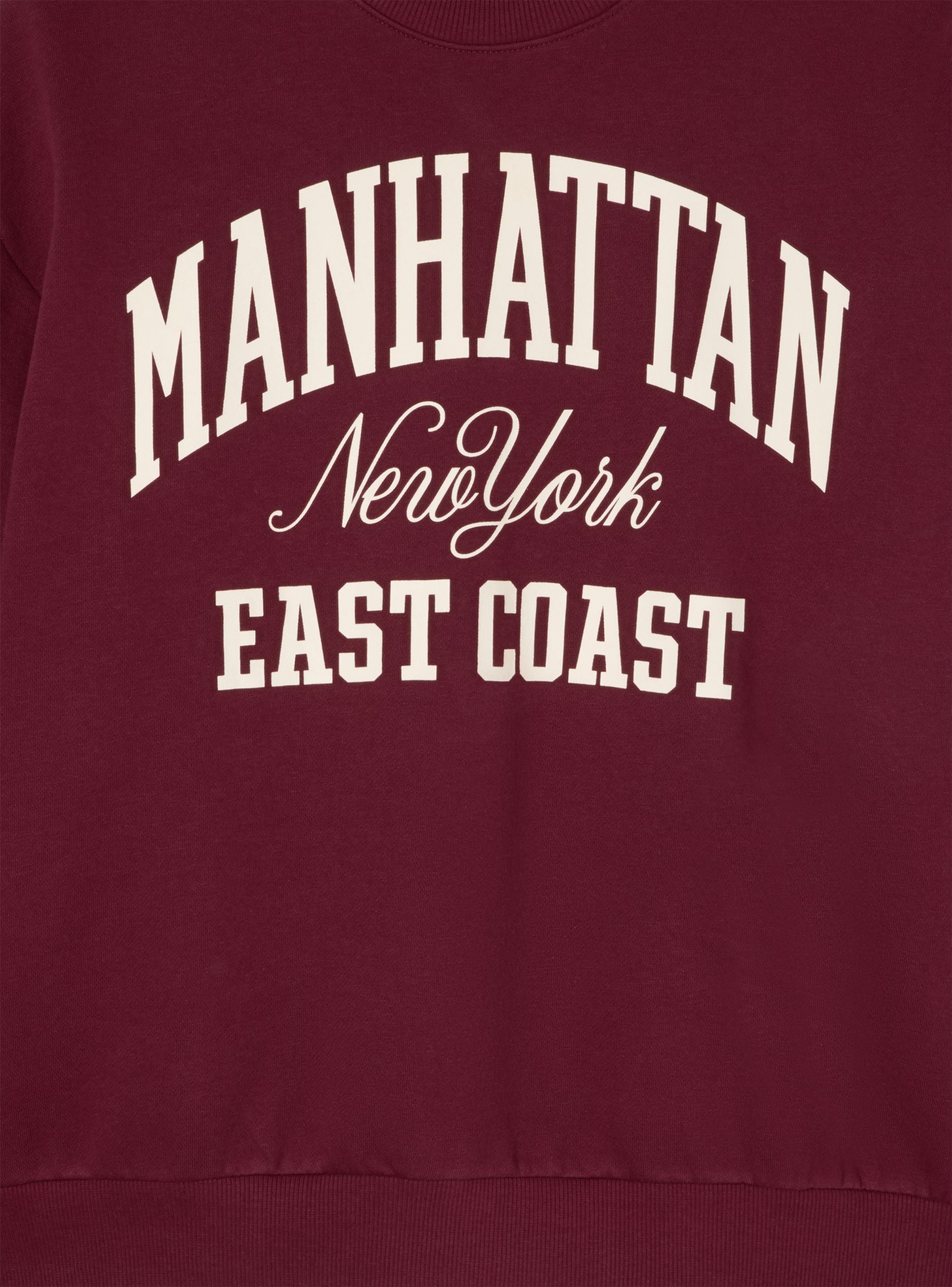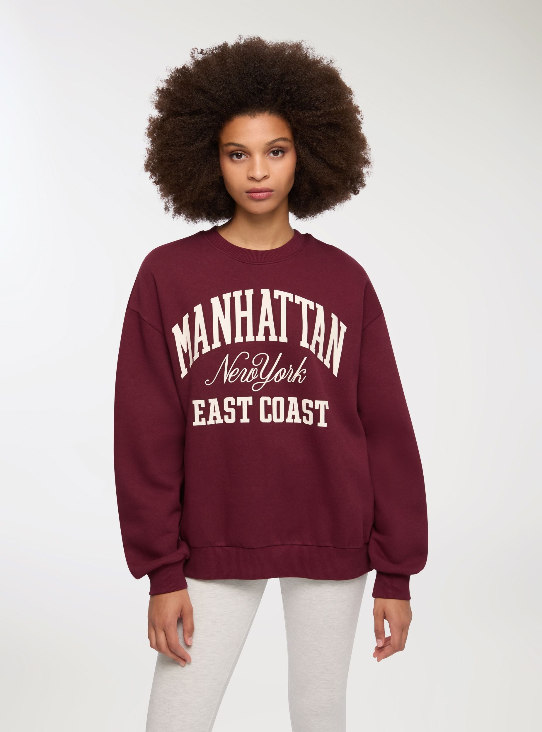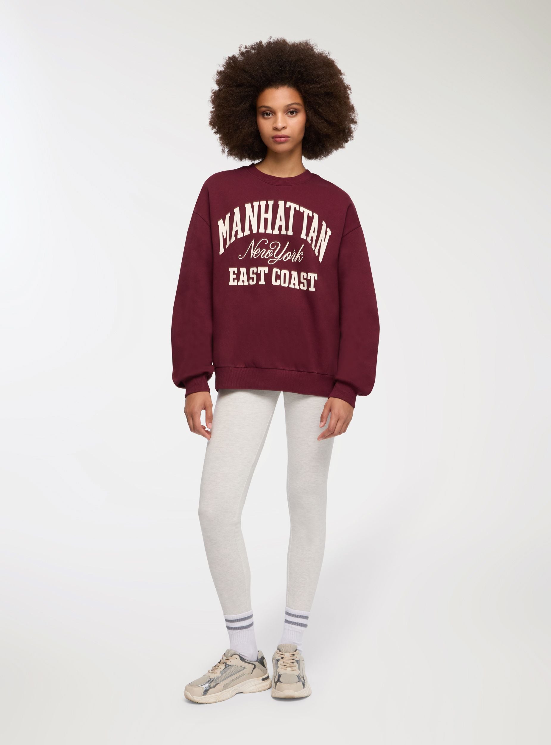 Ženska teška dukserica s college printom “Manhattan New York East Coast”. Dizajn s okruglim izrezom, bez kapuljače i zatvarača, s rebrastim manžetama i donjim dijelom pruža udoban i obavijajući fit, idealan za suočavanje sa zimom sa stilom. Izrađena od flis tkanine, savršena je za ležeran i sportski izgled. Može se kombinirati s trapericama, širokim hlačama ili tajicama kako bi se stvorili urbani outfiti odlučujućeg karaktera i američke inspiracije.Detalji