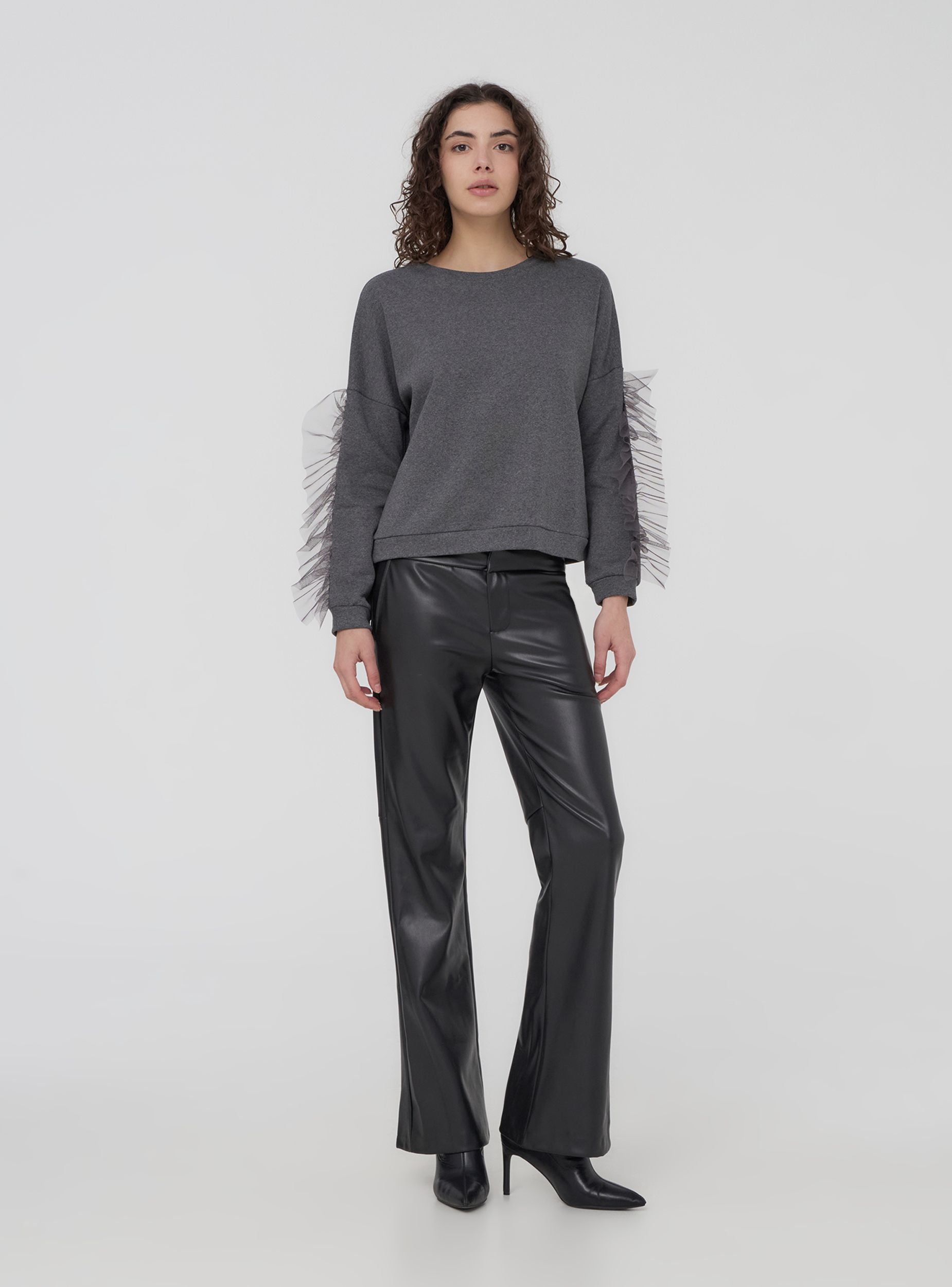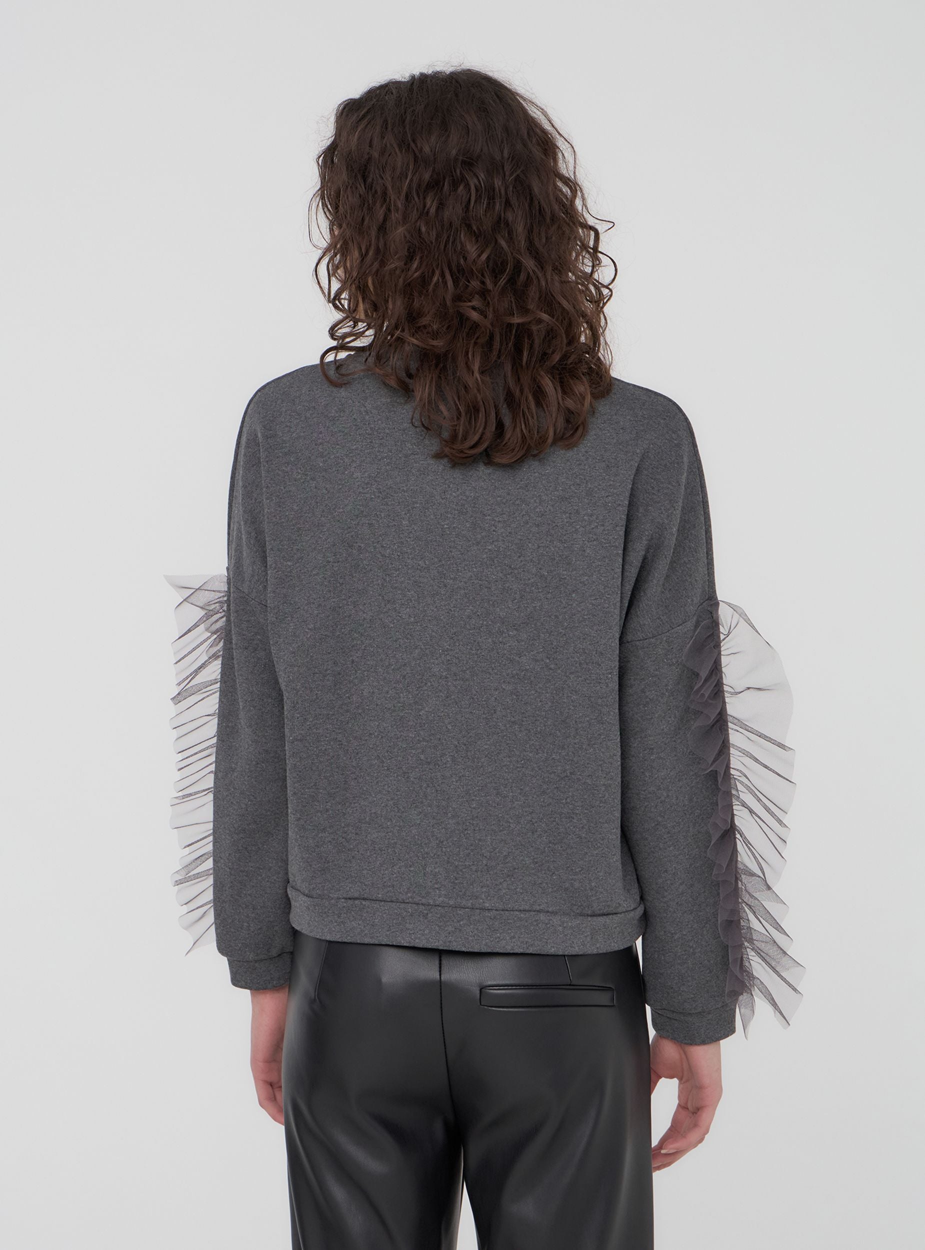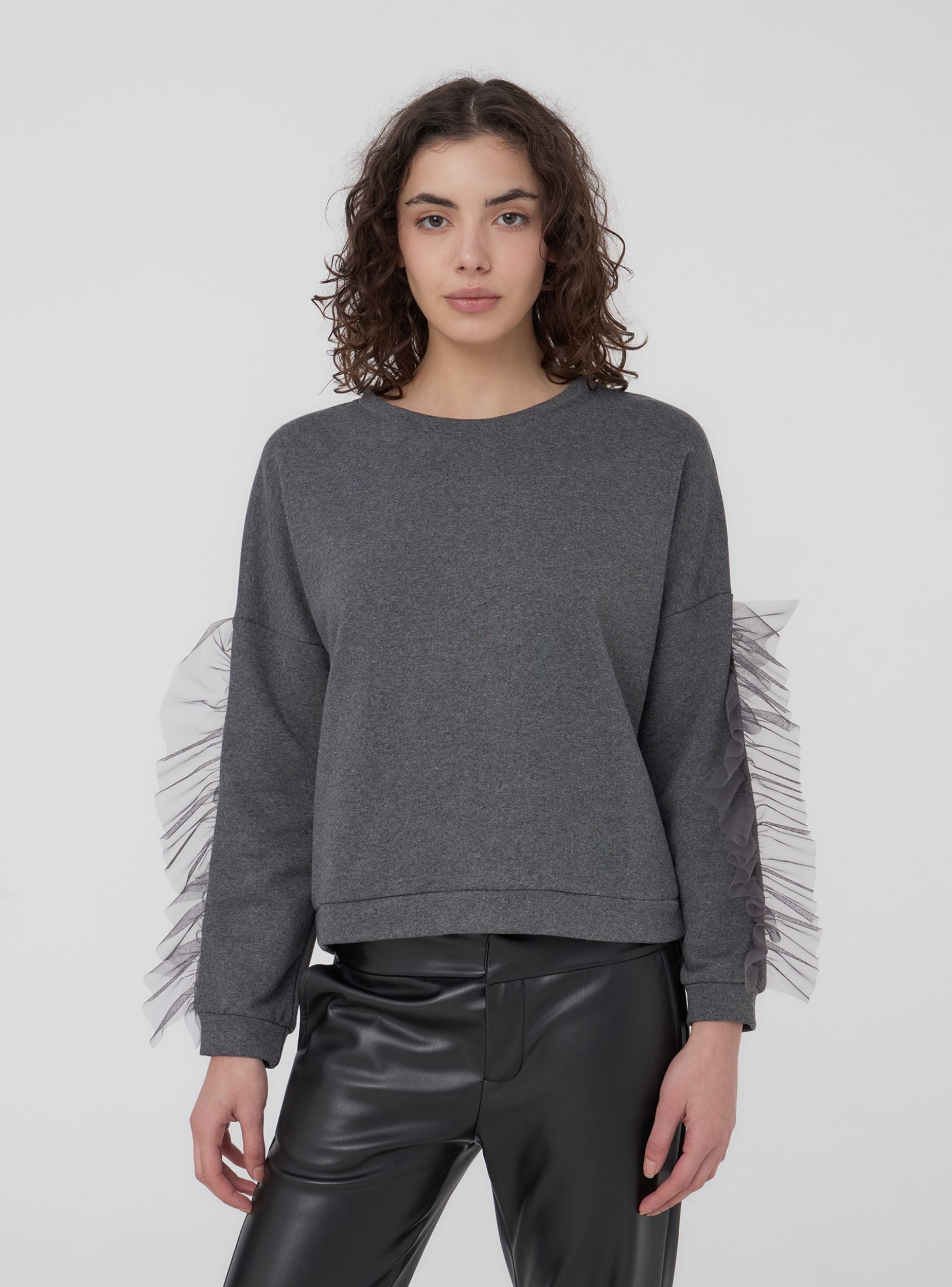 Ženska dukserica bez kapuljače modernog i originalnog dizajna, savršena za dodavanje daška stila vašim ležernim kombinacijama. Karakterizirana jednostavnom strukturom, ova dukserica ima okrugli izrez koji pruža udobnost i svestranost. Dugi rukavi ukrašeni su delikatnim volanima od tila duž bokova, stvarajući voluminozan i romantičan efekt, čineći odjevni predmet jedinstvenim i ženstvenim. Idealna za kombiniranje s trapericama ili suknjama, ova dukserica je namijenjena onima koji žele spojiti praktičnost i originalnost u jednom trendi komadu, zadržavajući svjež i sofisticiran stil.