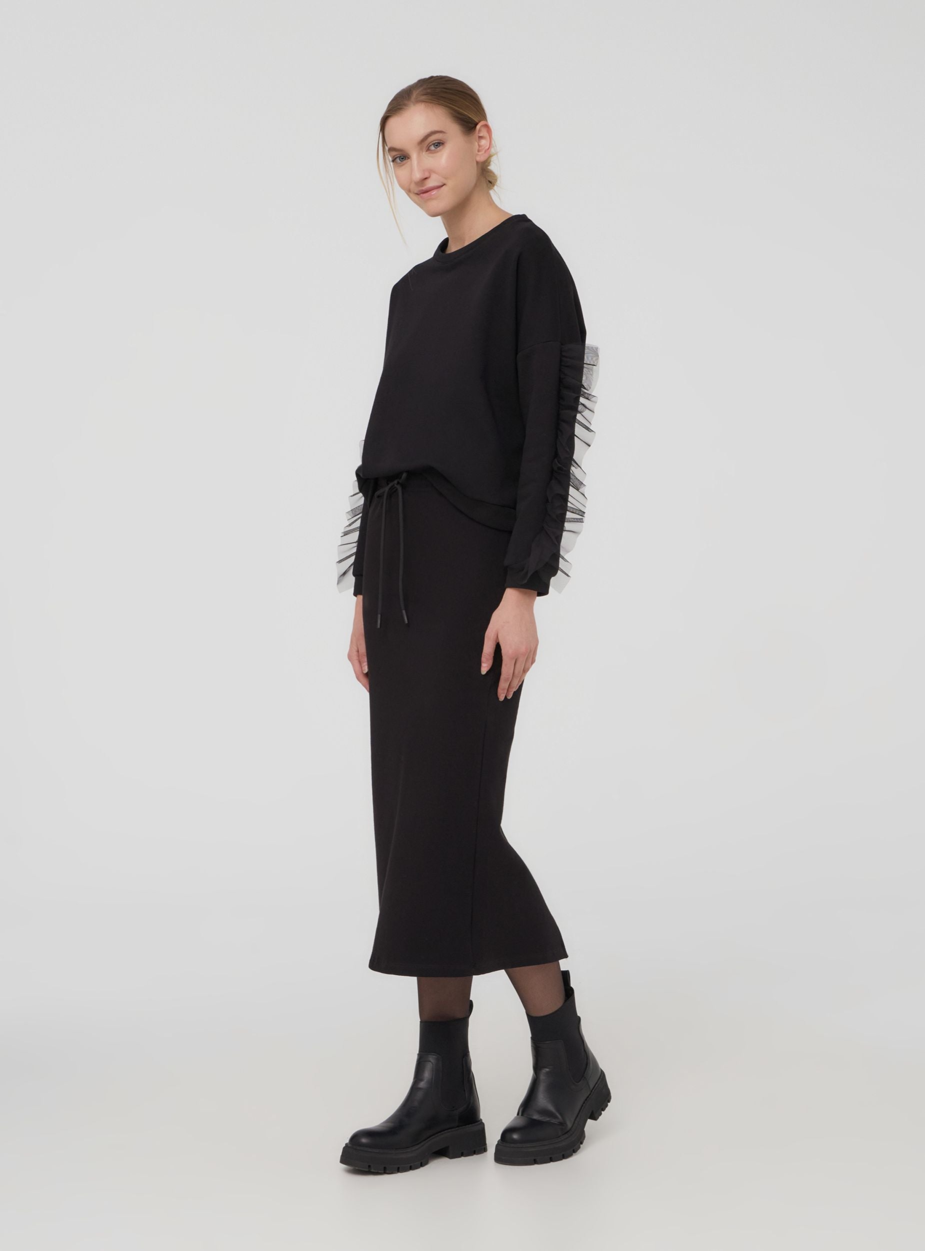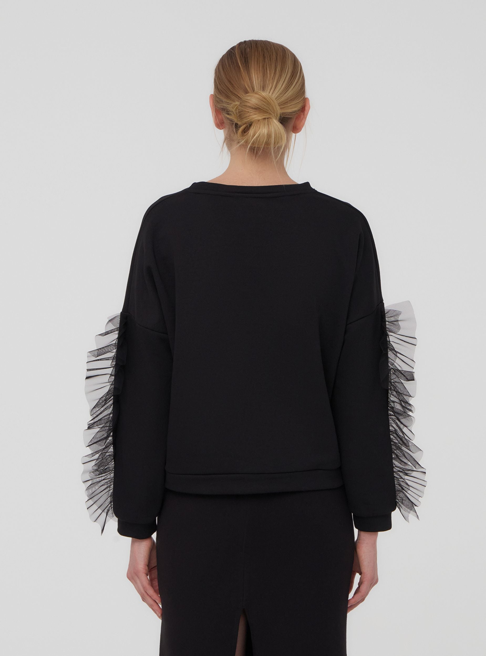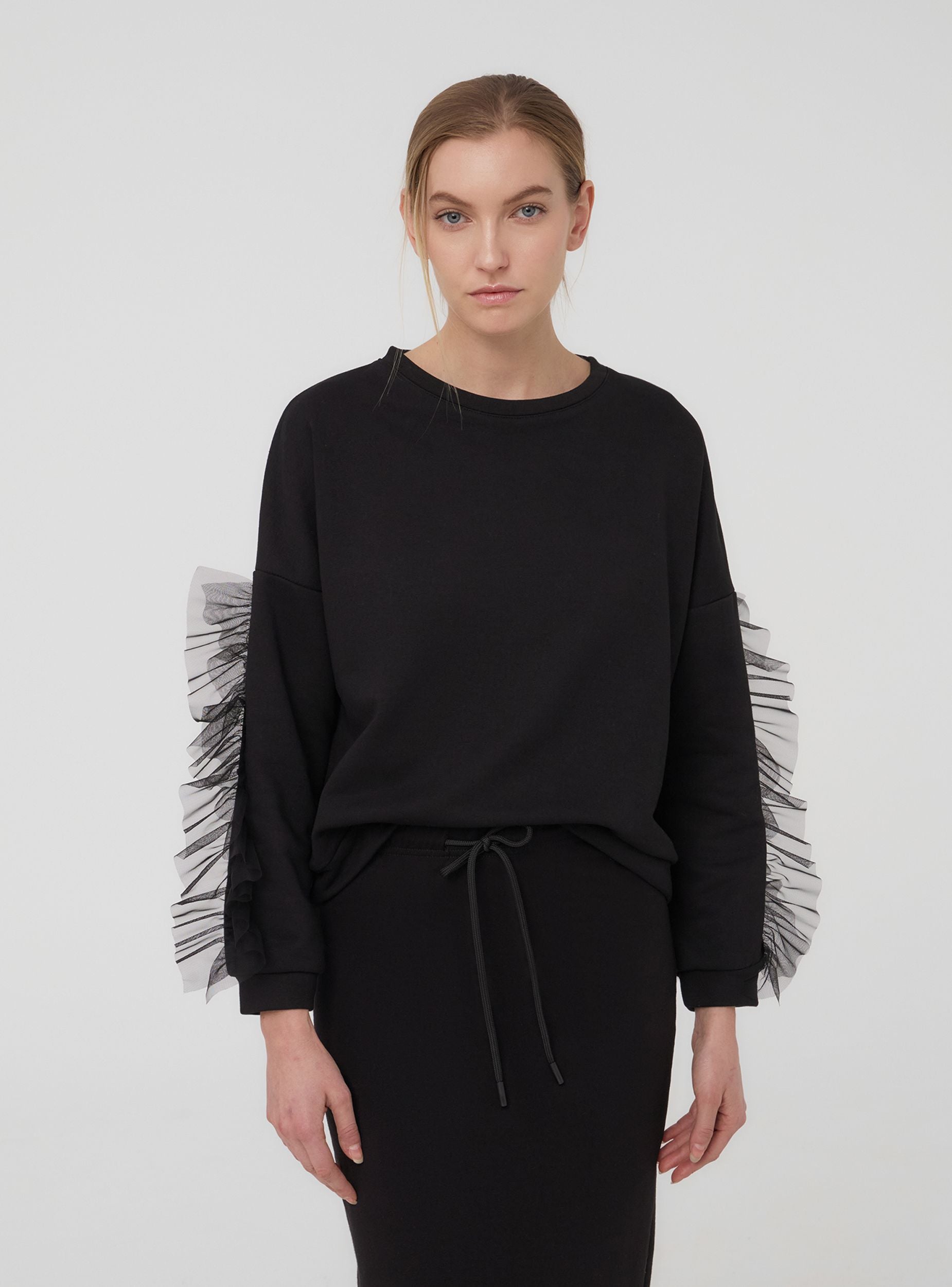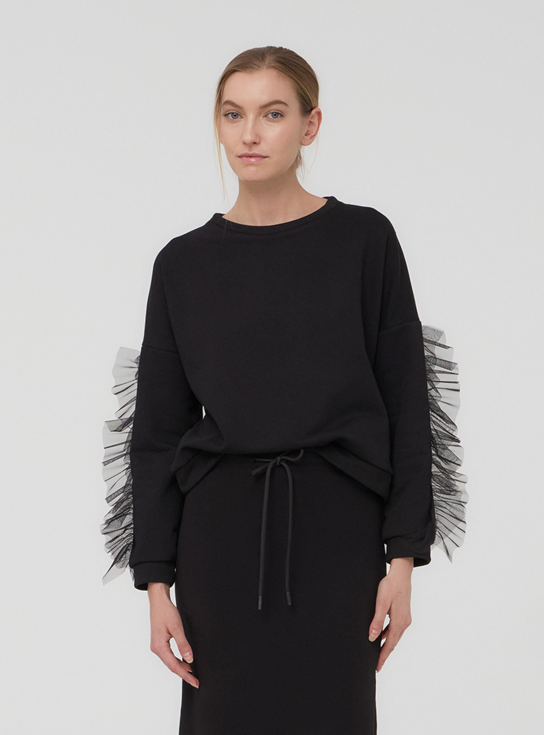 Ženska dukserica bez kapuljače modernog i originalnog dizajna, savršena za dodavanje daška stila tvojim ležernim kombinacijama. Karakterizirana je jednobojnom strukturom, a ova dukserica ima okrugli izrez koji pruža udobnost i svestranost. Dugi rukavi ukrašeni su delikatnim volanima od tila duž stranica, što stvara voluminozan i romantičan efekt, čineći odjevni predmet jedinstvenim i ženstvenim. Idealna za kombiniranje s trapericama ili suknjama, ova dukserica namijenjena je onima koji žele spojiti praktičnost i originalnost u jednom trendi komadu, zadržavajući svjež i sofisticiran stil.Detalji