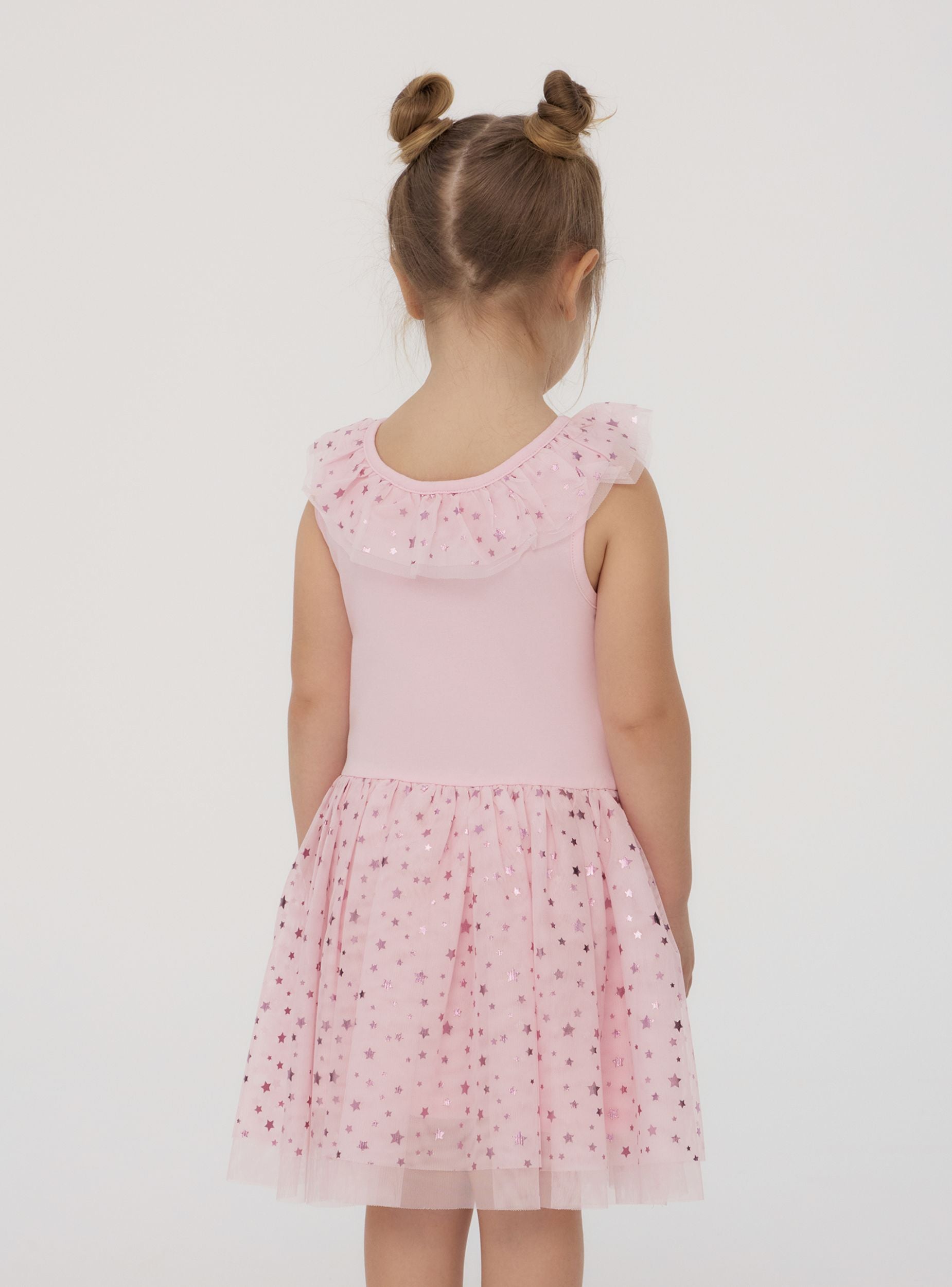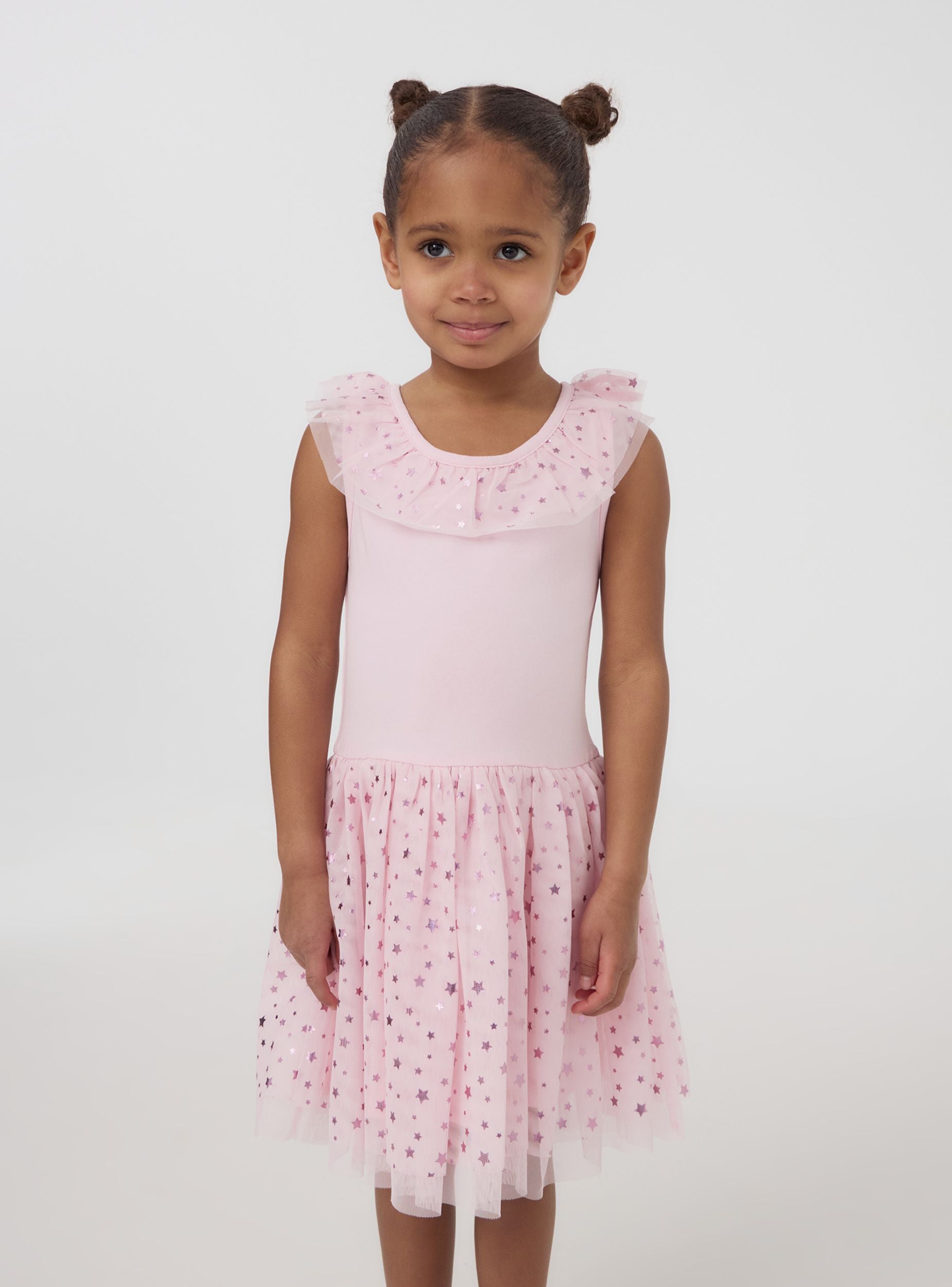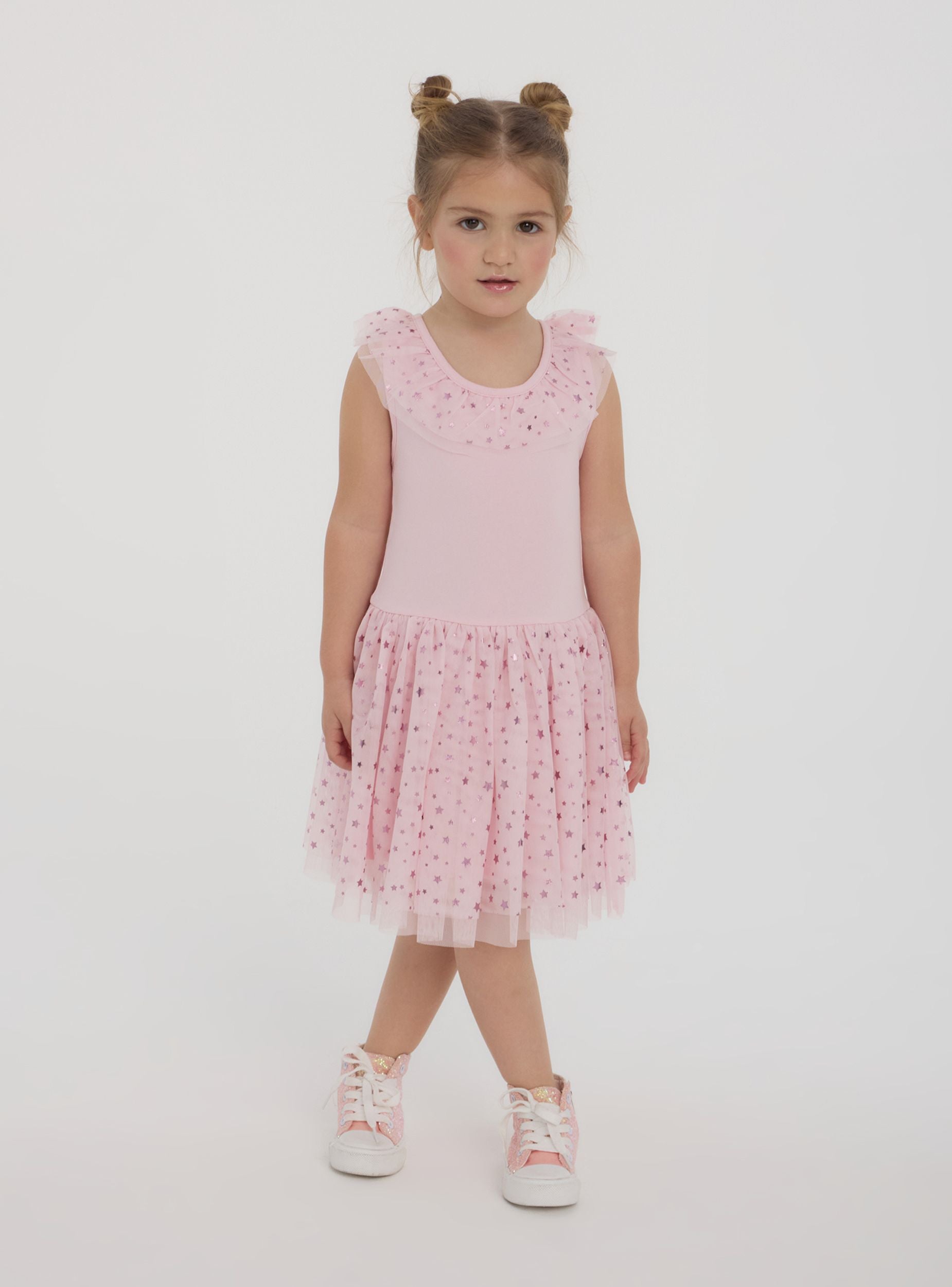 Savršena haljina za djevojčice za posebne trenutke, obogaćena elegantnim volanima koji daju volumen i pokret. Jednobojna boja se slaže s kaskadom sjajnih zvijezda, donoseći dašak magije svakom koraku. Idealna odjeća za proživljavanje bajkovitih avantura i osjećaj da ste uvijek u središtu pozornosti, s dizajnom koji očarava i ističe živahnost i radost onoga tko je nosi.Detalji