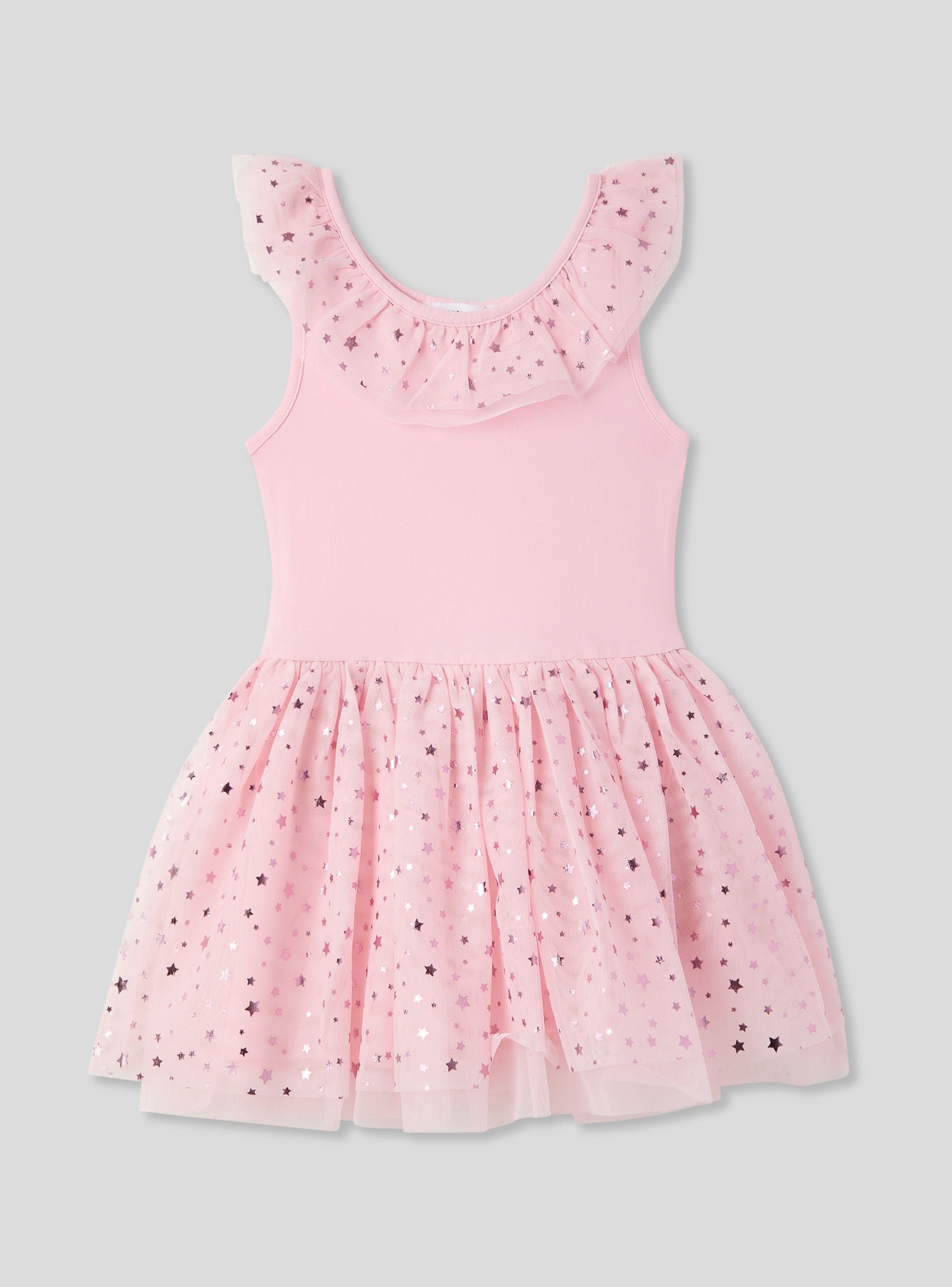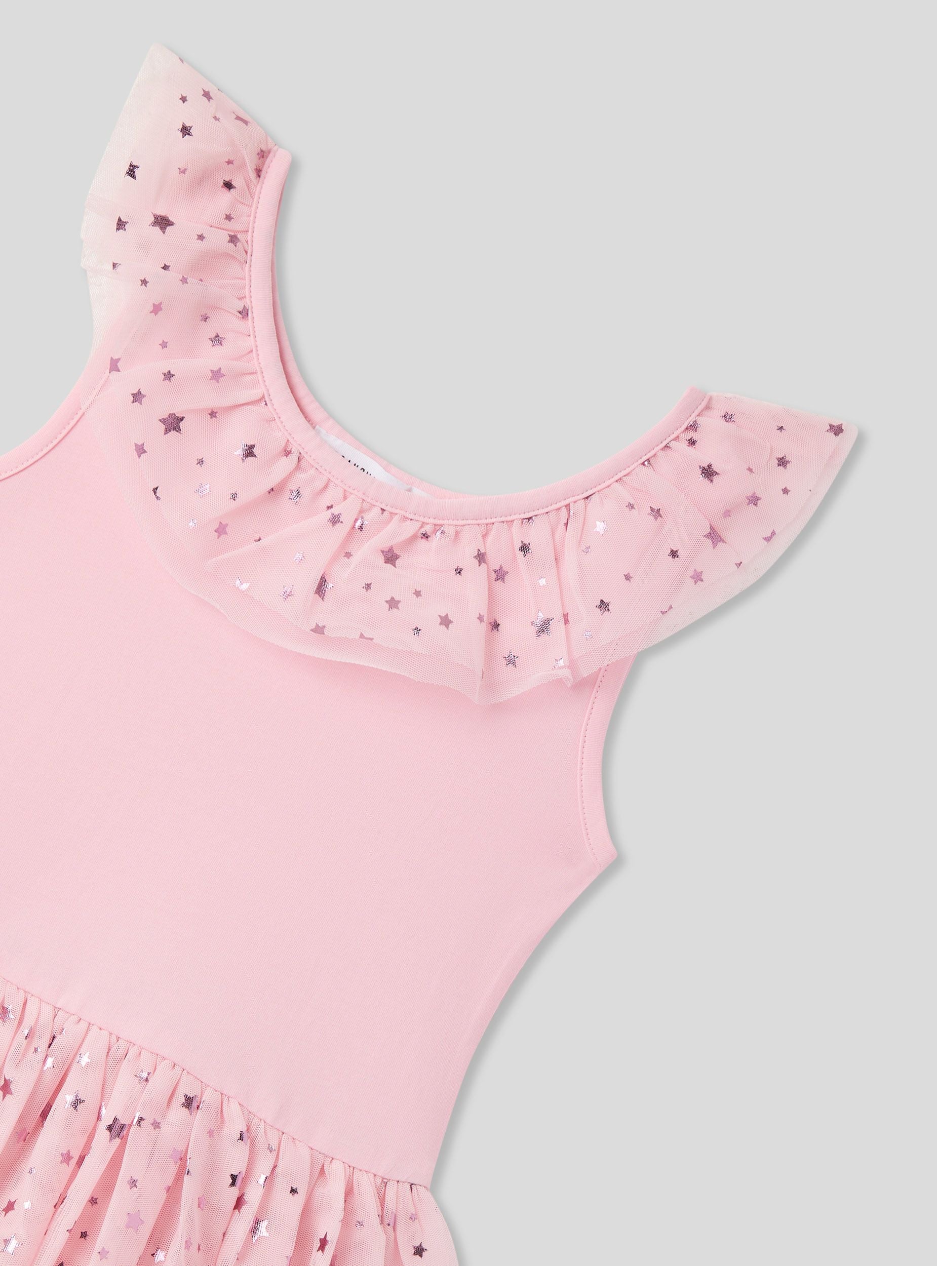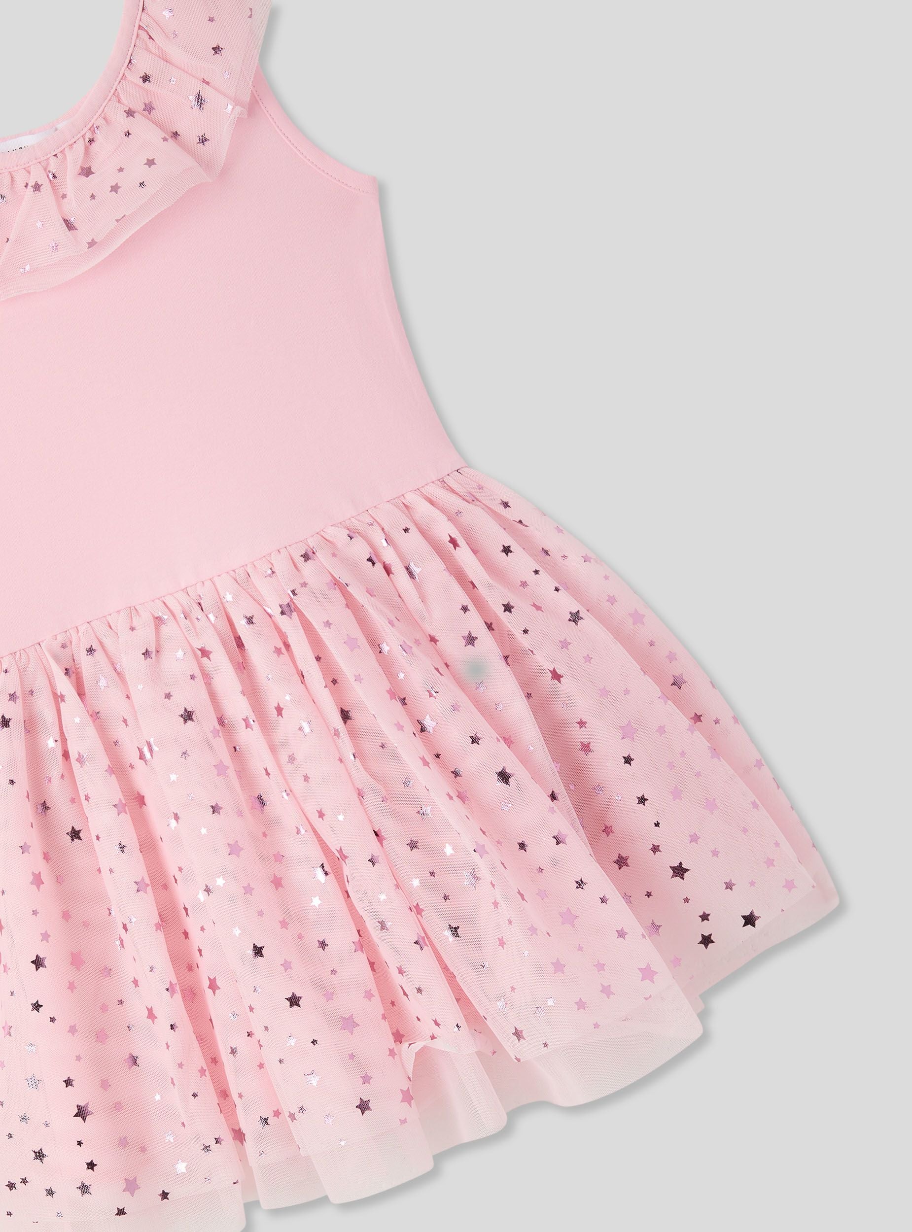 Savršena haljina za djevojčice za posebne trenutke, obogaćena elegantnim volanima koji daju volumen i pokret. Jednobojna boja se slaže s kaskadom sjajnih zvijezda, donoseći dašak magije svakom koraku. Idealna odjeća za proživljavanje bajkovitih avantura i osjećaj da ste uvijek u središtu pozornosti, s dizajnom koji očarava i ističe živahnost i radost onoga tko je nosi.Detalji
