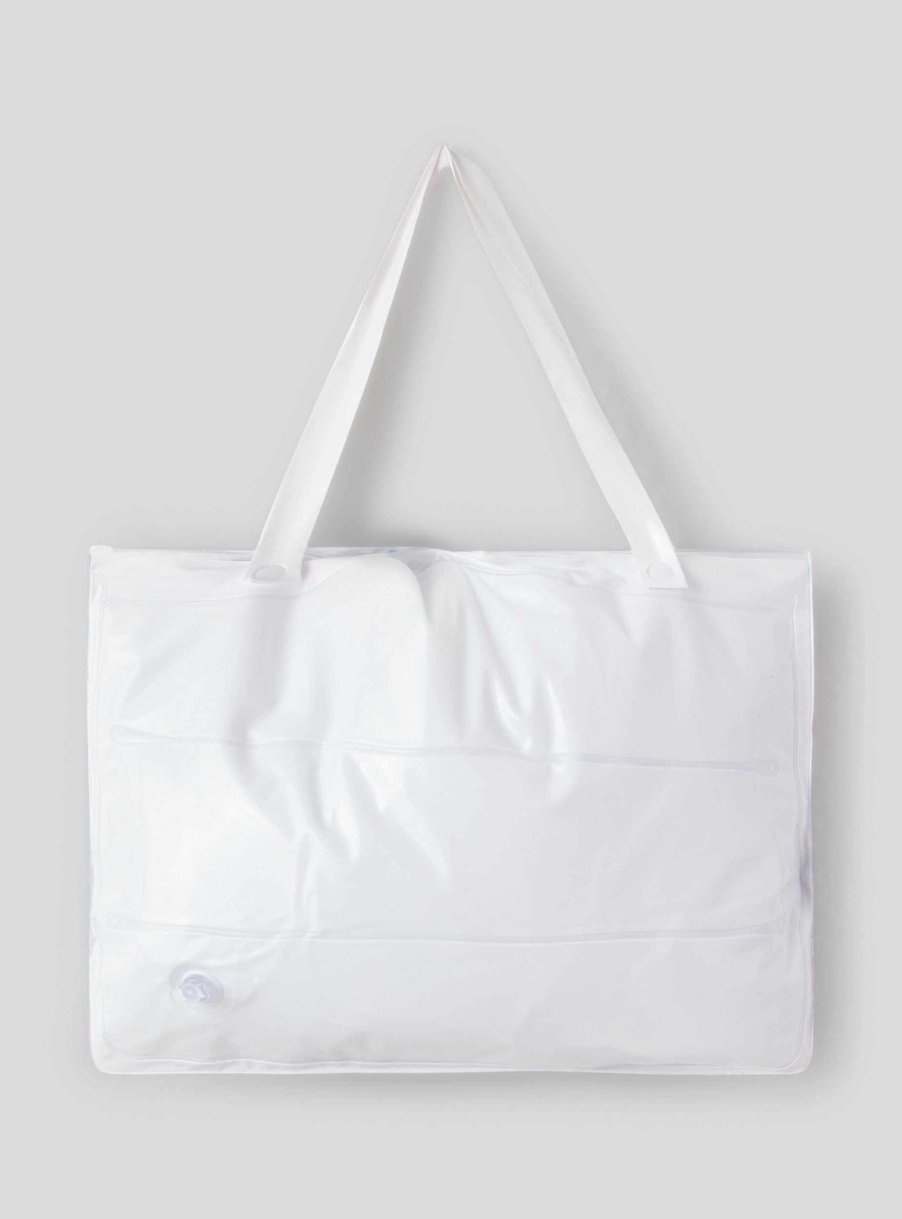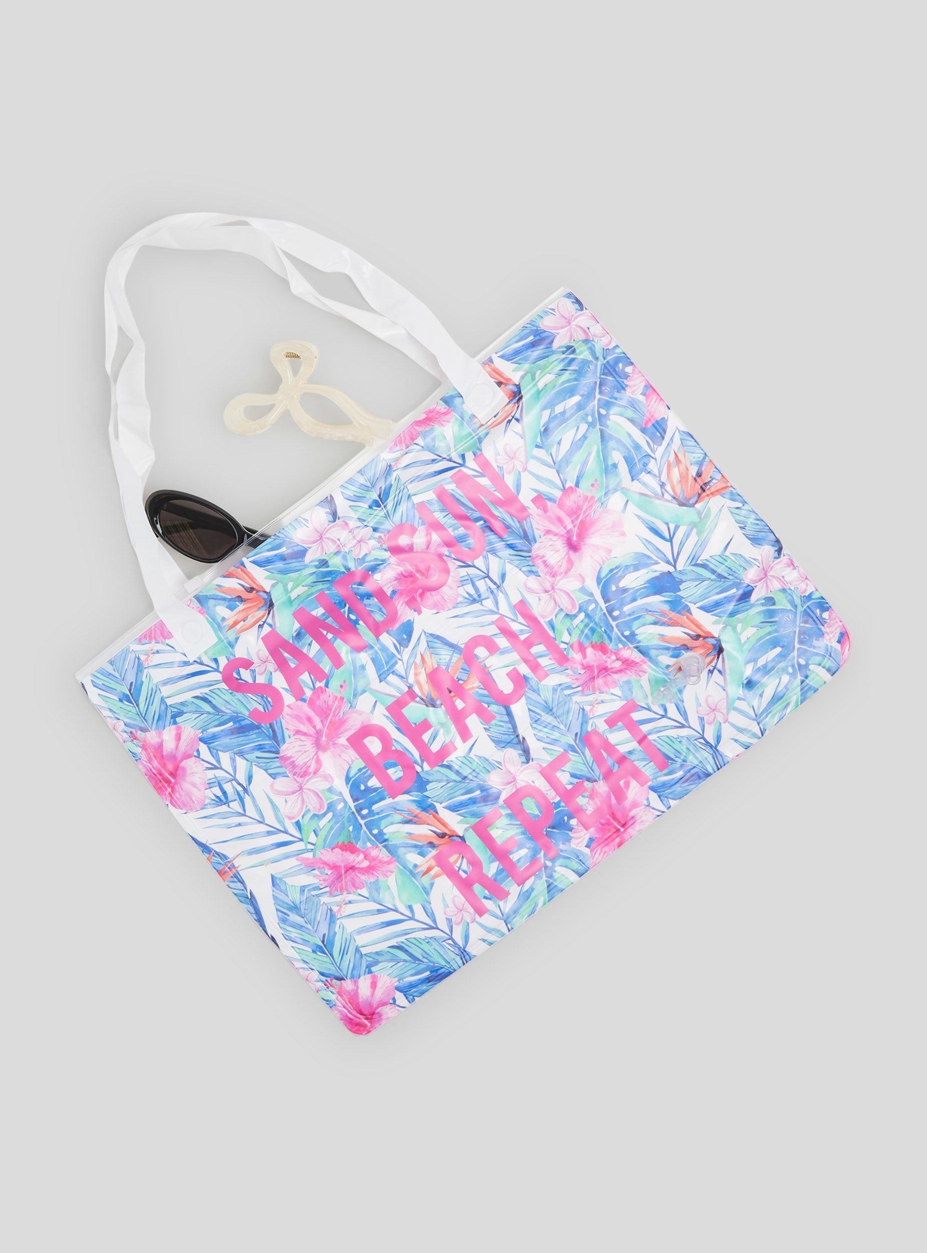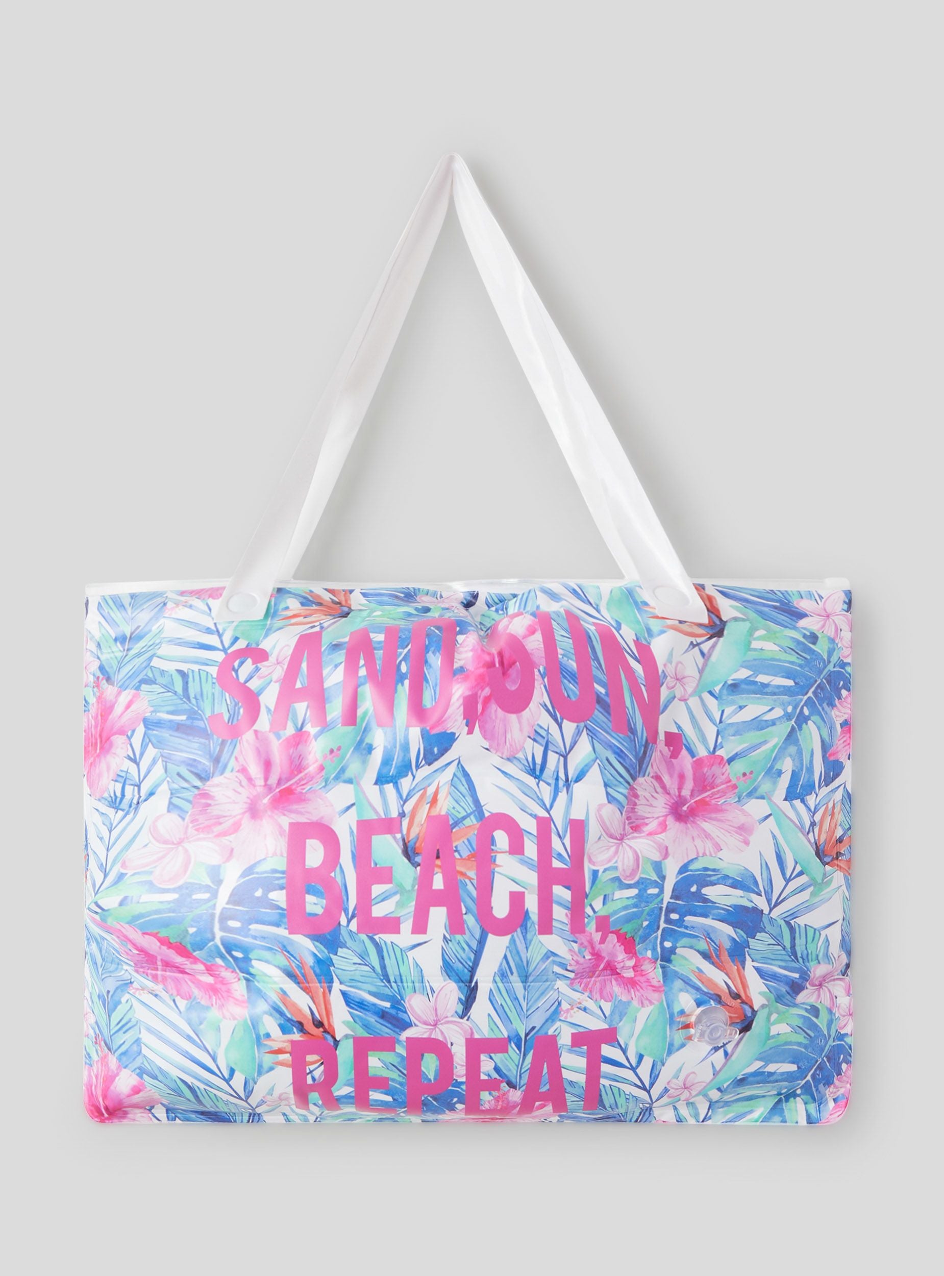 Ženska torba idealna za dane na moru ili u bazenu. Izrađena od napuhavajućeg materijala, ima živopisni tropski uzorak s natpisima koji evociraju ljeto. Opremljena je čvrstim ručkama i prostrana je za pohranu svega što vam je potrebno za dan opuštanja. Savršena je za upotpunjavanje vašeg ljetnog izgleda i dodavanje daška stila vašim avanturama na suncu. Dimenzije: Visina 23 cm, Duljina 40 cm, Dubina 1 cm.Detalji
