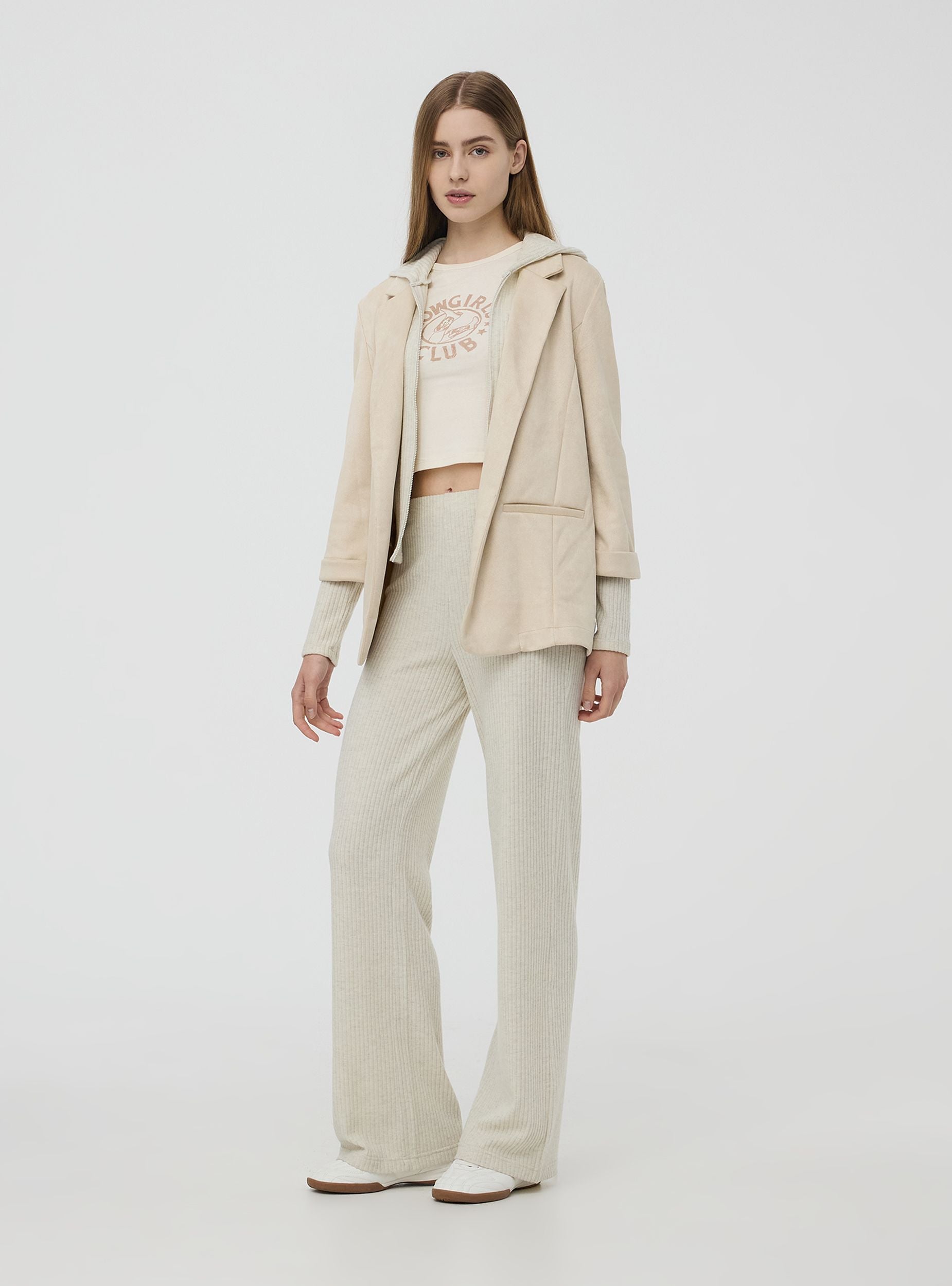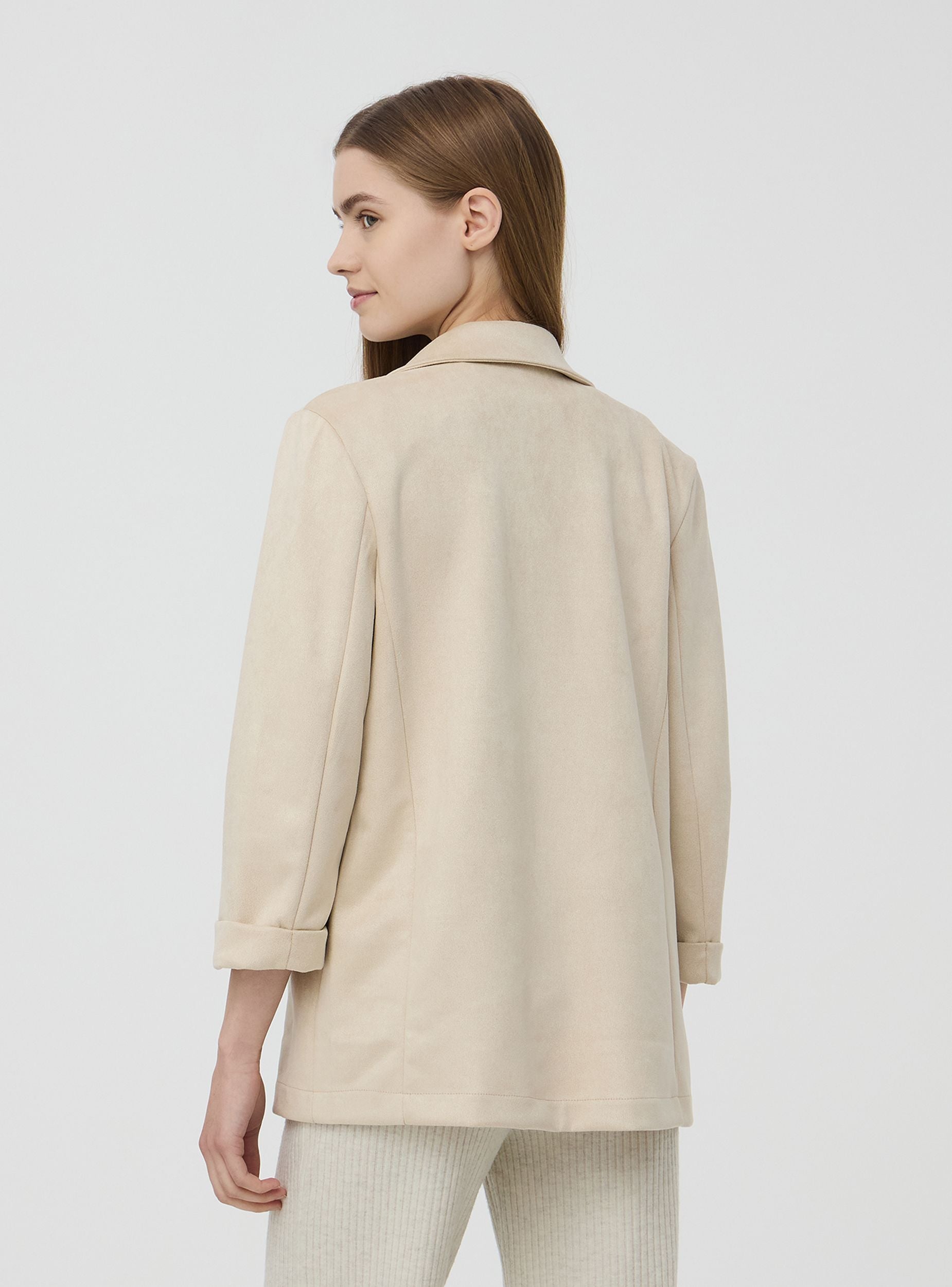 Ženska otvorena destrukturirana jakna. Karakterizirana laganim i fluidnim dizajnom bez krutih elemenata ili podstava. Jakna ima opušteni kroj, bez prednjeg zatvaranja, što joj daje ležeran i moderan izgled. Ramena su meka, bez krutih šavova, a linija tijela slobodno pada, slijedeći prirodni oblik bez ograničenja. Savršena za svestran odjevni predmet koji se prilagođava kako radnim kontekstima, tako i opuštenijim situacijama, zadržavajući elegantan, ali ležeran stil.Detalji