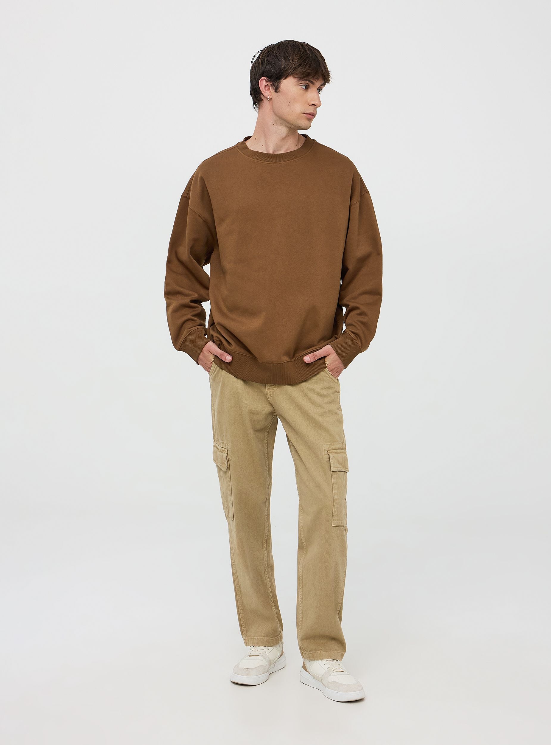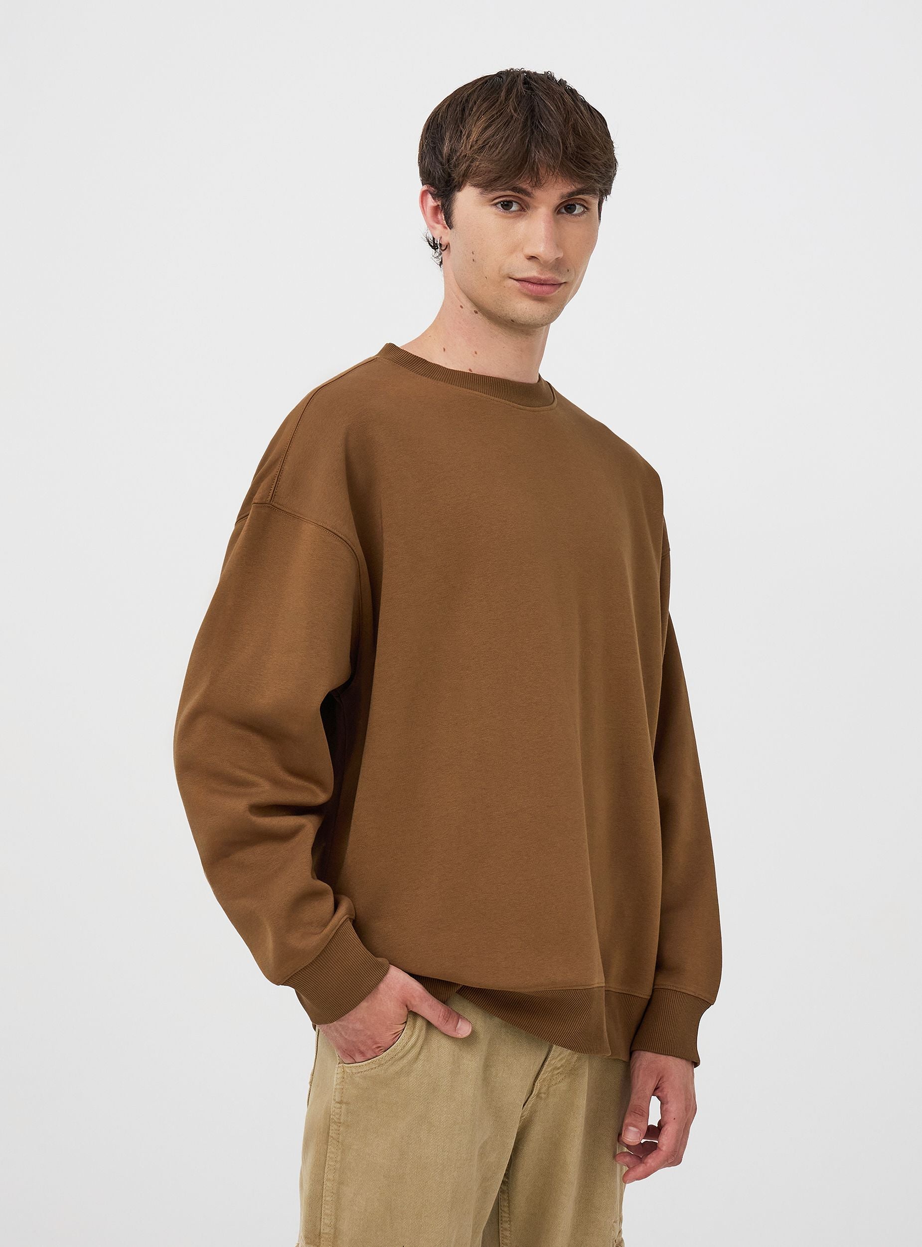 Muška oversized dukserica osnovnog dizajna u jednobojnoj boji, izrađena od teškog, mekog i udobnog materijala. Ima minimalistički dizajn bez kapuljače, s okruglim izrezom i dugim rukavima, završena s manžetama, rubom i rebrastim ovratnikom. Savršena za ležeran i moderan izgled, ova oversized dukserica idealna je za slobodno vrijeme, izlaske s prijateljima ili trenutke opuštanja kod kuće. Lako se kombinira s trapericama, sportskim hlačama ili jogger hlačama, pružajući udobnost i stil u svakoj prilici.Detalji