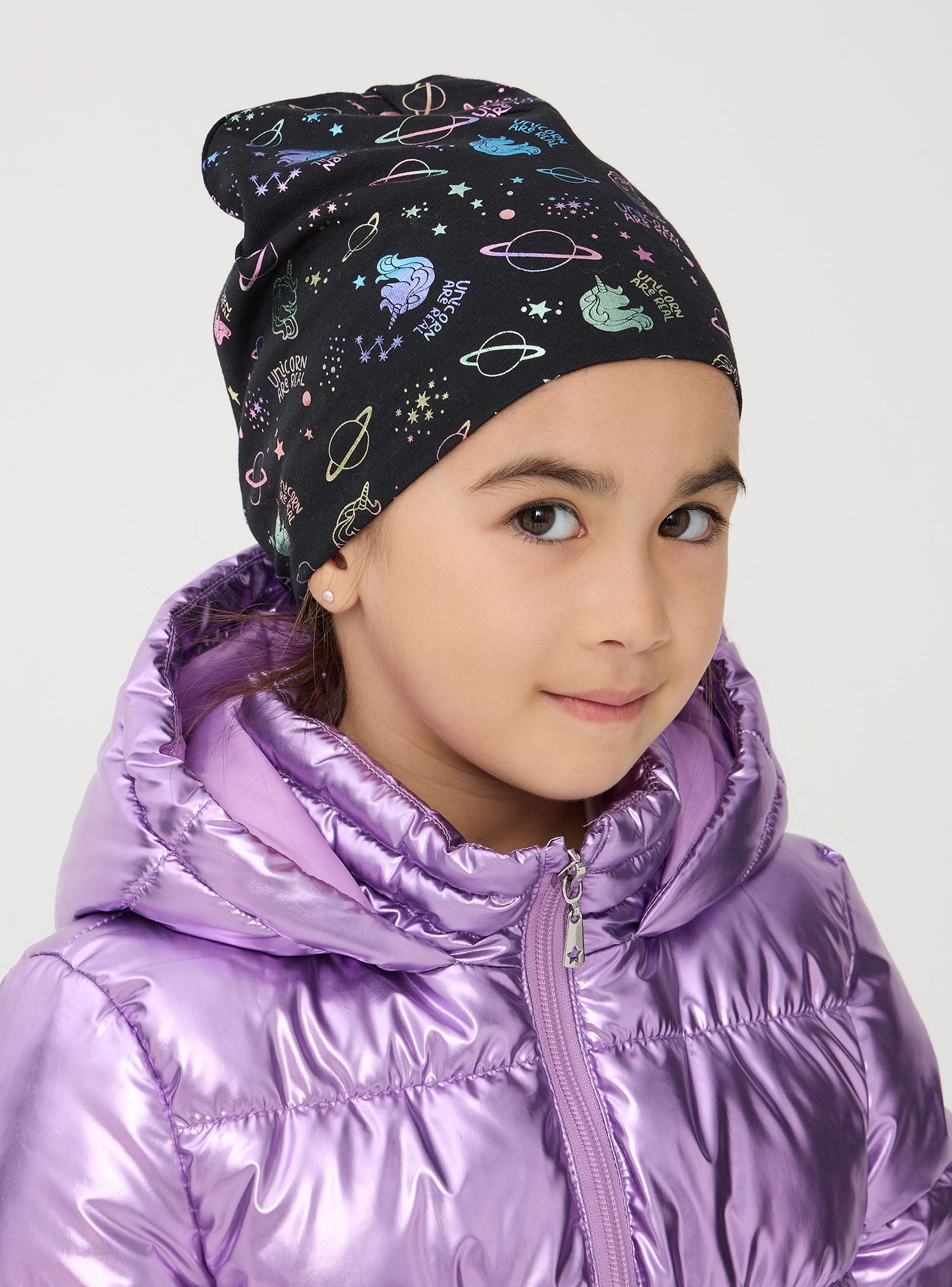 Balení obsahuje dvě lehké čepice pro dívky. Jedna čepice je pastelově růžová s nápisem "Magic" ve stříbrném třpytu, zatímco druhá je černá s živým vesmírným potiskem a jednorožci v duhových barvách. Perfektní pro doplnění ležérního vzhledu, jsou ideální na chladnější dny.