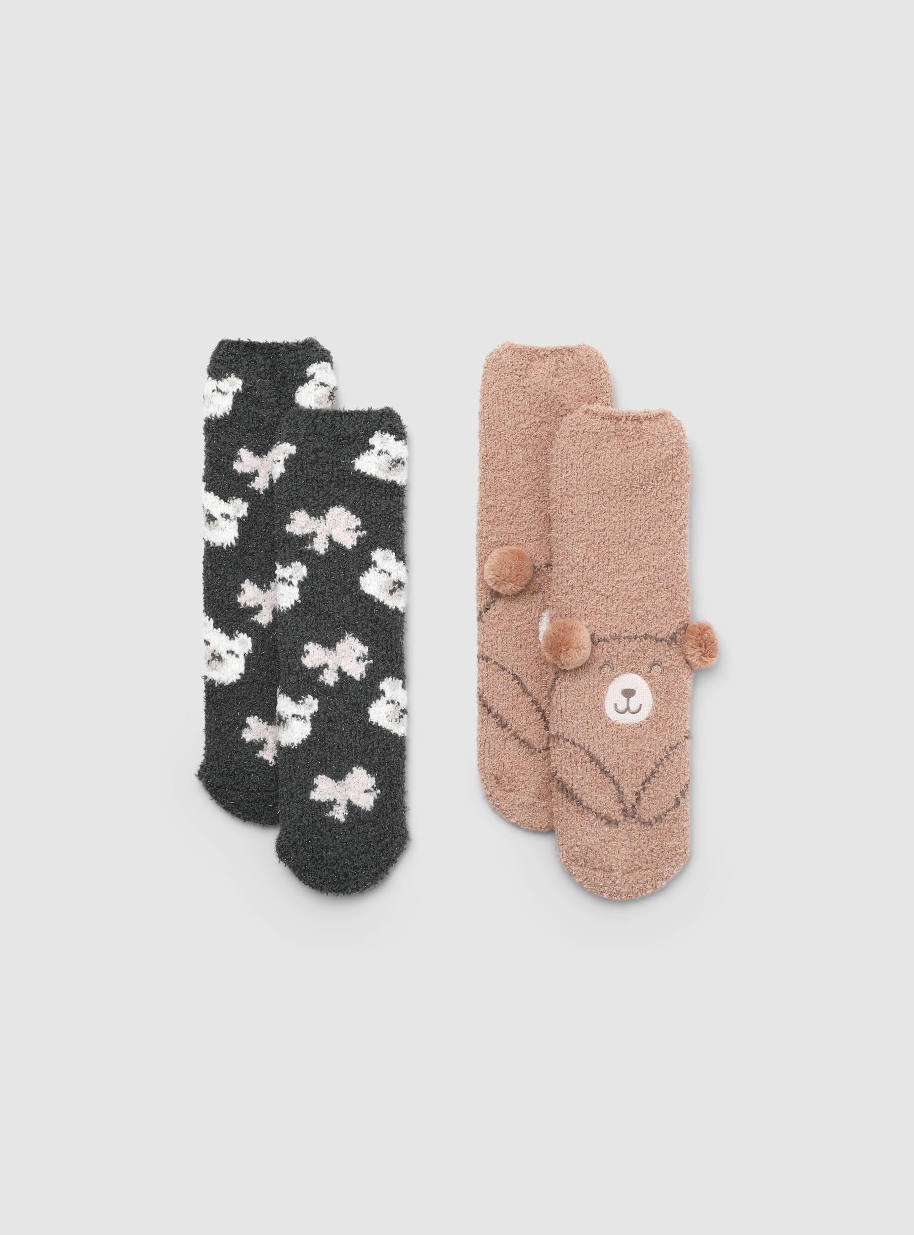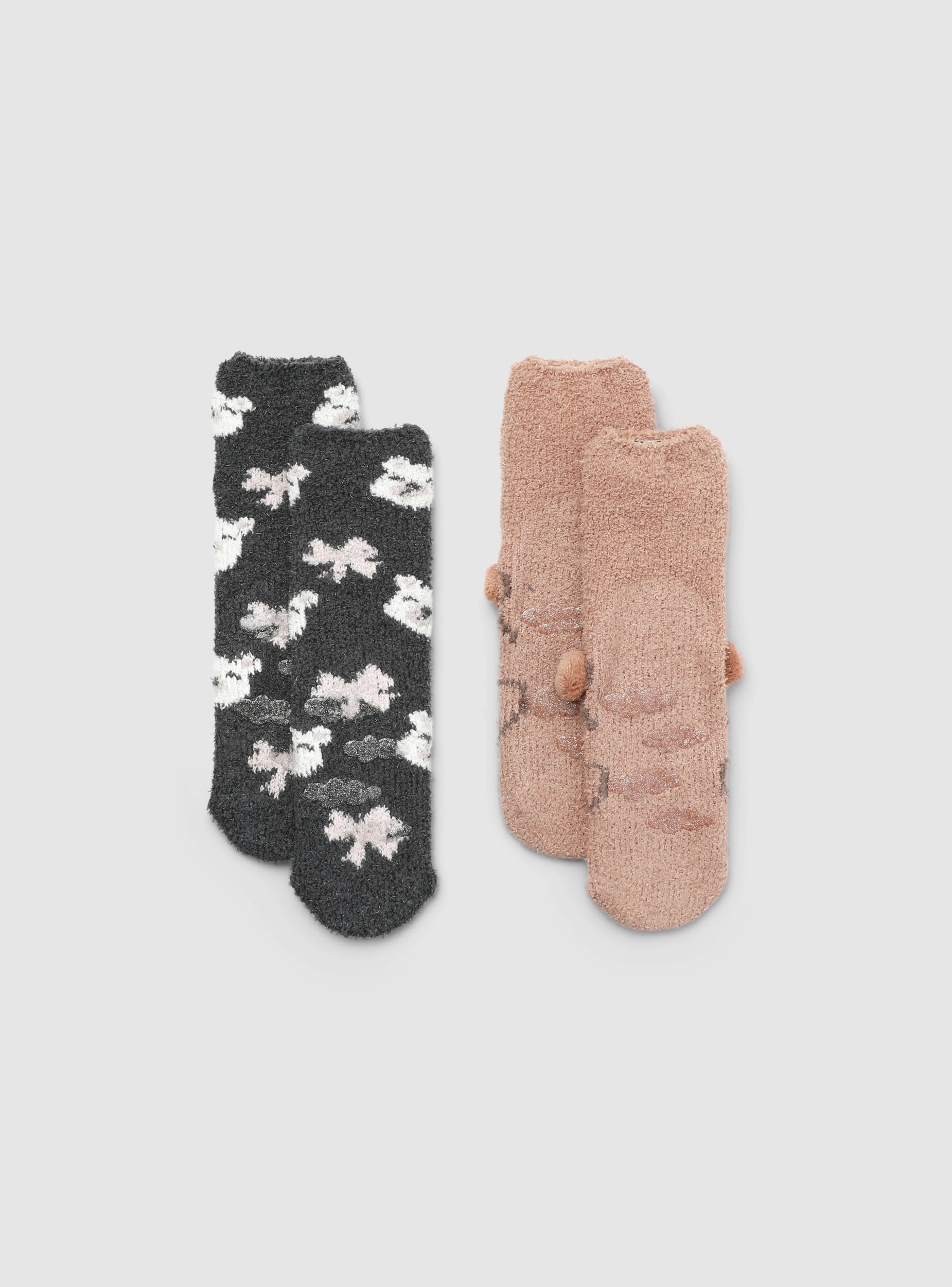 Balení obsahuje 2 páry dámských protiskluzových ponožek. Ideální pro každodenní nošení doma, tyto ponožky nabízejí pohodlí a bezpečnost díky protiskluzové podrážce. Design zahrnuje zvířecí motivy a dekorativní detaily, což je činí perfektními pro přidání stylového doteku k domácímu odpočinku. Střih je pohodlný a přiléhavý.