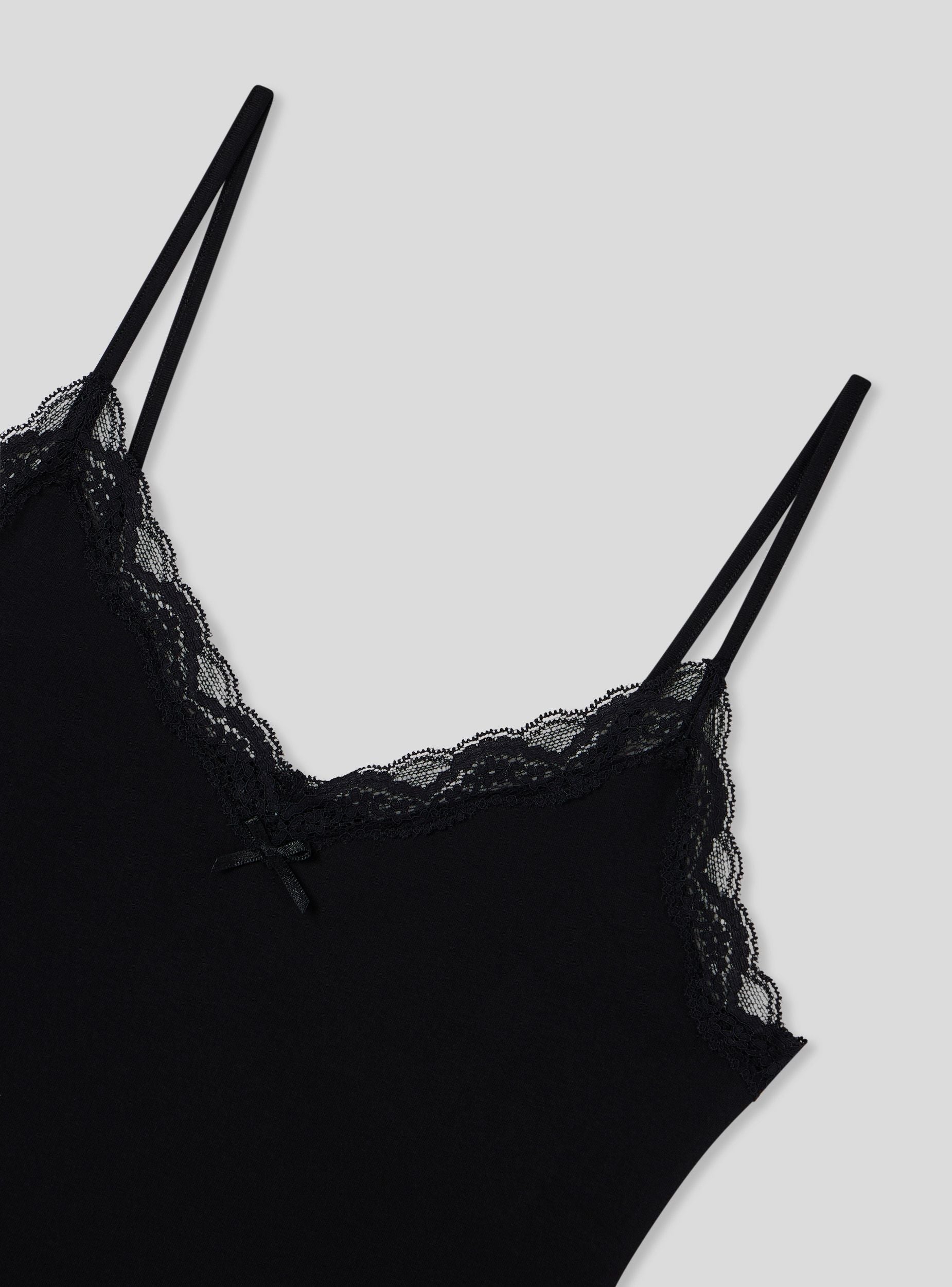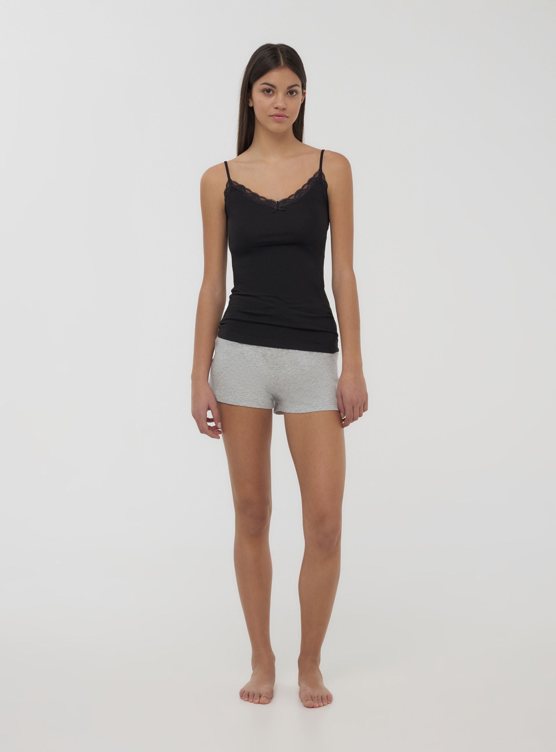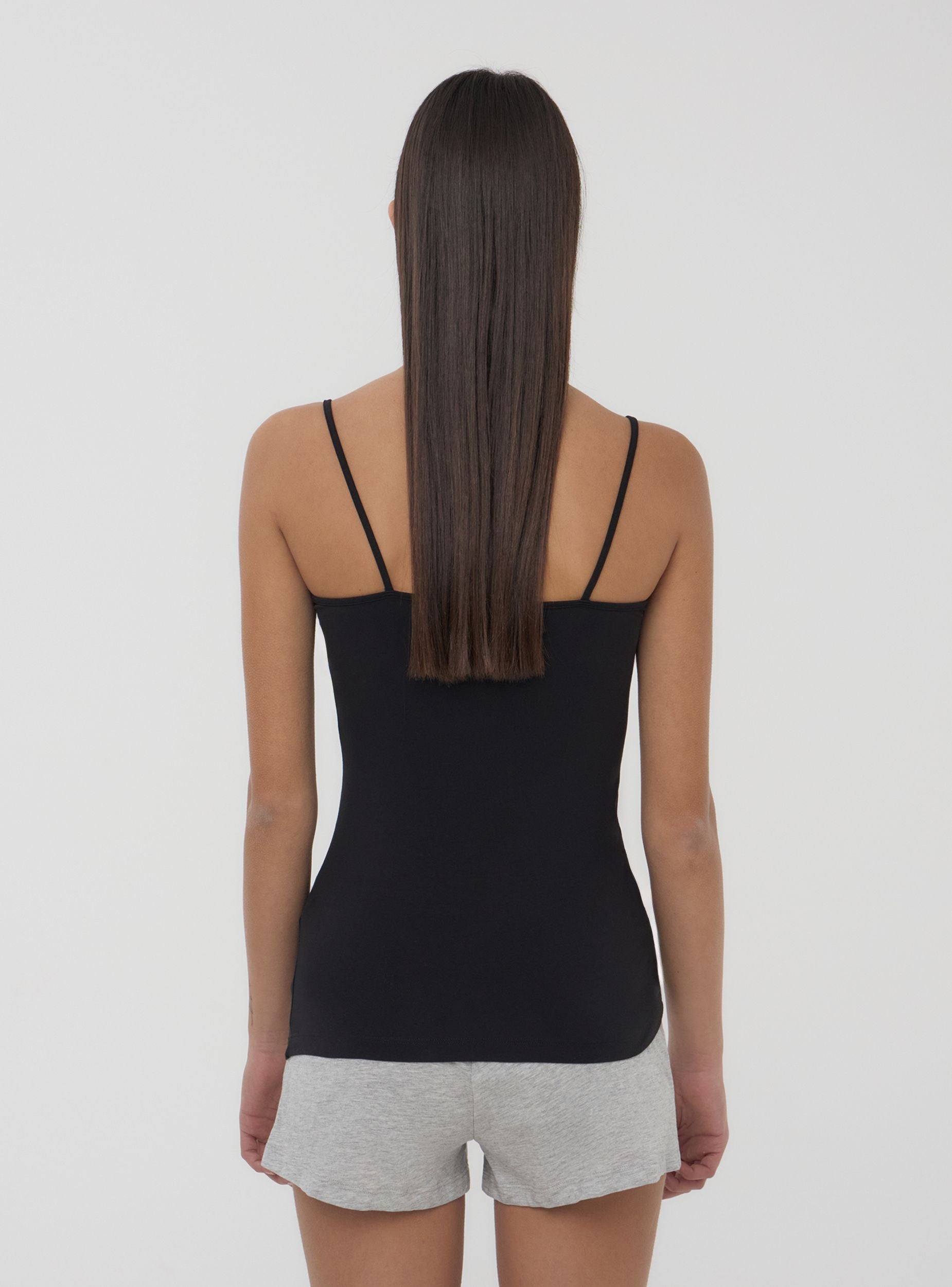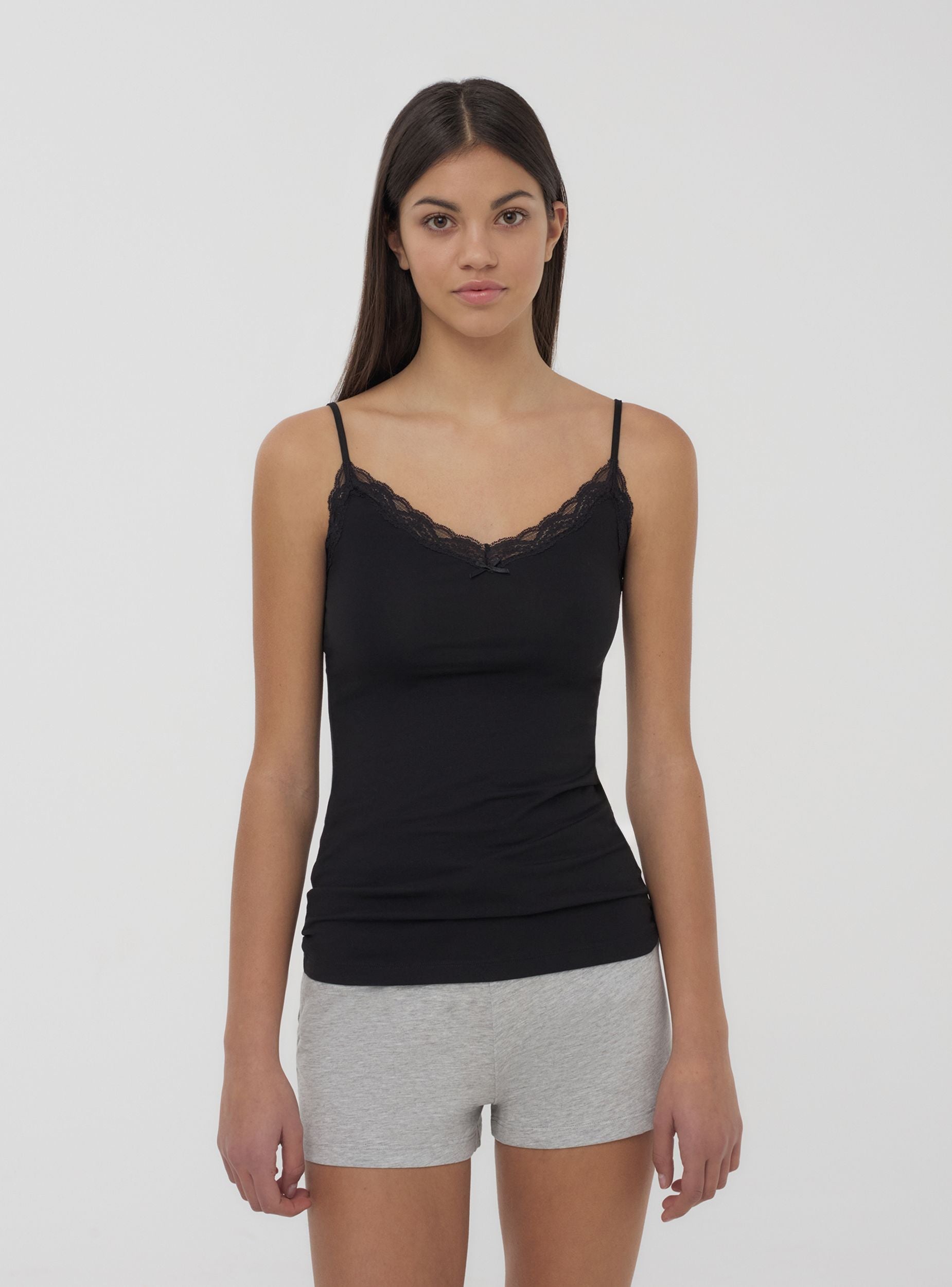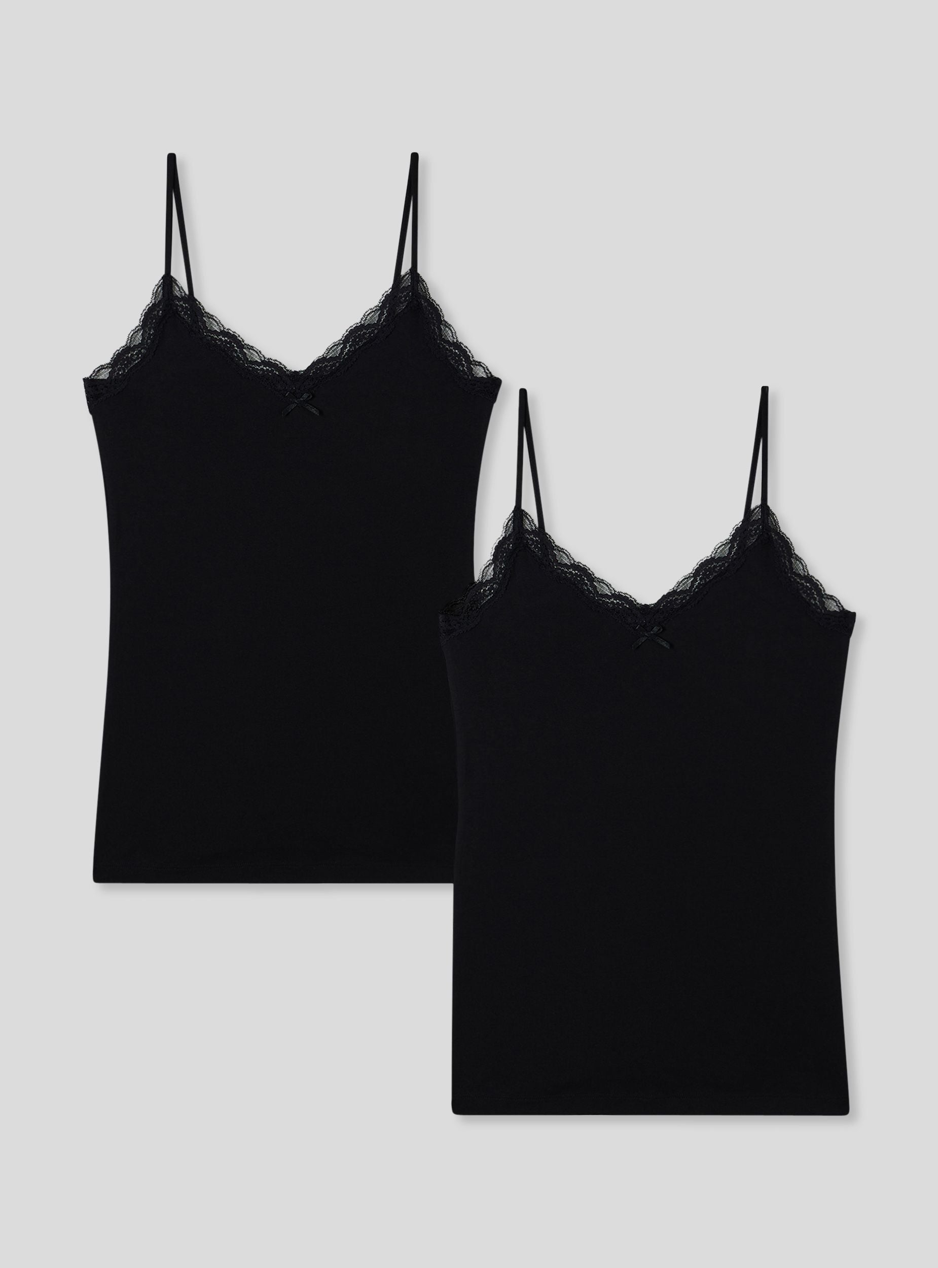 Sada skládající se ze 2 dámských tílek, ideálních pro ženský a jemný vzhled. Každé tílko má jednobarevný design obohacený o rafinovaný krajkový detail podél výstřihu, zdobený malou dekorativní mašlí. Tenoučká ramínka dodávají elegantní nádech, což je činí ideálními jako spodní prádlo nebo k nošení pod lehkými oděvy.