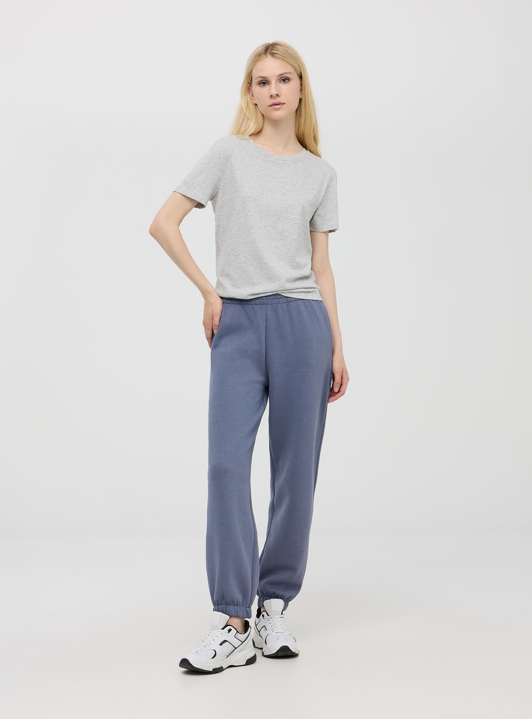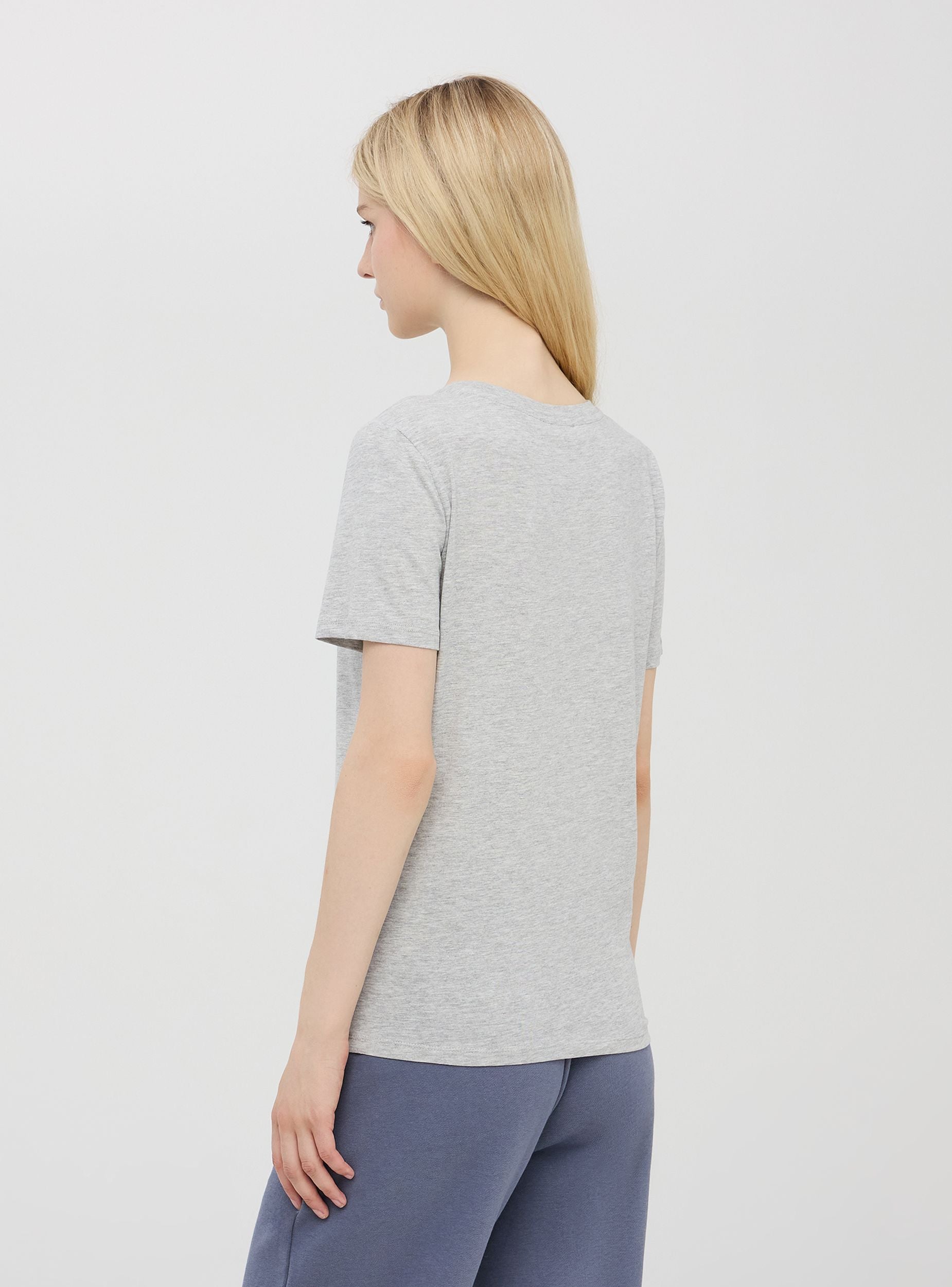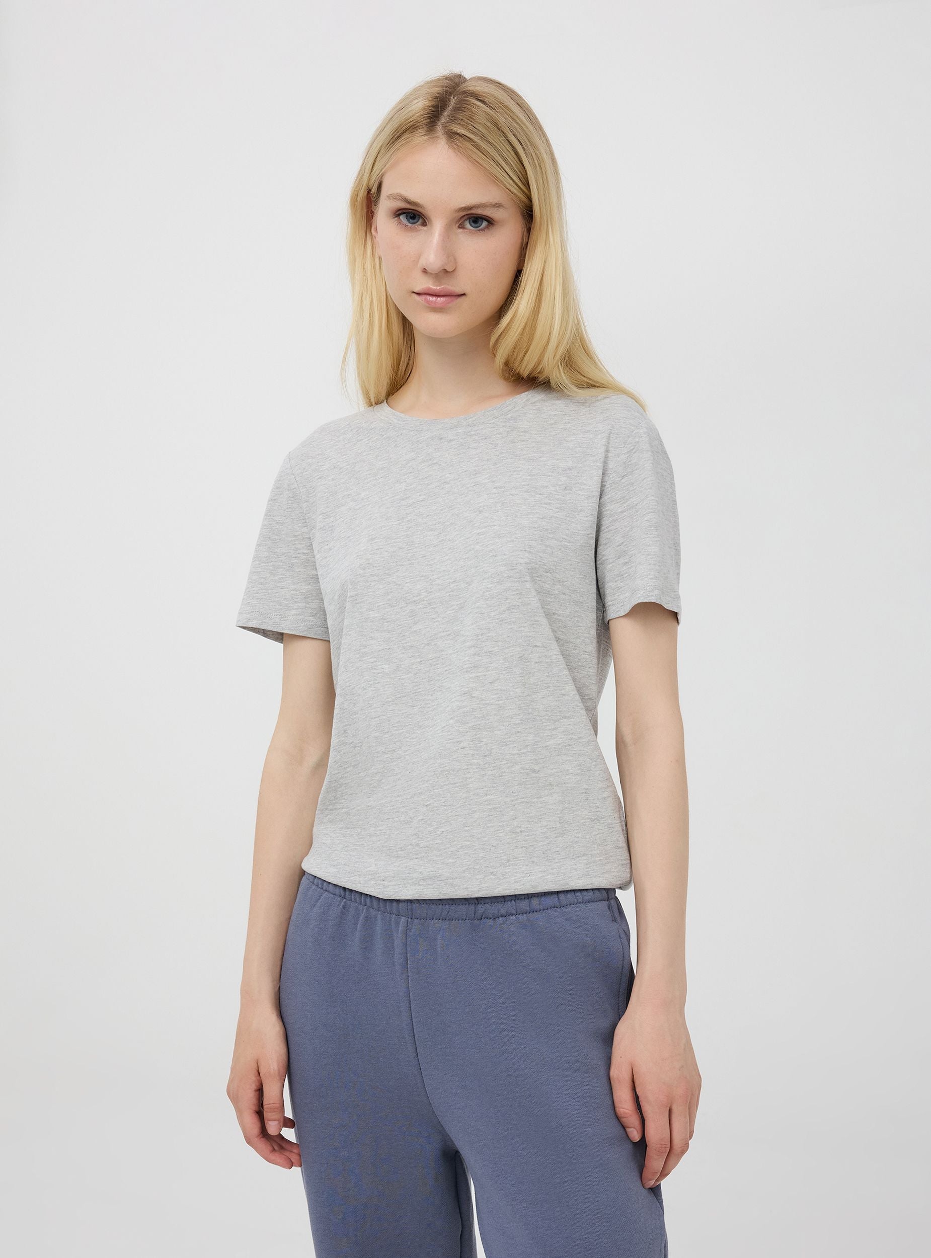 Dámské základní tričko z bavlněného jersey. Model s kulatým výstřihem, krátké rukávy. Normální střih. Modelka je vysoká 1,80 m a má na sobě velikost S.Detaily