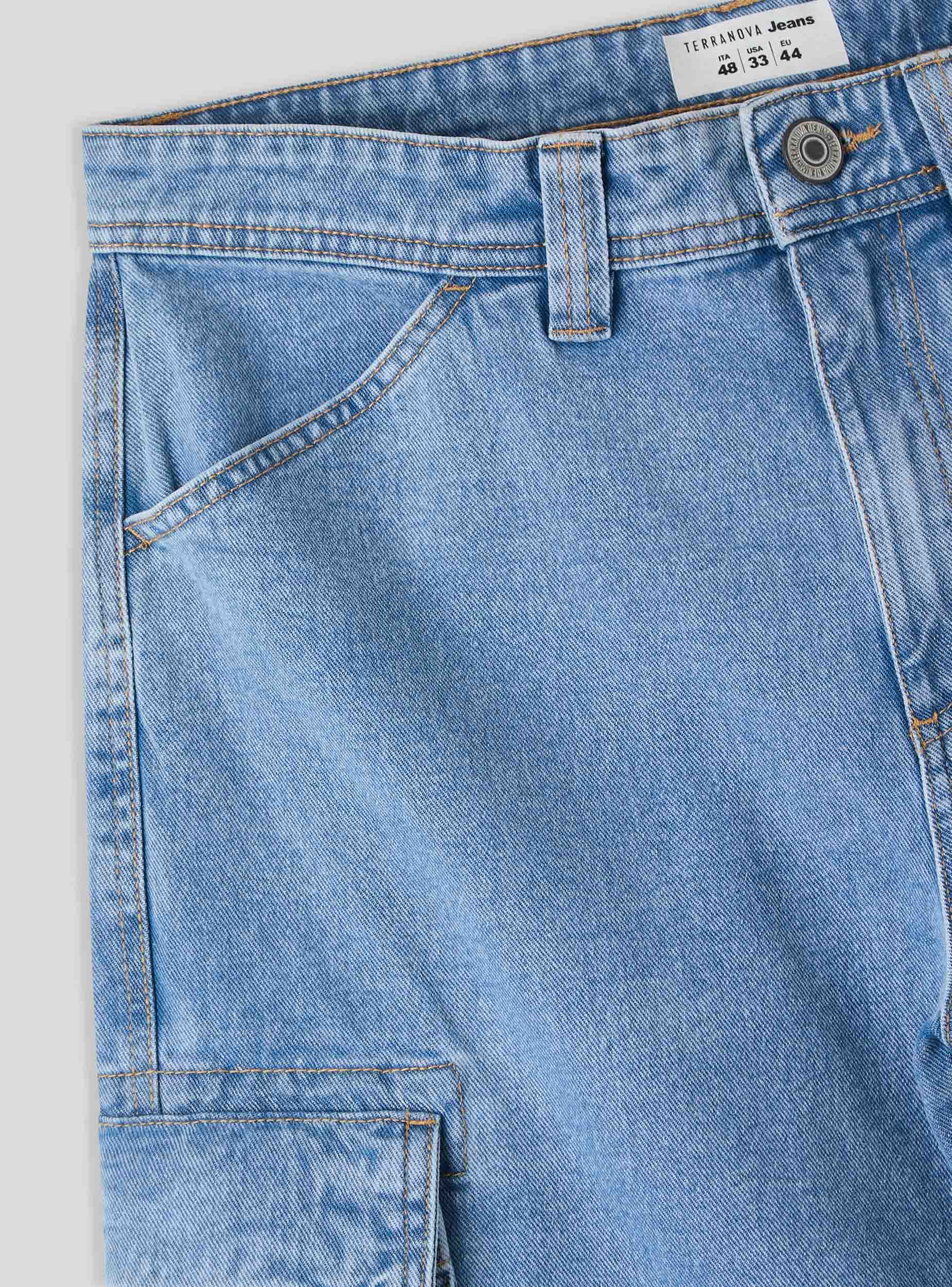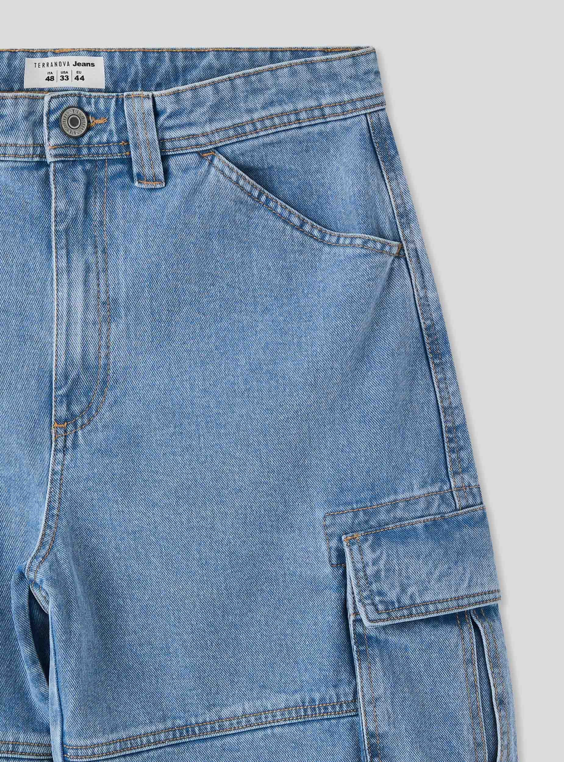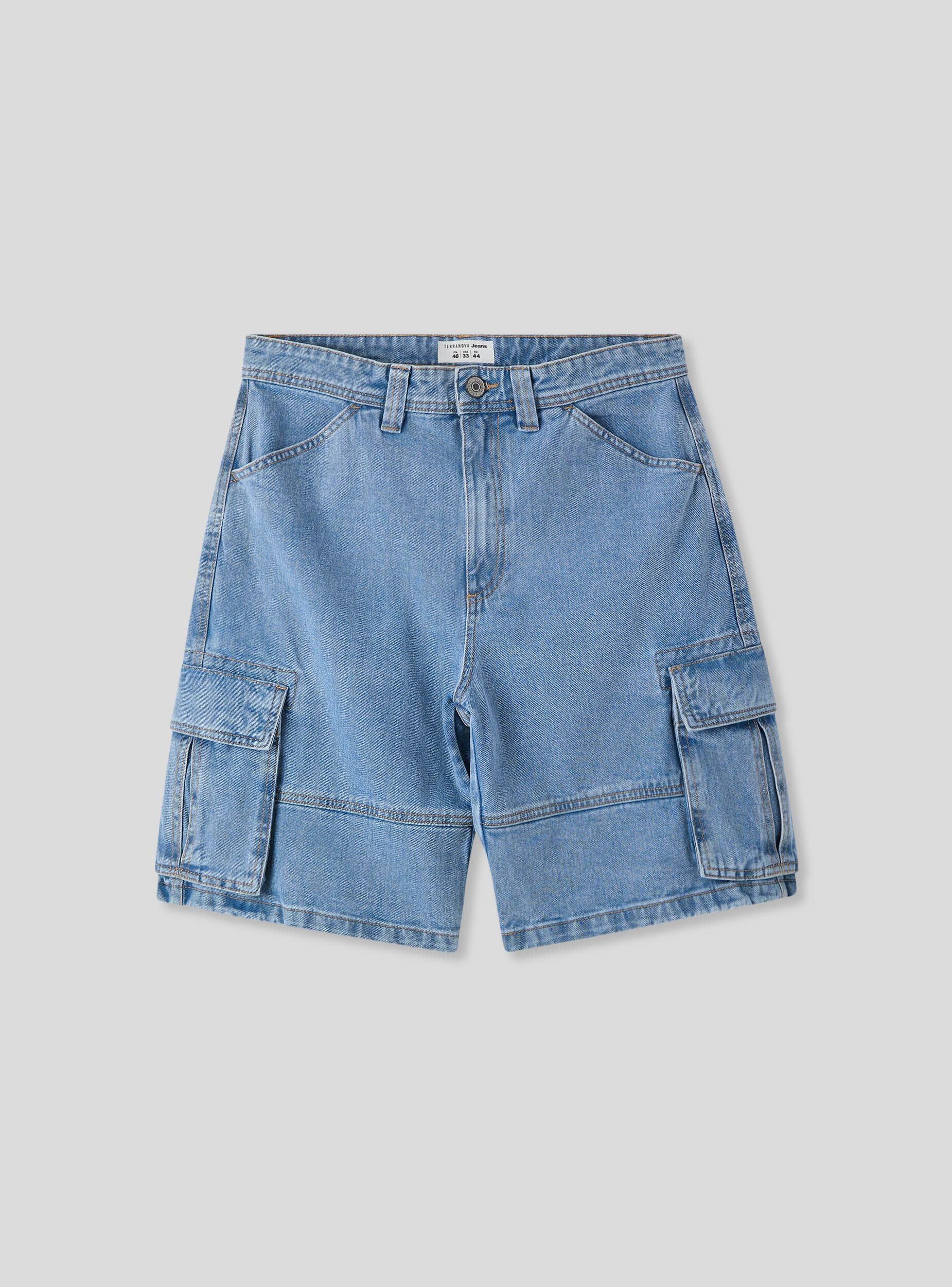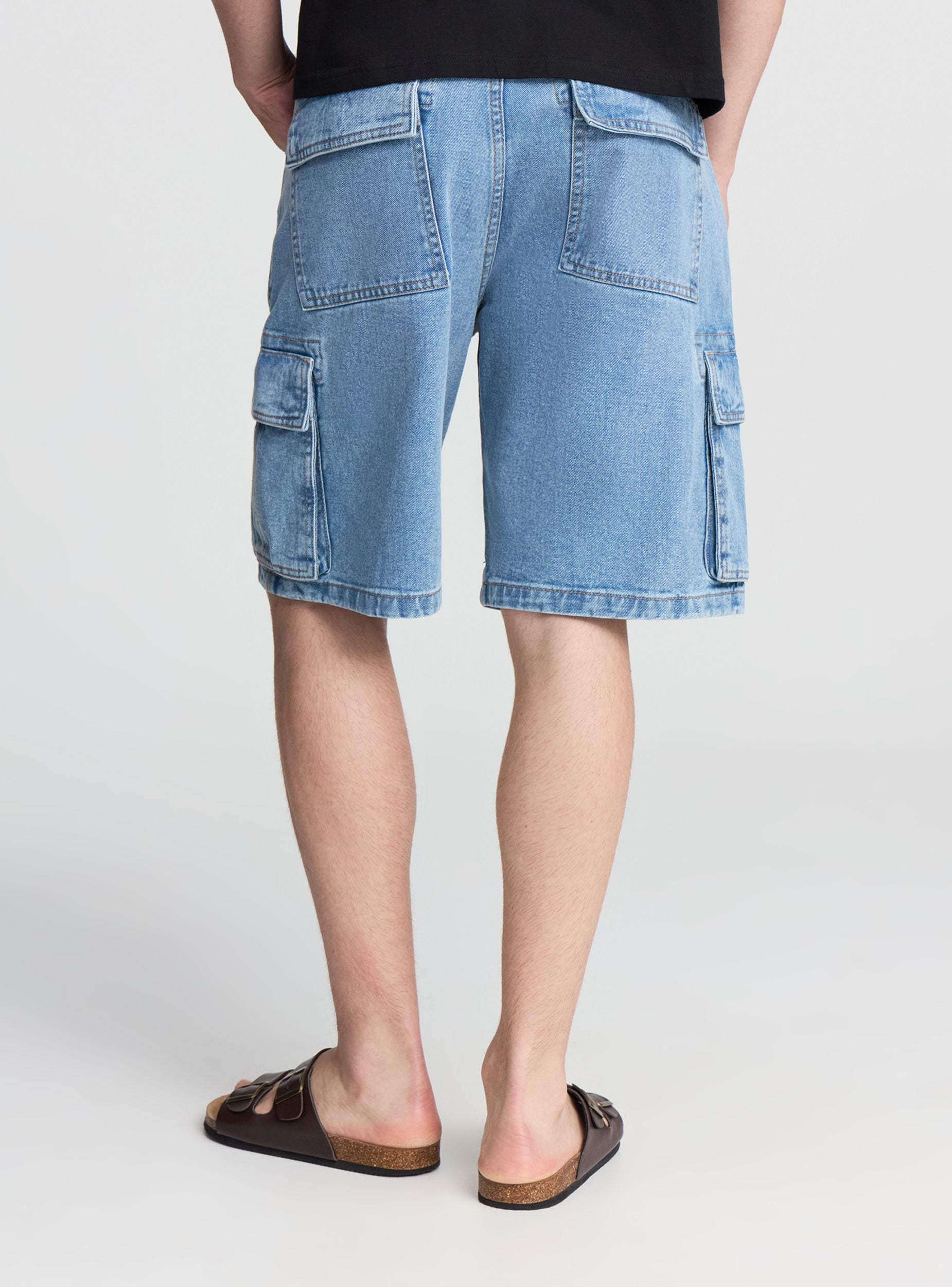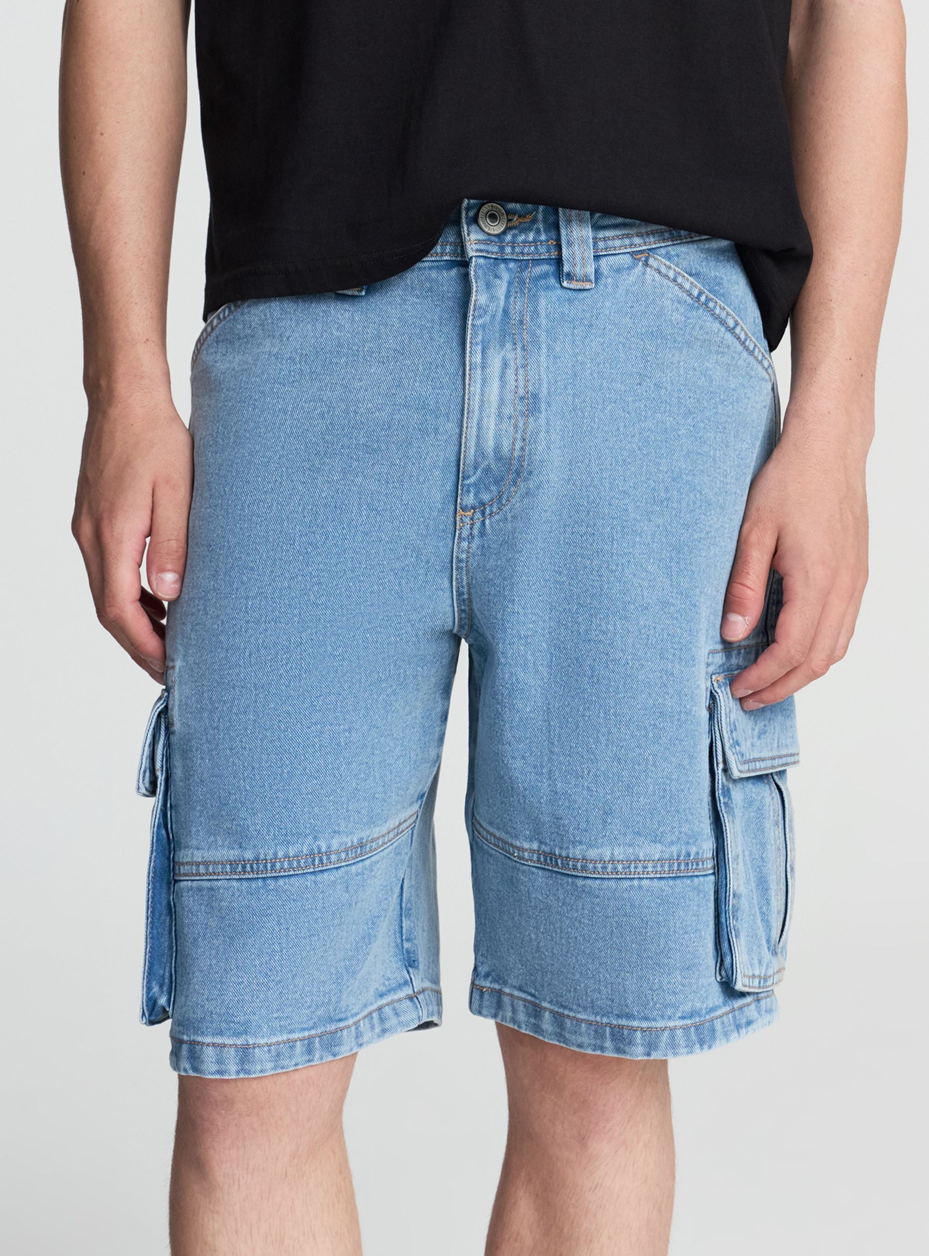 Pánské šortky, model bermudy z denimu. Mají zapínání na knoflík a zip, nabízejí praktičnost díky bočním cargo kapsám. Vyrobené z bavlněné tkaniny, jsou ideální k kombinaci s tričky, polokošilemi nebo tílky pro pohodlný a funkční styl.Detaily