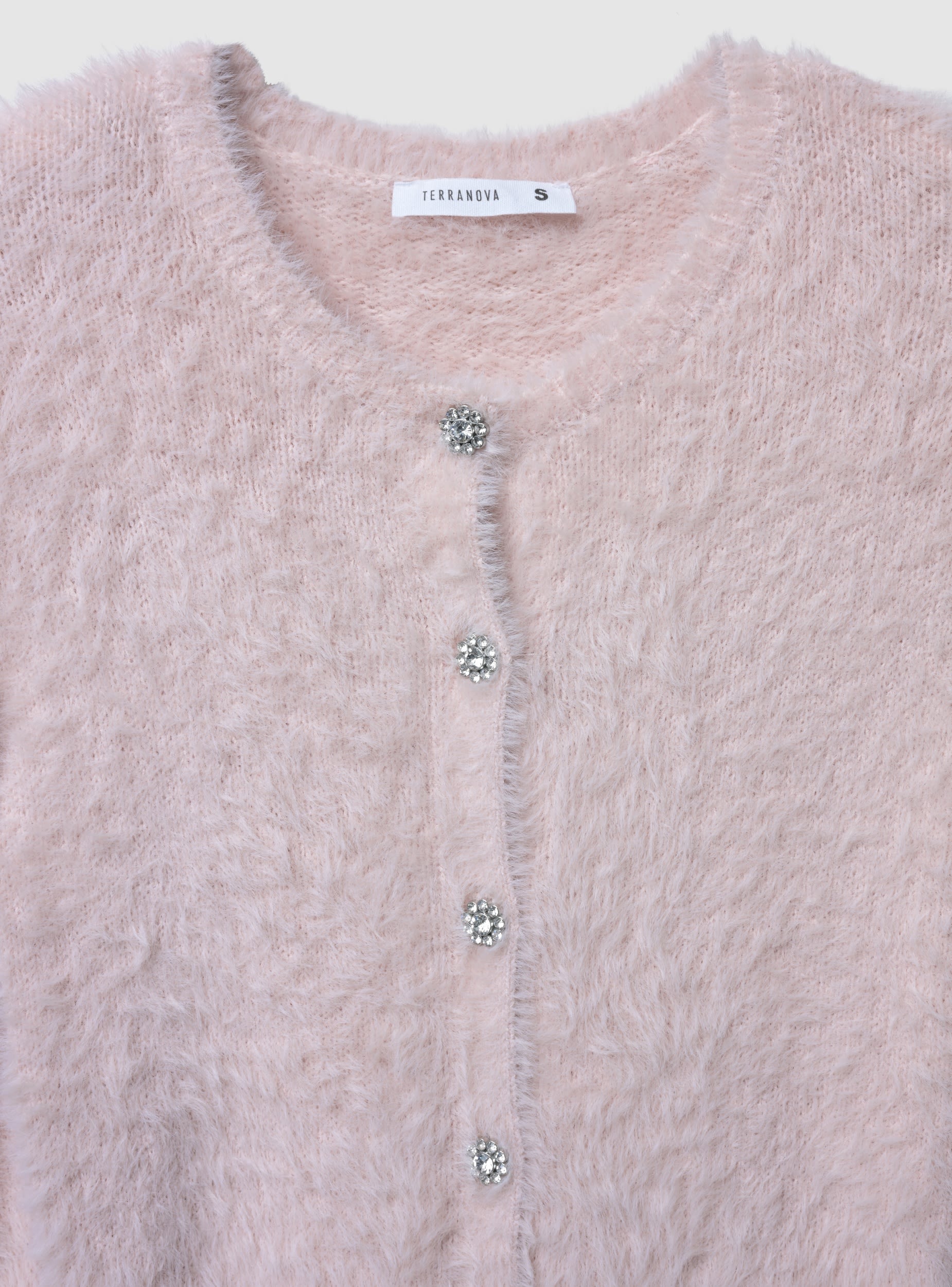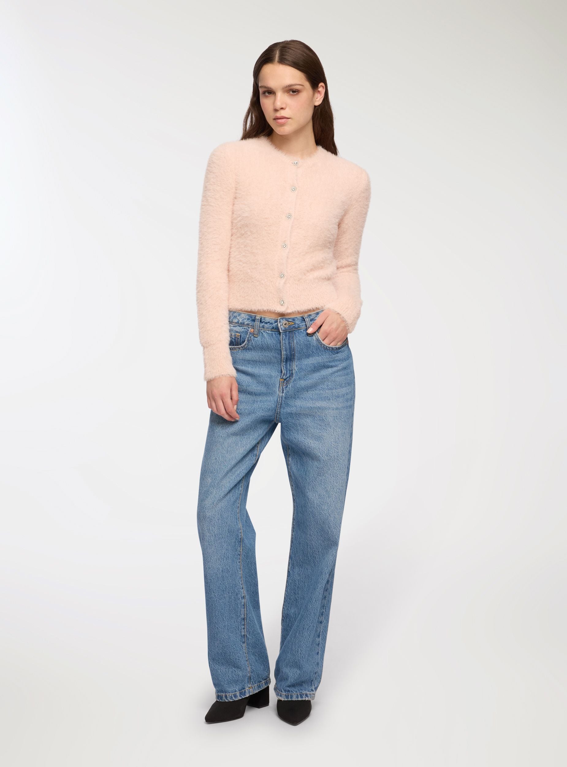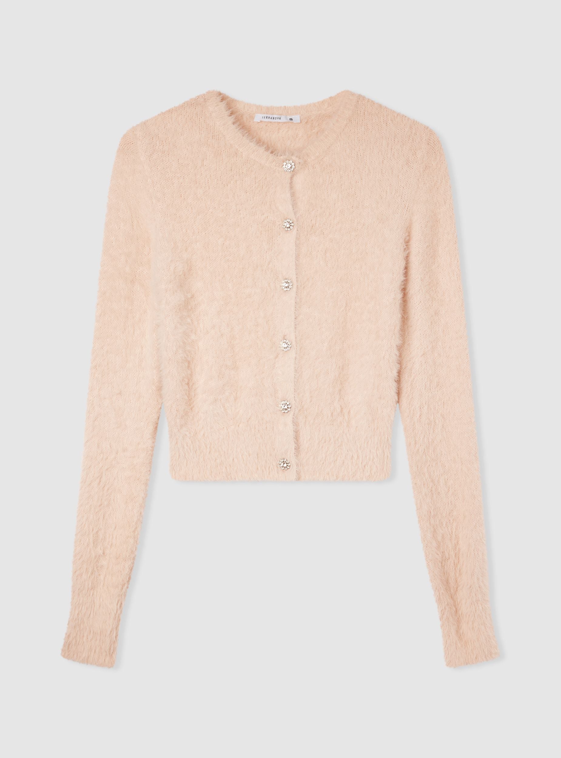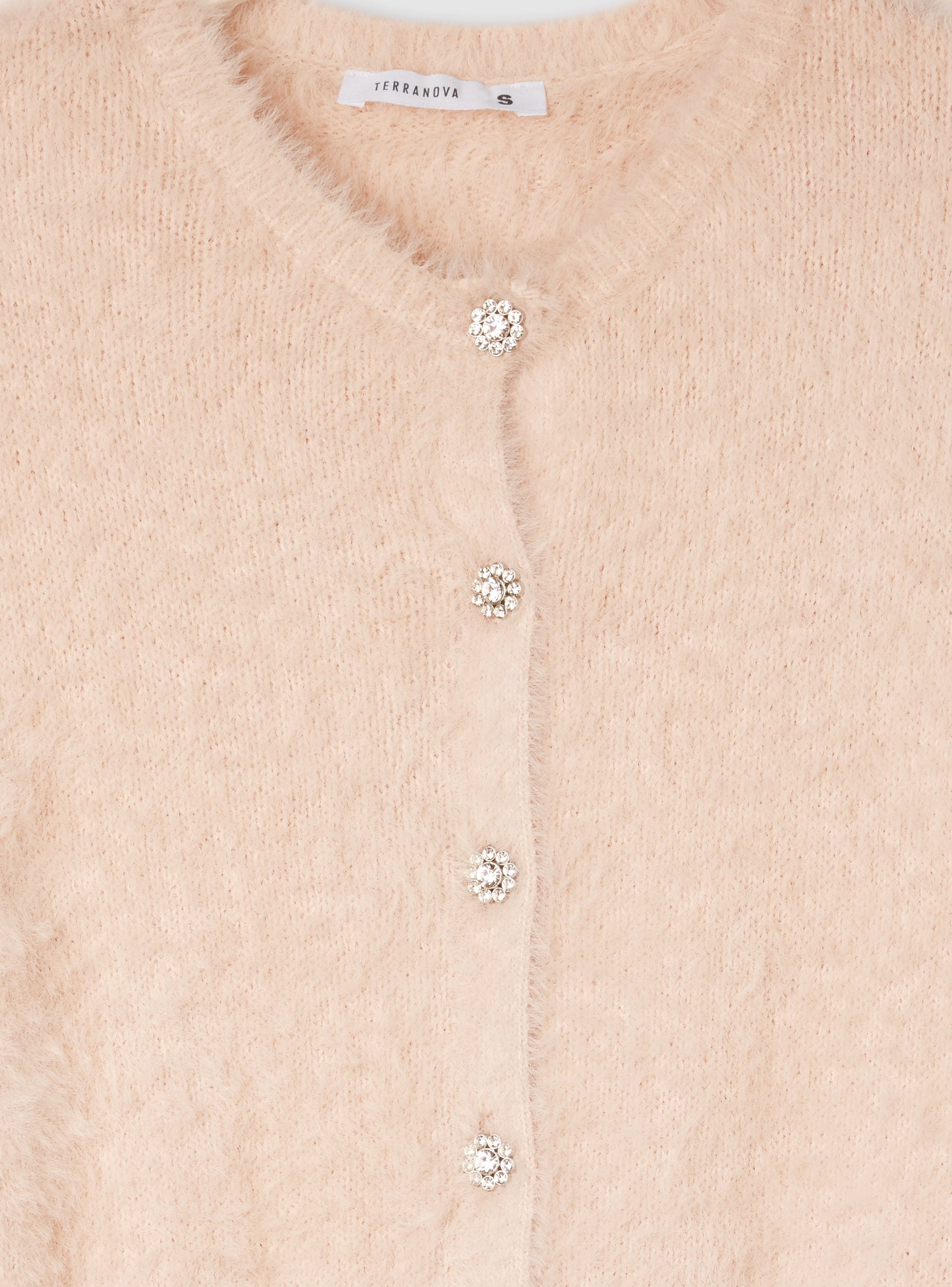 Dámský kardigan s knoflíky ve stylu šperků, ideální pro elegantní příležitosti nebo speciální večery. Má pravidelný střih a rafinovaný design s lesklými detaily na knoflících. Perfektní k kombinaci s kalhotami nebo sukněmi pro sofistikovaný a ženský vzhled. Svetr nabízí pohodlí a styl, což z něj činí všestranný kousek do šatníku.Detaily