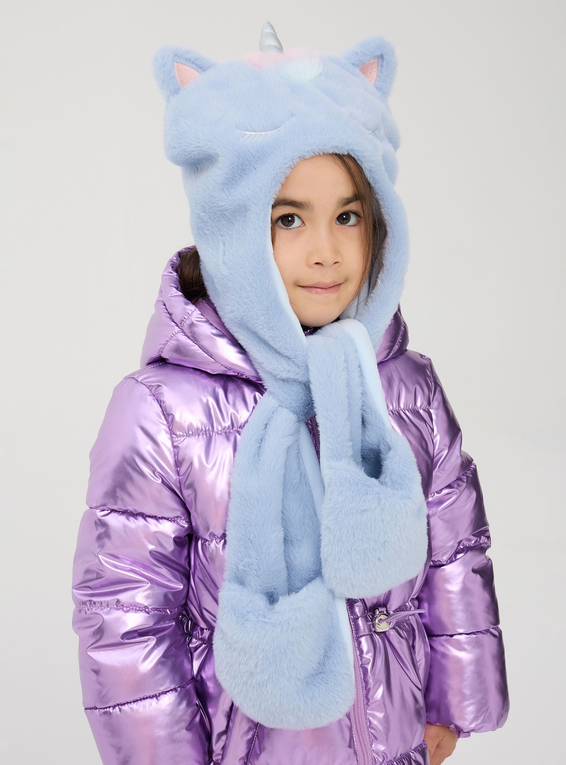 Dívčí čepice s integrovaným šálou. Čepice má trojrozměrné dekorativní detaily, včetně rohu a stylizovaných uší. Šála je dlouhá a umožňuje zakrýt krk pro větší teplo. Tento produkt je perfektní pro udržení nejmenších v teple během chladných dnů a přidává do jejich oblečení nádech fantazie.