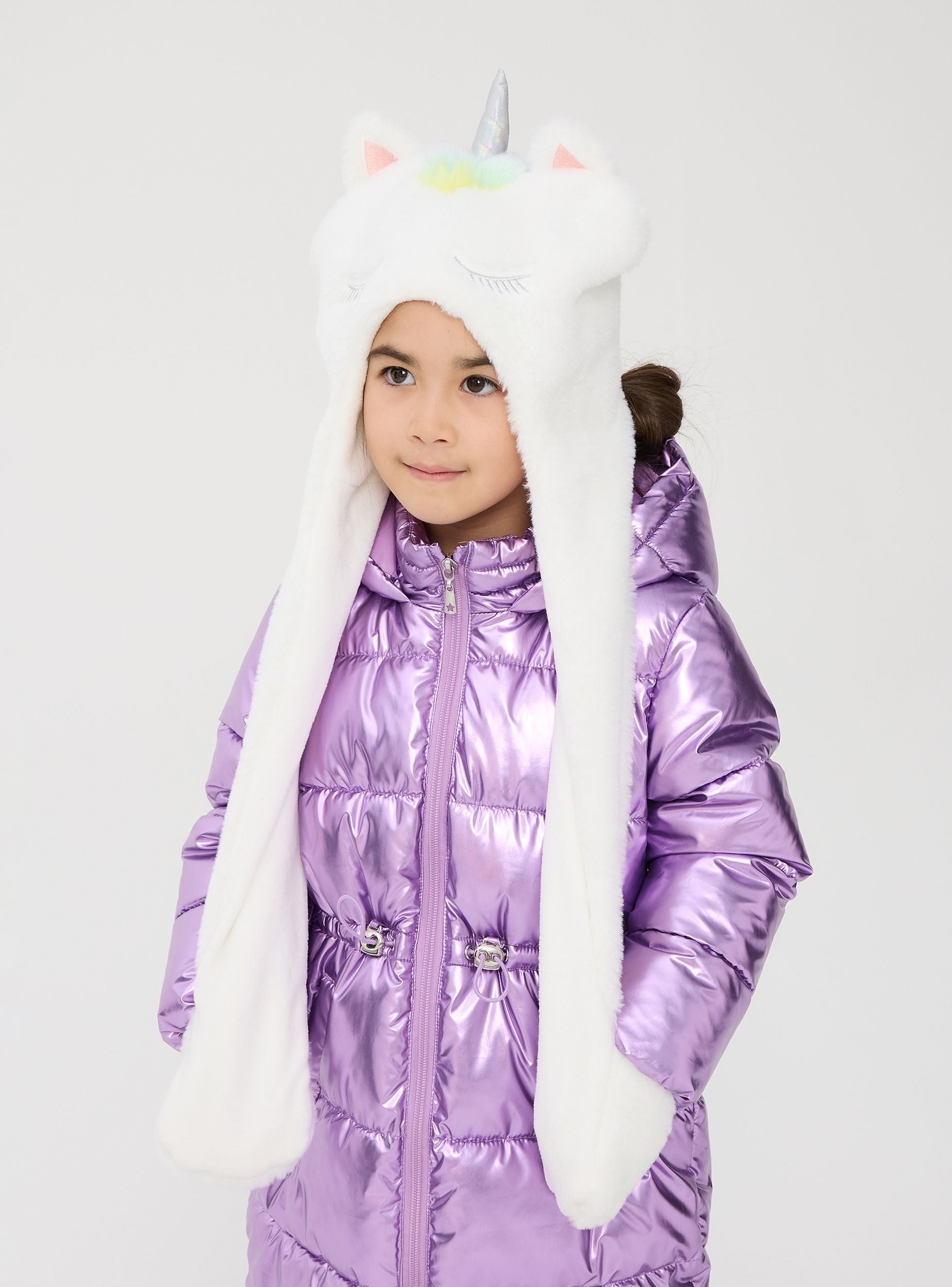 Dívčí čepice s integrovaným šálkem. Čepice má trojrozměrné dekorativní detaily, včetně rohu a stylizovaných uší. Šátek je dlouhý a umožňuje zakrýt krk pro větší teplo. Tento produkt je ideální pro udržení nejmenších v teple během chladných dnů a přidává k jejich oblečení nádech fantazie.