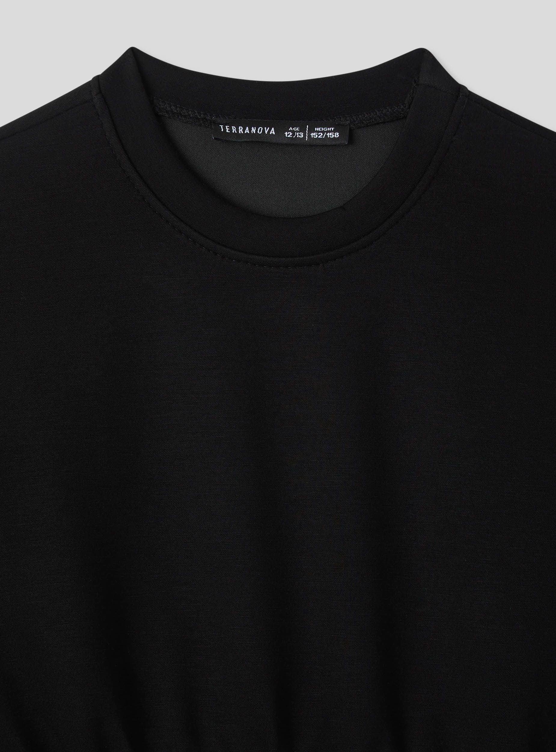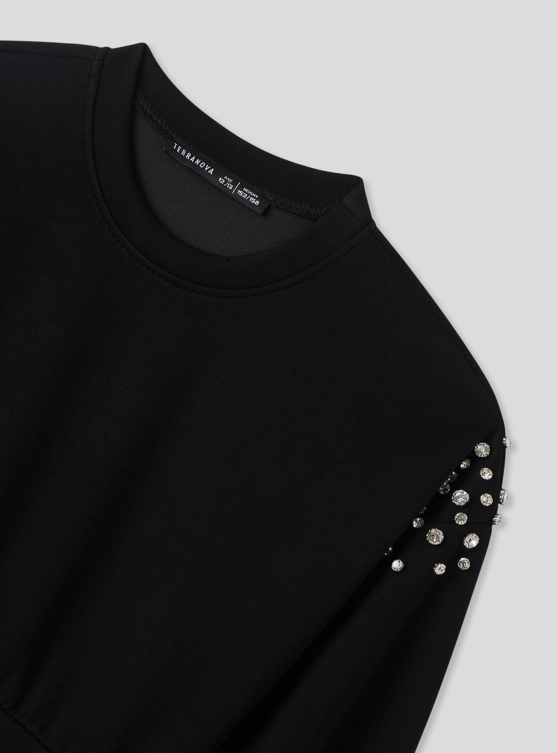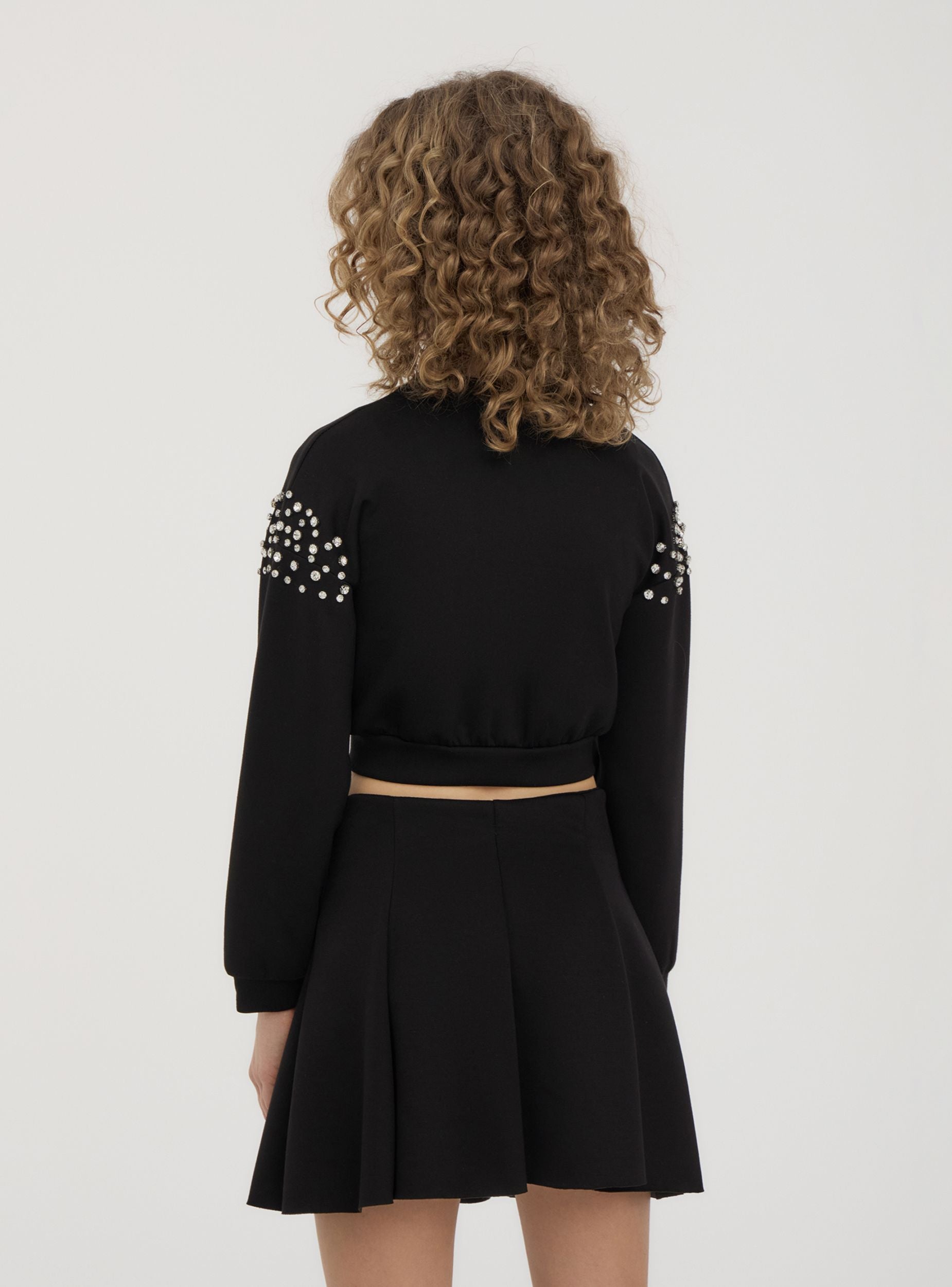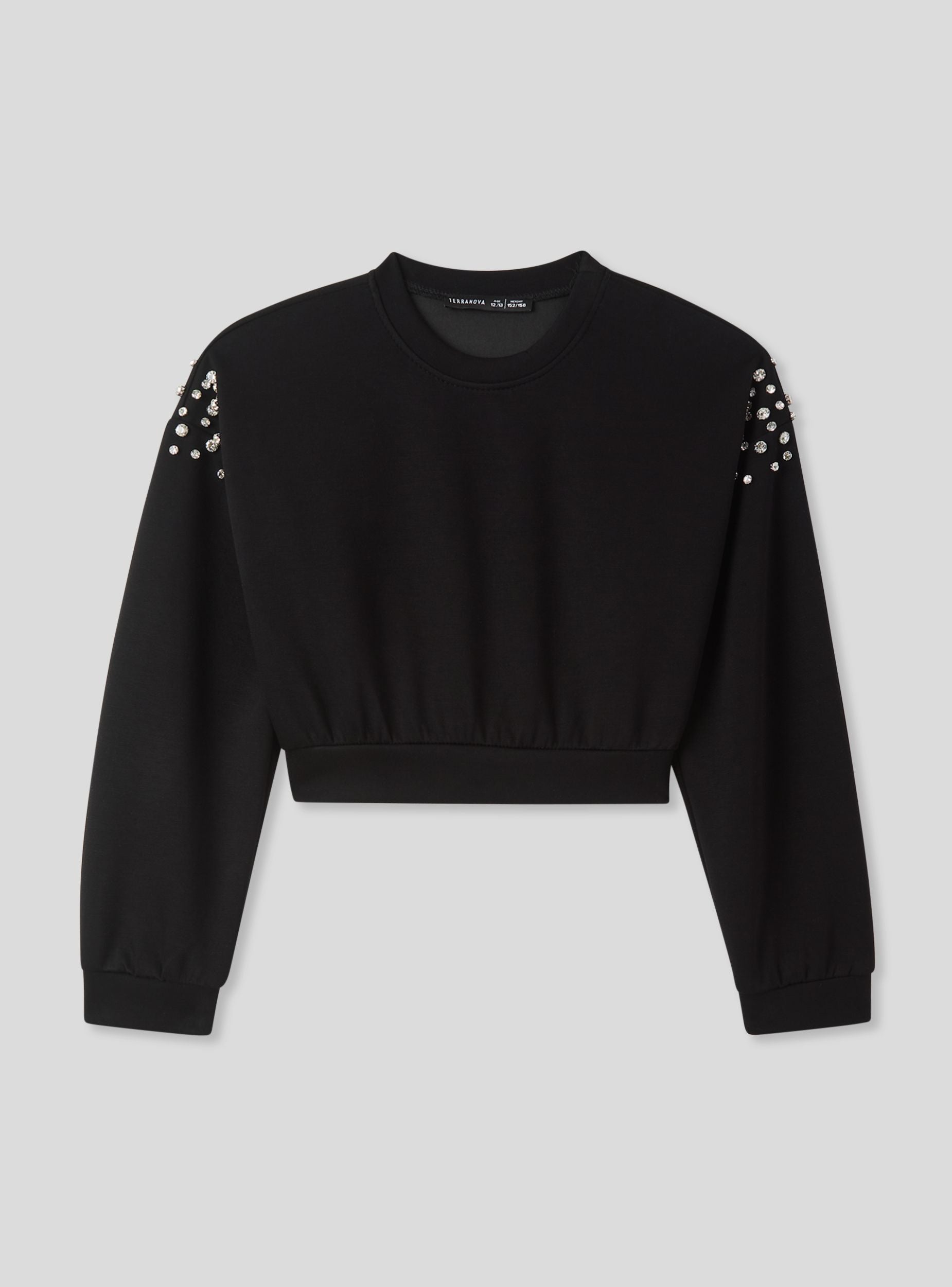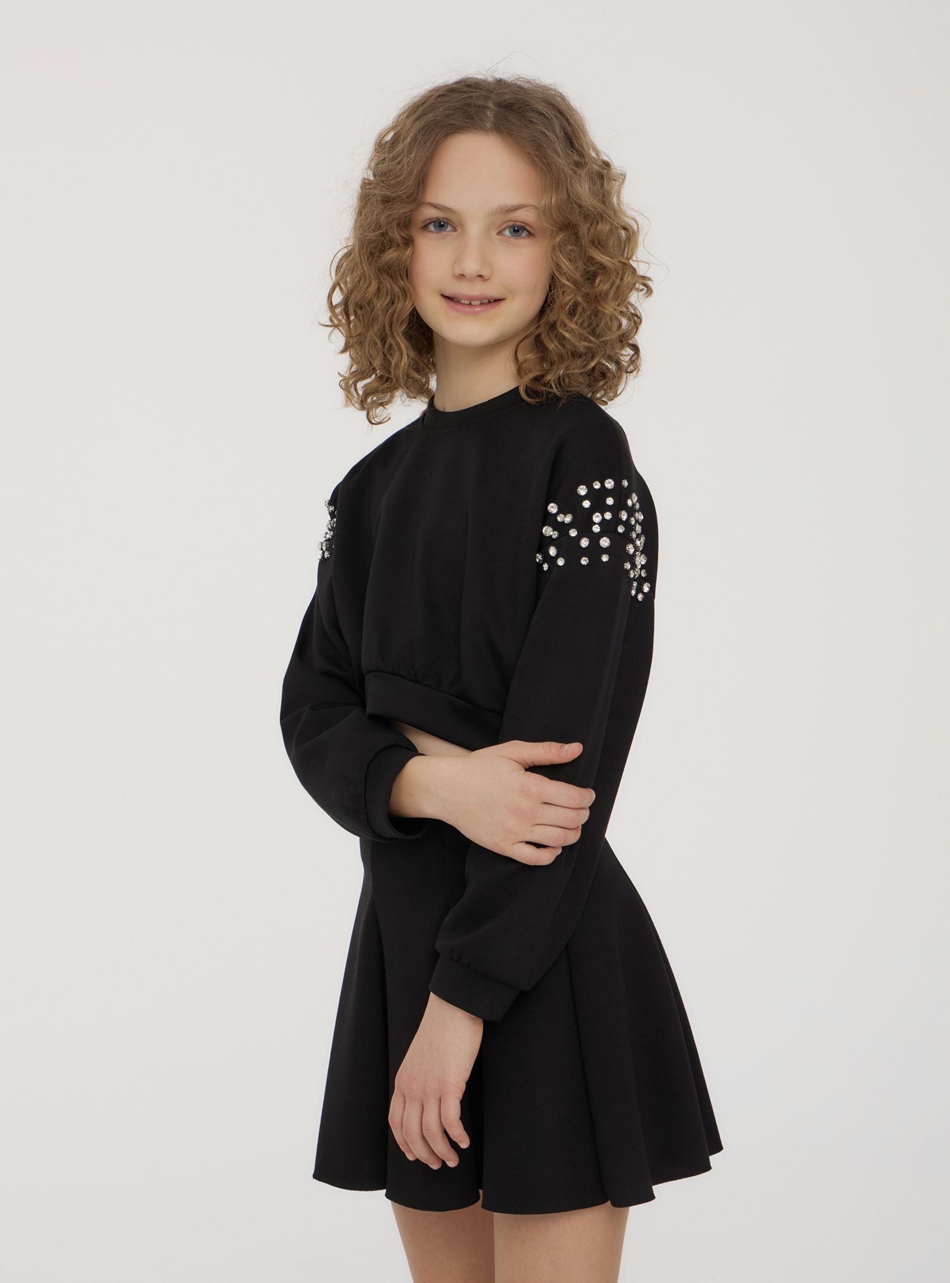 Dívčí cropped mikina, ideální pro moderní a trendy vzhledy. Jednoduchý design ji činí univerzální a snadno kombinovatelnou, zatímco aplikace na rukávech dodávají originální a jasný detail. S dlouhými rukávy a bez kapuce je ideální pro přechodná období. Noste ji s džíny, legínami nebo sukněmi pro vytvoření stylových a neformálních outfitů, které jsou perfektní do školy nebo na volný čas.