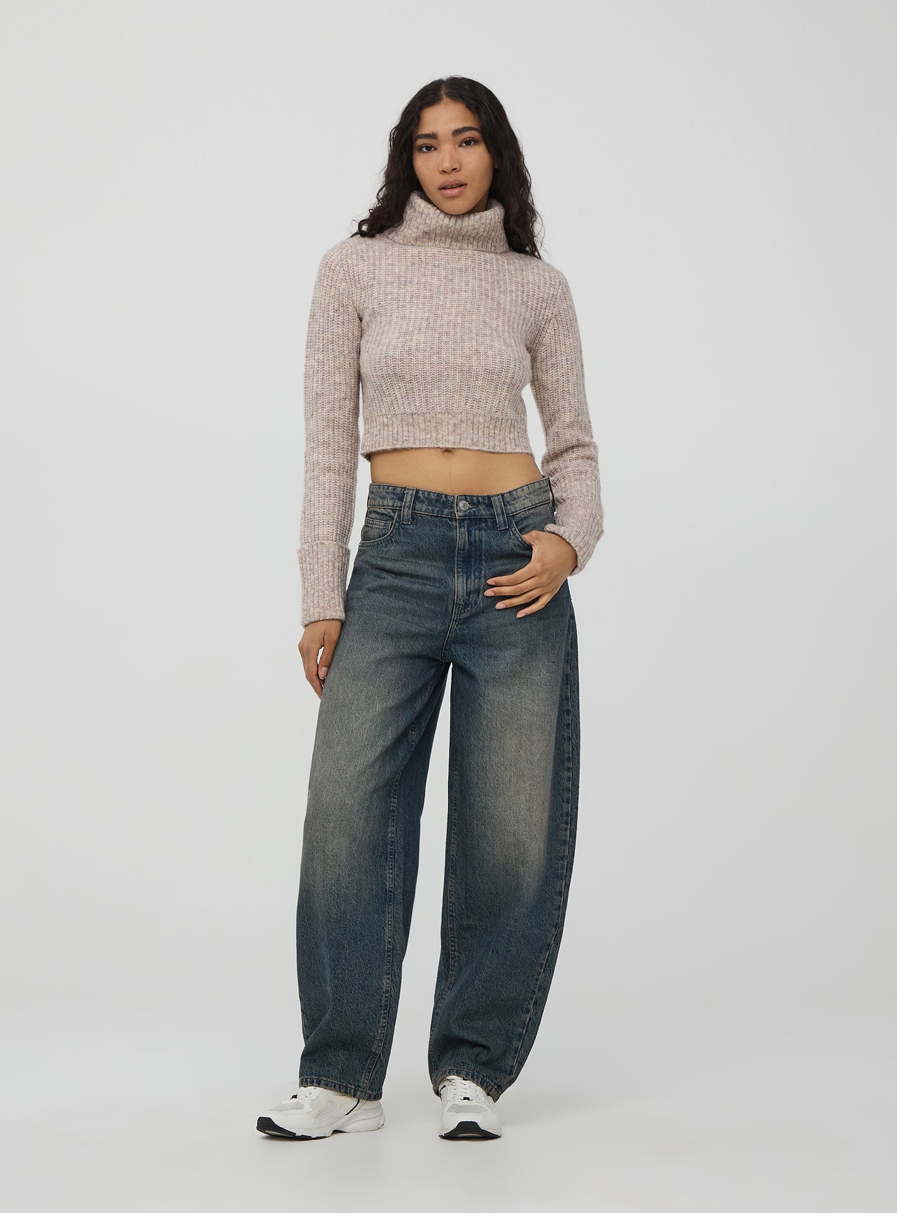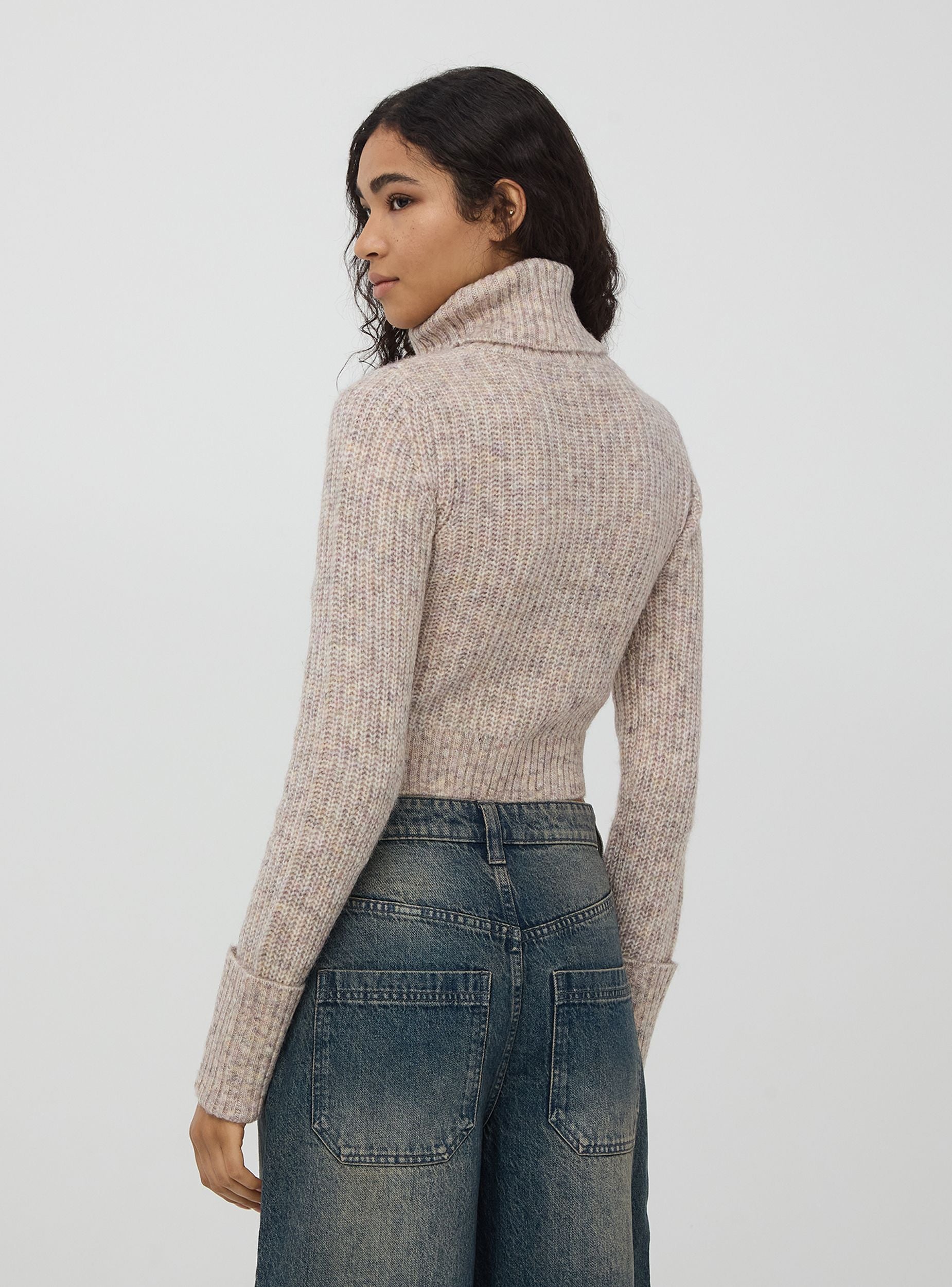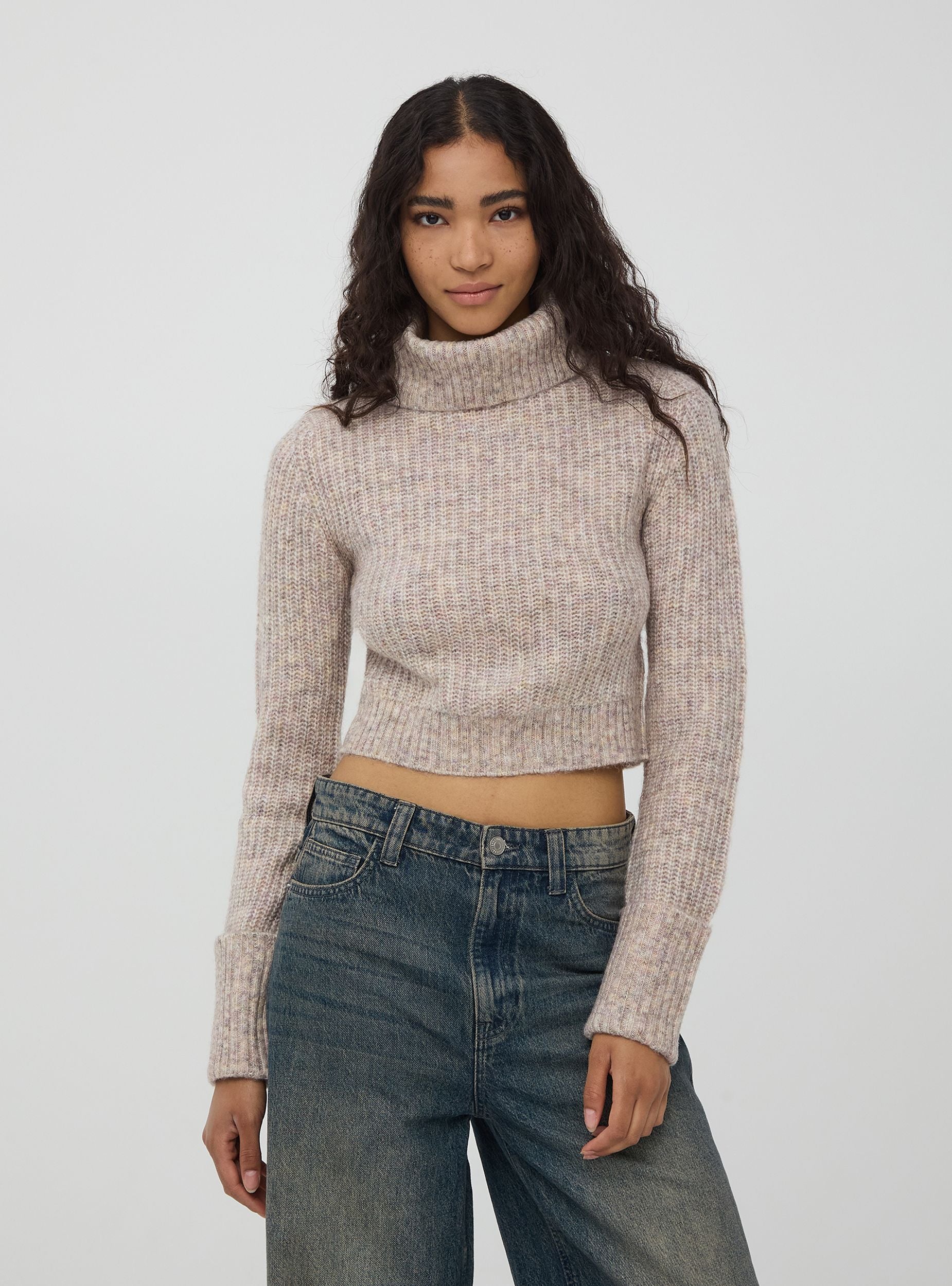 Dámský svetr s vysokým límcem, vyrobený z pleteniny s anglickým žebrováním, která dodává kousku rafinovanou texturu a přiléhavý střih. Vysoký límec přidává prvek tepla a stylu, ideální pro chladnější roční období. Krátká délka, která končí nad pasem, dodává moderní a módní vzhled.