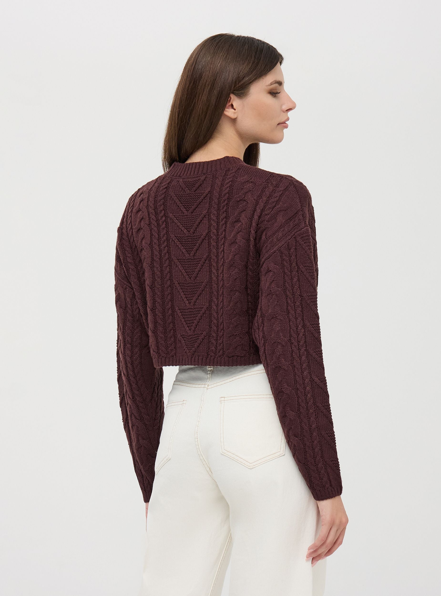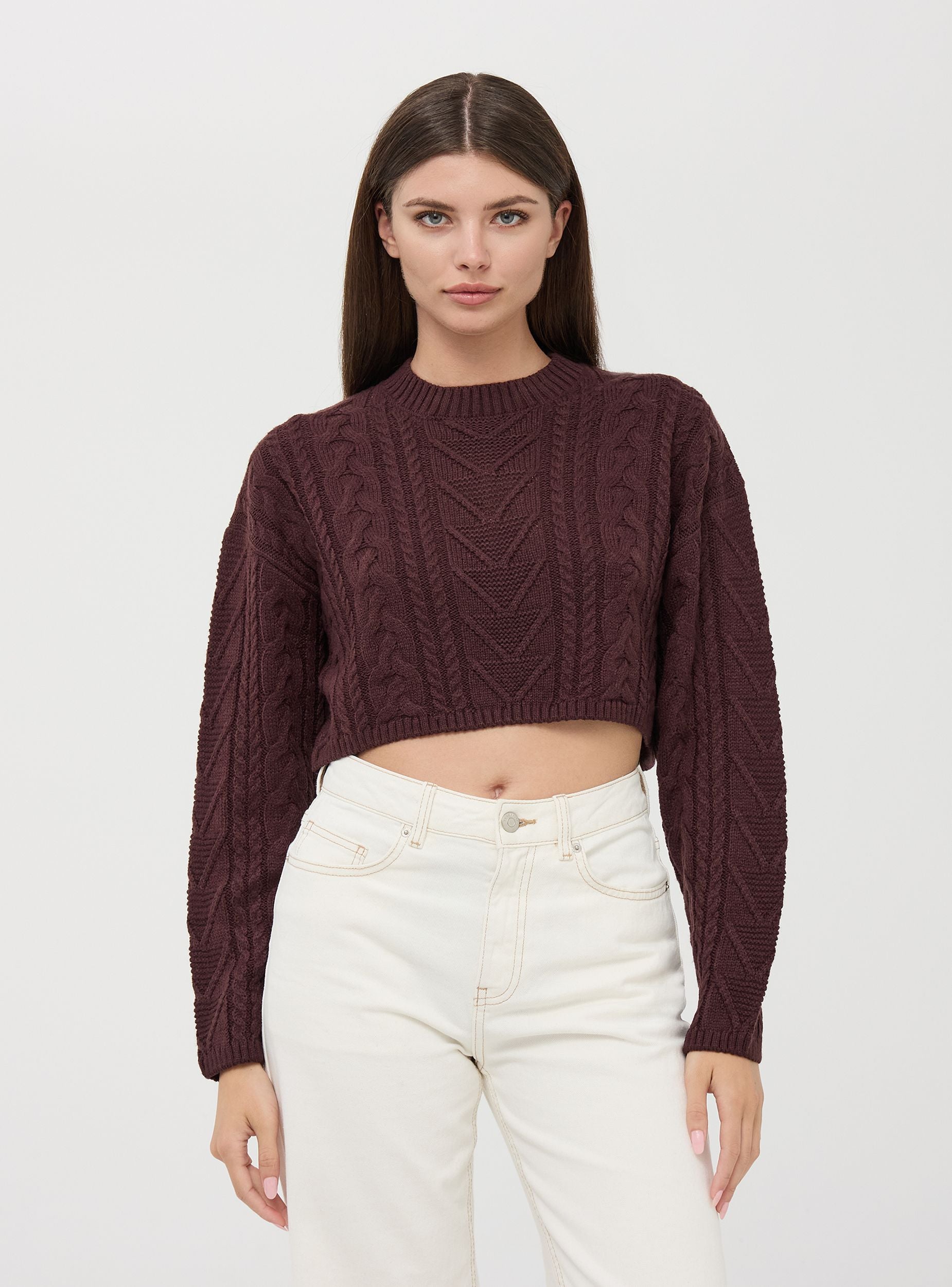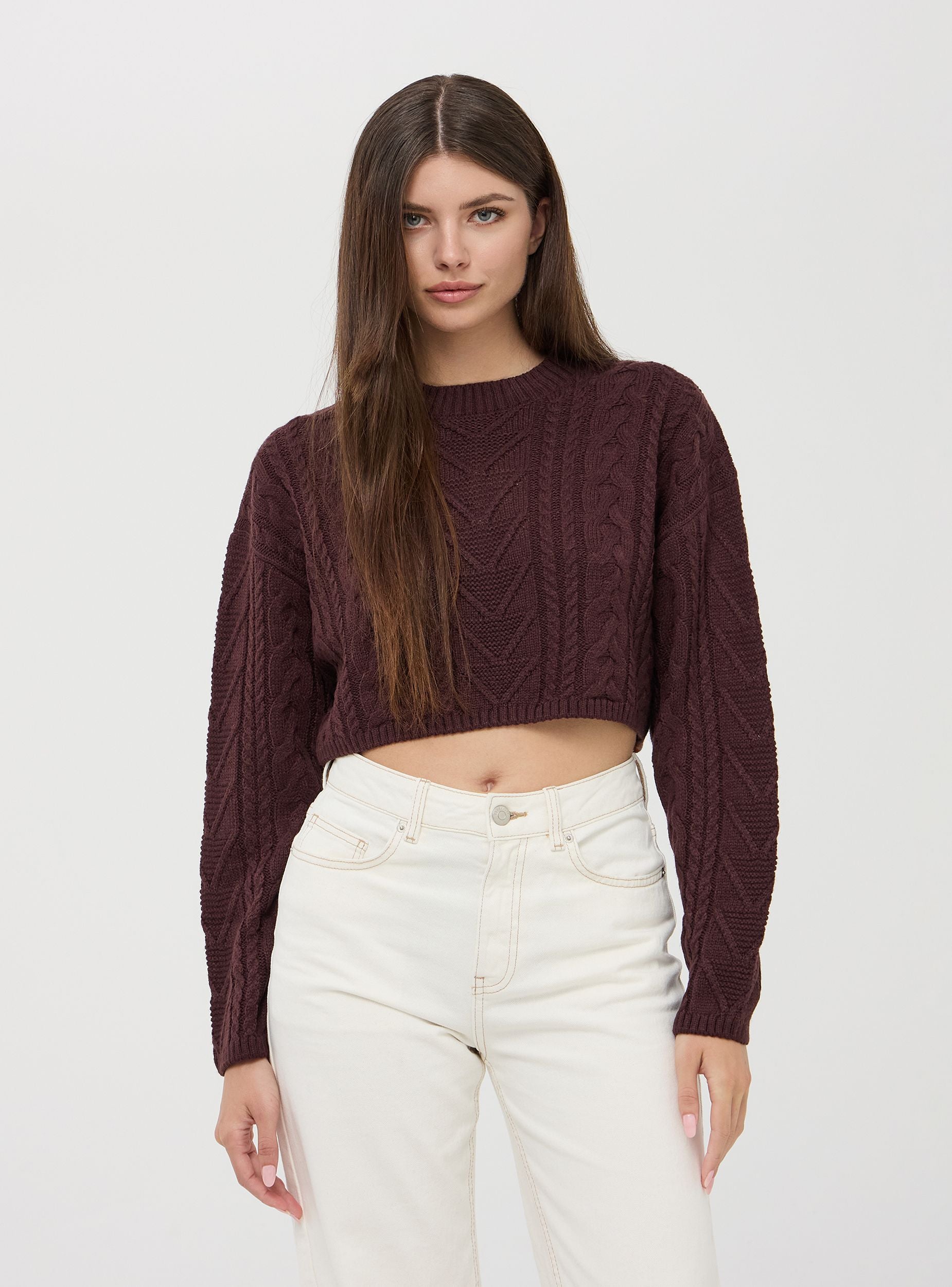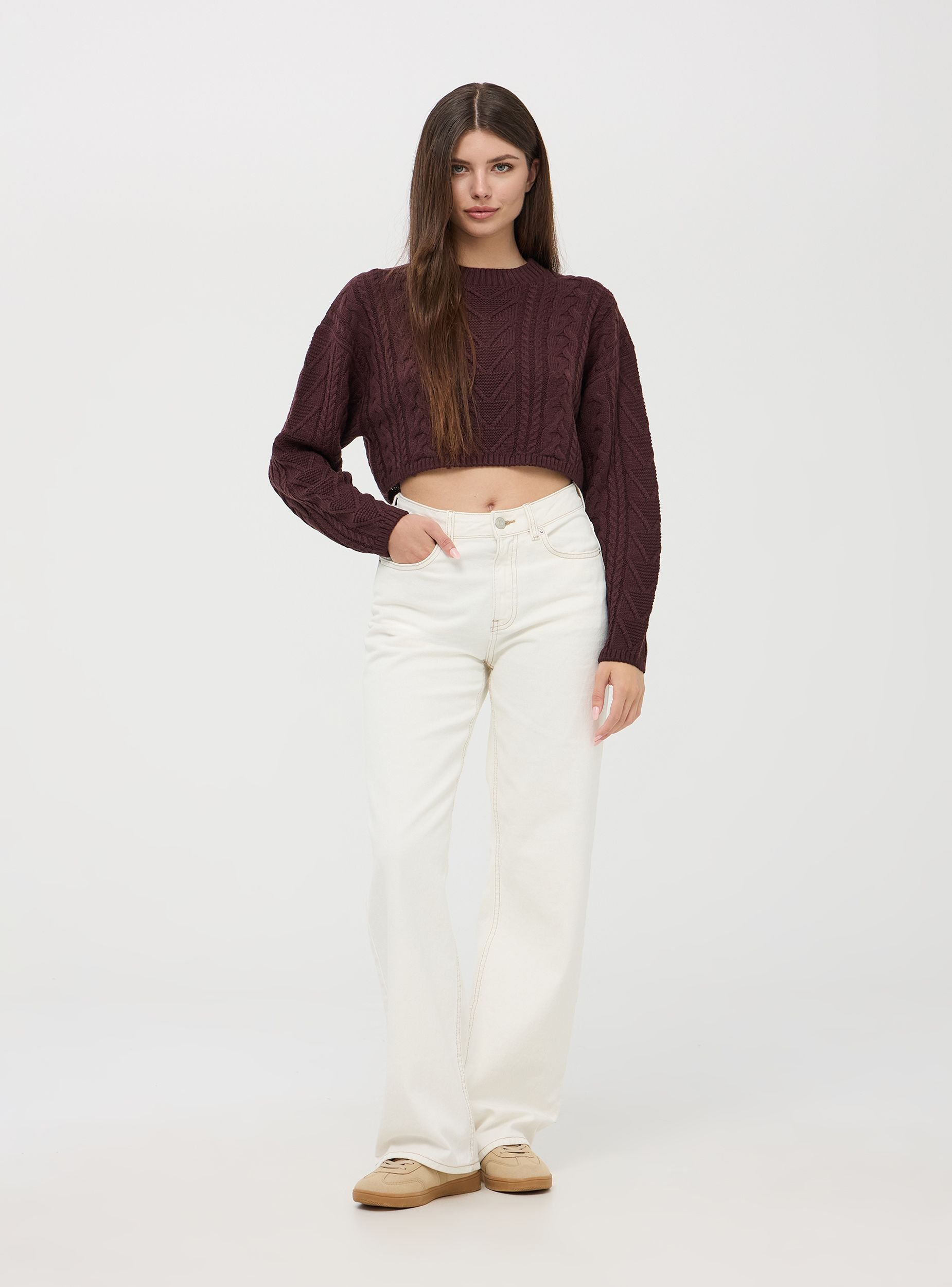 Dámský crop top, který je perfektní pro přidání nádechu ležérní elegance do tvého šatníku. Model s kulatým výstřihem a dlouhými rukávy. Má design s tkaným vzorem, který nabízí texturu a vizuální hloubku. Krátký střih a volný střih ho činí ideálním pro moderní a módní vzhled.Detaily
