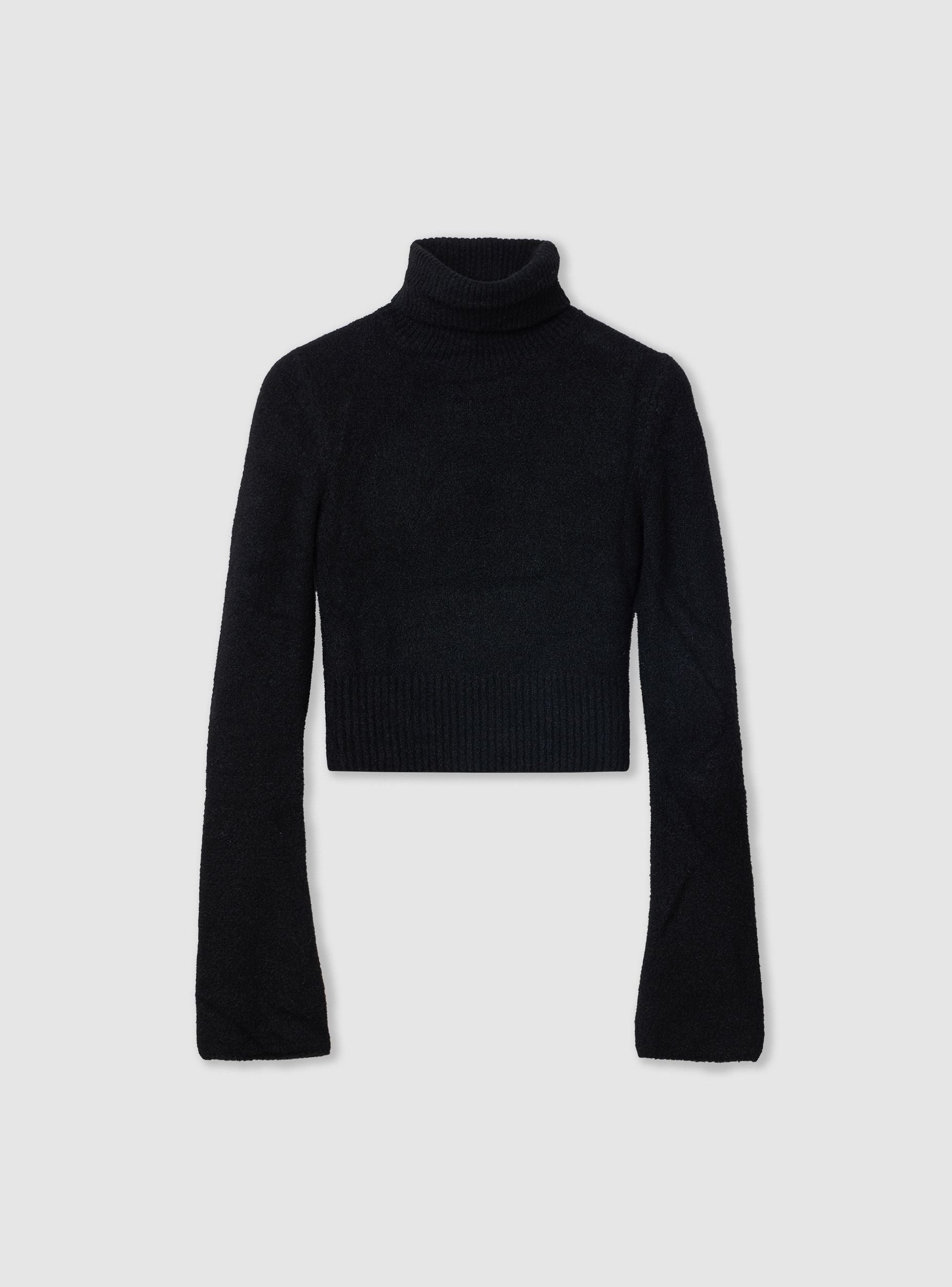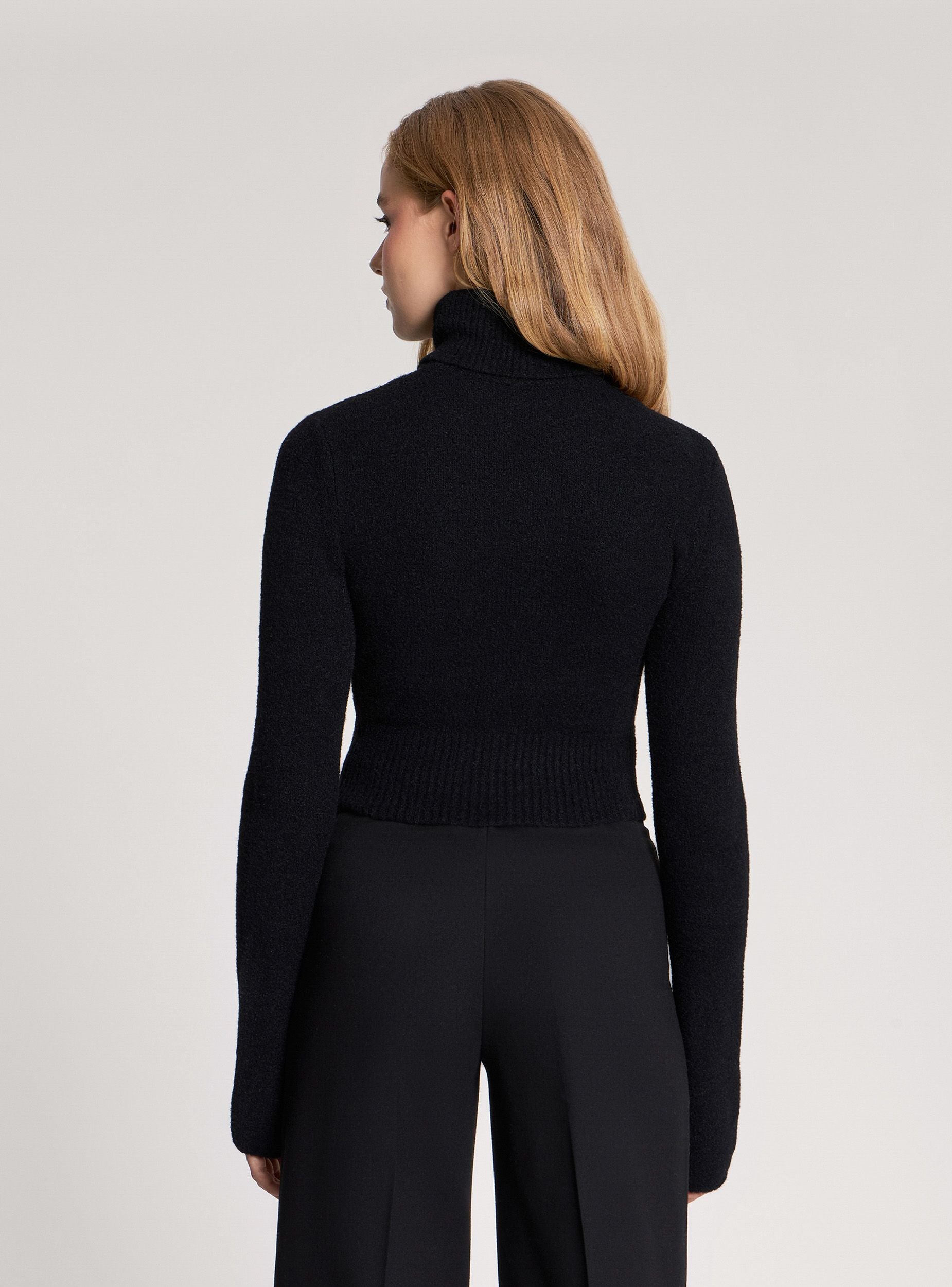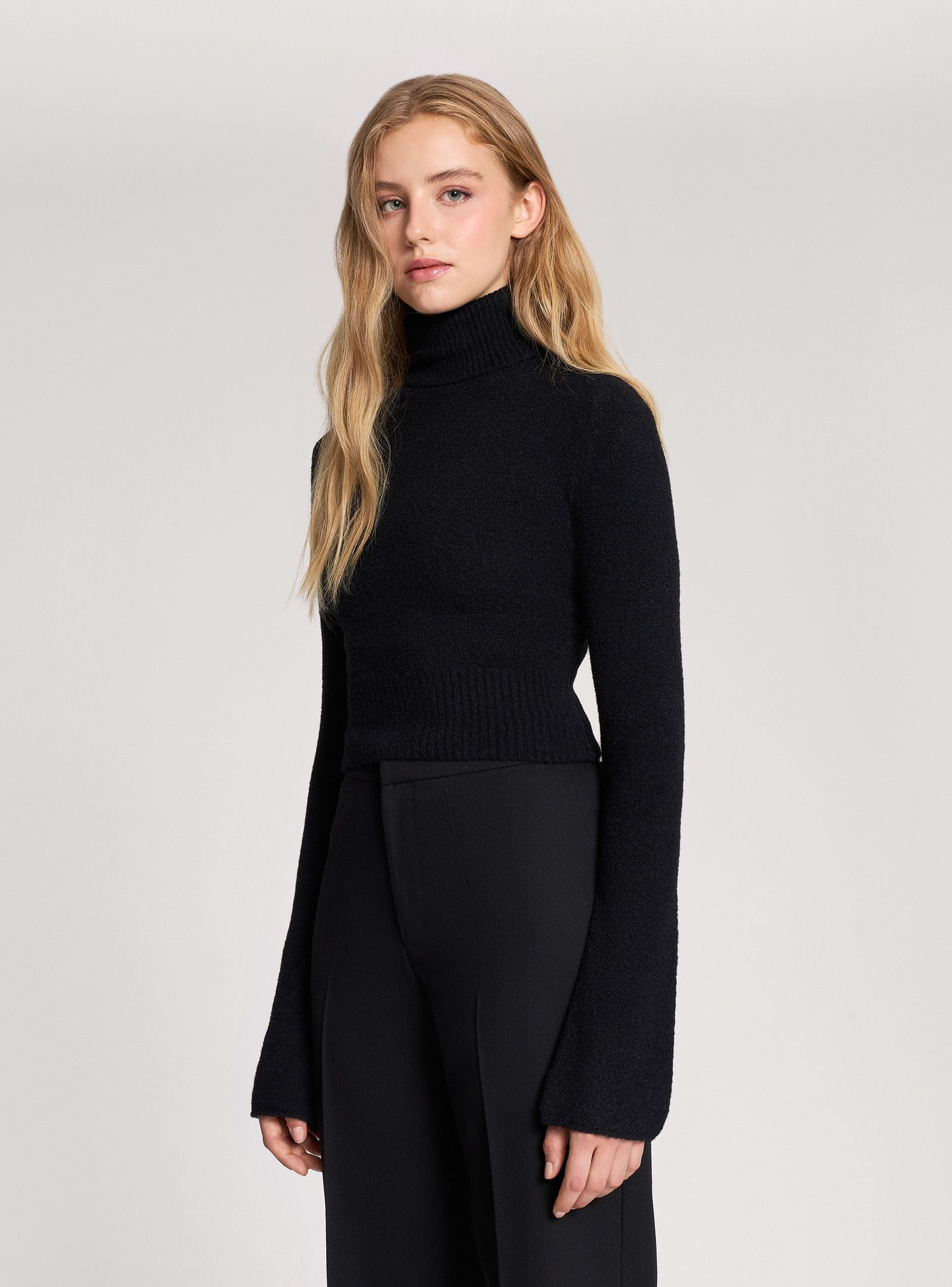 Dámský svetr s crop designem a jednobarevným provedením. Má vysoký rolák, který dodává eleganci a teplo. Dlouhé a široké rukávy nabízejí moderní a pohodlný vzhled. Ideální k kombinaci s kalhotami s vysokým pasem nebo sukněmi, perfektní pro neformální příležitosti nebo pro vytvoření sofistikovaných outfitů.Detaily