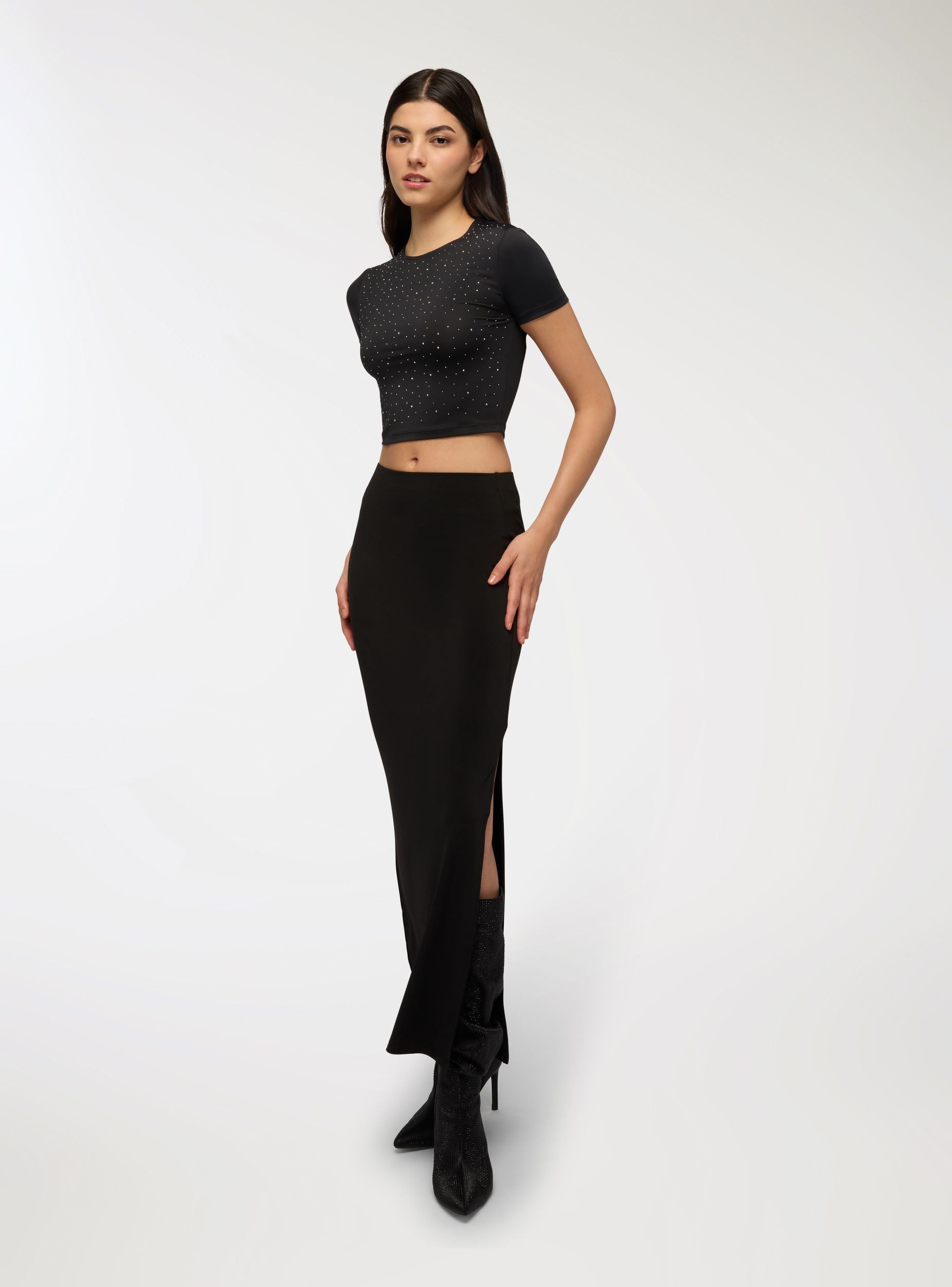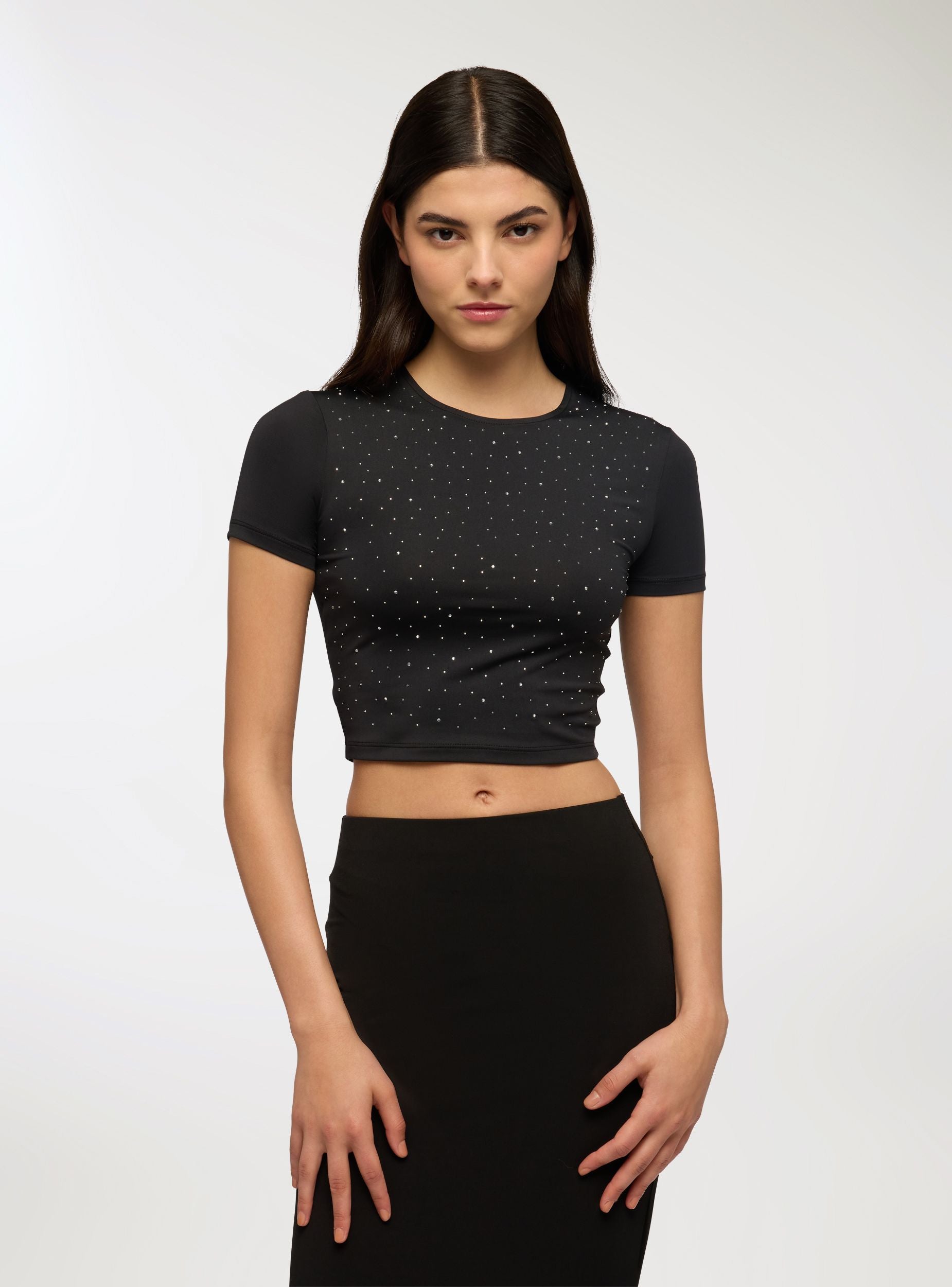 Dámské tričko s crop designem a krátkými rukávy, zdobené kamínky, které dodávají lesk a styl. Ideální pro moderní a módní outfity, skvěle se hodí k kalhotám s vysokým pasem nebo sukním pro univerzální vzhled. Přiléhavý střih zvýrazňuje siluetu a je vhodný pro různé příležitosti, jak neformální, tak elegantní.