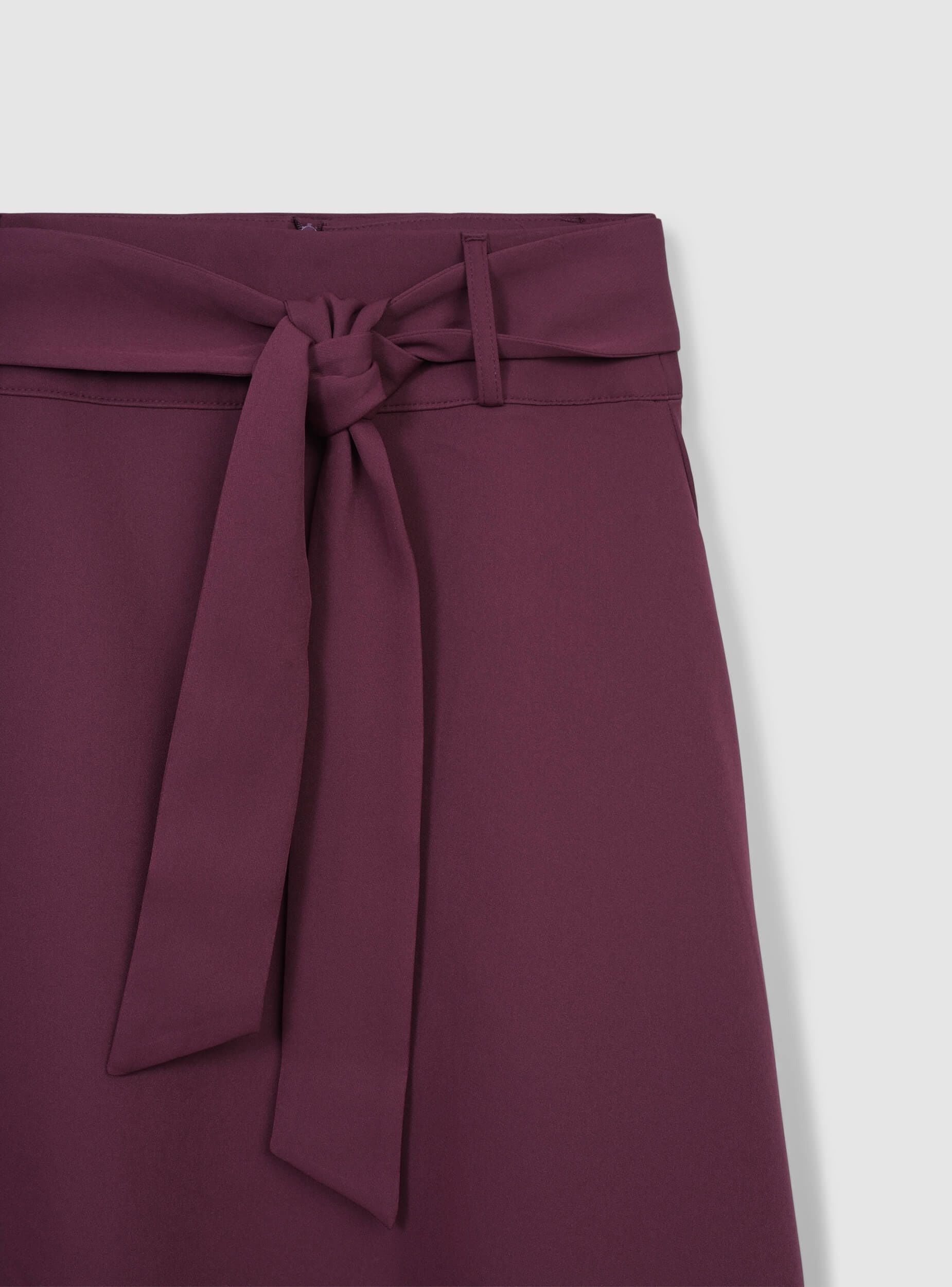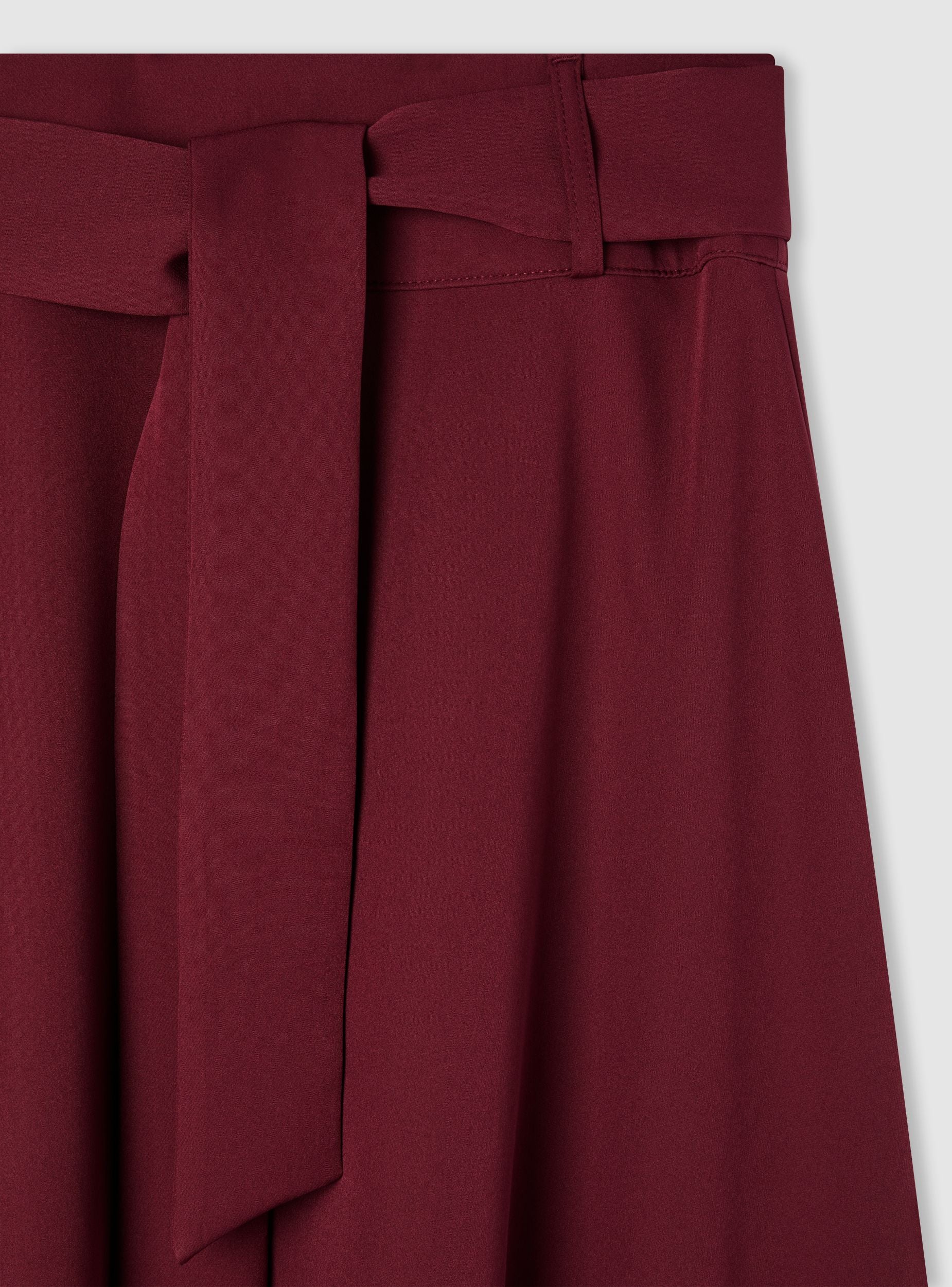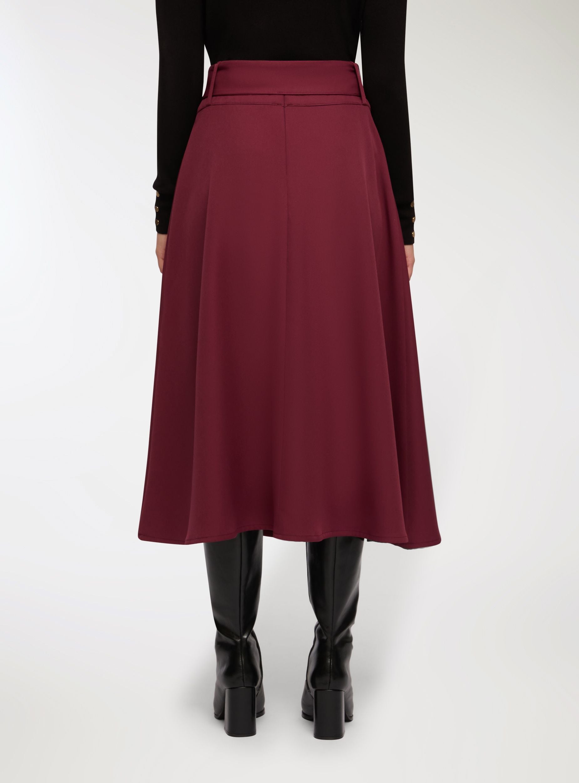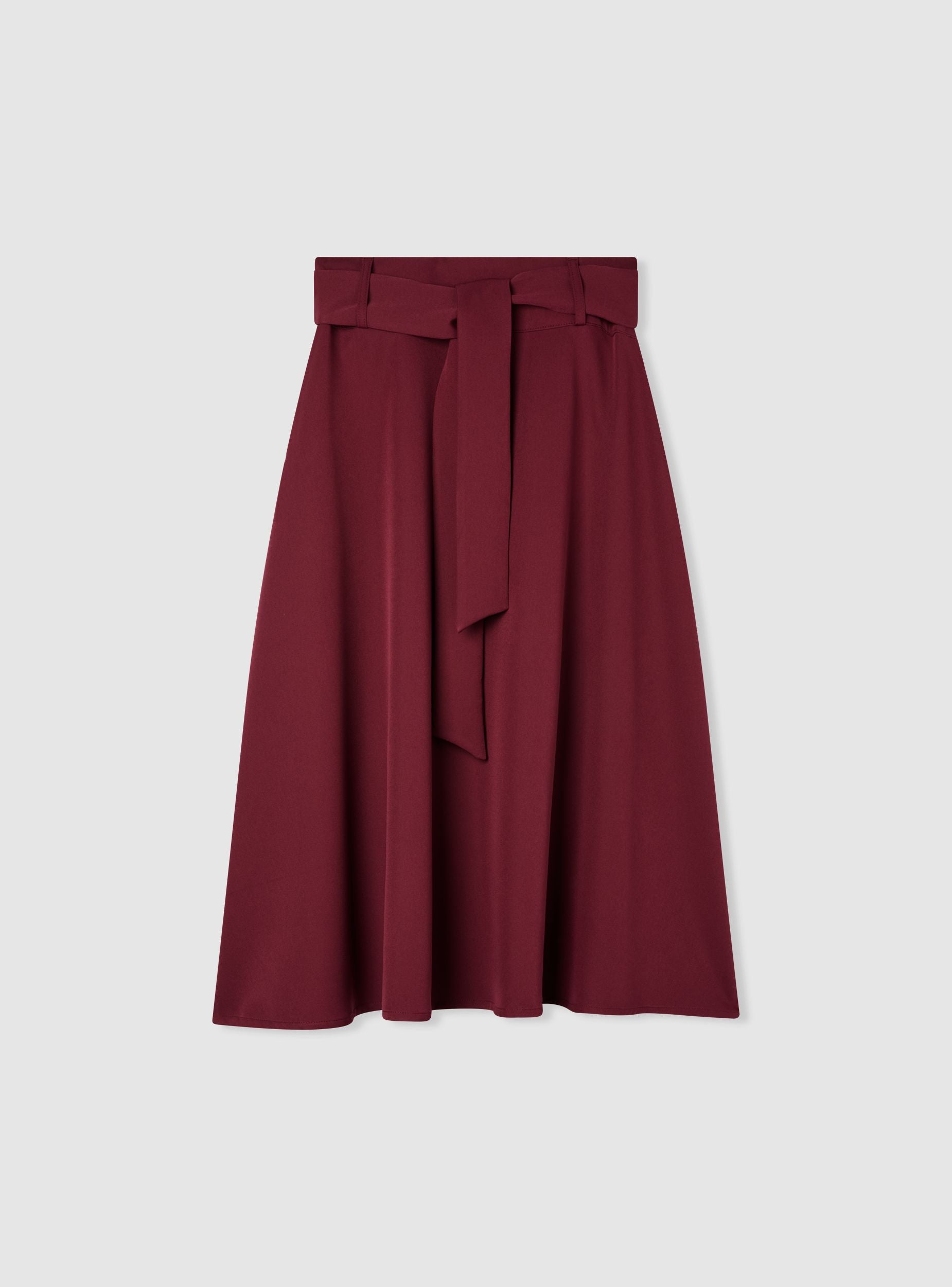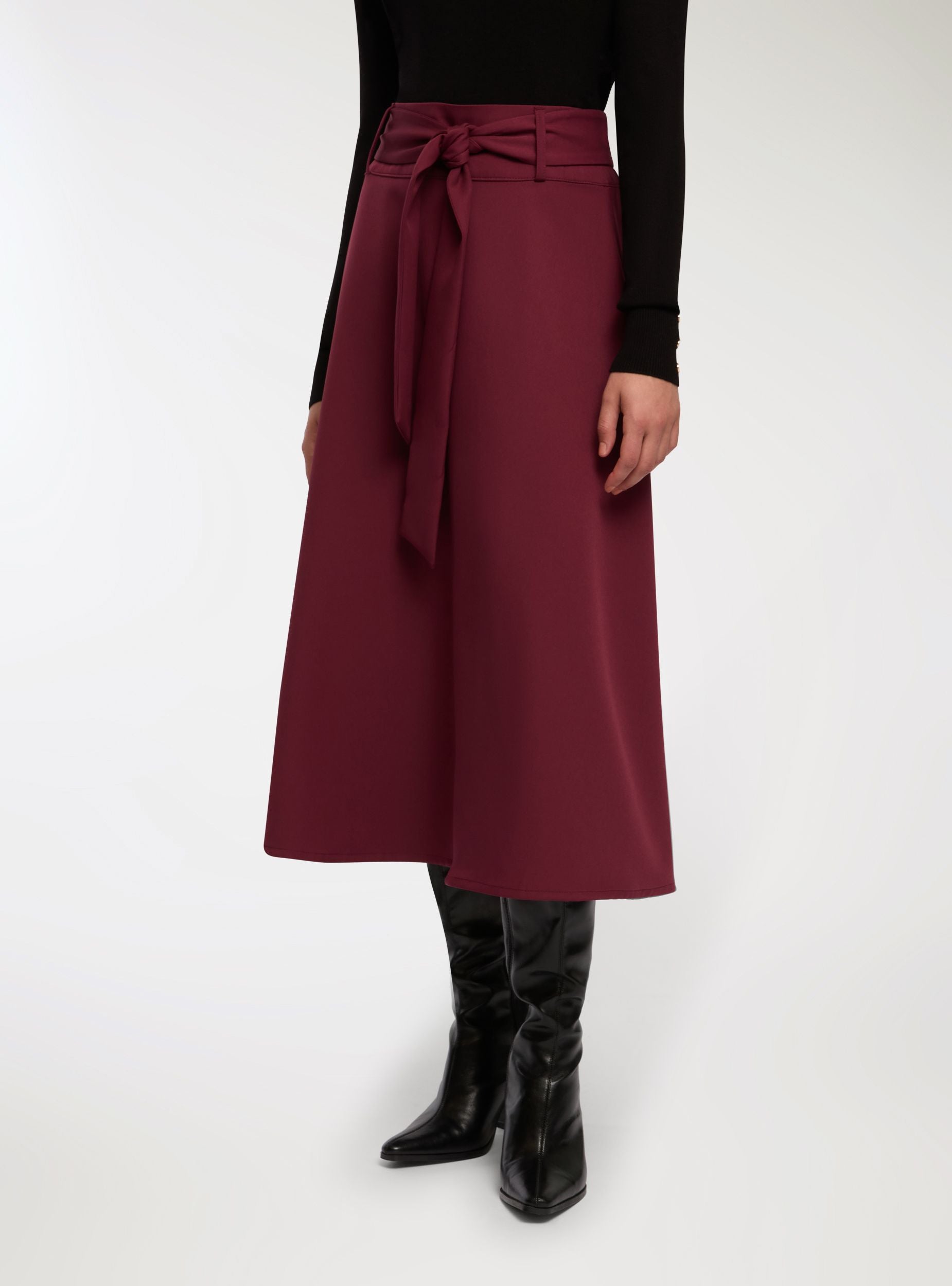 Dlouhá dámská sukně v jednobarevném provedení, charakterizovaná rozšířenou siluetou a zavázaným páskem v pase, který zvýrazňuje postavu. Ideální pro kancelářské outfity nebo elegantní příležitosti, snadno se kombinuje s košilemi nebo přiléhavými topy. Skrytý zip na zadní straně je diskrétní, bez viditelných kapes, a základní design ji činí univerzální pro formální i neformální outfity.