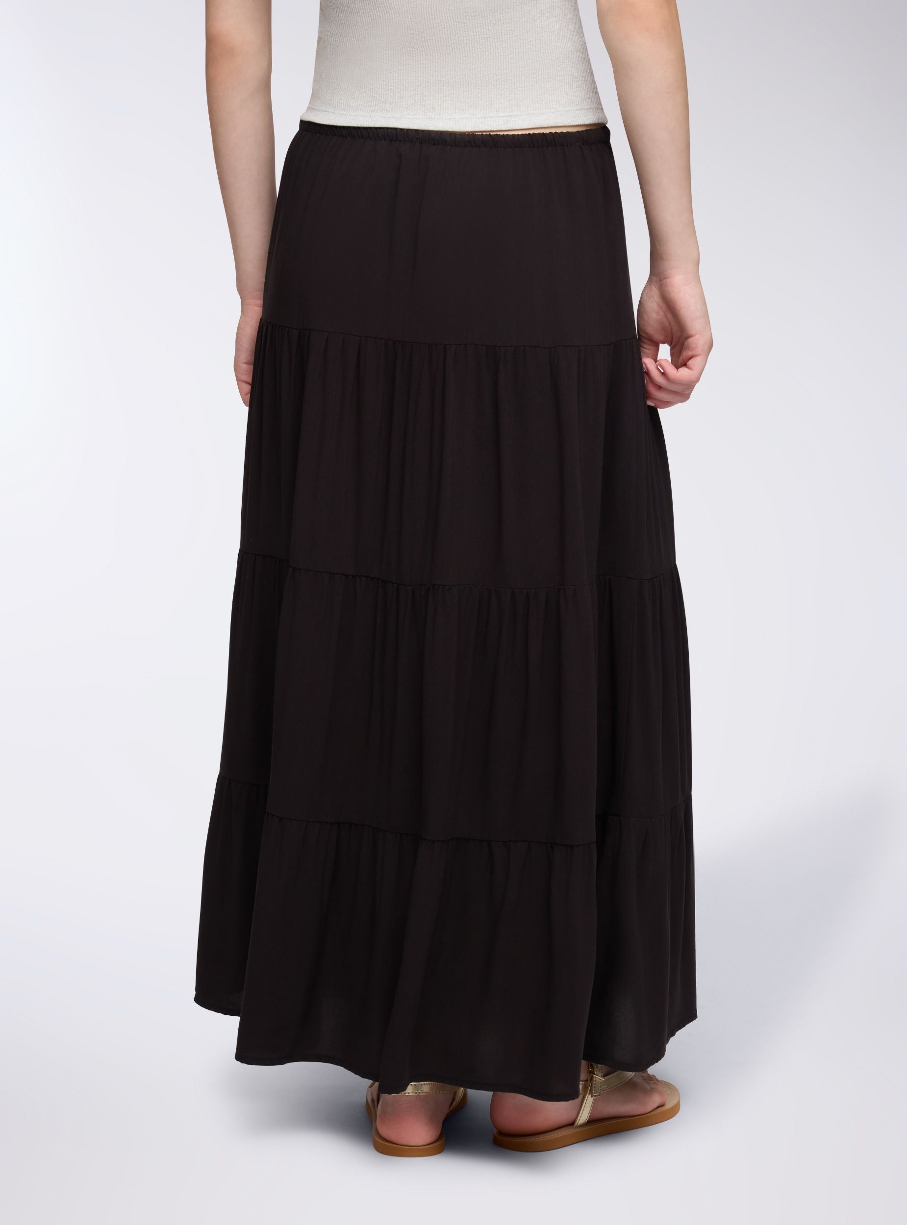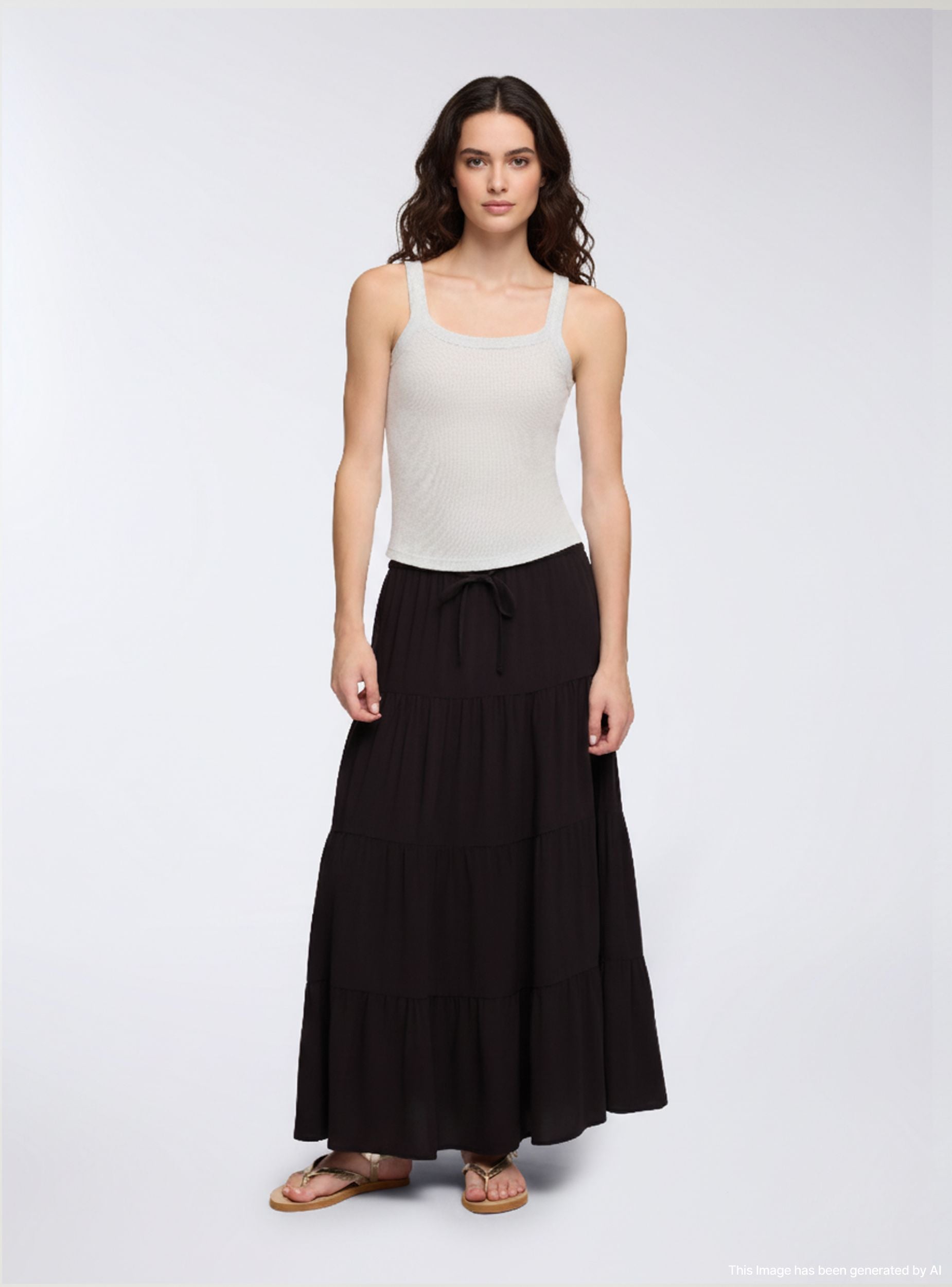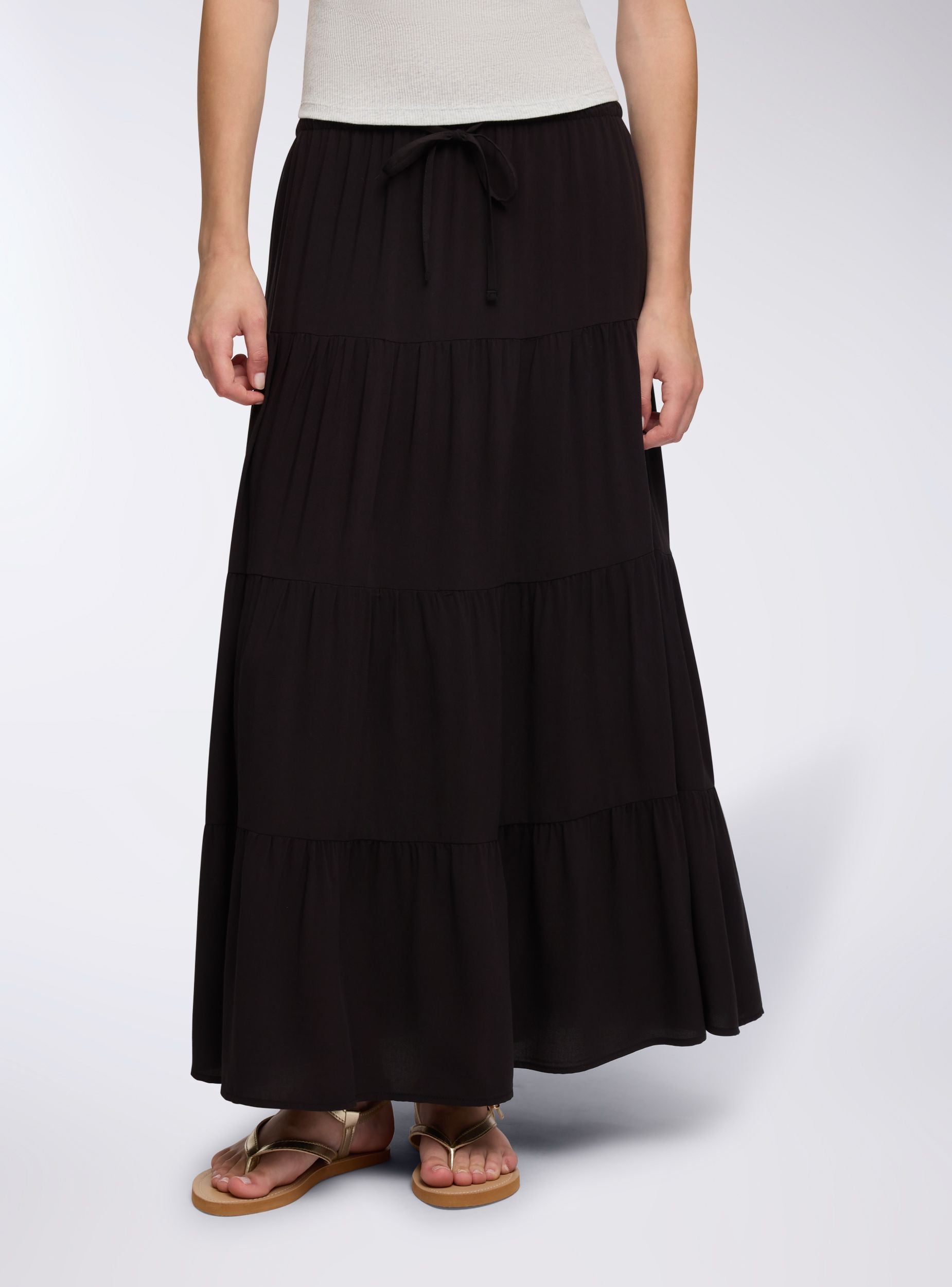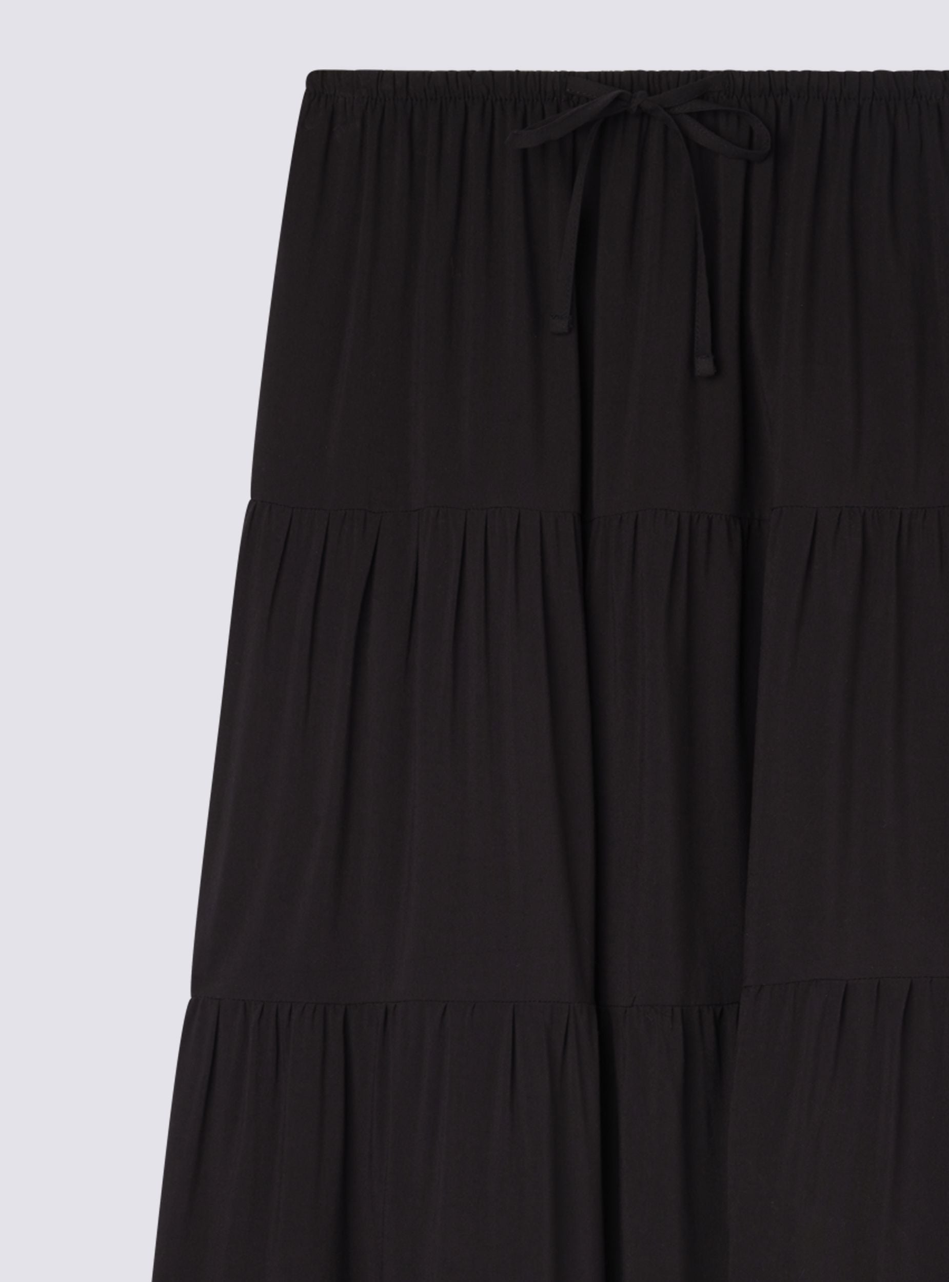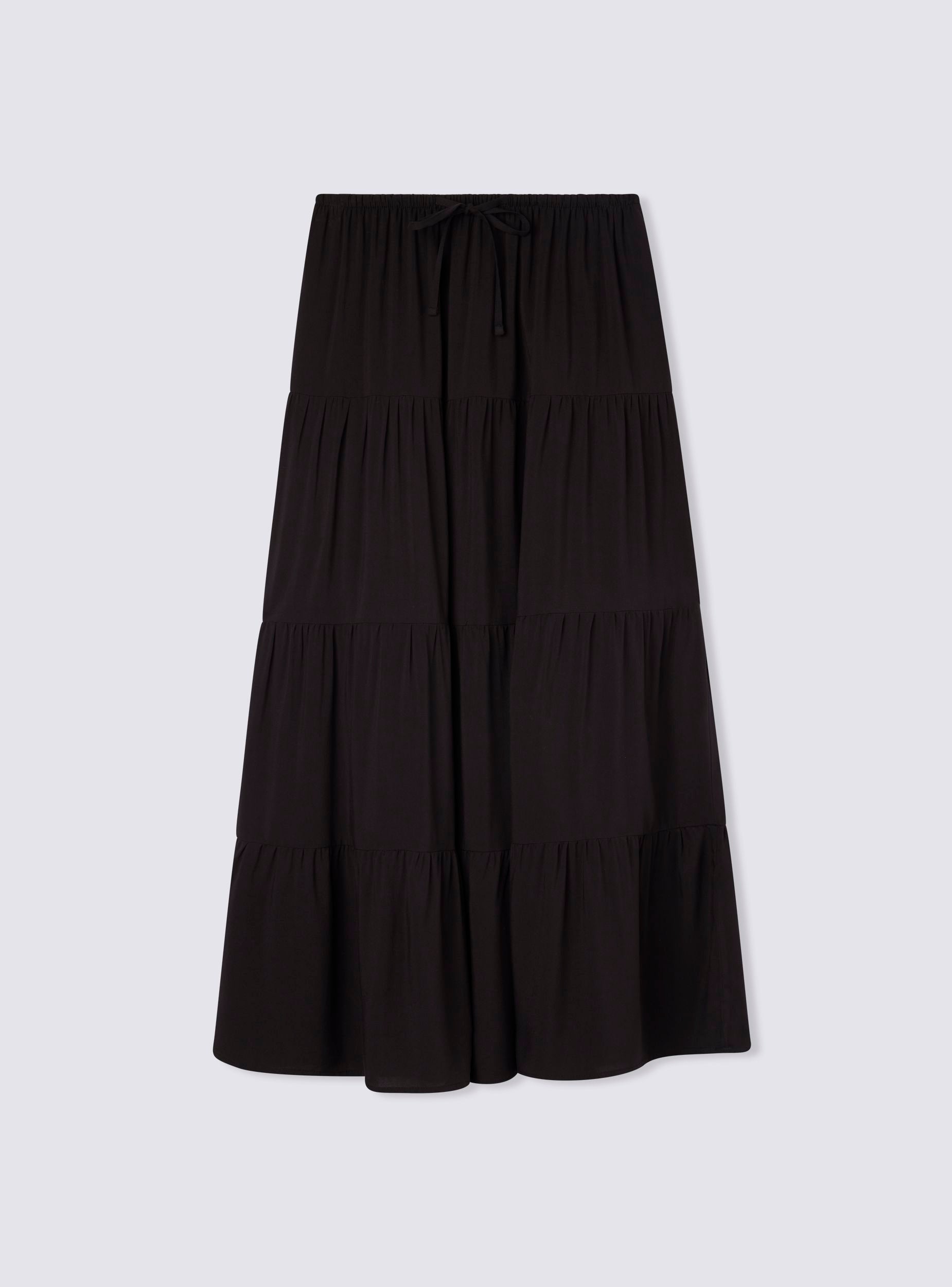 Dámská dlouhá jednobarevná sukně s volány, ideální pro ležérní a všestranný vzhled. Elastický pas se šňůrkou zajišťuje pohodlné a nastavitelné nošení. Perfektní k nošení s tričky nebo košilemi, vhodná pro různé příležitosti, od volného času po neformální události. Design s volány dodává oděvu pohyb a styl, díky čemuž je nezbytným kouskem v šatníku.Detaily