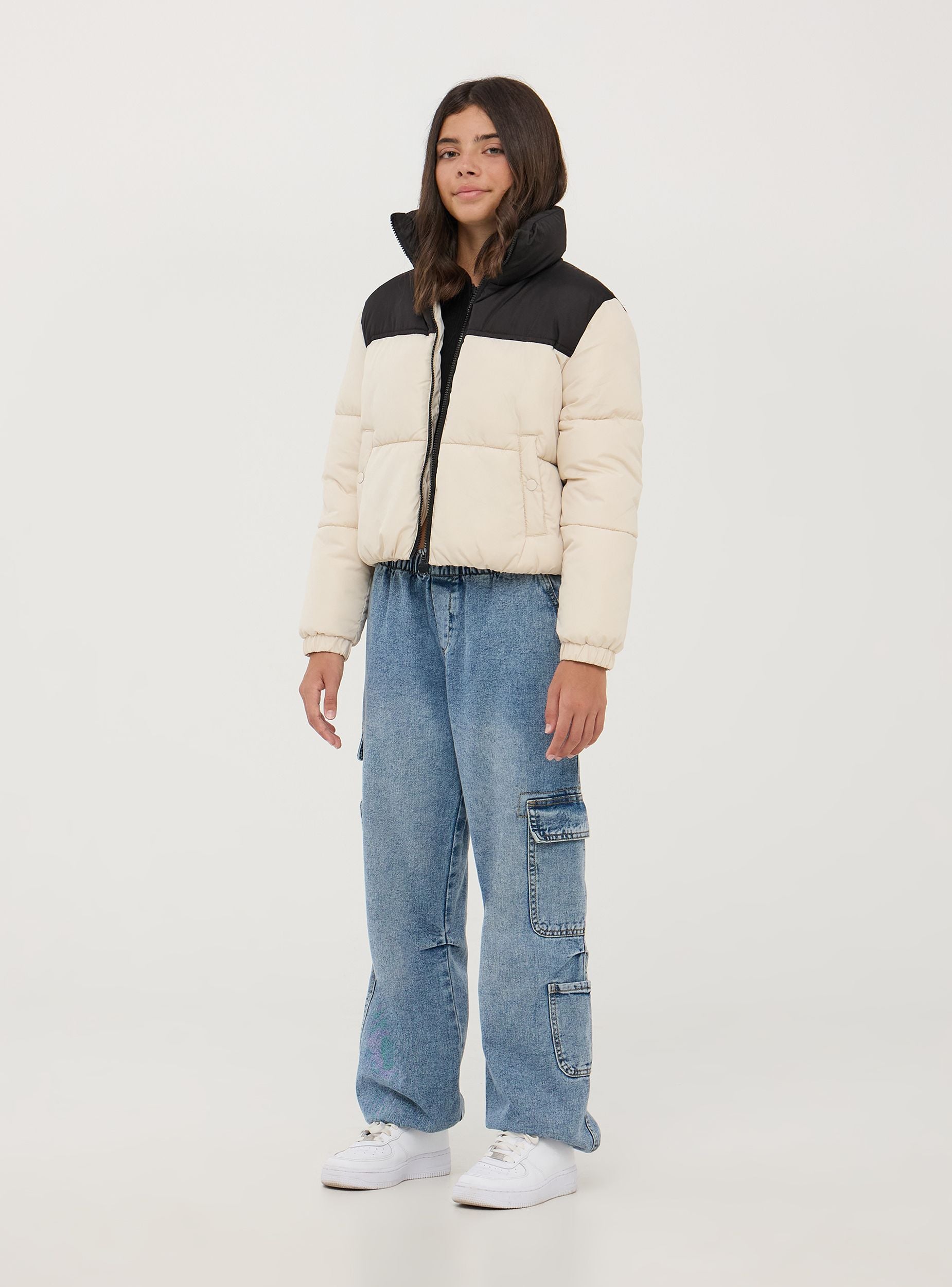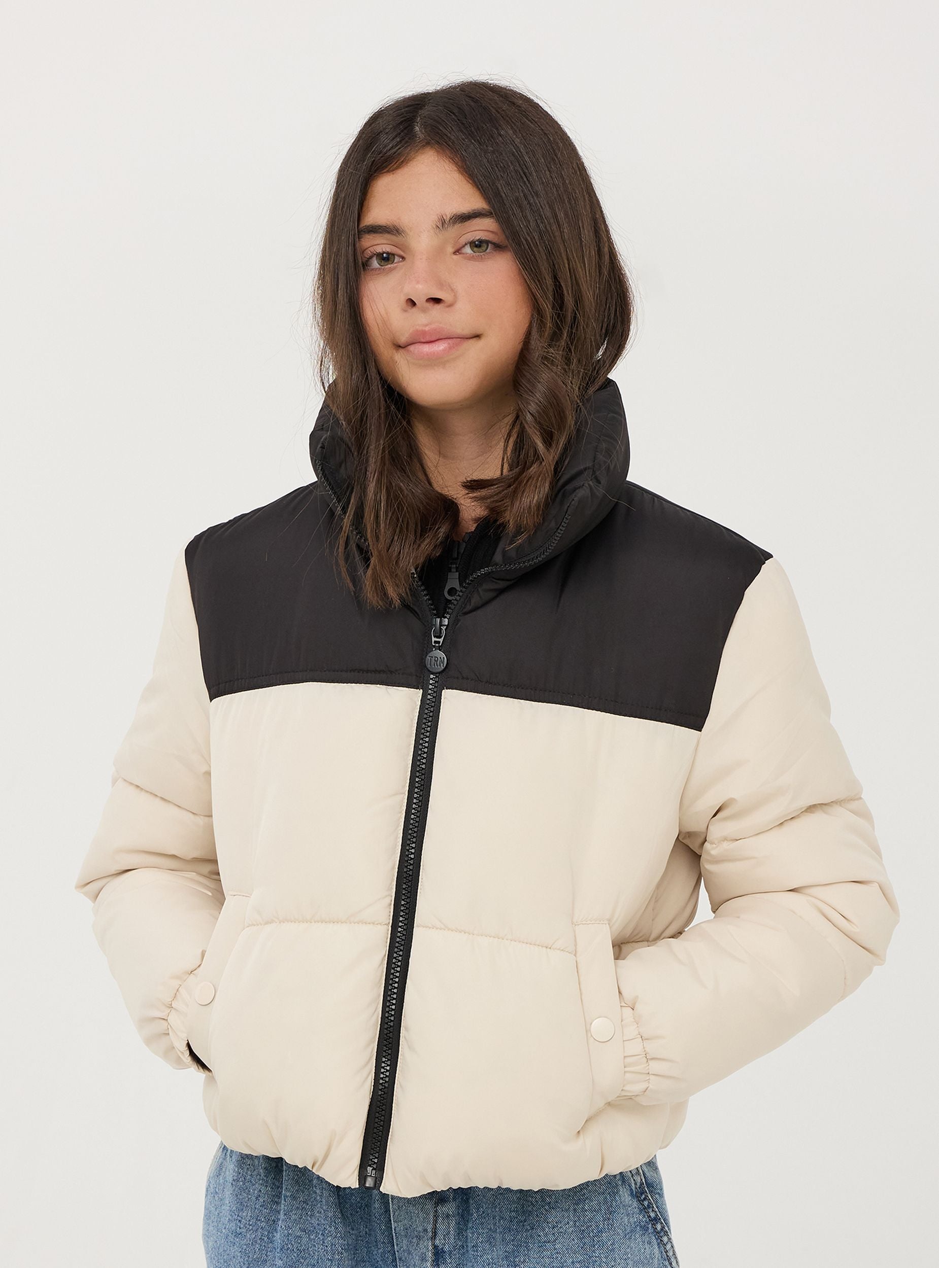 Dívčí prošívaná bunda s designem v blokových barvách. Má přední zip a vysoký límec pro lepší ochranu před chladem. Rukávy a tělo jsou prošívané pro lepší tepelnou izolaci. Model obsahuje kapsy se zapínáním na patentky. Vyrobeno z materiálu odolného vůči dešti.Detaily