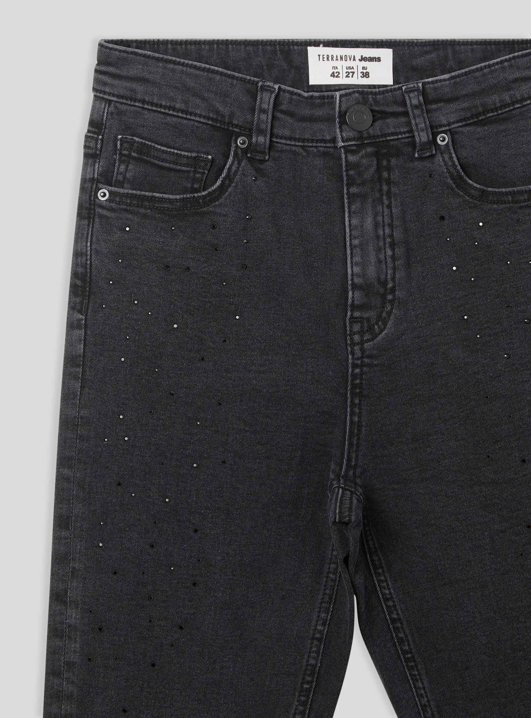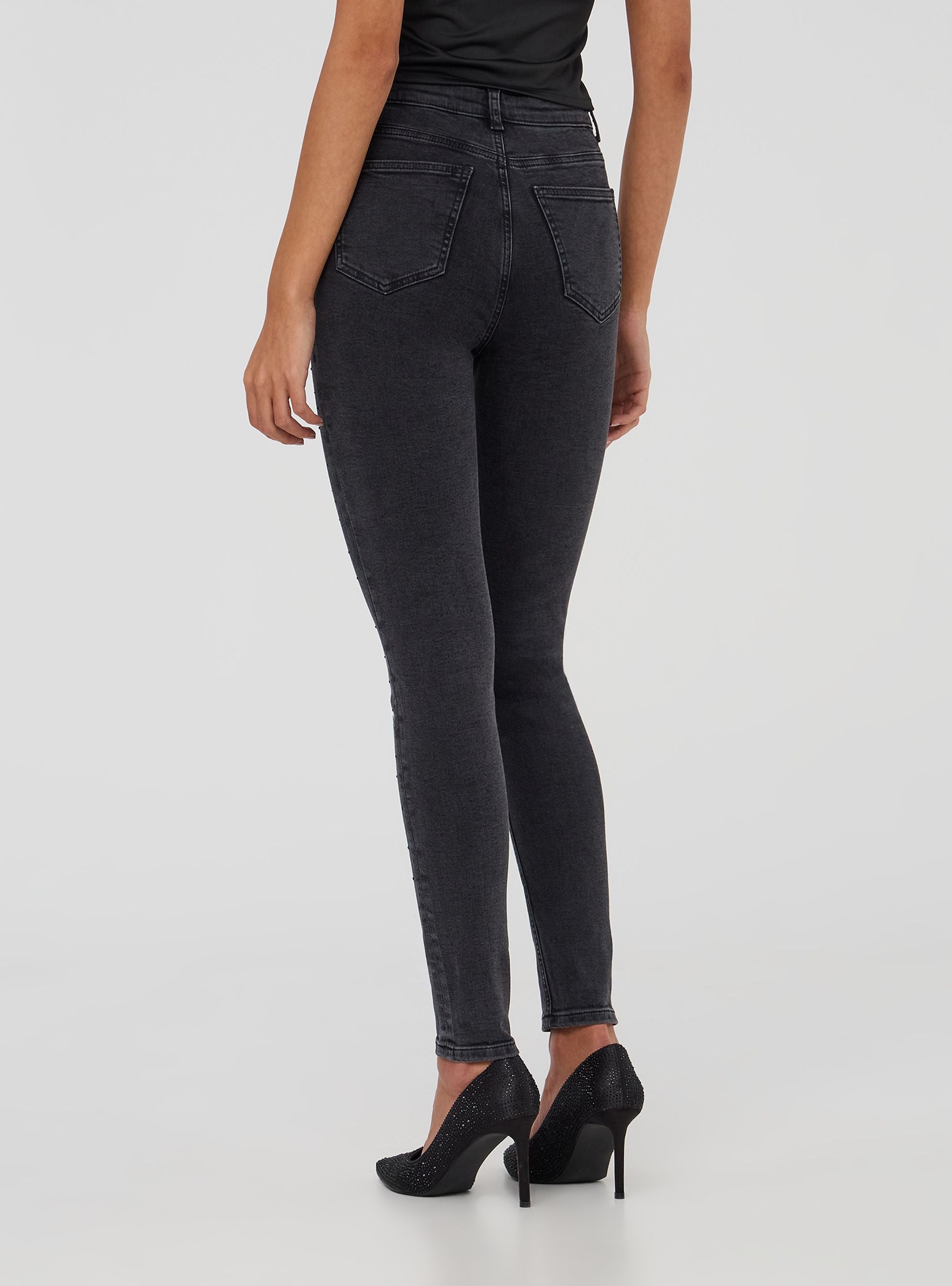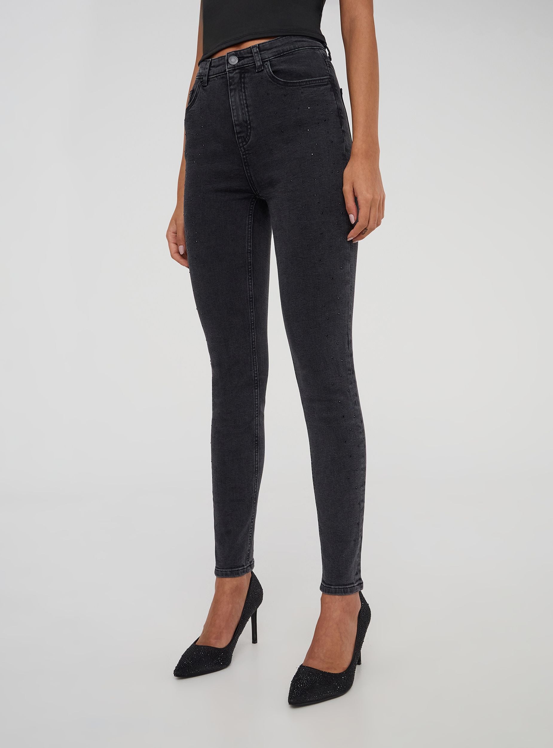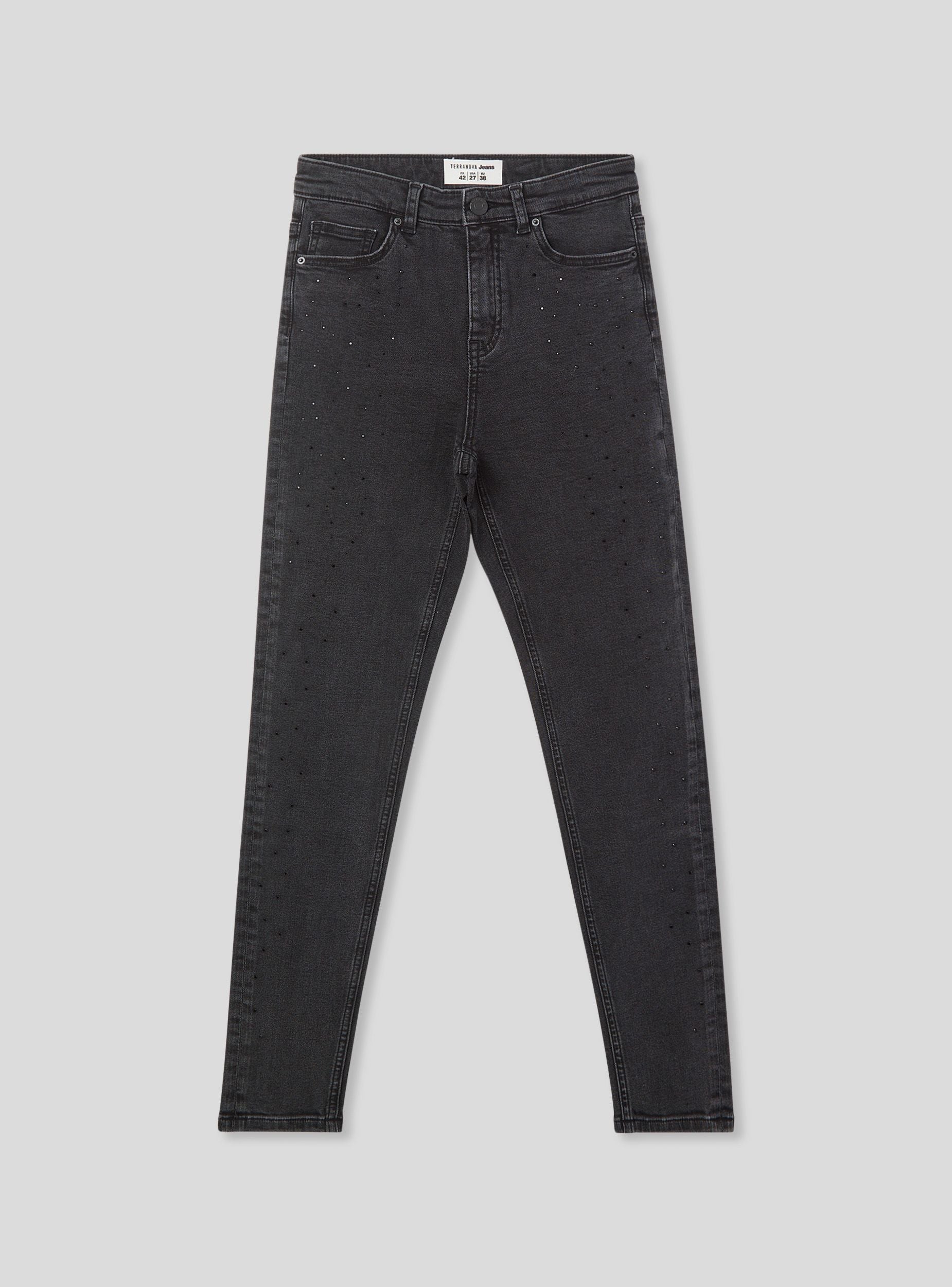 Dámské skinny džíny, obohacené elegantními detaily z kamínků pro zářivý a sofistikovaný vzhled. Model s pěti kapsami a zapínáním na zip a knoflík, spolu s poutky v pase, zajišťuje praktičnost a styl. Ideální k volné blůze a podpatkům pro chic vzhled, nebo k tričku a teniskám pro moderní a dynamický outfit.