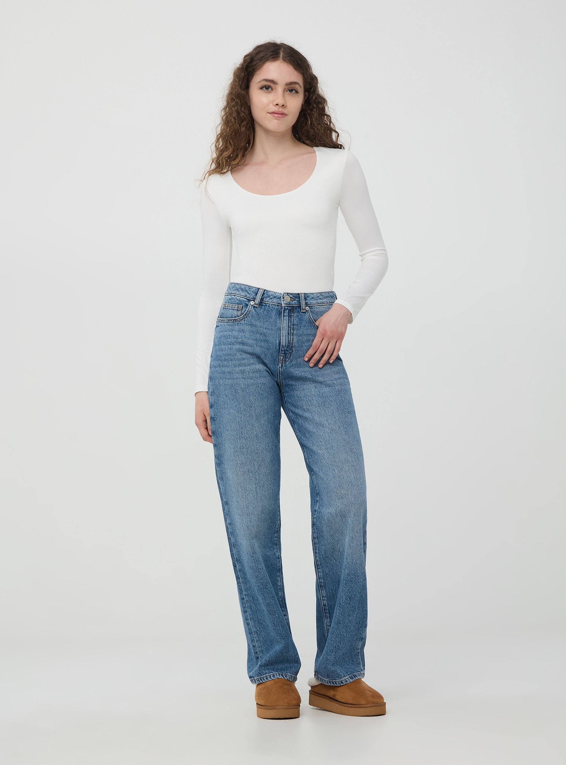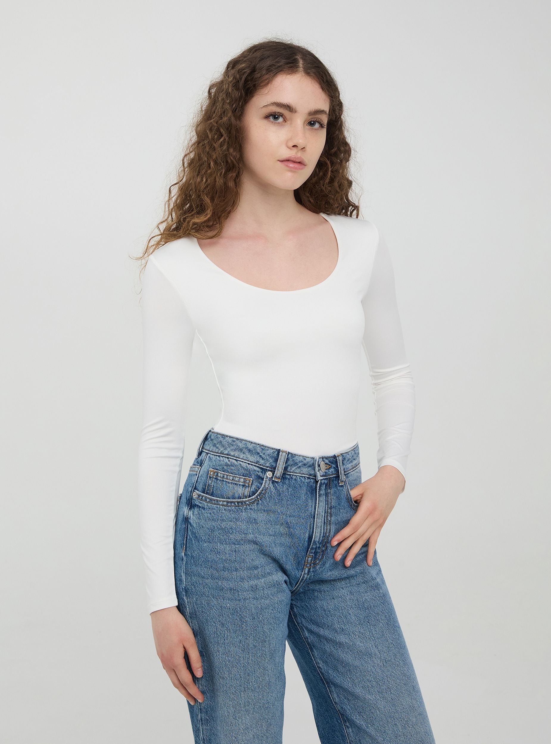 Dámské tričko s dlouhým rukávem vyrobené z elastického a lesklého jednobarevného materiálu. Design se vyznačuje přiléhavým střihem, který zvýrazňuje siluetu, doplněným širokým výstřihem, který dodává kousku ženský nádech. Toto tričko je ideální pro ty, kteří hledají oblečení, které kombinuje pohodlí a styl.Detaily