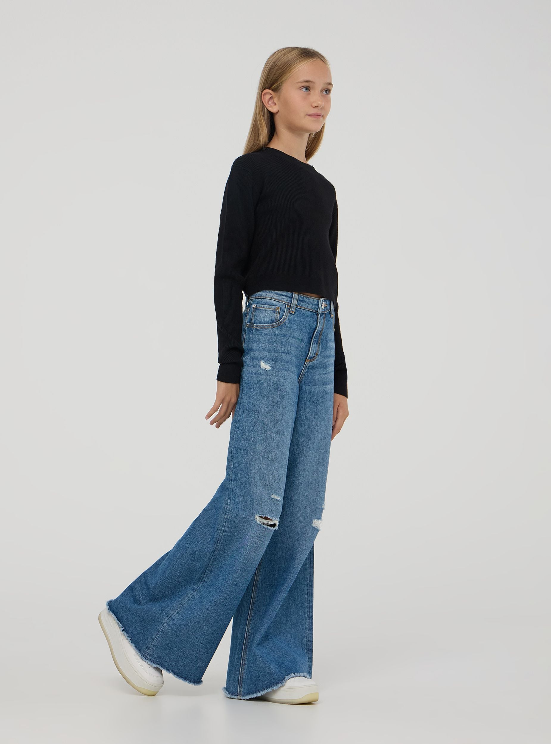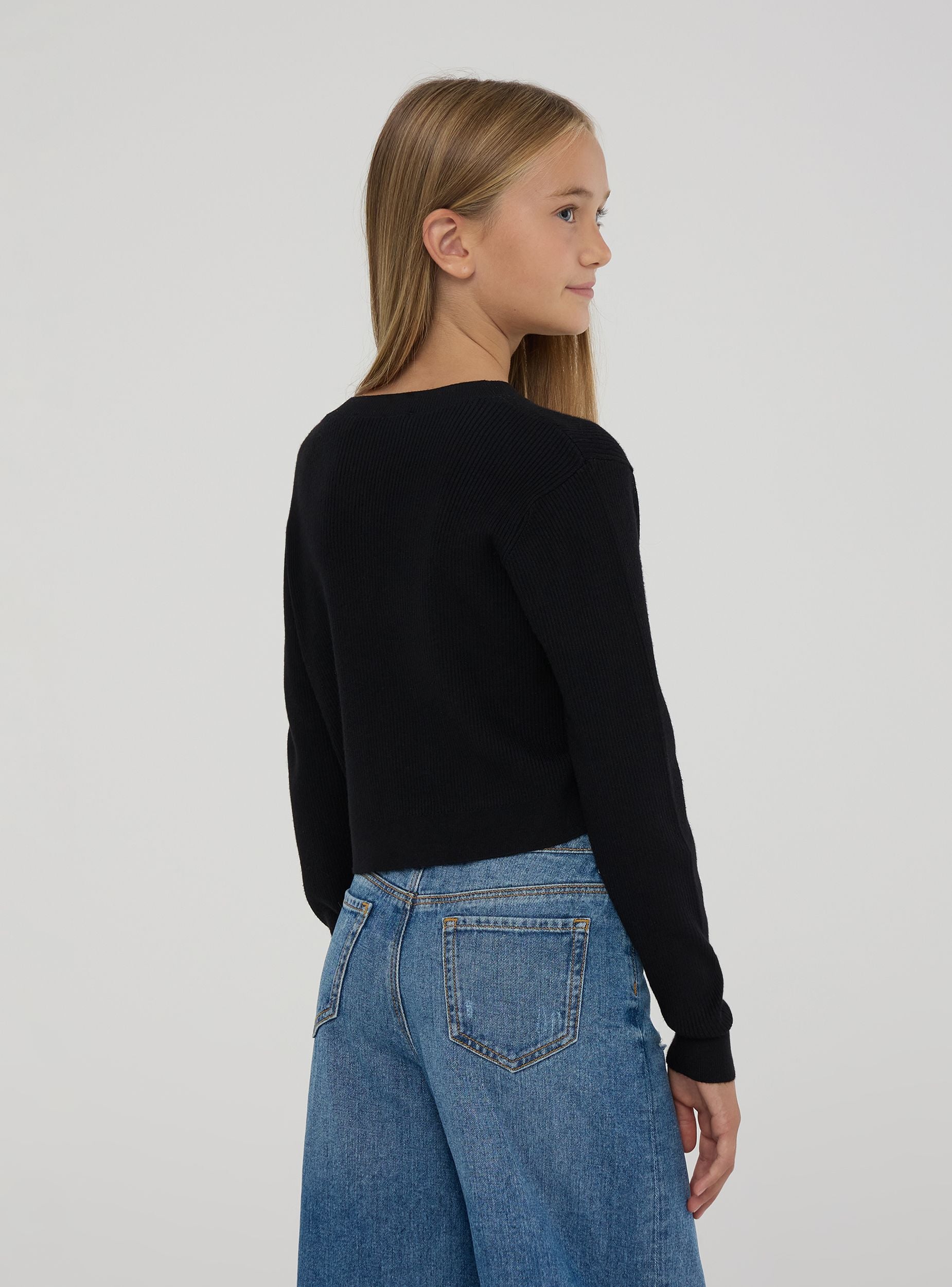Dívčí svetr s dlouhými rukávy a kulatým výstřihem, charakterizovaný crop střih, který dodává moderní a módní nádech. Vyrobený z jednobarevné směsi viskózy, měkký a pohodlný. Ideální pro různé příležitosti, od školy po výlety s přáteli nebo rodinou, tento svetr je univerzální a snadno kombinovatelný pro ležérní a trendy vzhled. Základní kousek v šatníku každé dívky, který spojuje styl a praktičnost.