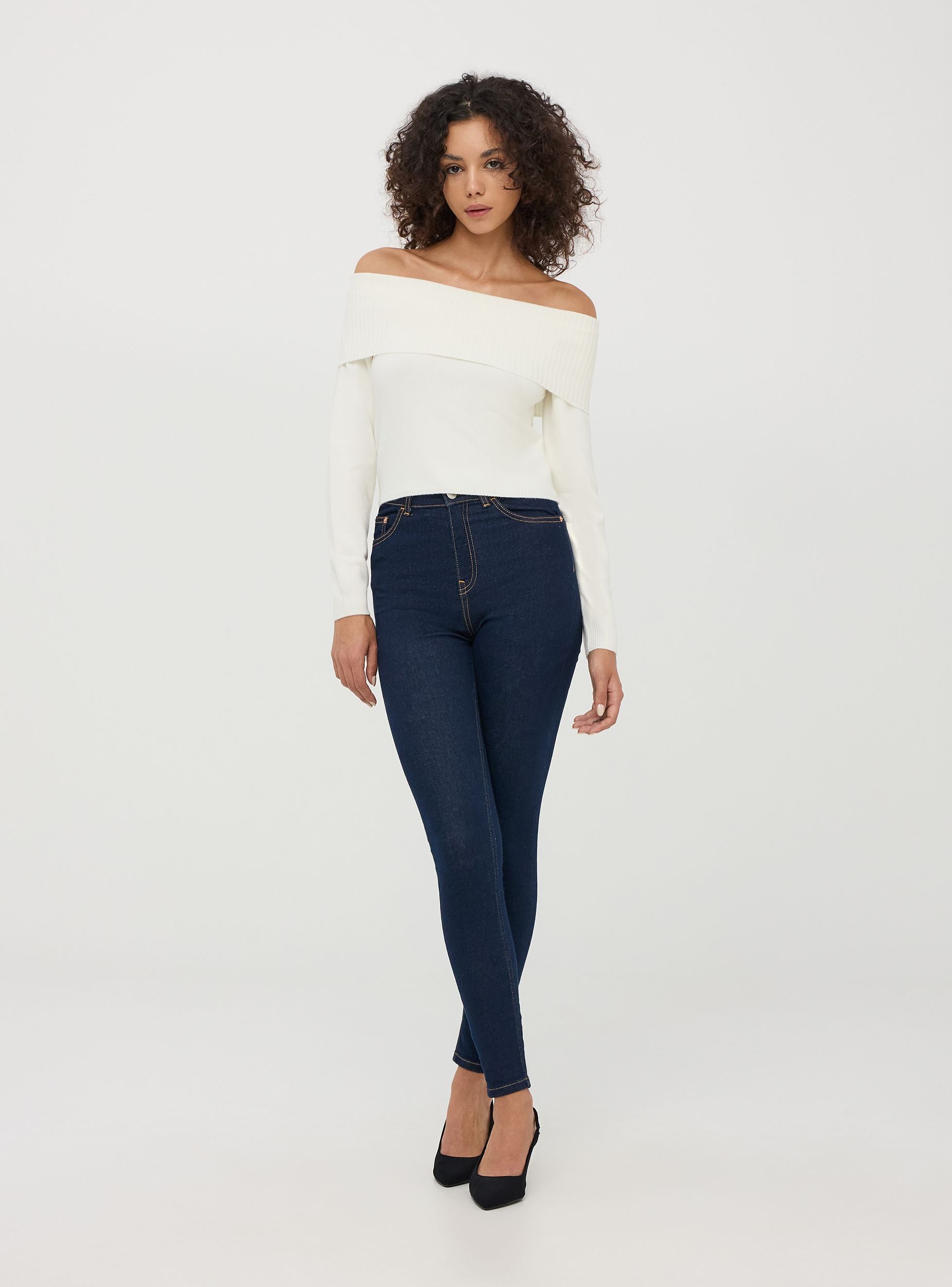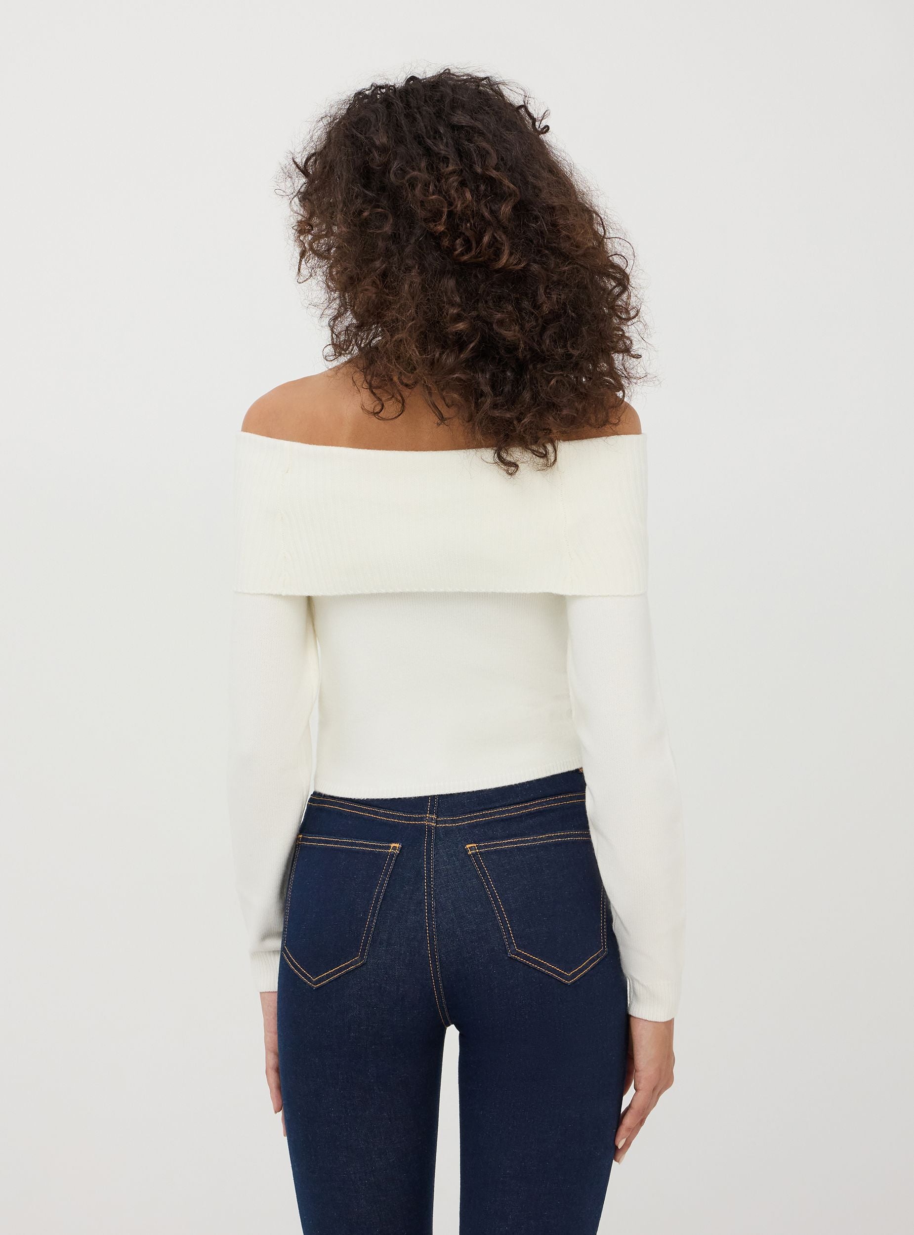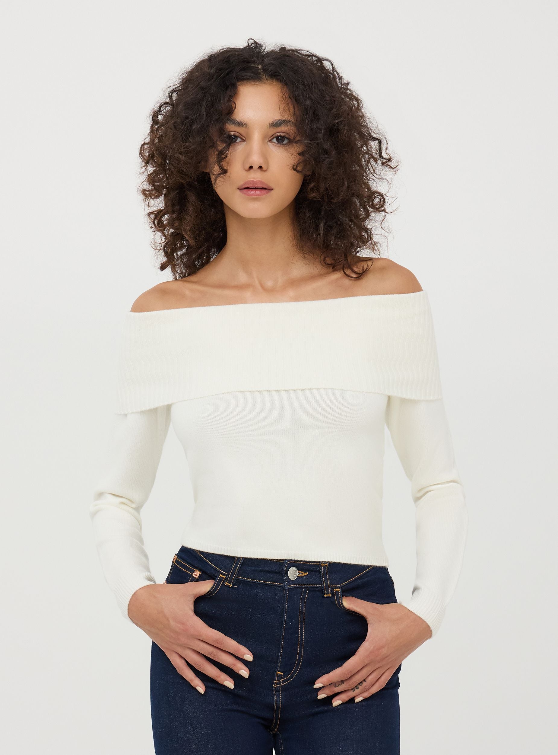 Jednobarevný svetřík s výstřihem přes ramena