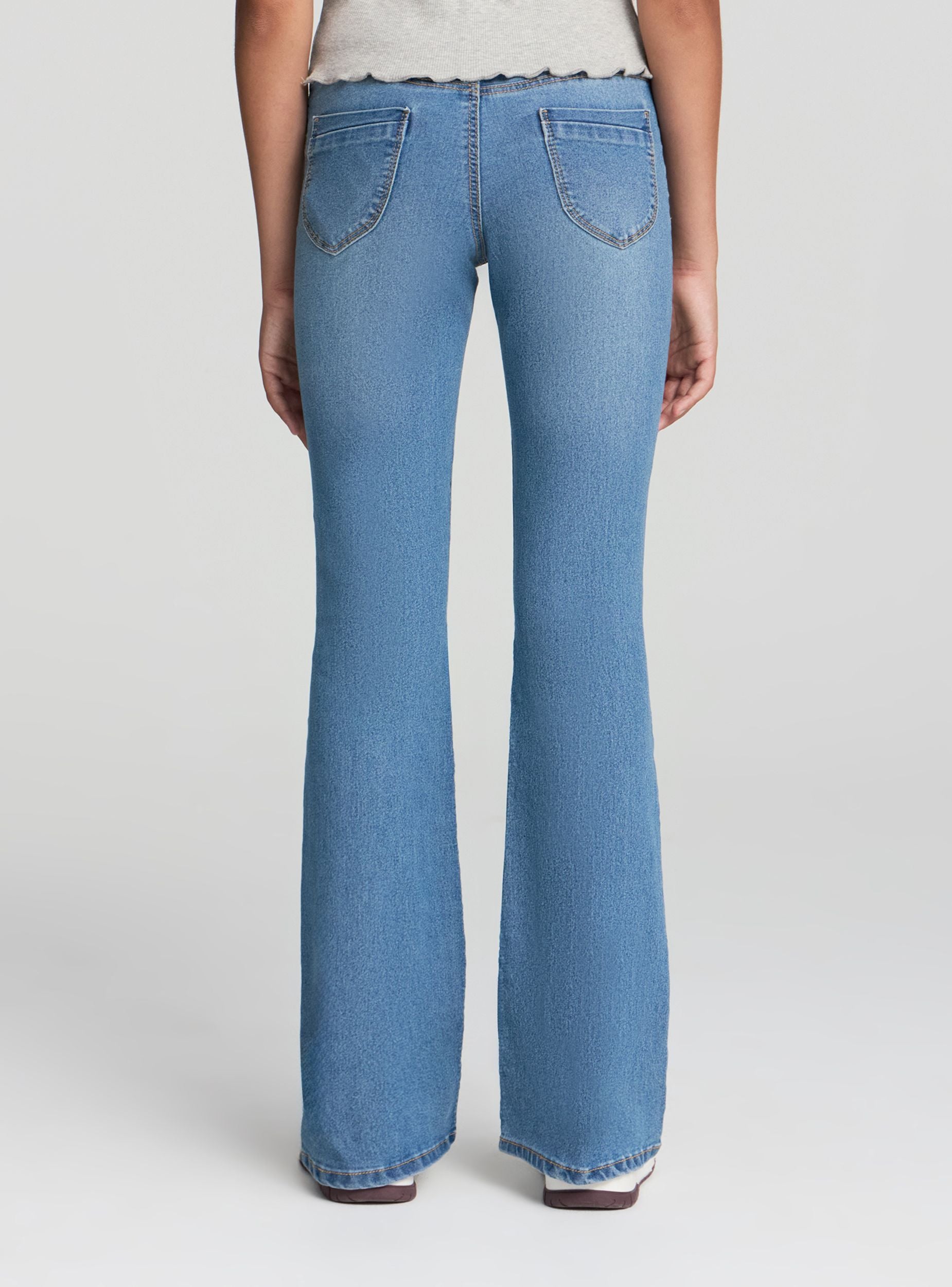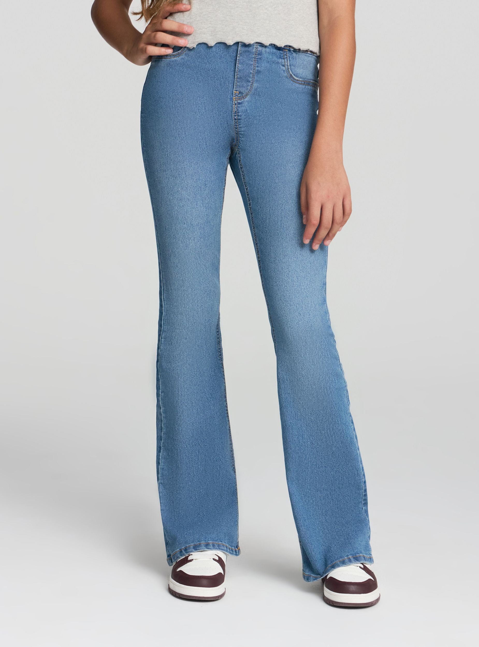 Dívčí jeggings s rozšířeným střihem, ideální pro casual a univerzální vzhled. Elastický pas zajišťuje pohodlí a praktičnost po celý den, zatímco design v denimovém stylu s středním praním dodává vzhledu glamour nádech. Perfektní k tričkům nebo mikinám na školu nebo volný čas, tyto jednobarevné jeggings obohacují každý outfit moderním a dynamickým prvkem.