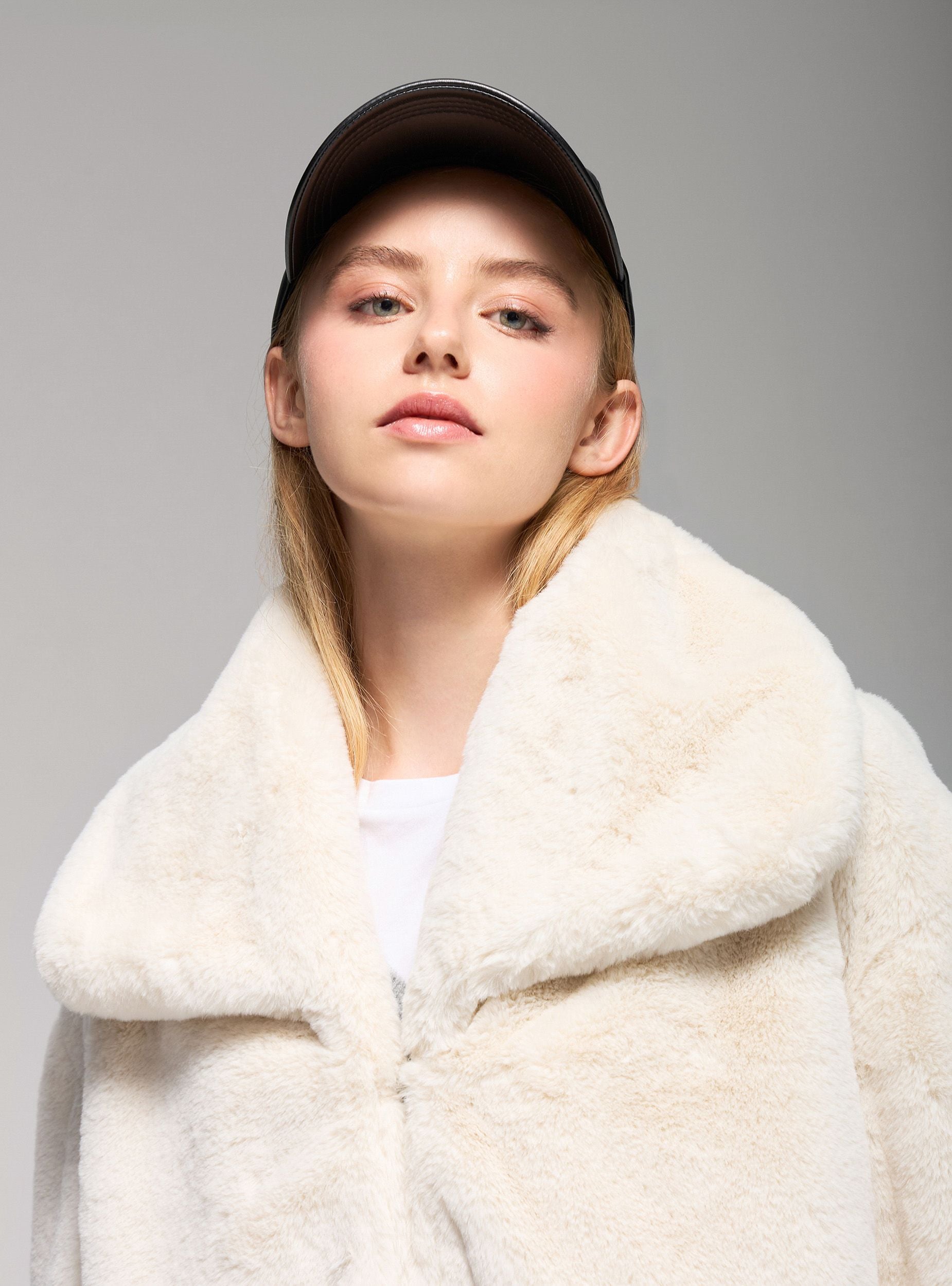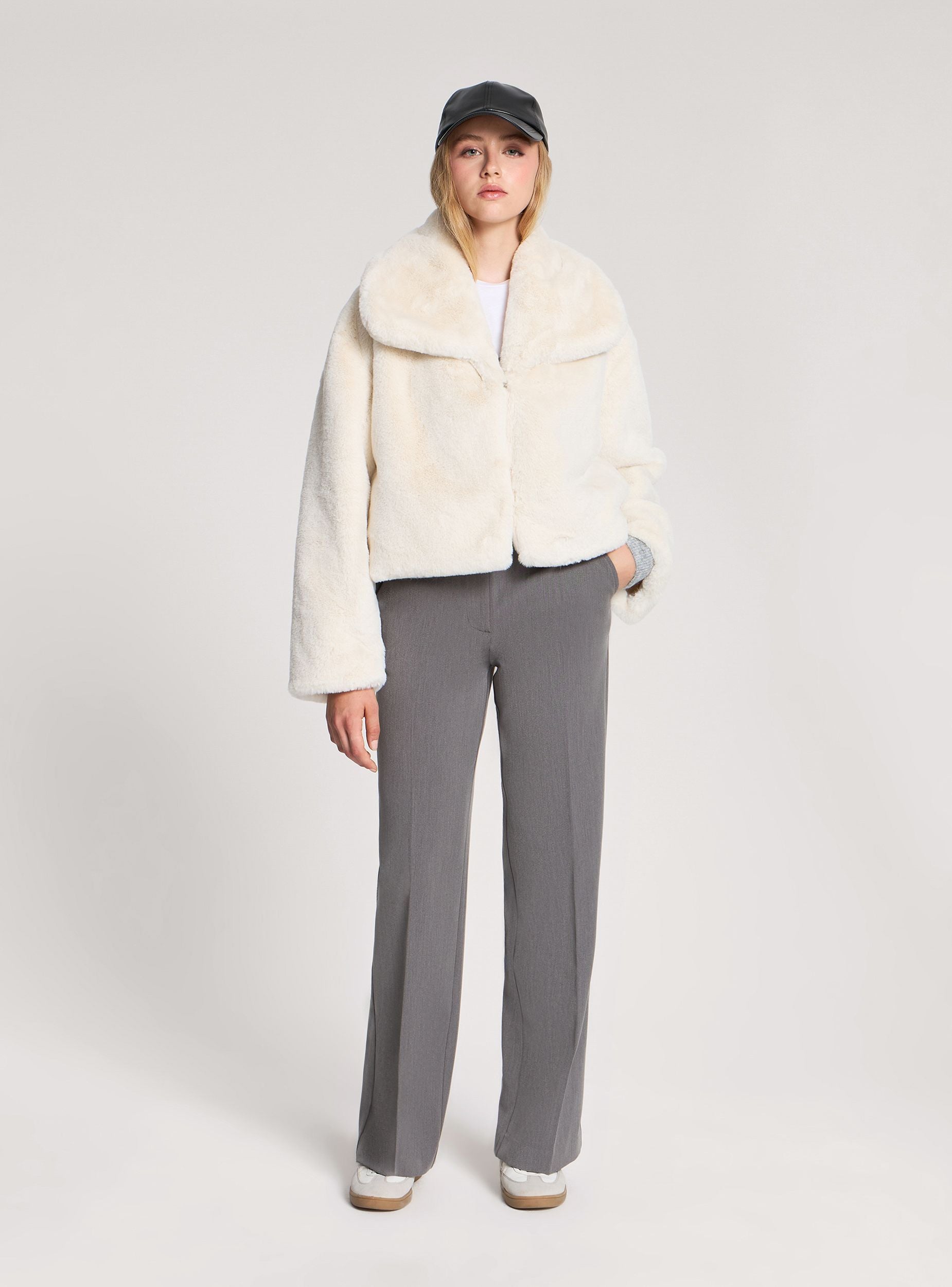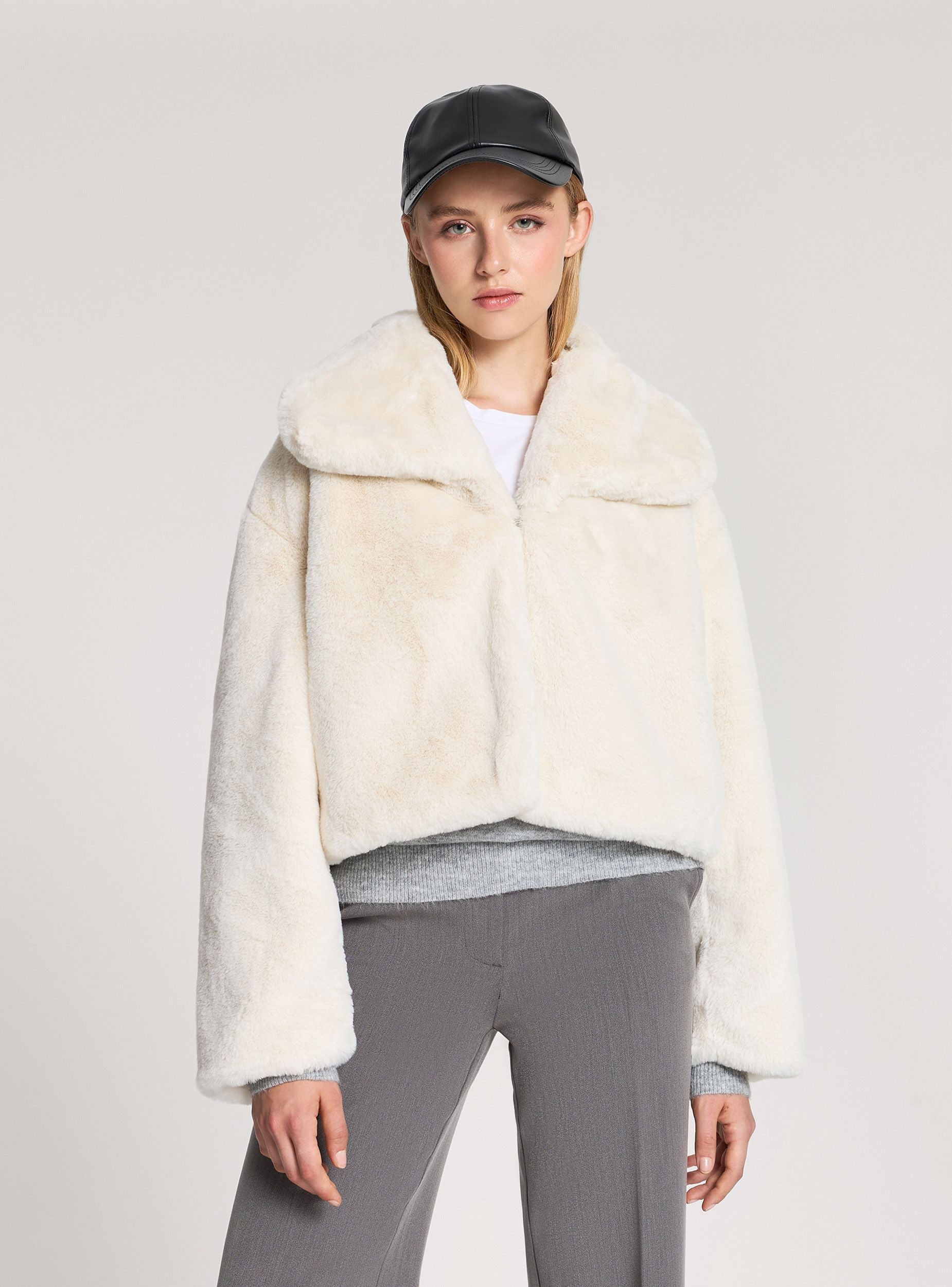 Dámská bunda s širokým límcem, vyrobená z umělé kožešiny pro sofistikovaný a moderní vzhled. Zapínání na háček. Perfektní pro doplnění elegantních i ležérních outfitů, tato bunda nabízí pohodlný střih a univerzální design. Ideální pro chladné období, snadno se kombinuje s kalhotami nebo sukněmi pro jedinečný stylový dotek.Detaily