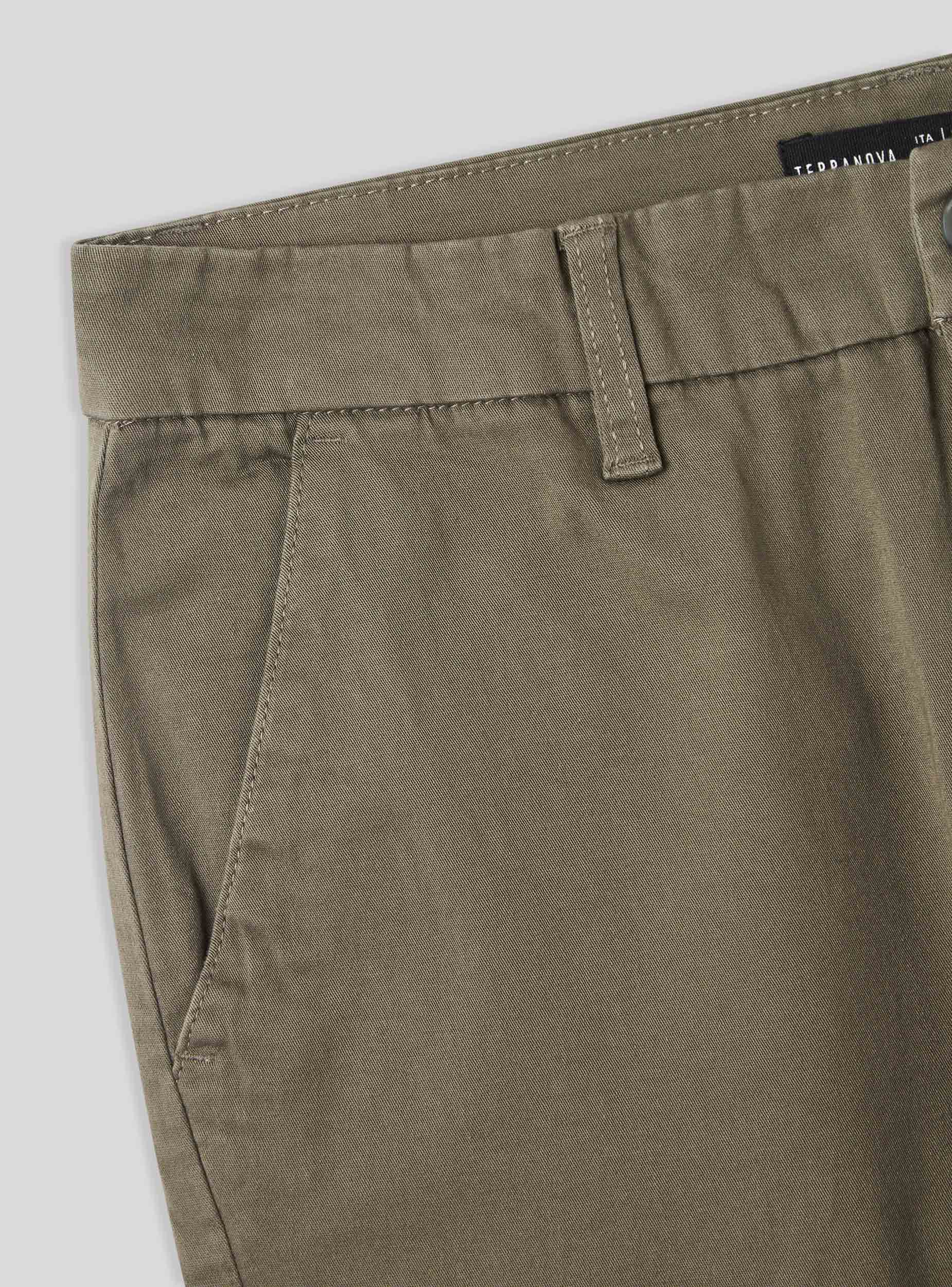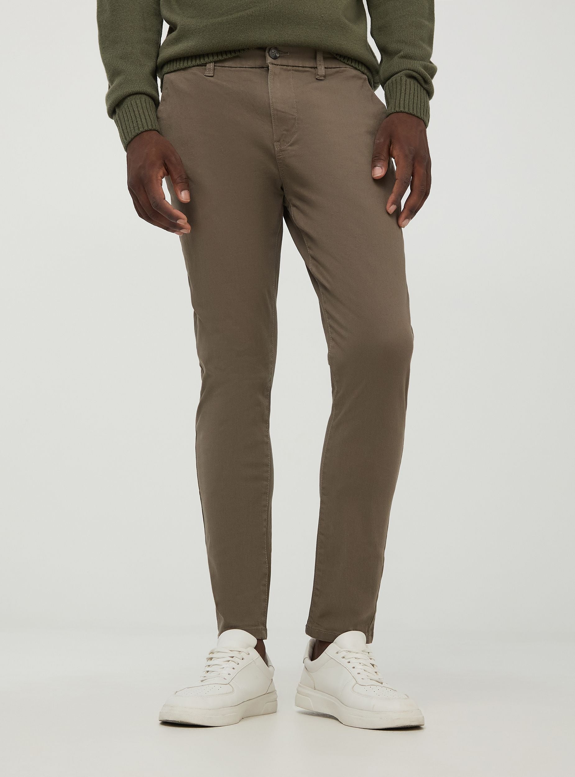 Tyto elegantní pánské chino kalhoty, vyrobené z elastického bavlněného materiálu, nabízejí slim fit střih pro moderní a stylový vzhled. Jednobarevná tkanina je činí univerzálními a vhodnými do každého šatníku. Jsou vybaveny knoflíkovým a zipovým zapínáním, mají šikmé přední kapsy a zadní kapsy s lemem. Ideální pro neformální příležitosti, kancelářský vzhled nebo večerní vycházky.