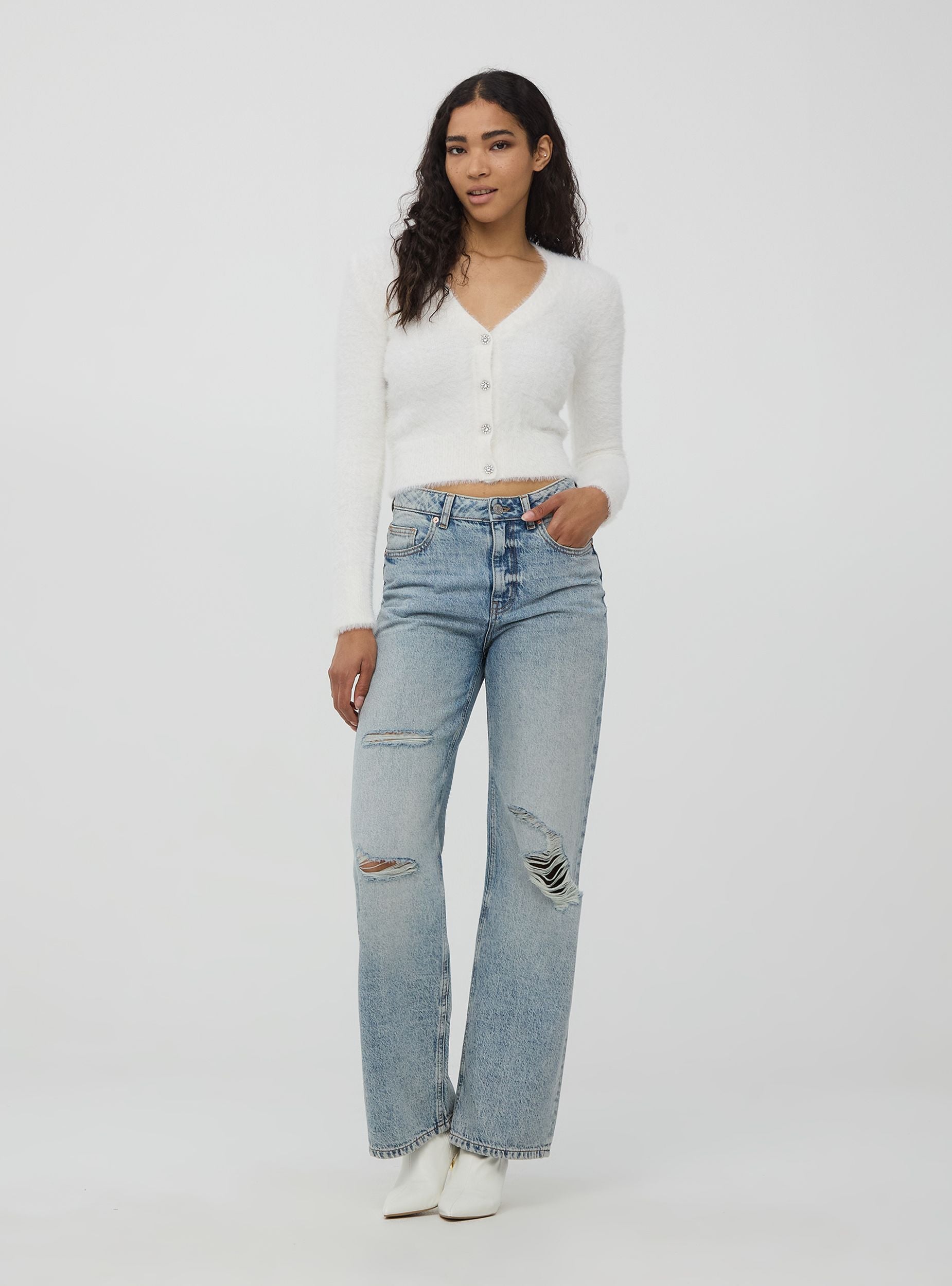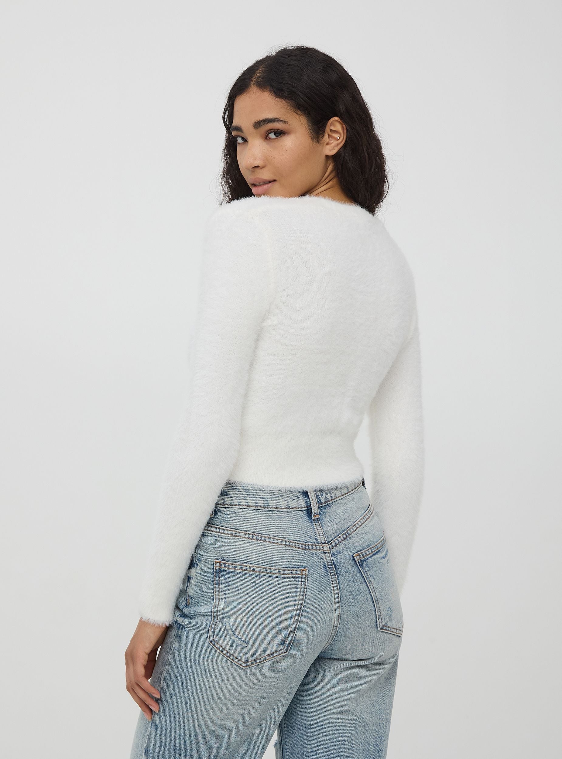 Dámský cardigan s dlouhými rukávy, vyrobený z měkkého syntetického chlupu s předními ozdobnými knoflíky. Cardigan má klasický design s výstřihem do V a předním zapínáním na ozdobné knoflíky, které dodávají nádech sofistikovanosti. Syntetický chlup zajišťuje bezkonkurenční měkkost, zatímco přiléhavý střih zvýrazňuje ženskou siluetu. Dlouhé rukávy přispívají k elegantnímu a rafinovanému vzhledu, ideálnímu pro nošení jak v neformálních, tak formálních kontextech.