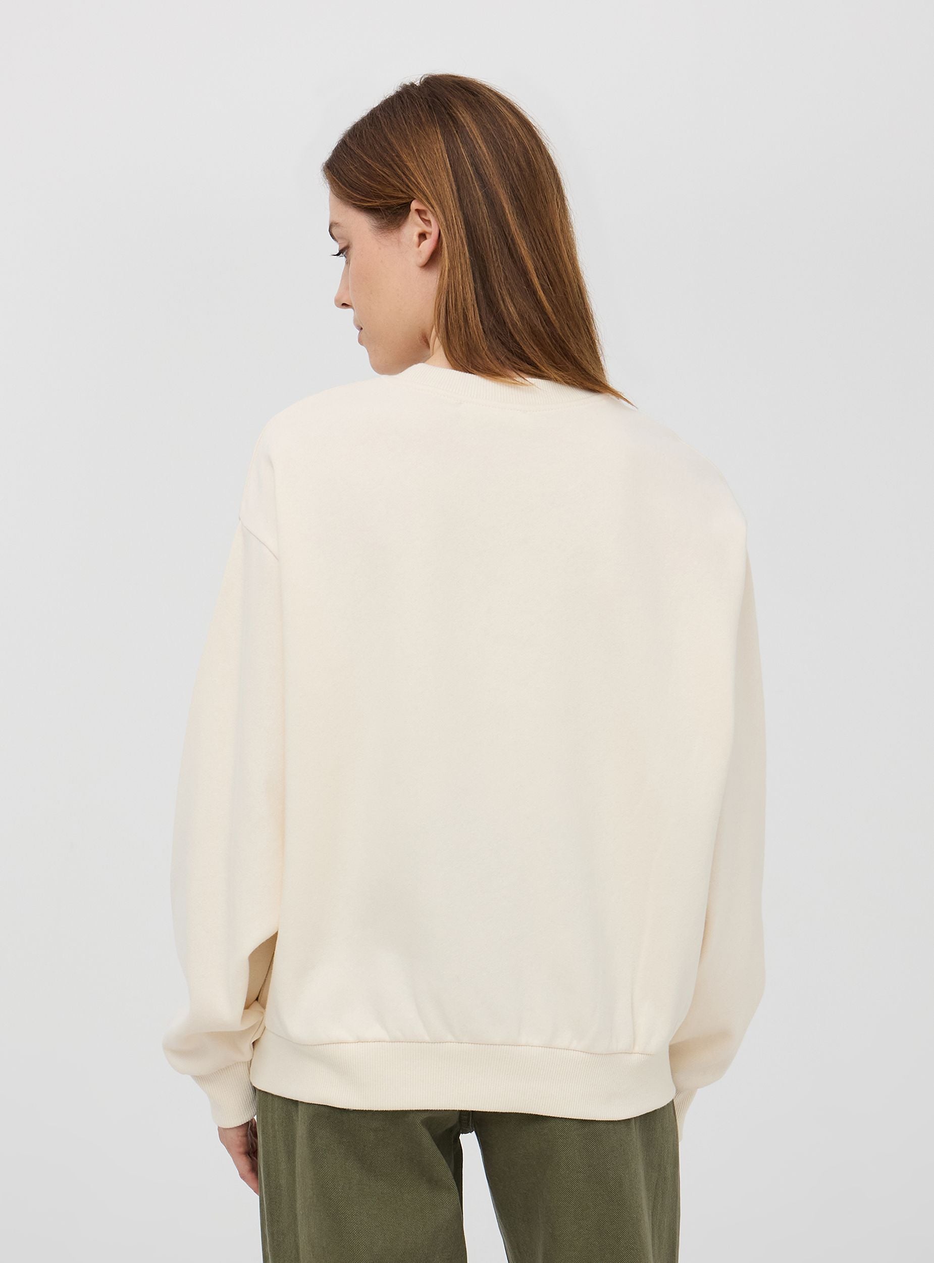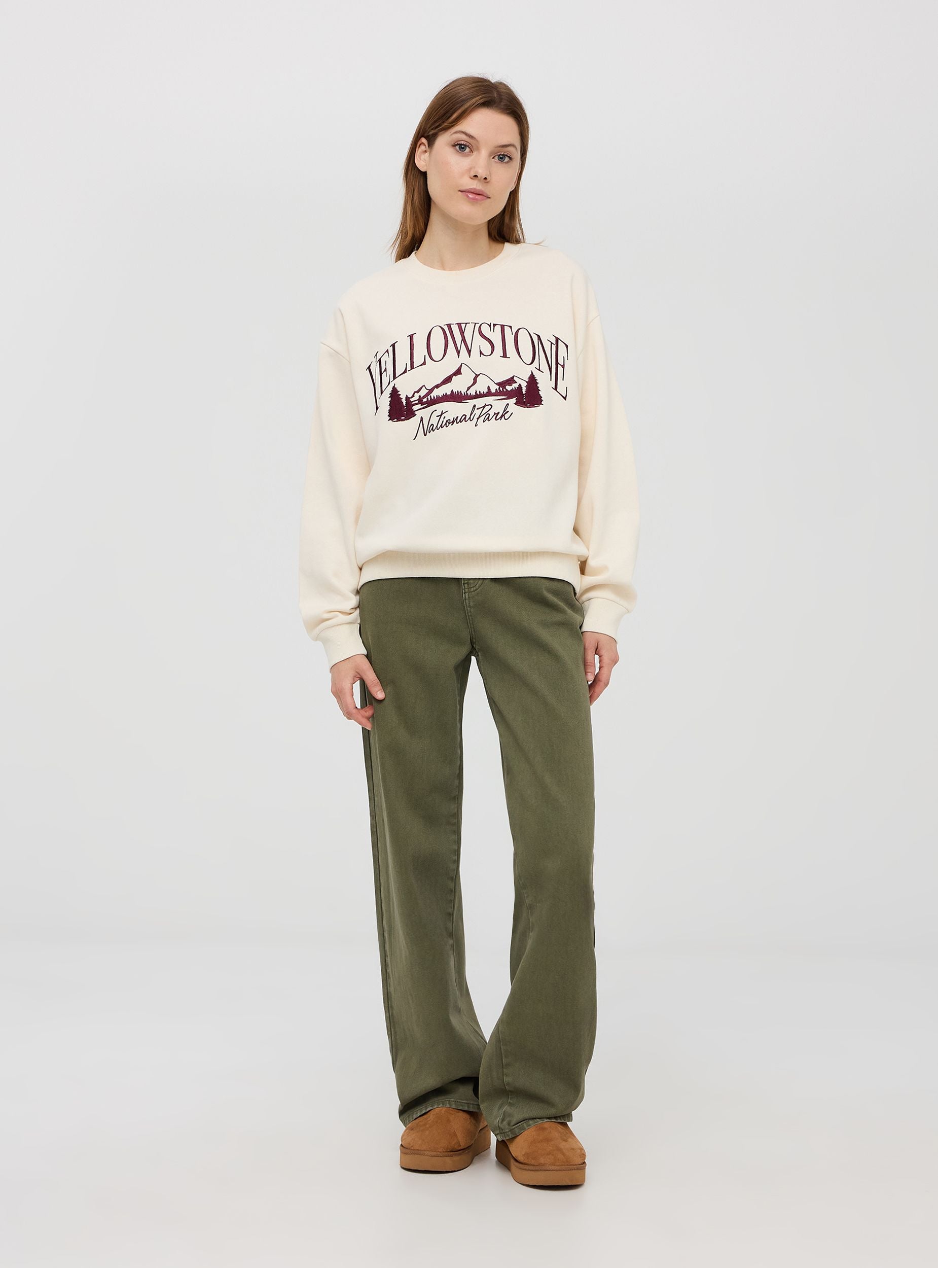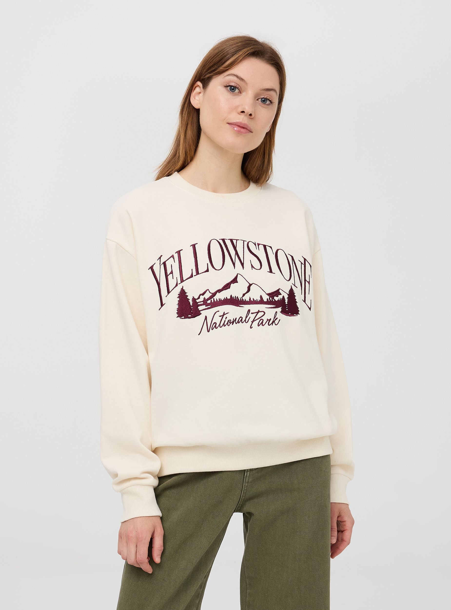 Dámská mikina, uzavřený model bez kapuce, z těžké tkaniny s nápisy a vyšitými horami, které evokují atmosféru přírody. Regular fit.Detaily