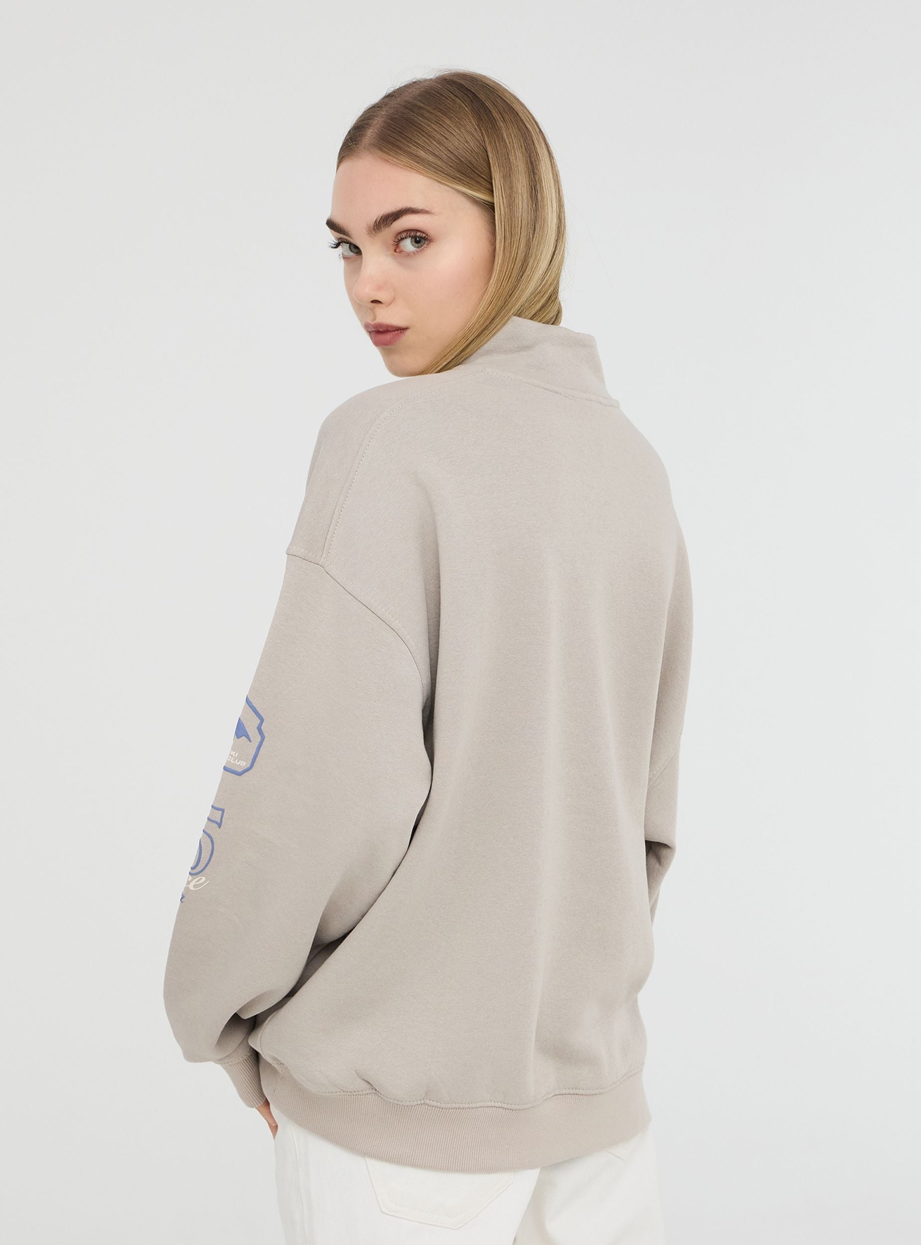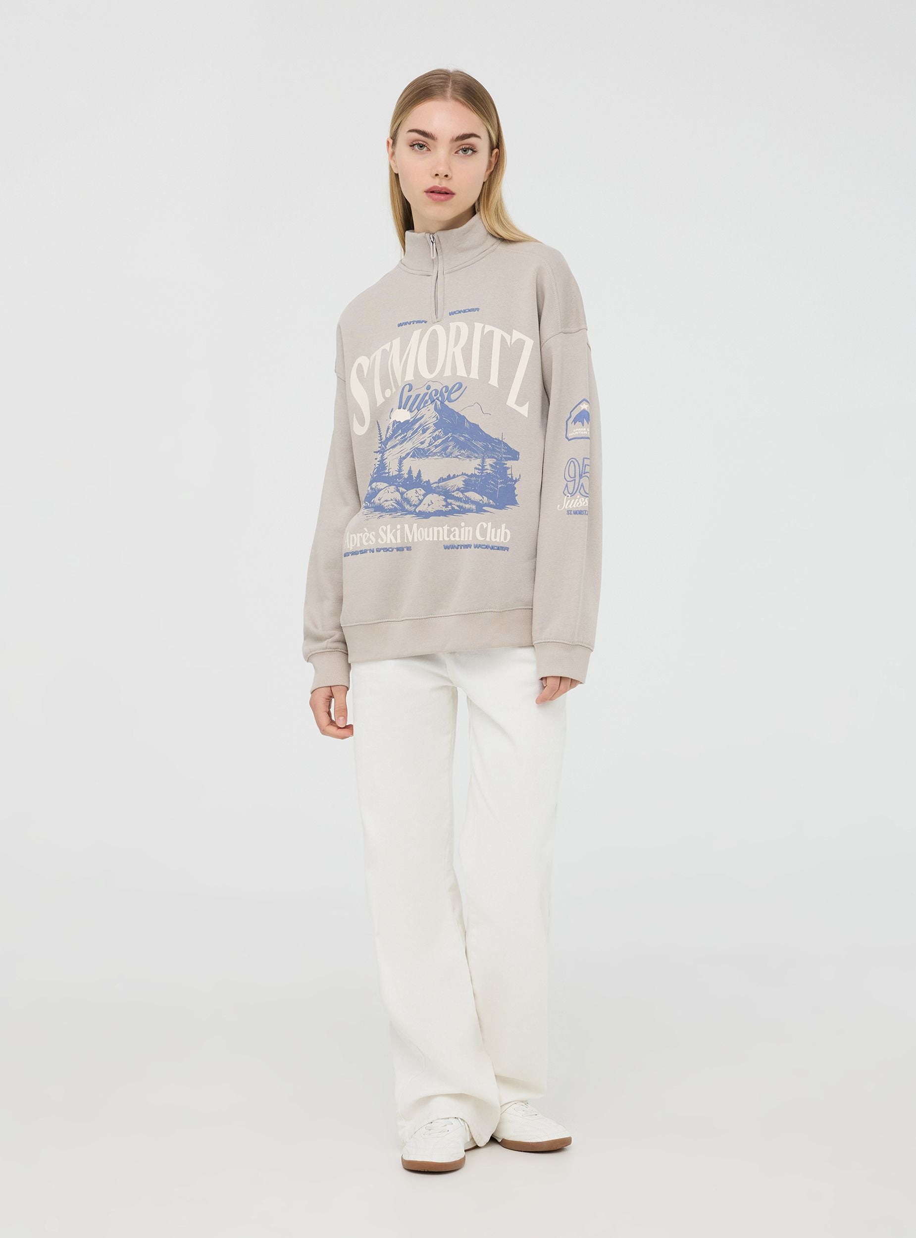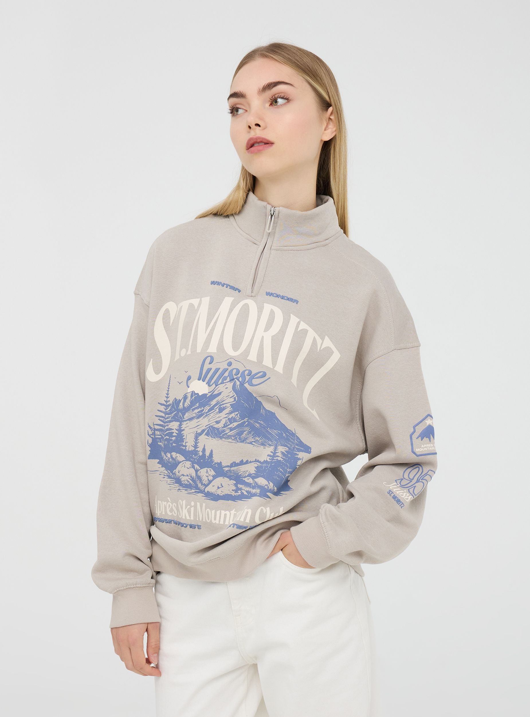 Dámská mikina bez kapuce s vysokým límcem a polovičním zipem. Těžká tkanina s potiskem horské krajiny na přední straně a potisky na rukávu. Ribované lemy. Perfektní pro pohodlný a ležérní vzhled. Oversize střih.