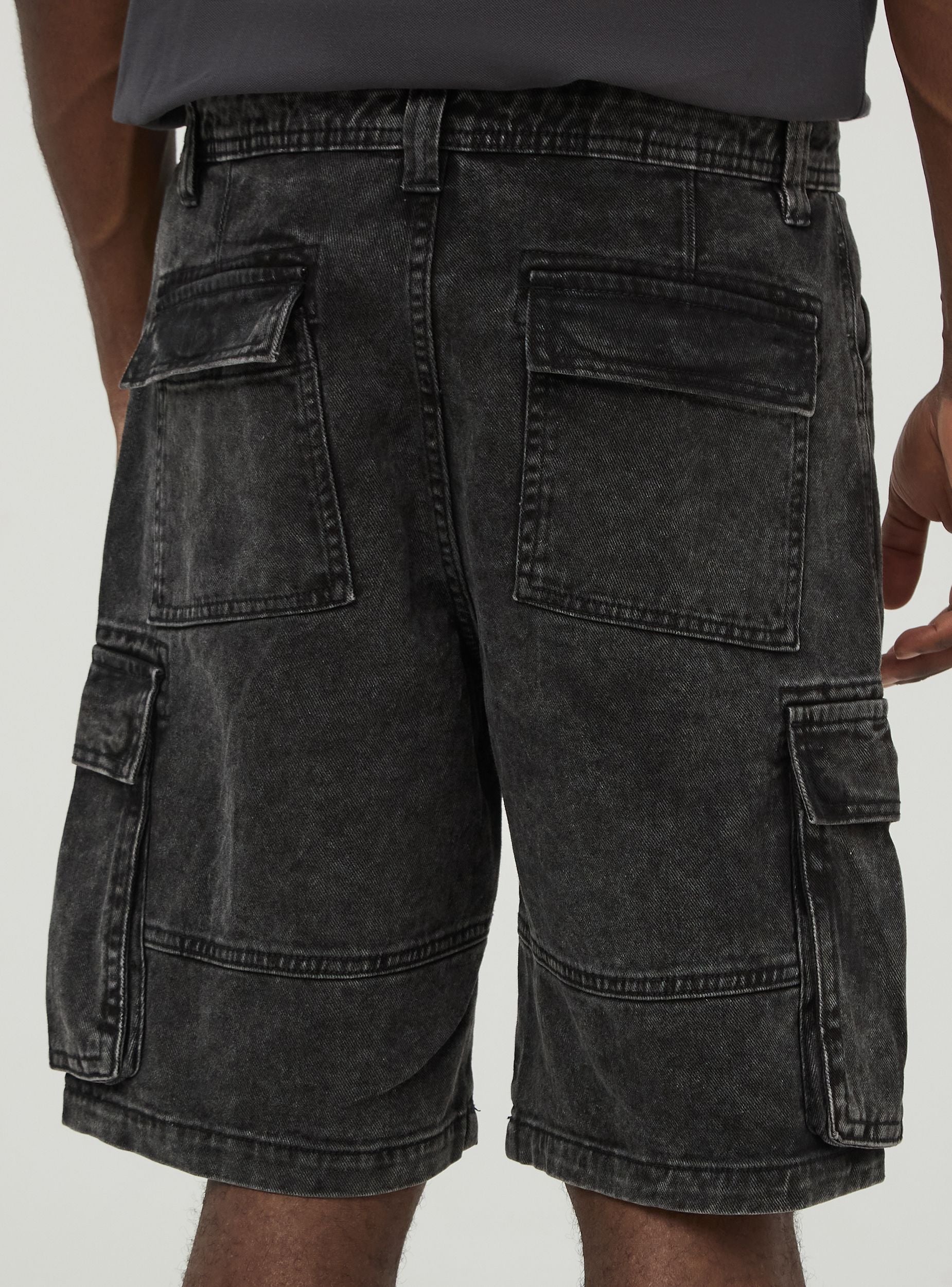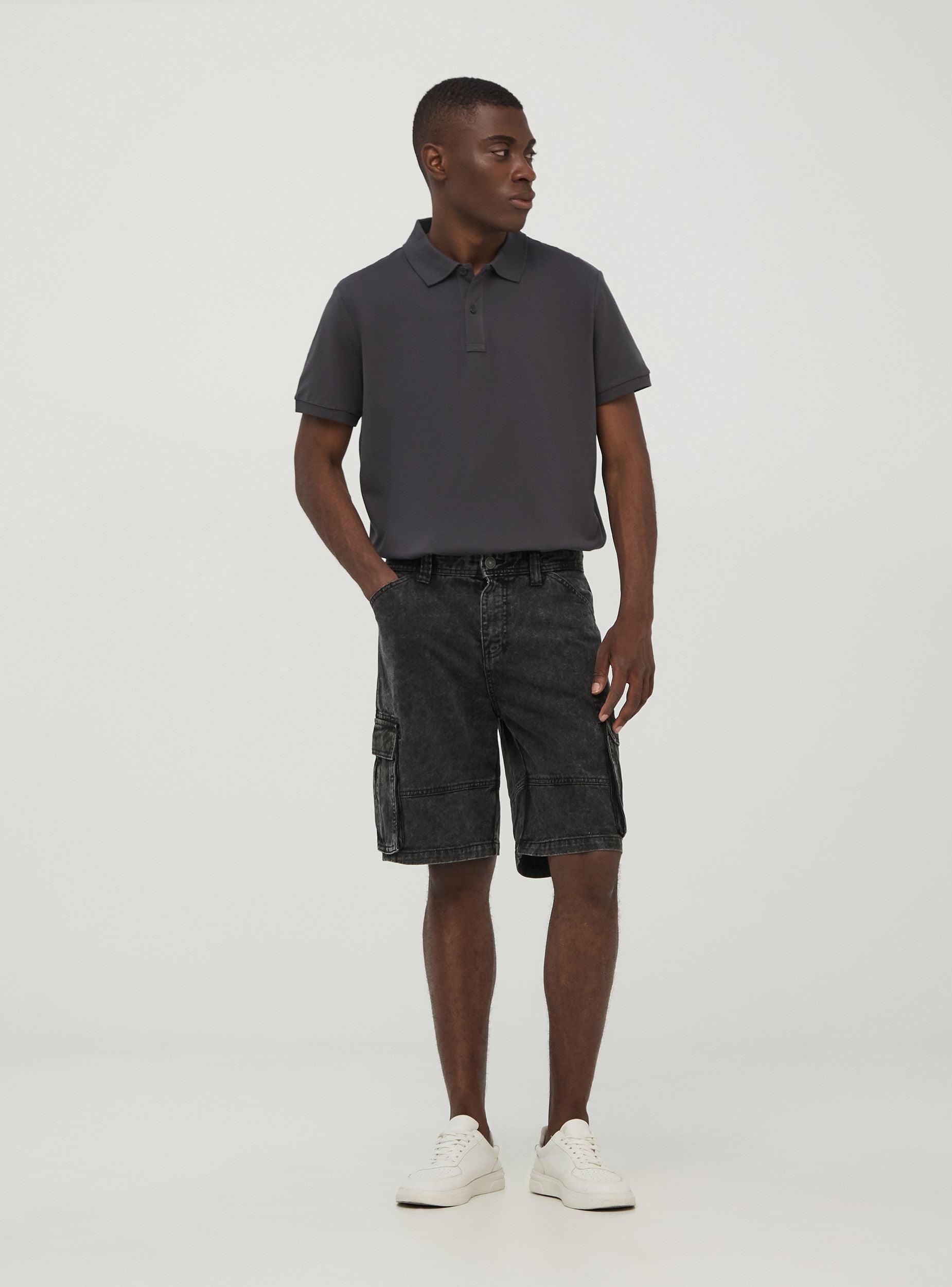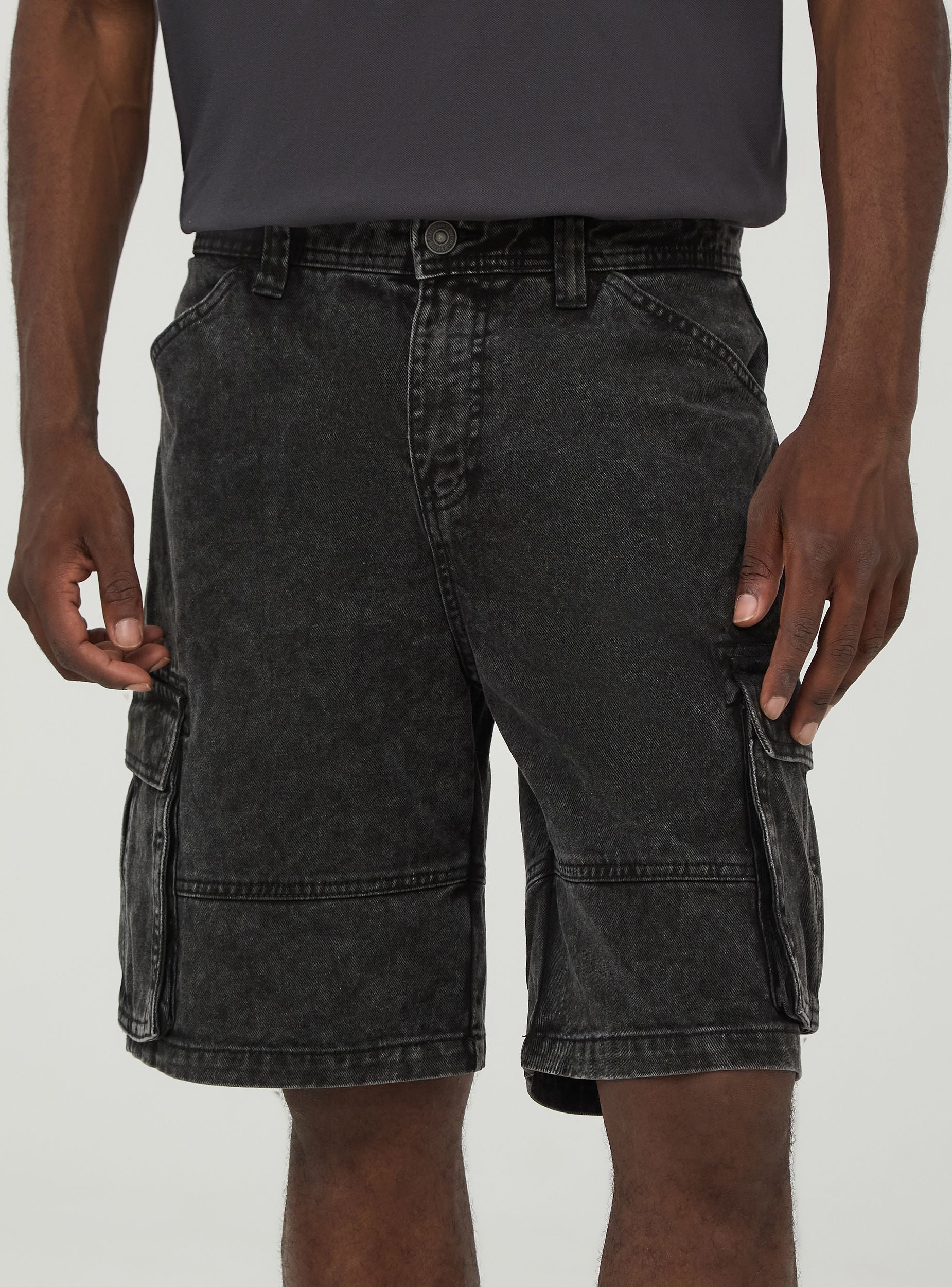 Pánské cargo šortky s praktickými bočními kapsami, vyrobené z černé bavlněné tkaniny s efektem acid wash. Zapínání na knoflík a zip, a poutka na opasek. Ideální pro každodenní casual vzhled, tyto šortky nabízejí funkčnost a styl, perfektní pro kombinaci s tričky a teniskami pro pohodlný a všestranný letní outfit.Detaily