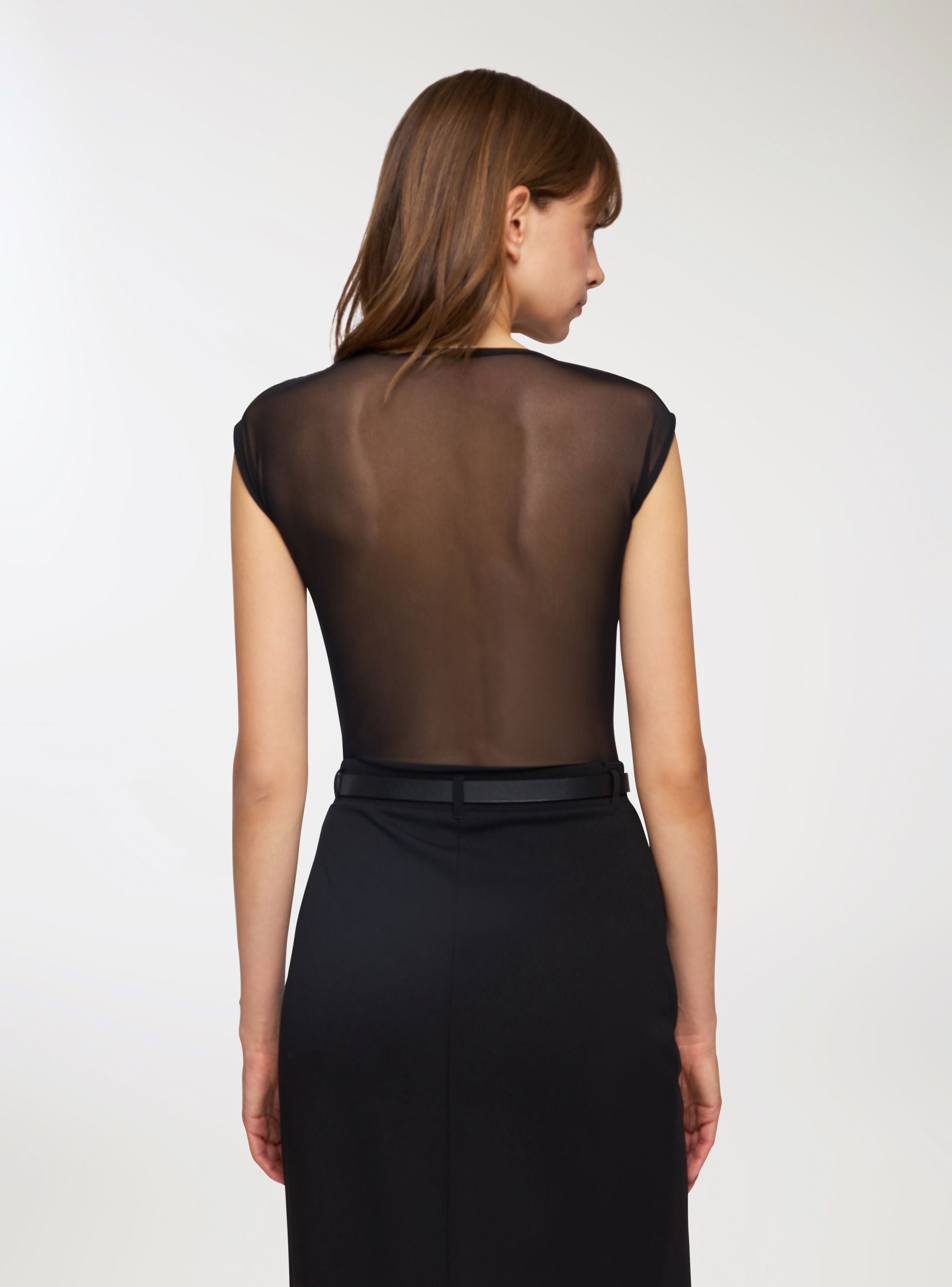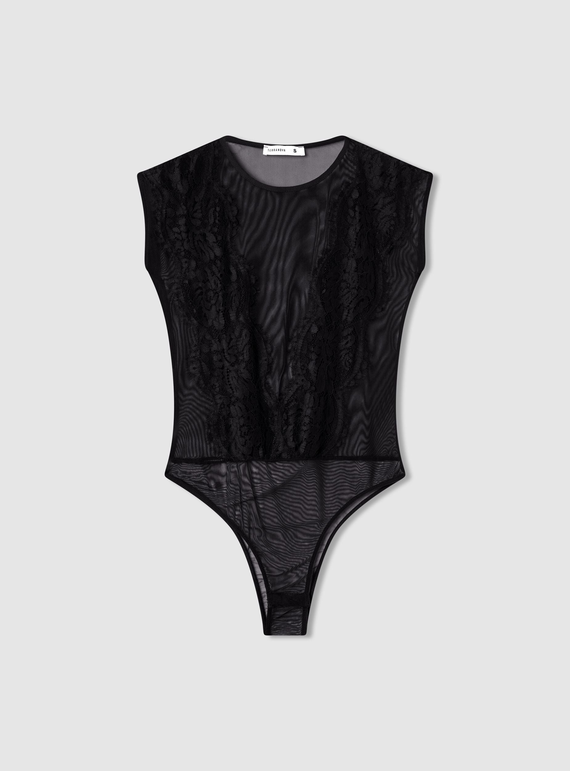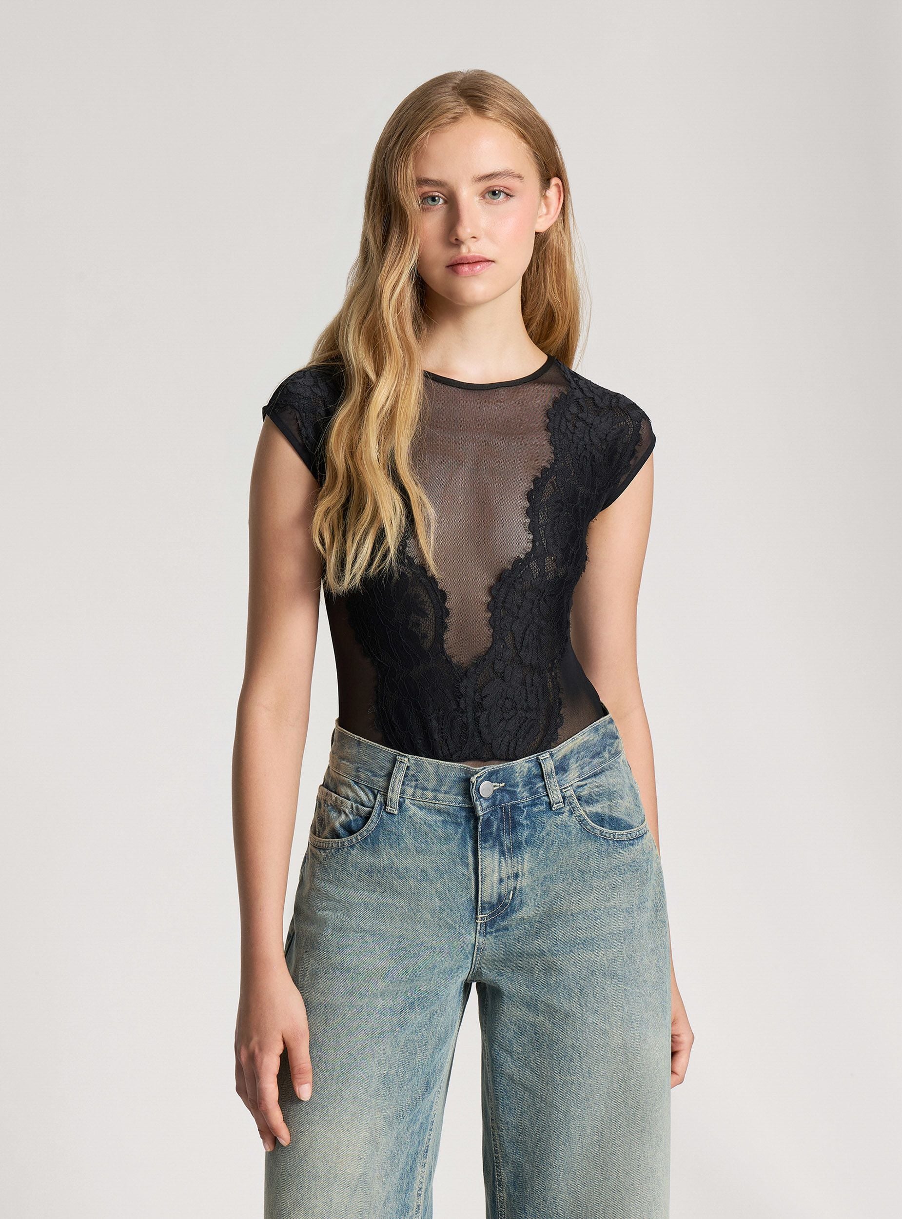 Dámské tělo s rafinovaným a smyslným vzhledem, charakterizované elegantním krajkovým vsazením, které zvýrazňuje dekolt a dodává outfitu sofistikovaný nádech. Zadní část a rukávy z průhledného tylu vytvářejí jemný efekt "vidět a nevidět". Ideální pro doplnění večerních outfitů nebo odvážnějších vzhledů, snadno se kombinuje s kalhotami s vysokým pasem nebo těsnými sukněmi pro ženský a svůdný výsledek.