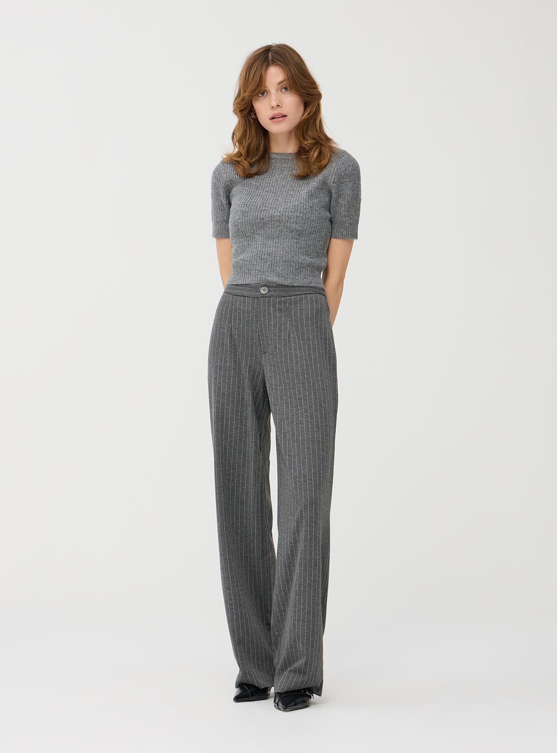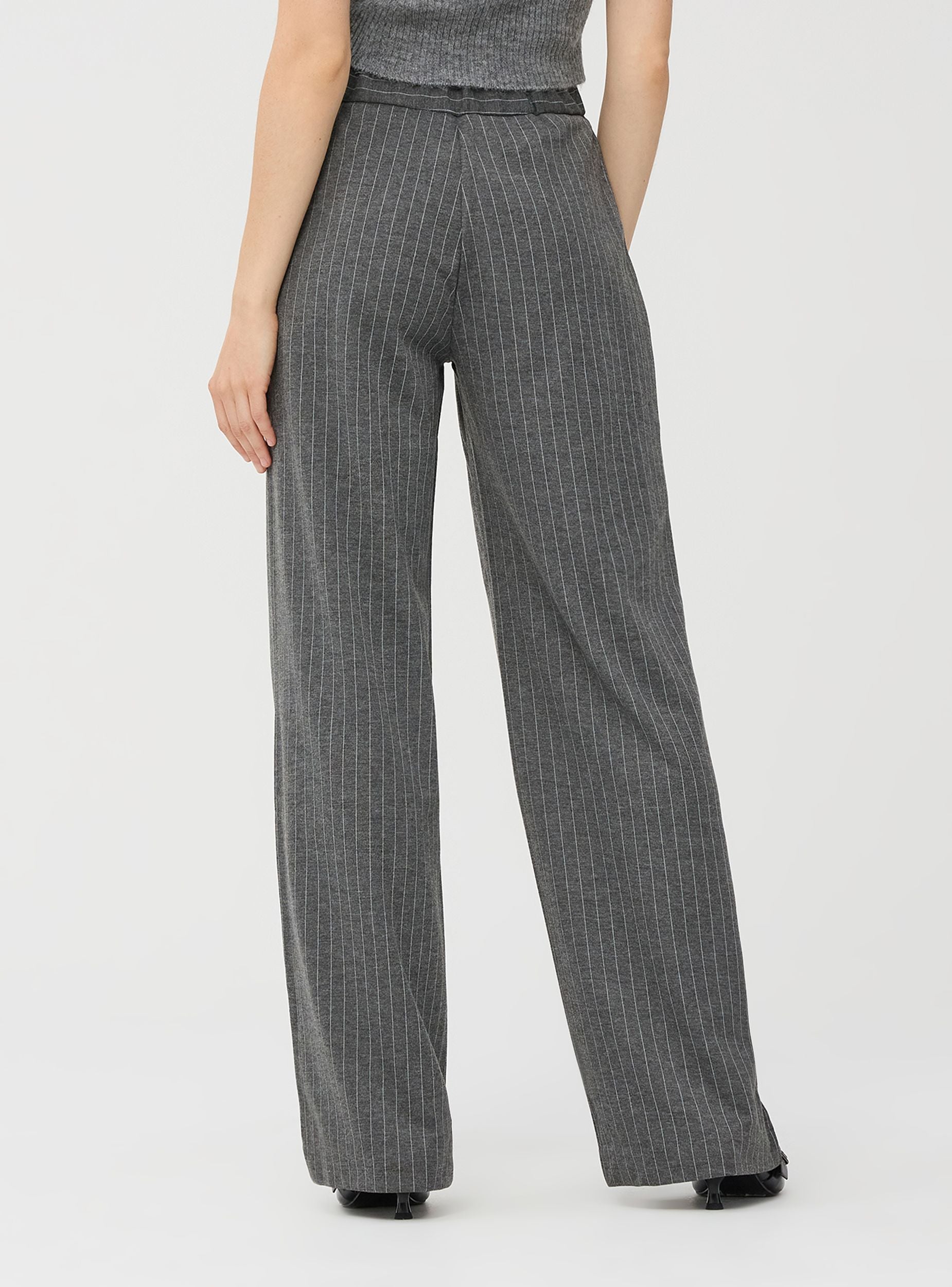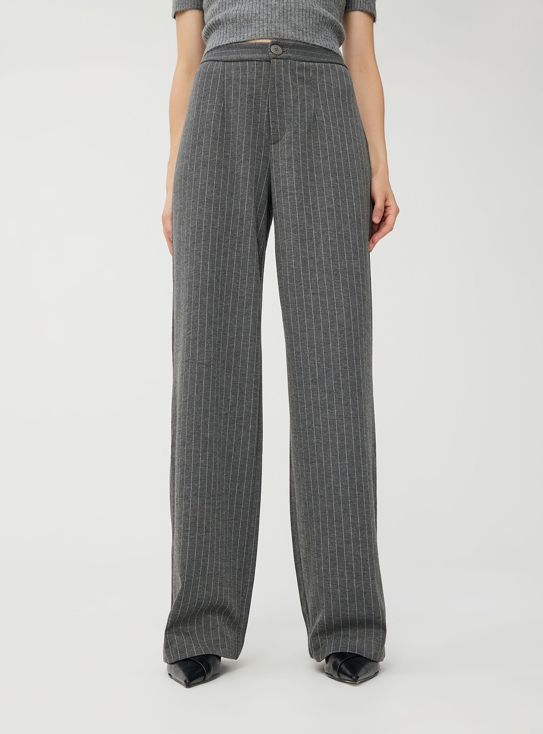 Dámské široké kalhoty s pruhy. Tento kousek má jednoduchý, ale rafinovaný design, s volným střihem, který zajišťuje pohodlí a volnost pohybu. Zapínání na knoflík a zip přidává praktičnost, zatímco klasická silueta je činí ideálními pro formální příležitosti nebo kancelářský vzhled.Detaily