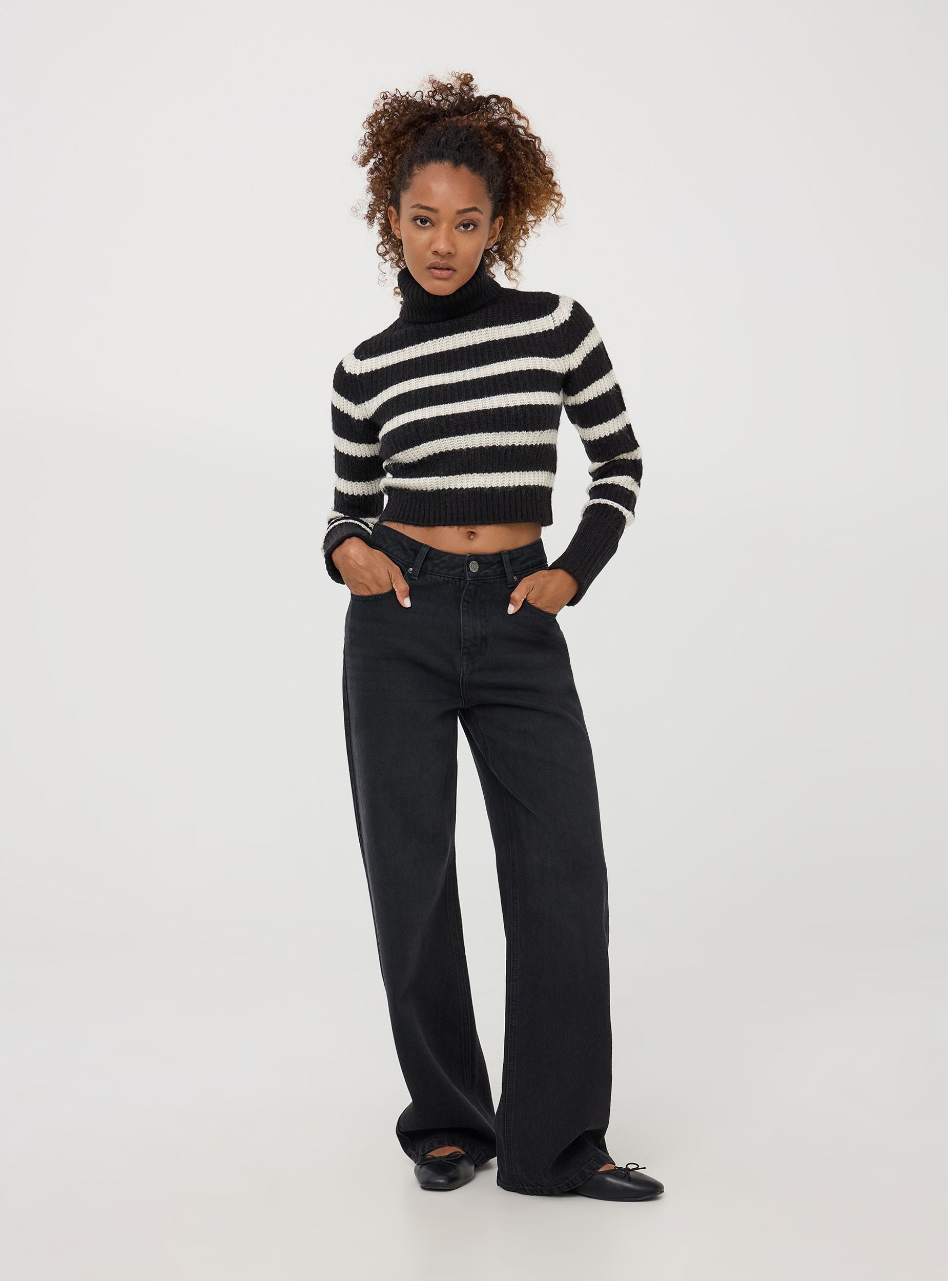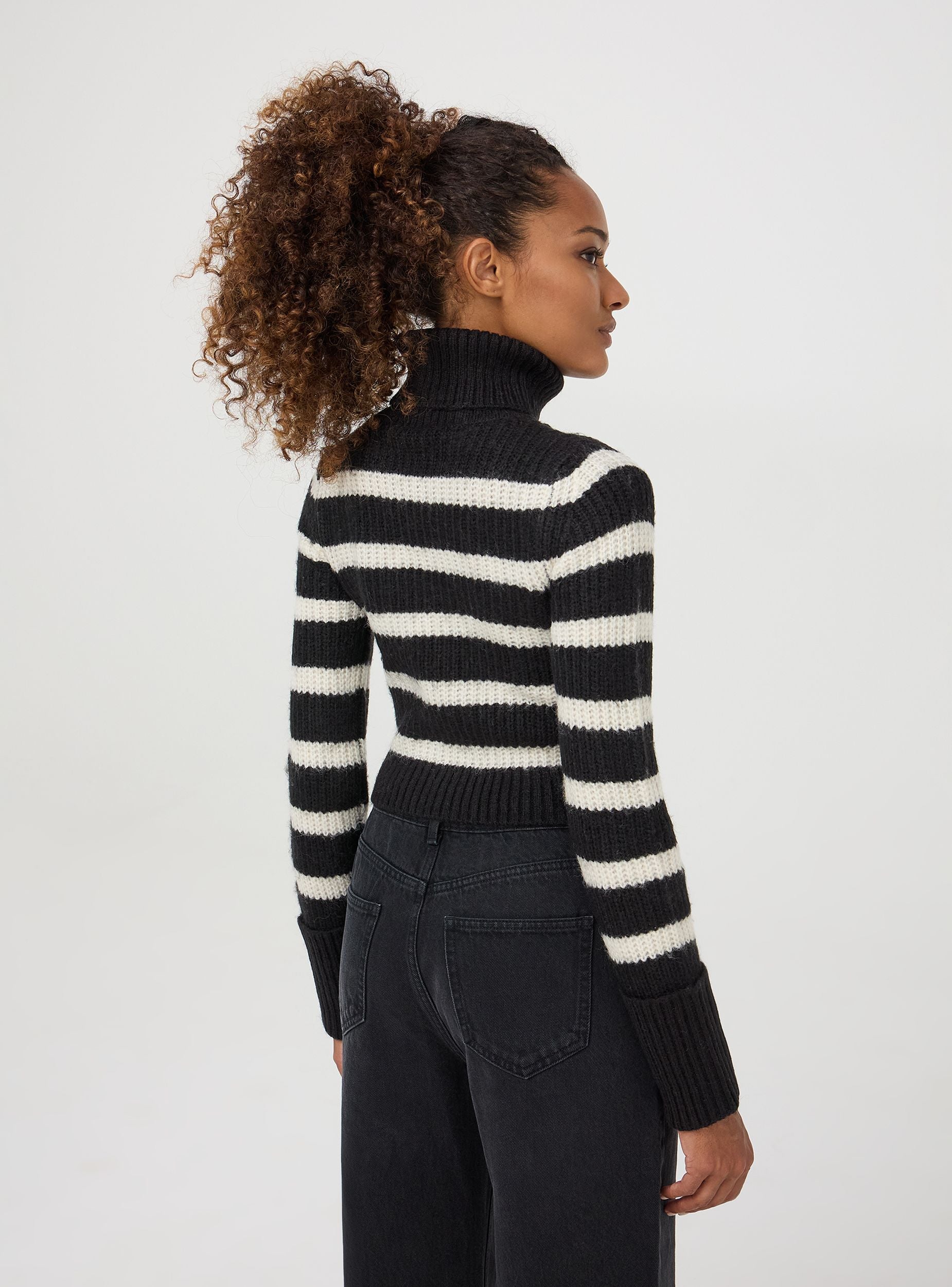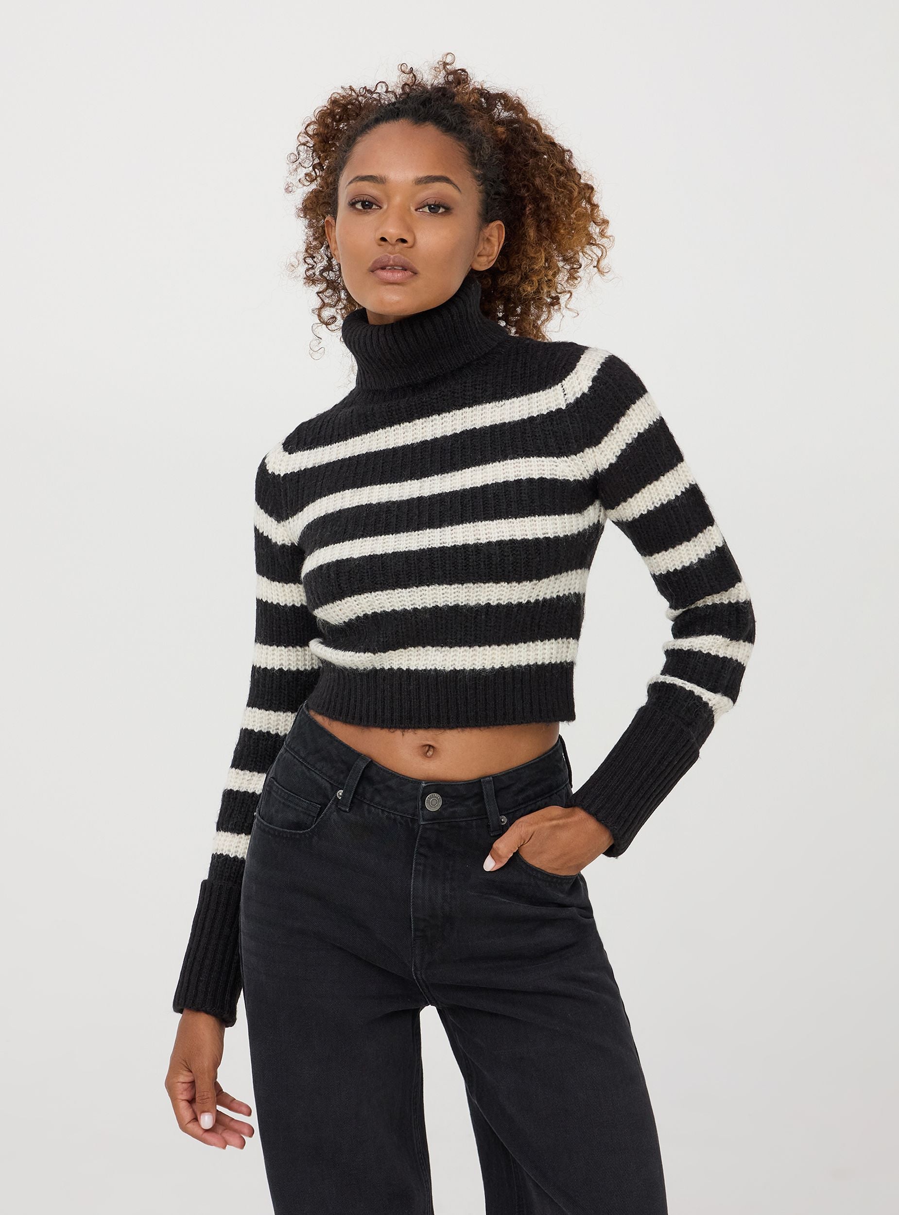 Dámský rolák s cropped střihem, charakterizovaný horizontálními pruhy. Má krátký střih, který končí nad pasem, vysoký límec a manžety s žebrováním. Pruhovaný design dodává moderní a stylový vzhled, ideální pro casual oblečení nebo pro přidání stylového prvku k formálnějšímu outfitu.