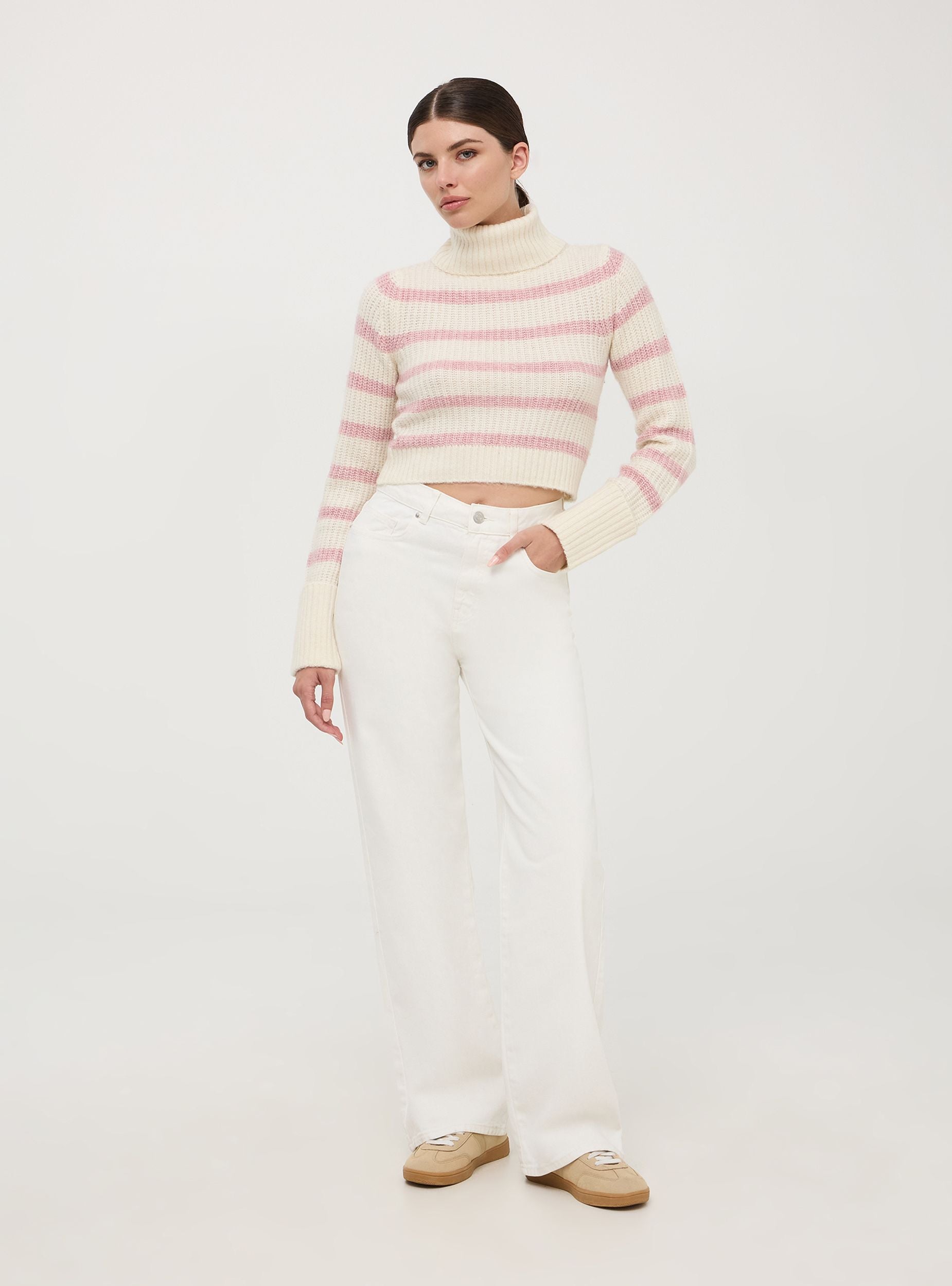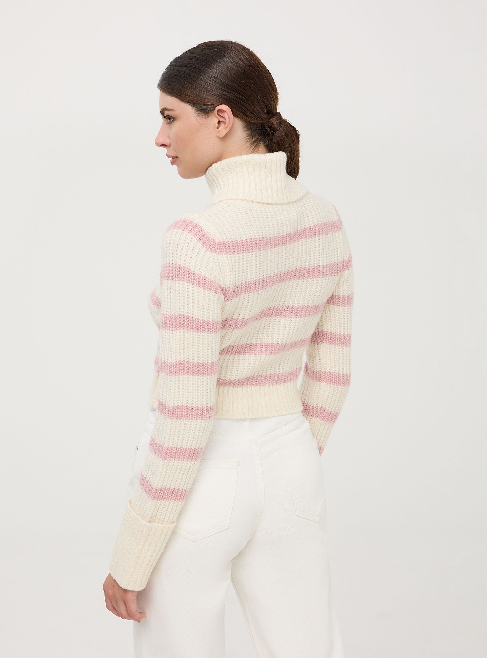 Dámský crop svetr s rolákem, charakterizovaný horizontálními pruhy. Má krátký střih, který sahá nad pas, s vysokým límcem a žebrovanými manžetami. Pruhovaný design dodává moderní a módní vzhled, ideální pro casual oblečení nebo pro přidání stylového prvku k formálnějšímu outfitu.