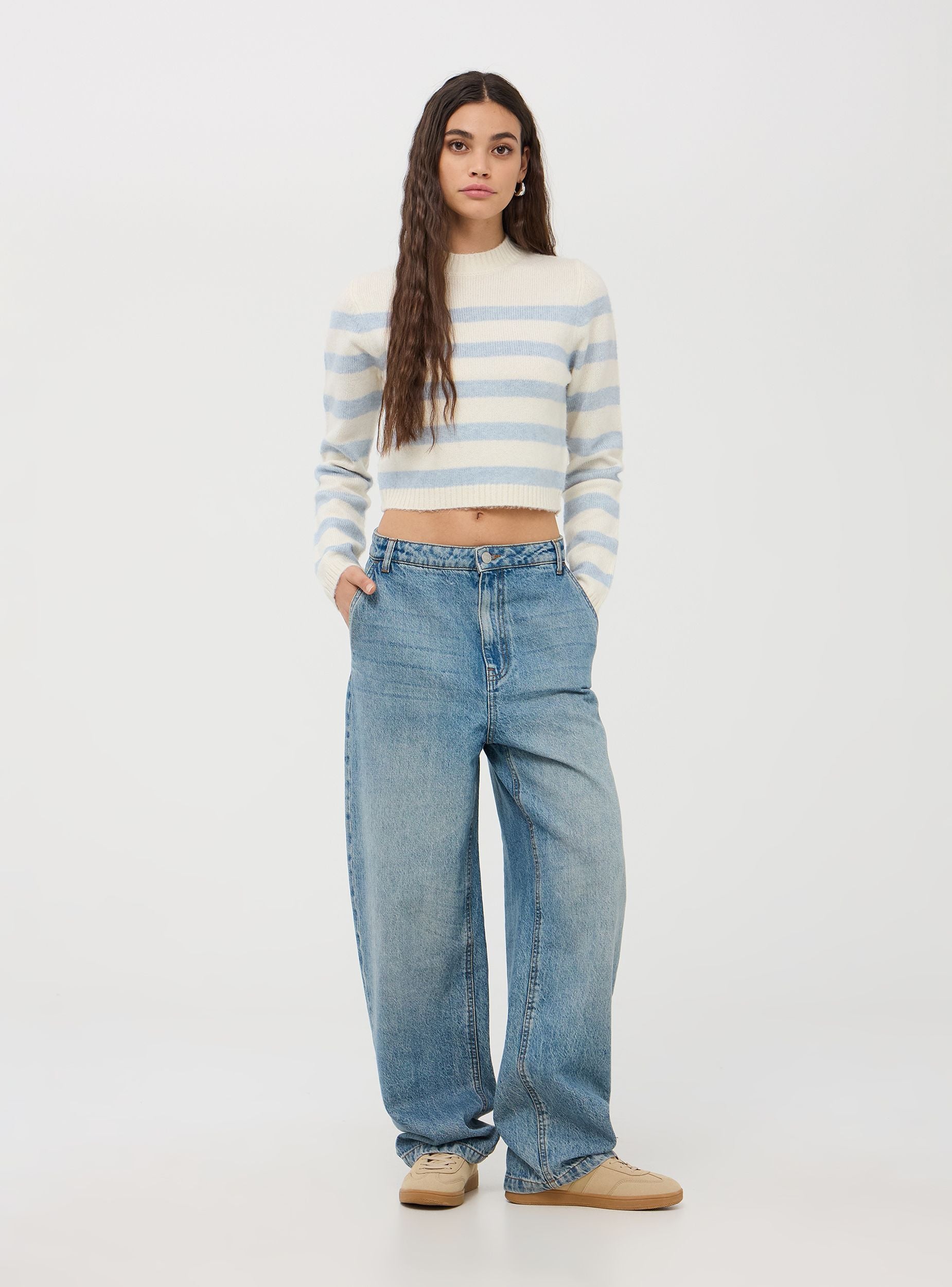 Dámský crop top z tkaniny s horizontálními pruhy. Model s kulatým výstřihem a dlouhými rukávy, s manžetami, límcem a lemy s žebrováním. Perfektní na neformální výlety a chladnější dny, je to univerzální a módní kousek.
