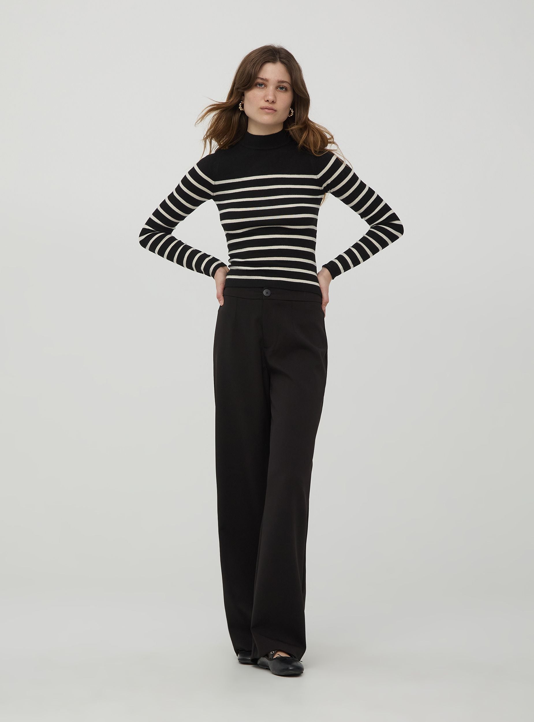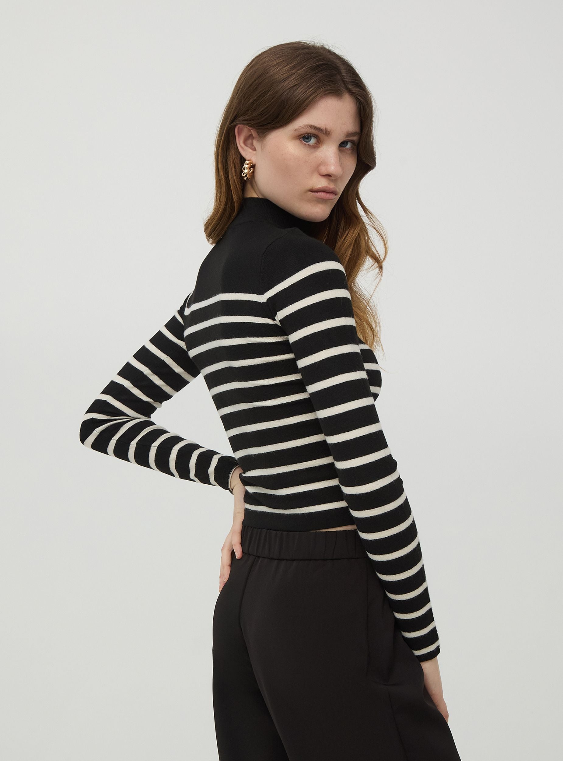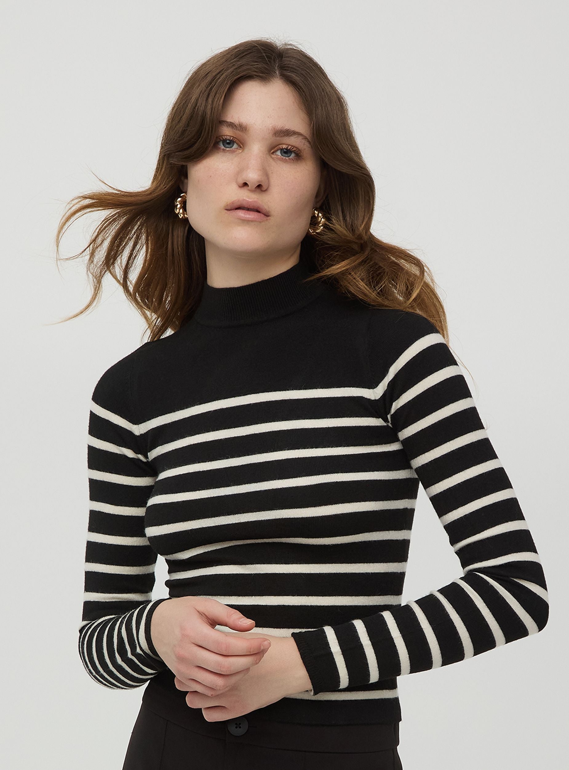 Dámský svetr, model s vysokým límcem a dlouhými rukávy. Teplá a pohodlná pruhovaná tkanina, ideální k džínům, kalhotám nebo sukním. Regular fit.Detaily