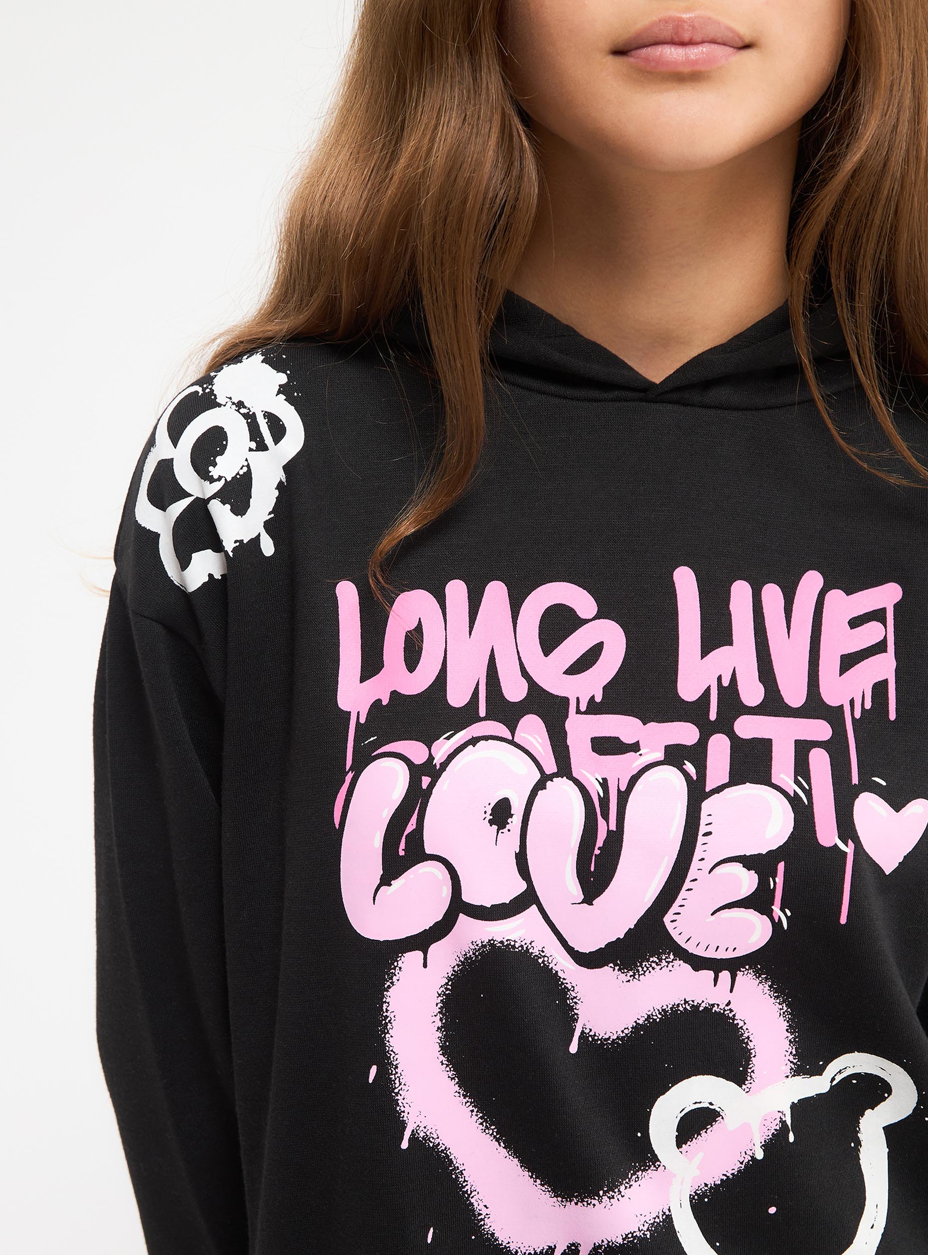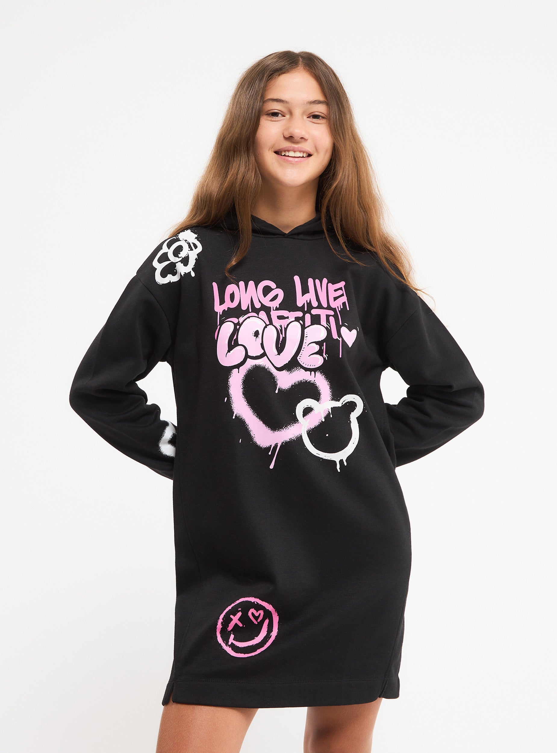 Vestito felpa da bambina con cappuccio. Manica lunga, stampe graffiti.