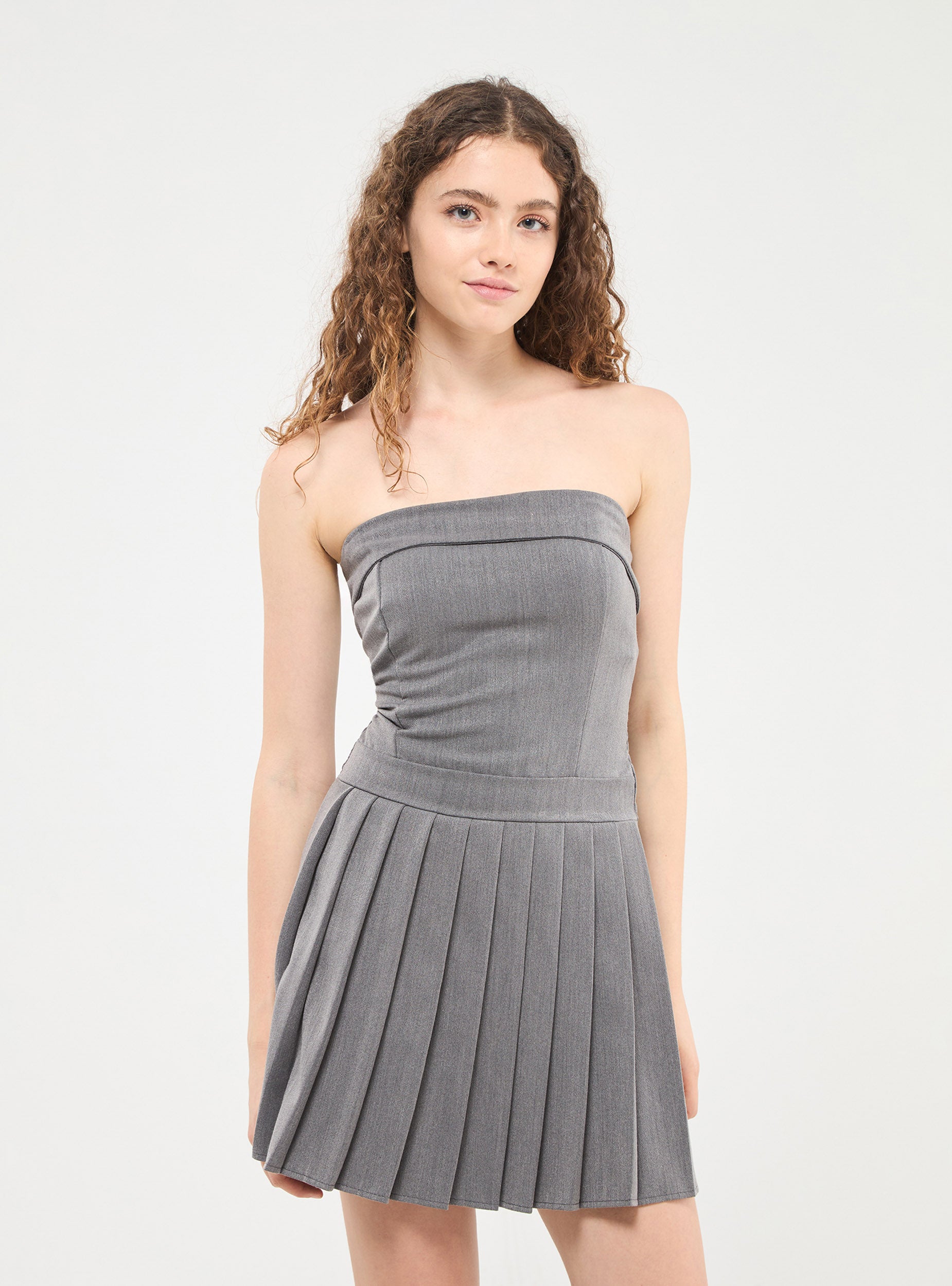 Vestito corto da donna in tessuto elasticizzato tinta unita. Modello a fascia con gonna plissettata.Detaily